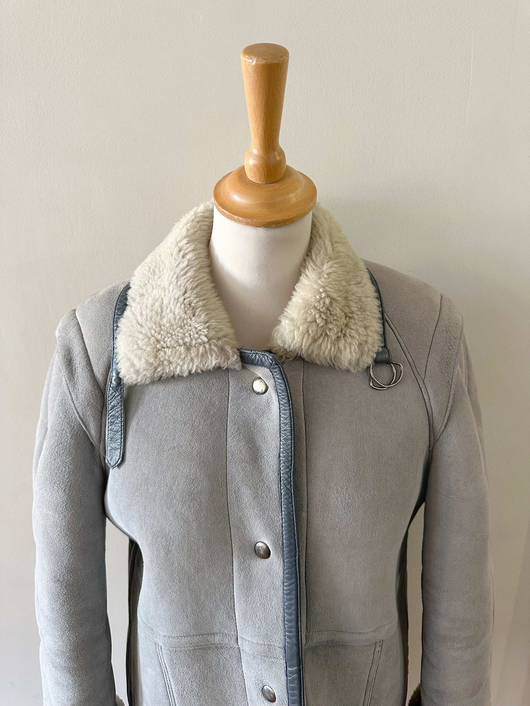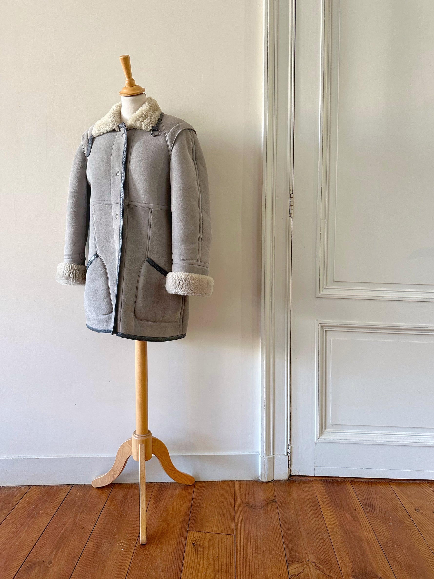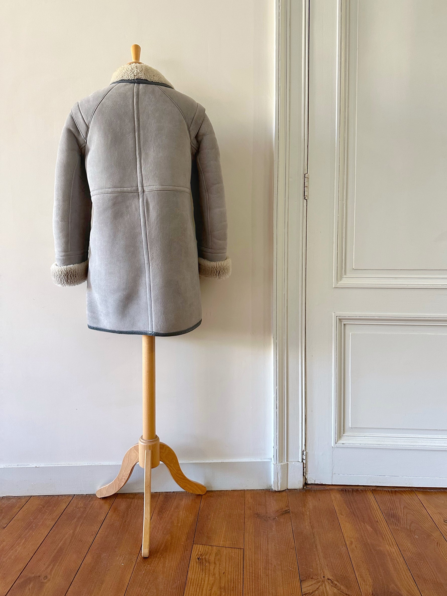 Peau lainee en mouton retourné, exterieur en daim gris souris et ganses en cuir anthracite, interieur laine de mouton grise, col droit à revers en mouton. Fermeture à boutons pressions, Fabriquée en France, taille 36 portée ici ouvert sur une personne T40 et sur un mannequin T36. Longueur 80cm.