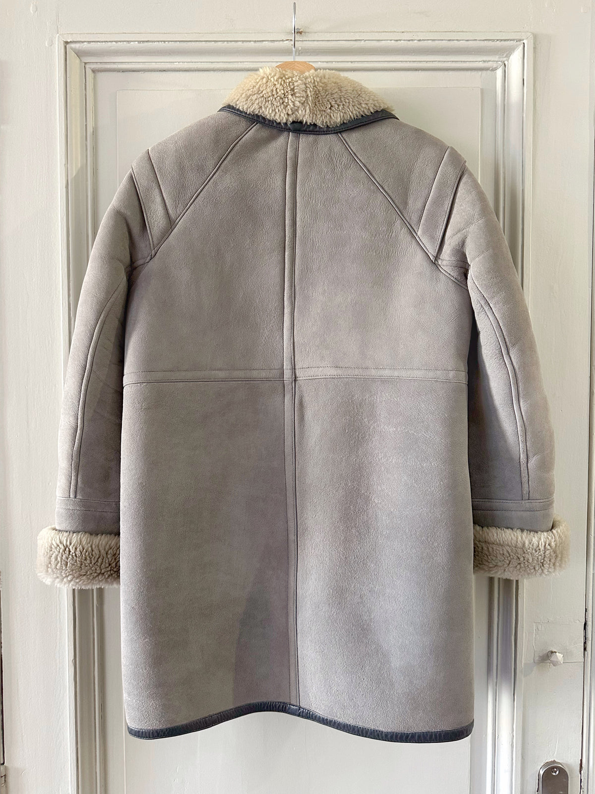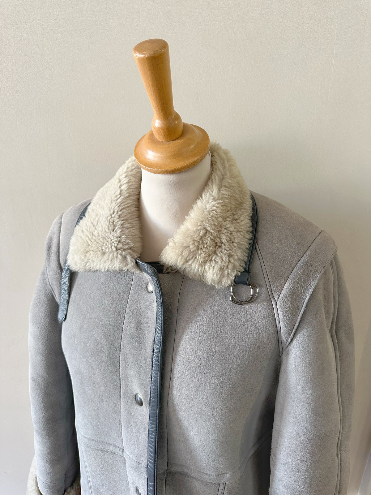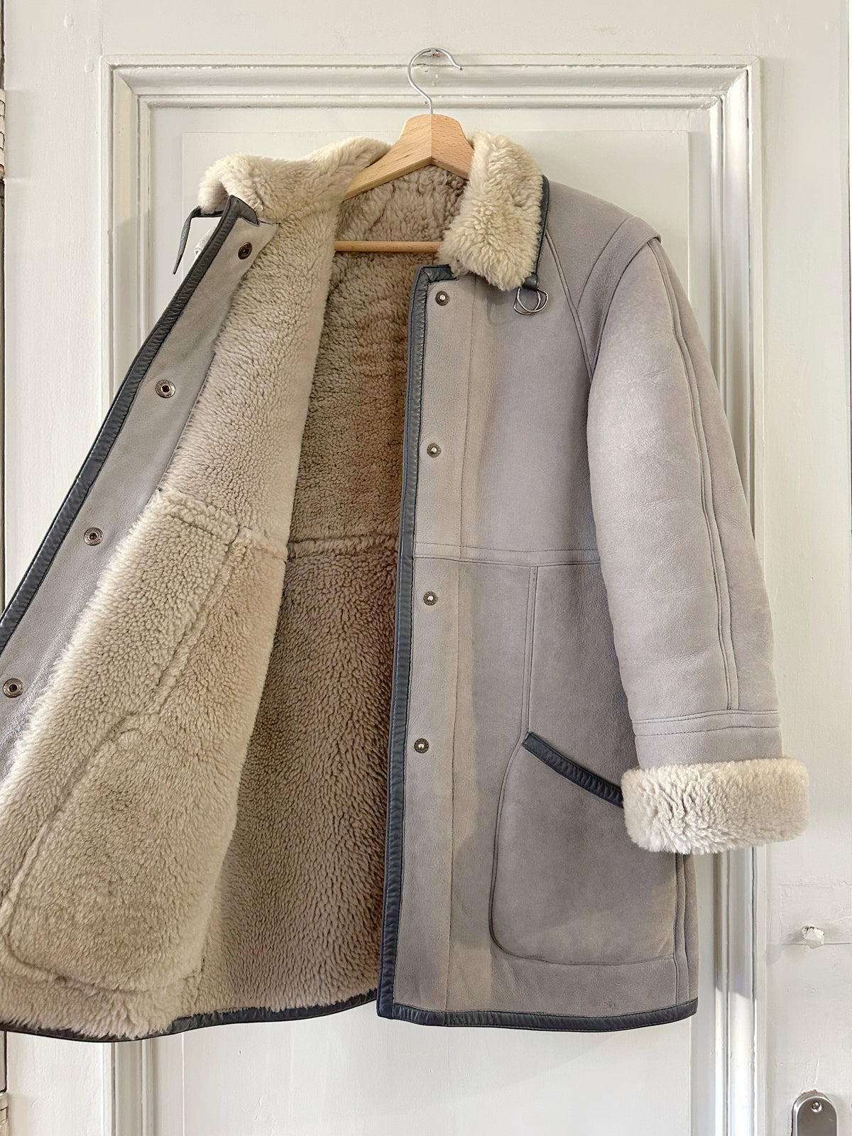Peau lainee en mouton retourné, exterieur en daim gris souris et ganses en cuir anthracite, interieur laine de mouton grise, col droit à revers en mouton. Fermeture à boutons pressions, Fabriquée en France, taille 36 portée ici ouvert sur une personne T40 et sur un mannequin T36. Longueur 80cm.