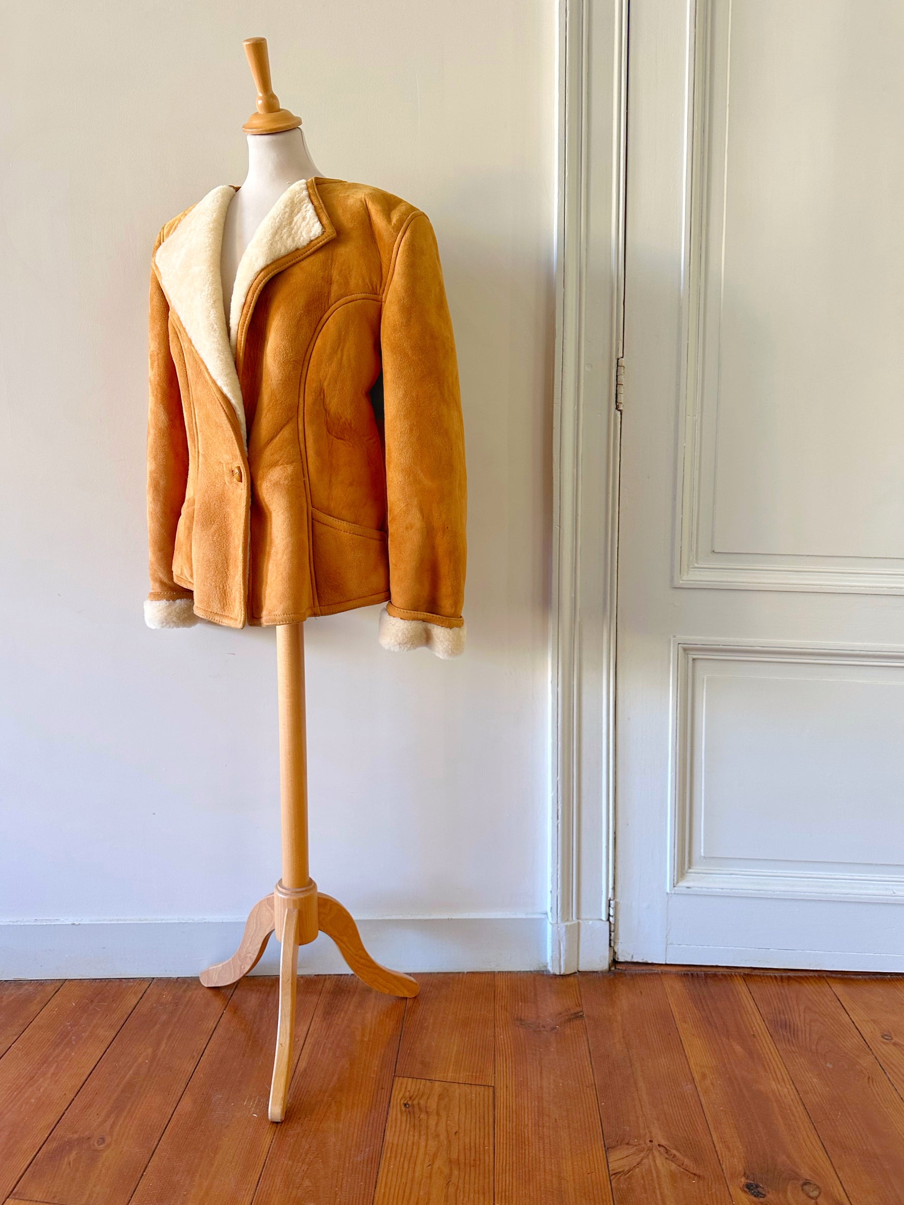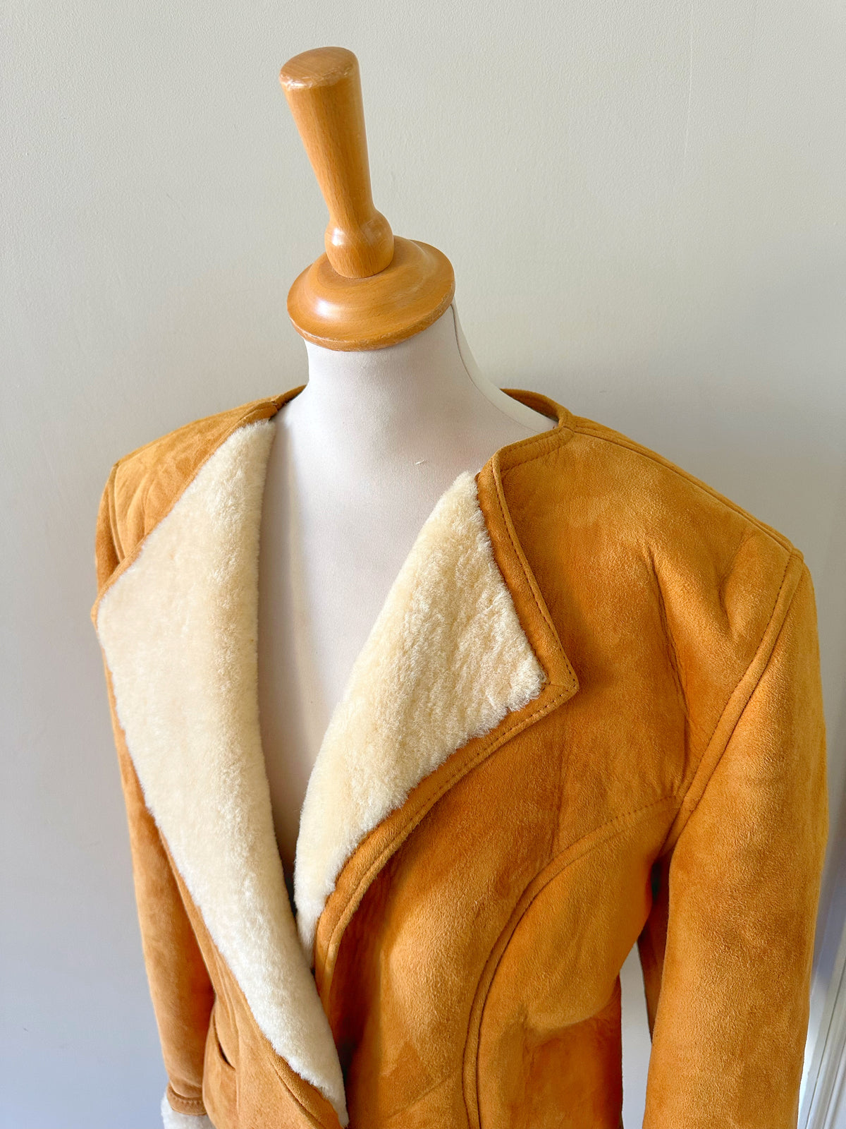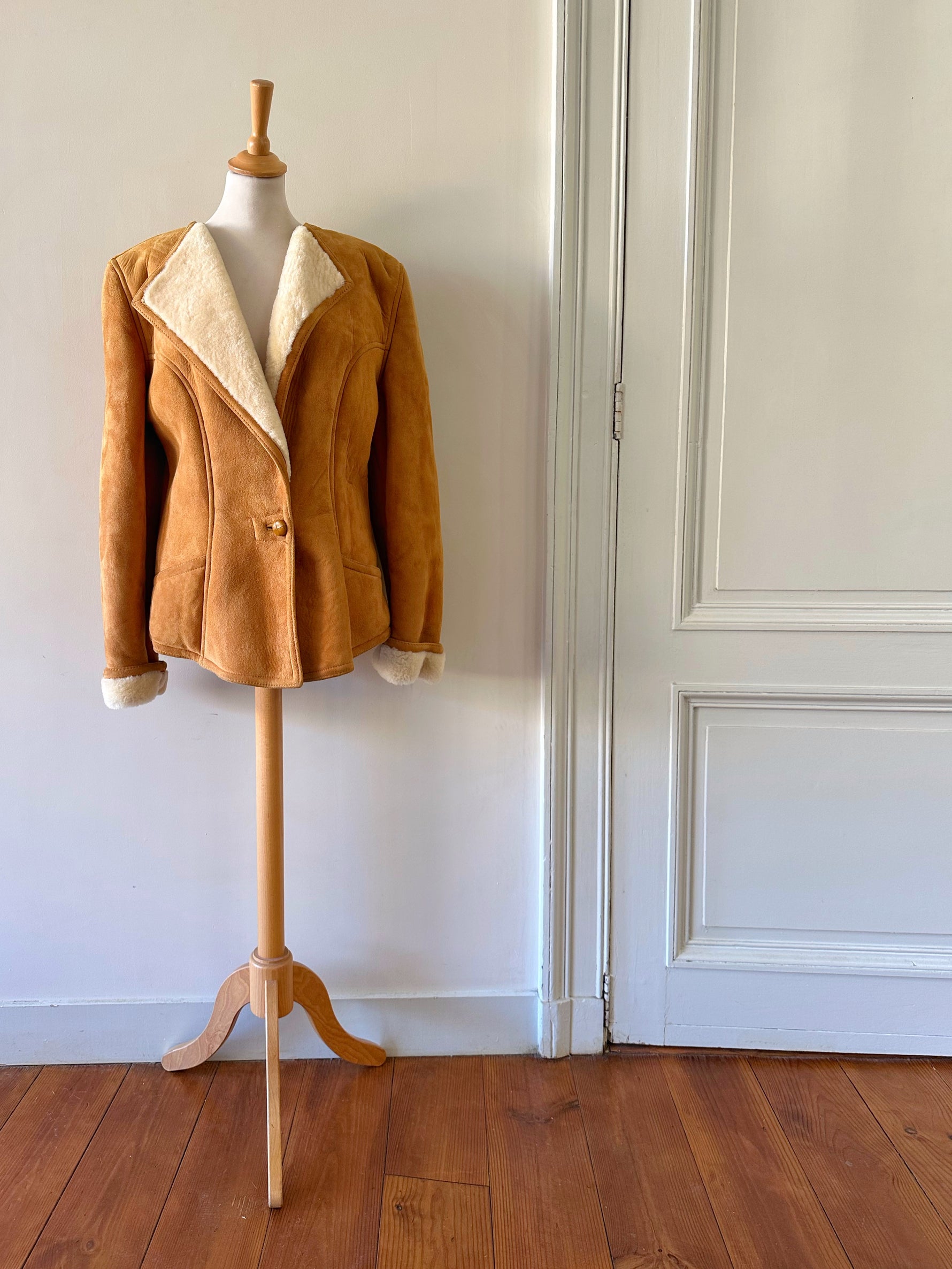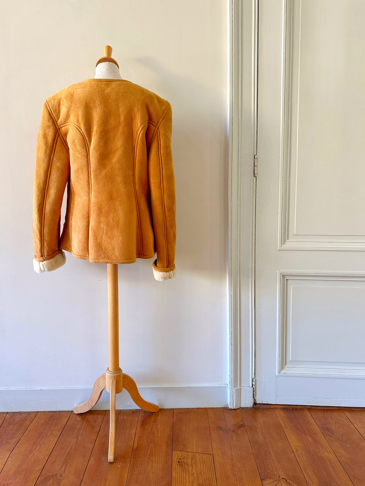 Peau lainee en mouton retourné, exterieur en daim caramel blond, interieur laine de mouton ecrue, col droit à revers en mouton. Forme courte et cintrée, Fabriquée en Italie, convient aux tailles 36 et 38 portée ici ouvert sur une personne T40 et sur un mannequin T36. Longueur 65cm.