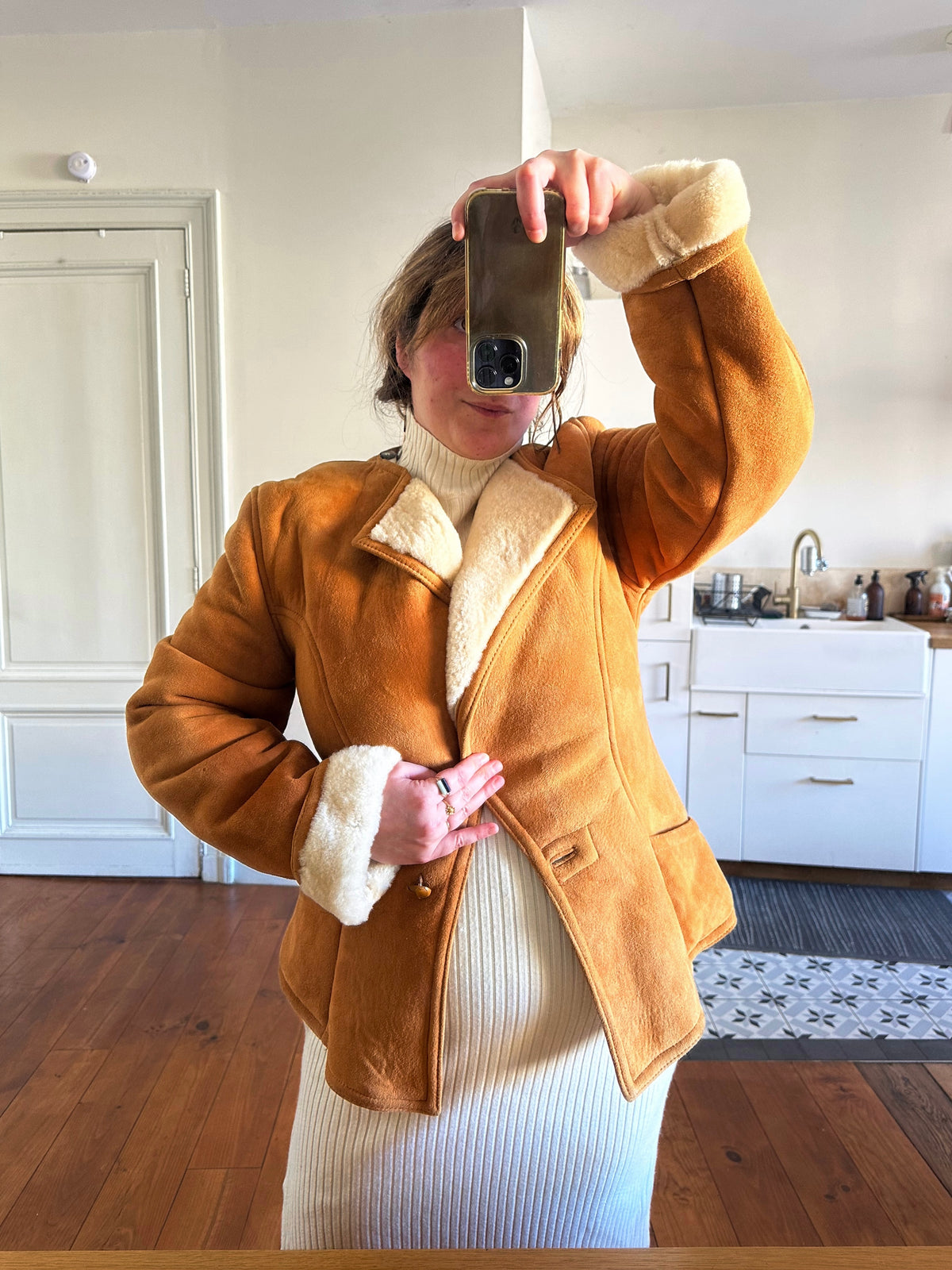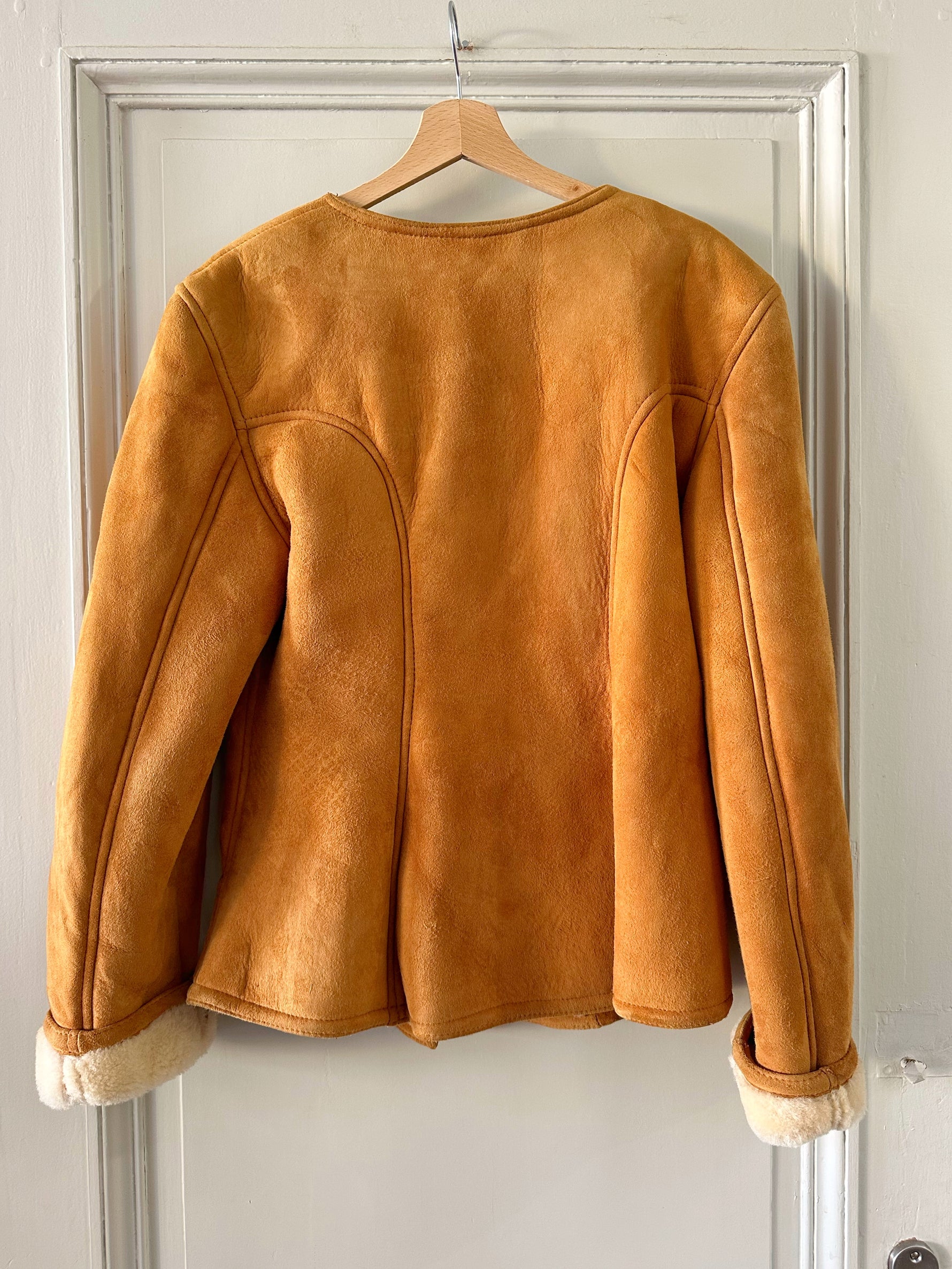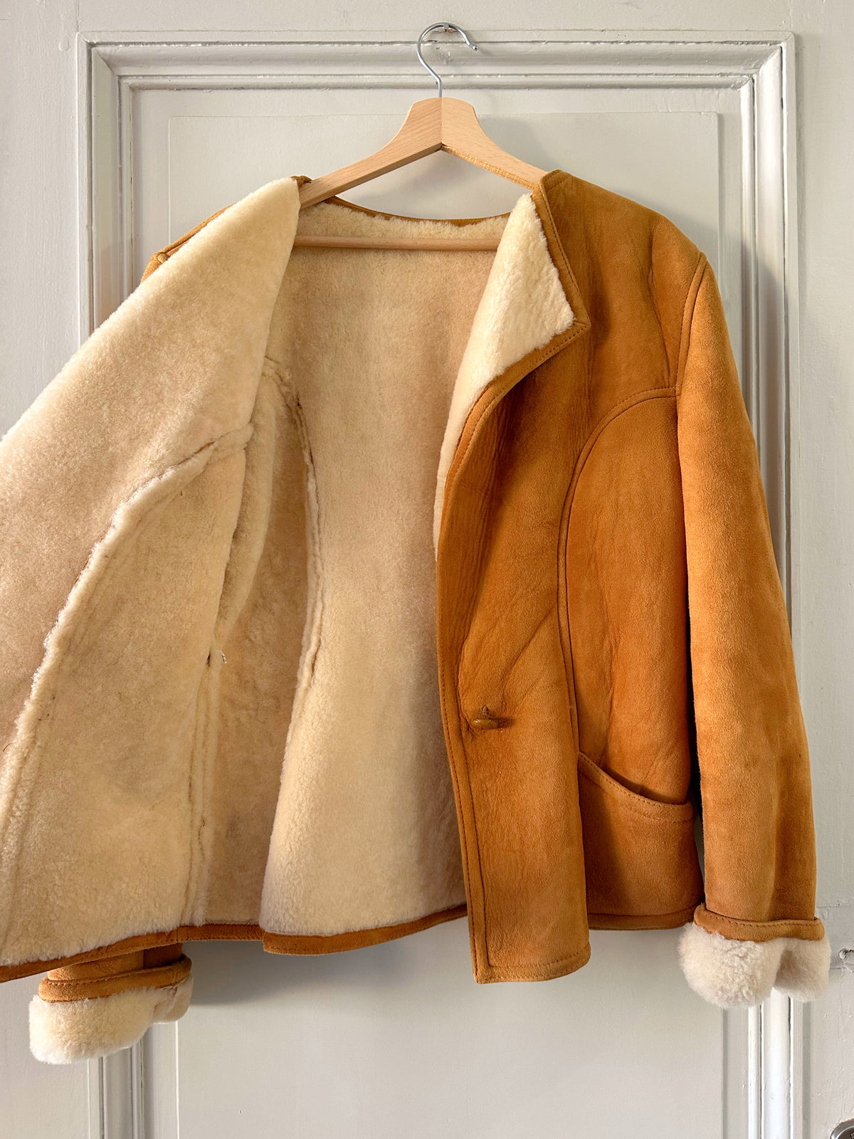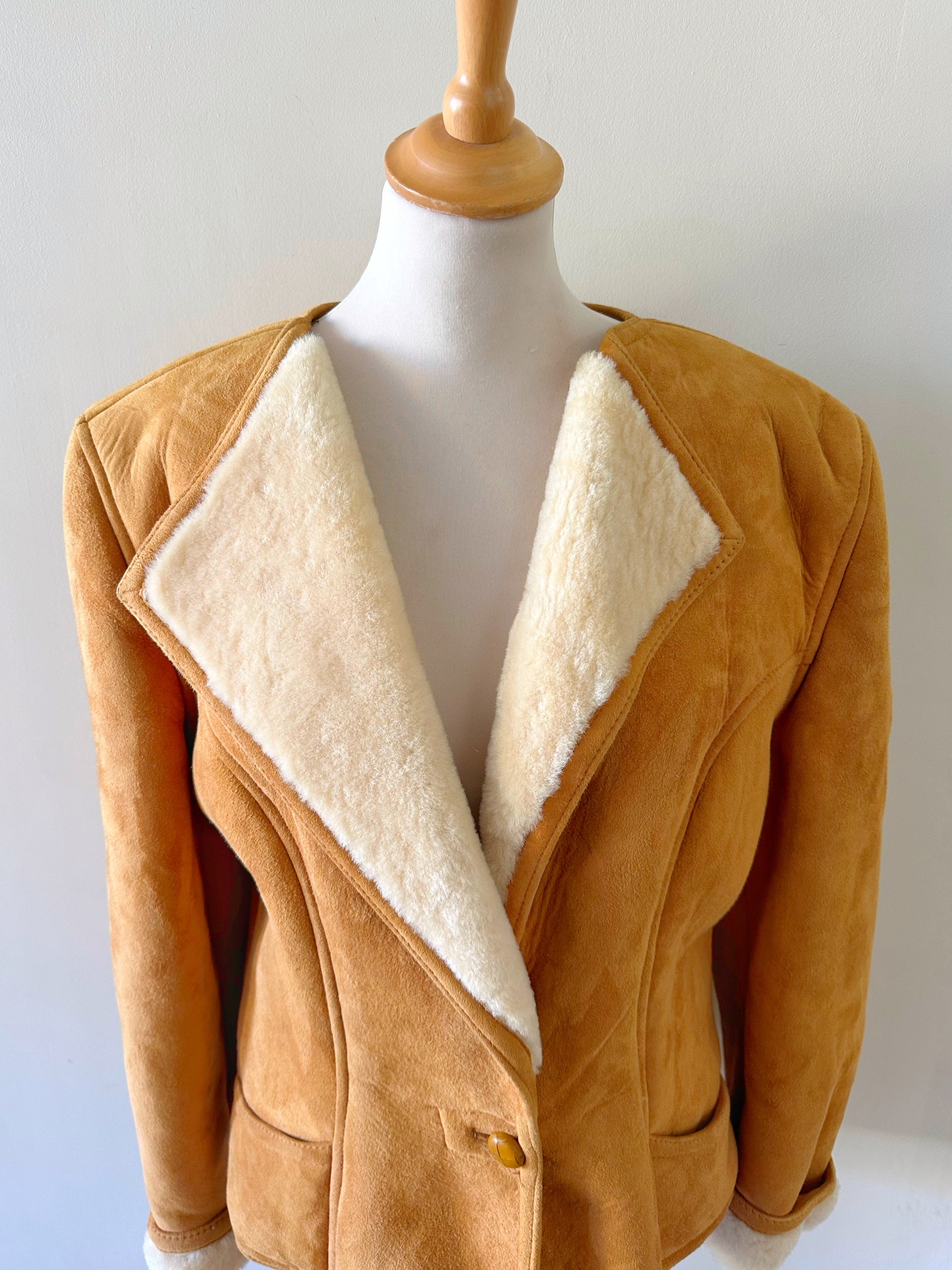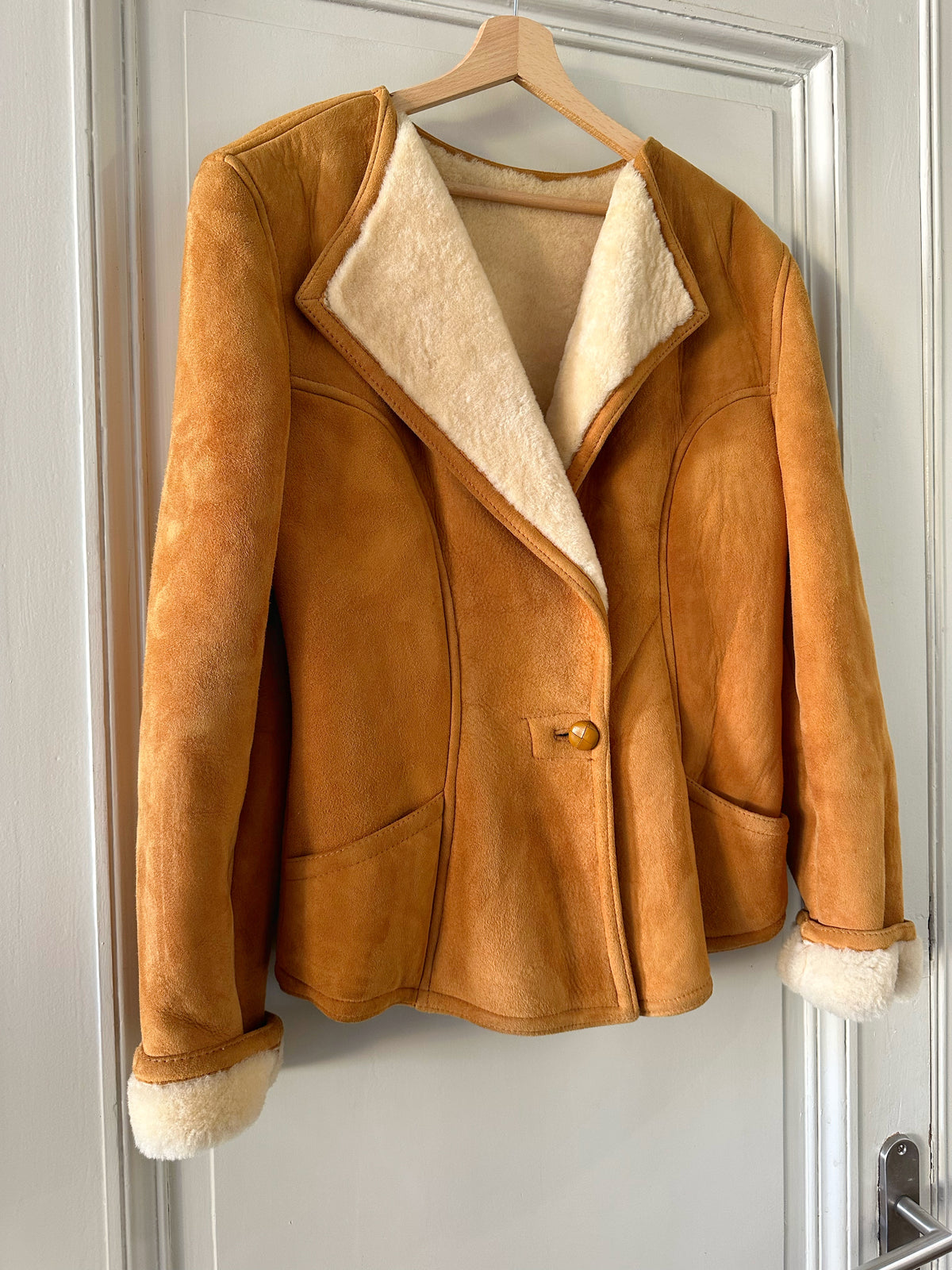 Peau lainee en mouton retourné, exterieur en daim caramel blond, interieur laine de mouton ecrue, col droit à revers en mouton. Forme courte et cintrée, Fabriquée en Italie, convient aux tailles 36 et 38 portée ici ouvert sur une personne T40 et sur un mannequin T36. Longueur 65cm.