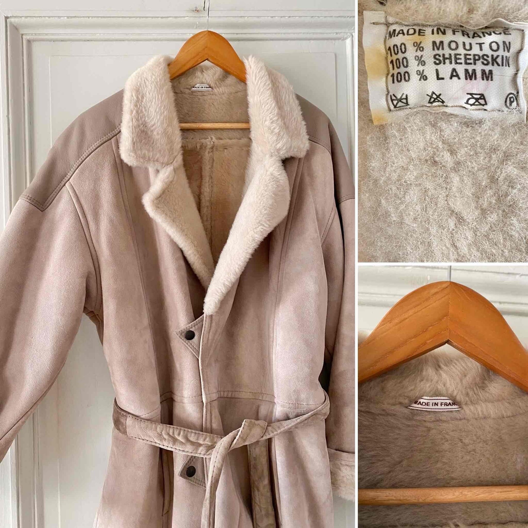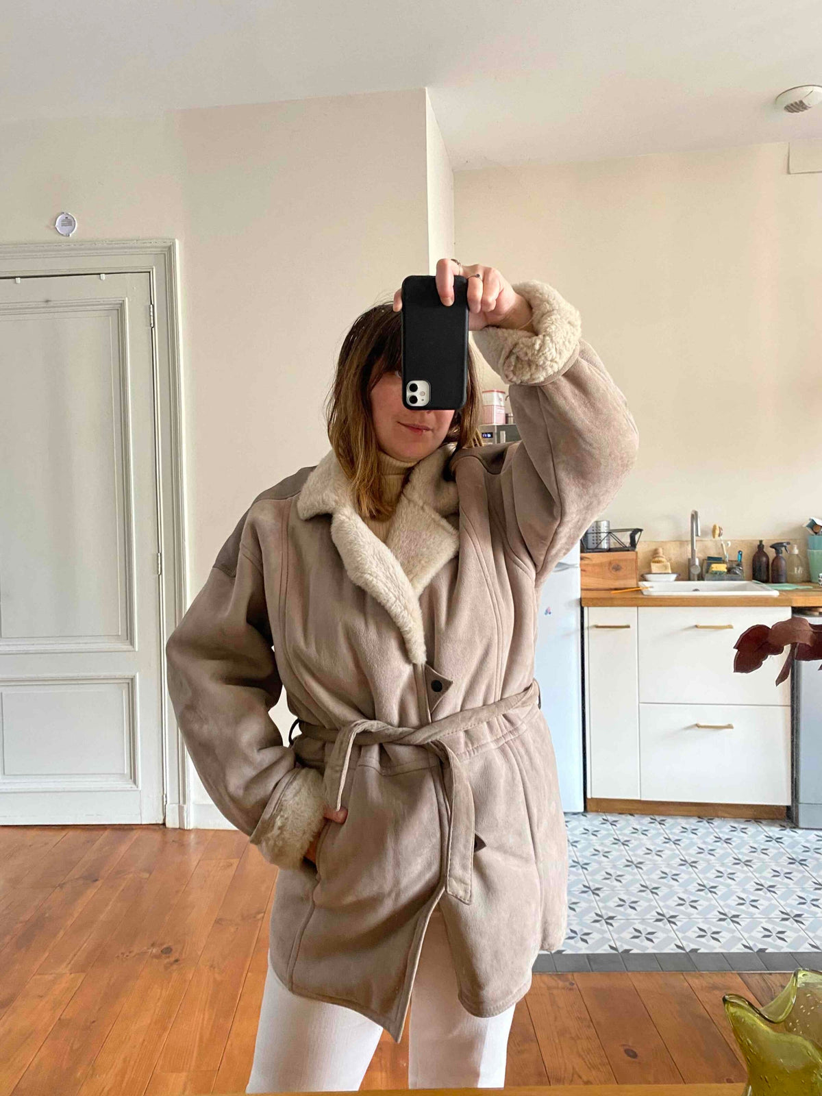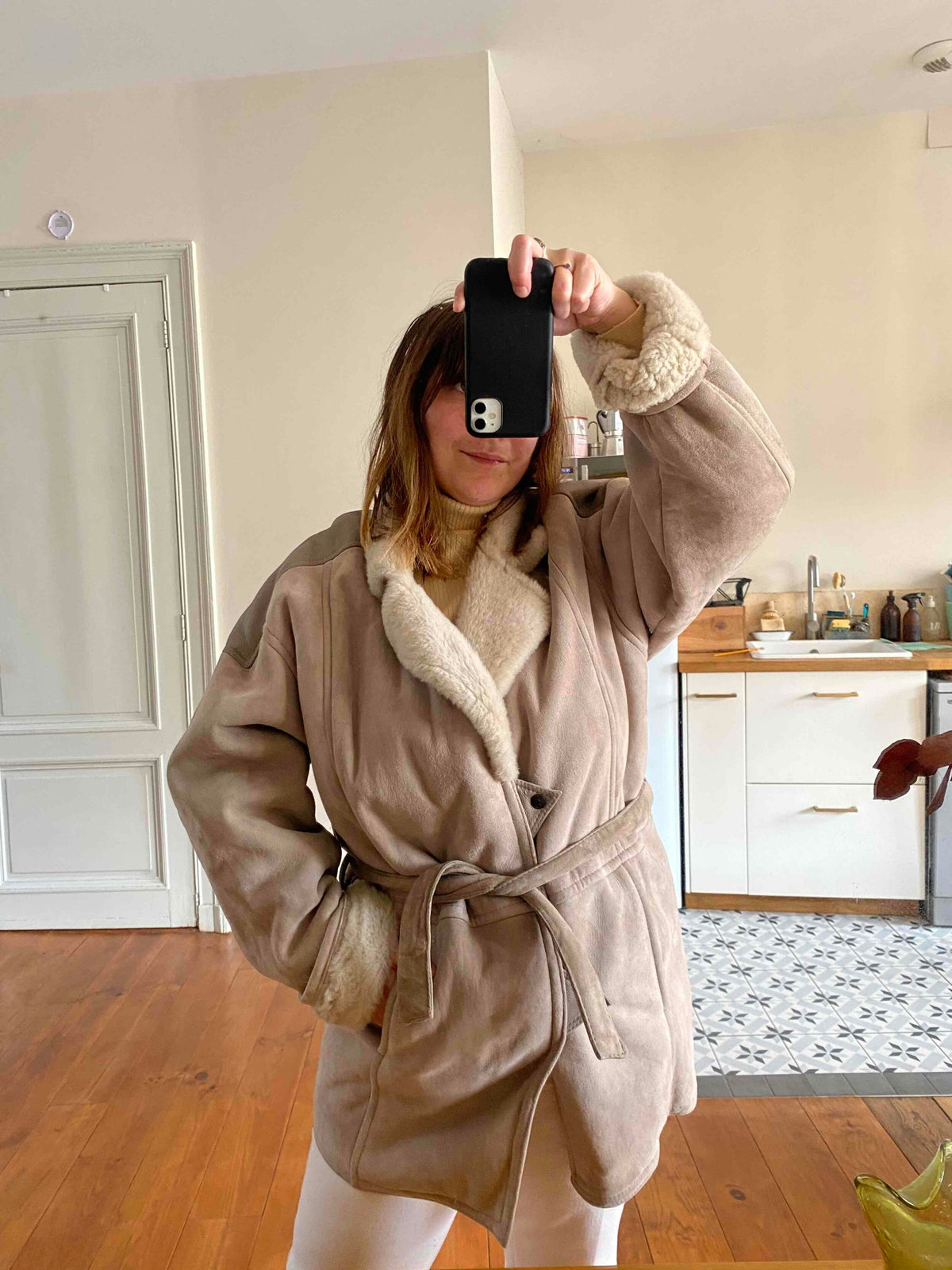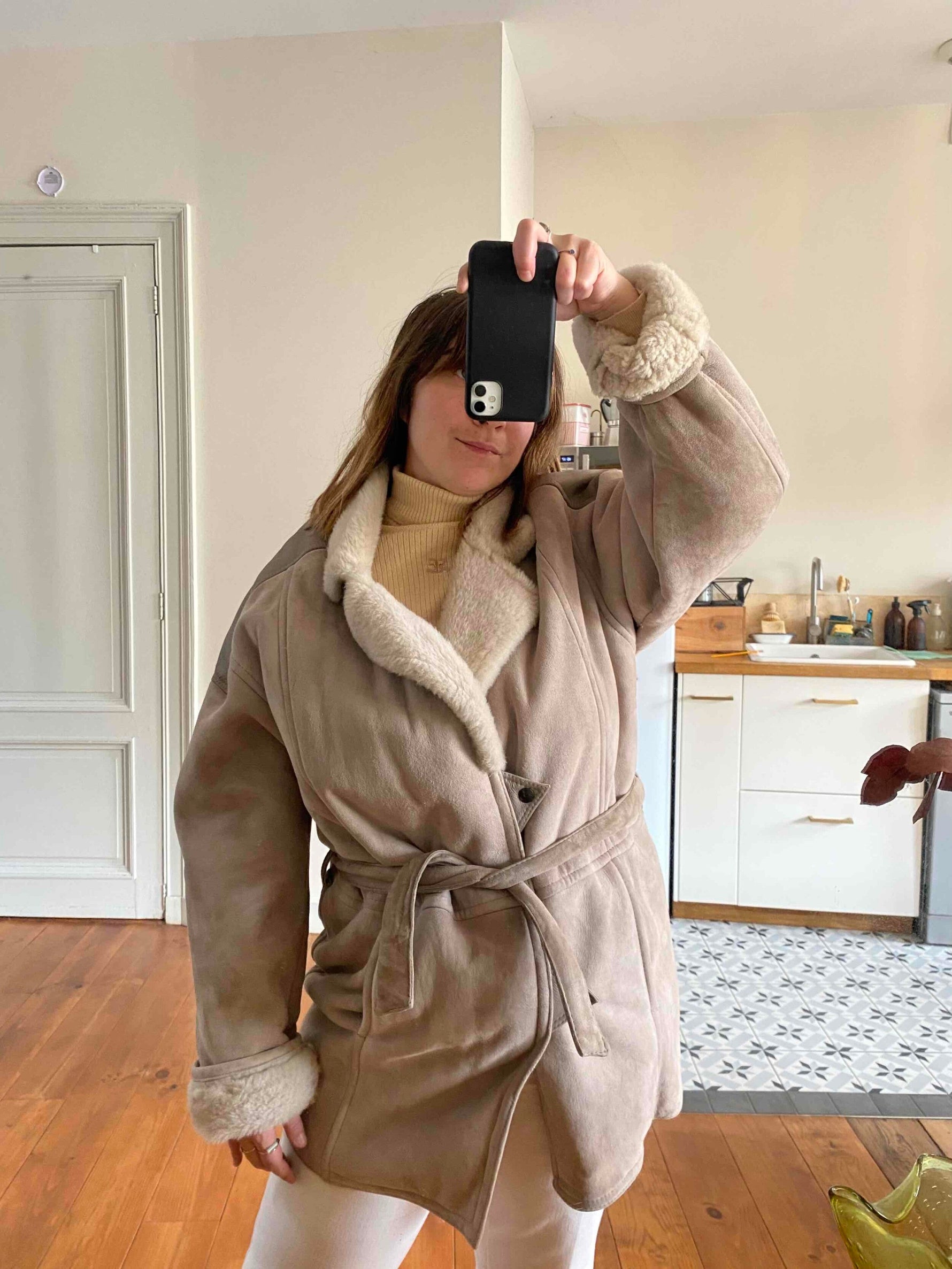 Prix unitaire parPeau lainee, en mouton retourné extérieur daim et empiecements en cuir beige taupe, intérieur mouton beige, taille ceinturée a nouer façon saharienne, fabriqué en France, taille 38 et 40 porté ici sur une personne T40.