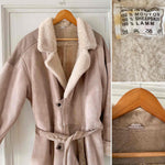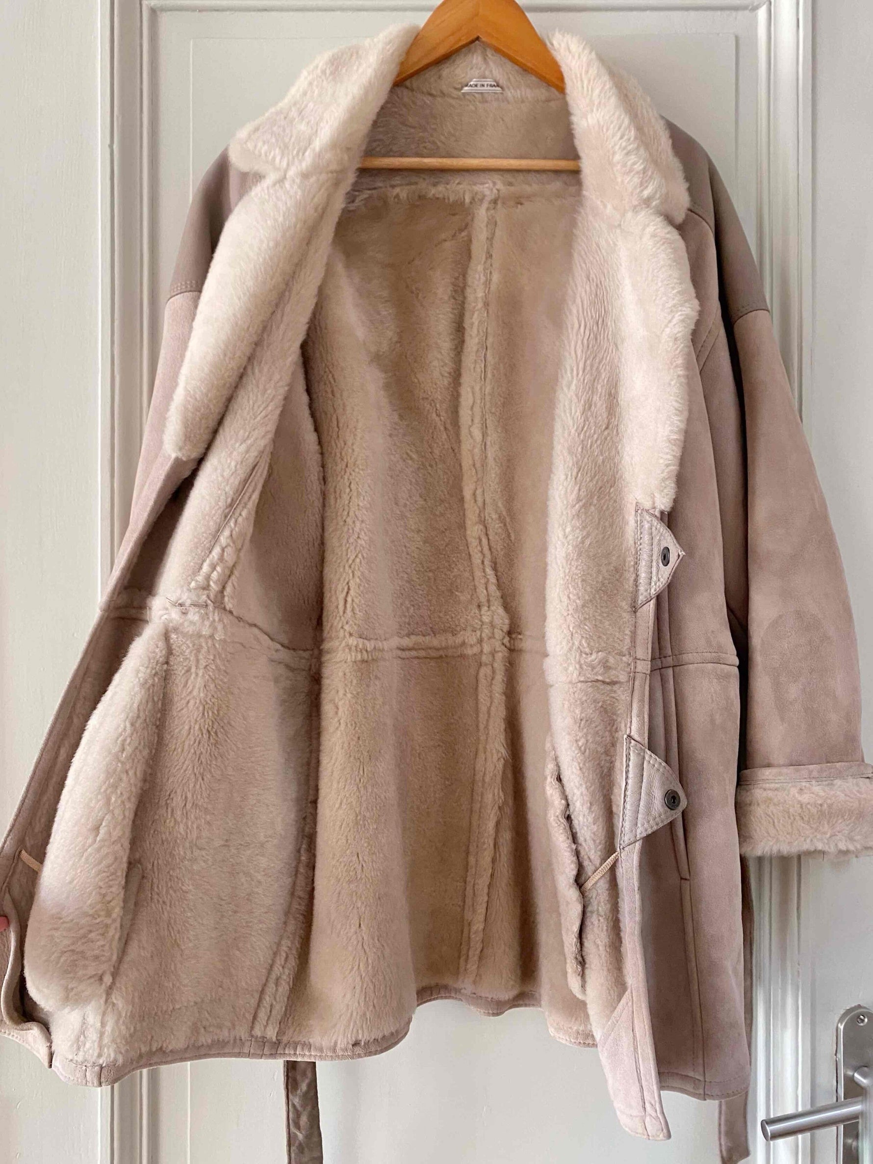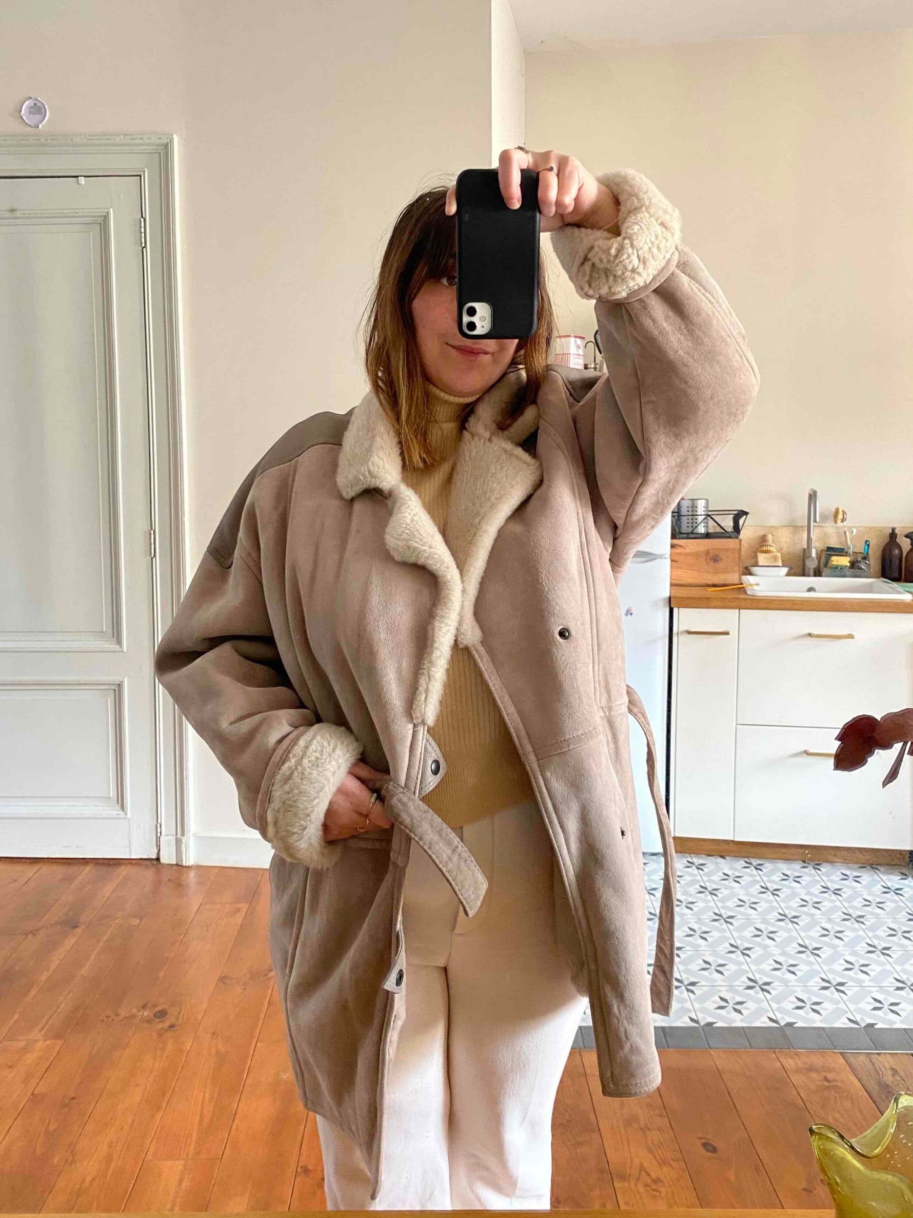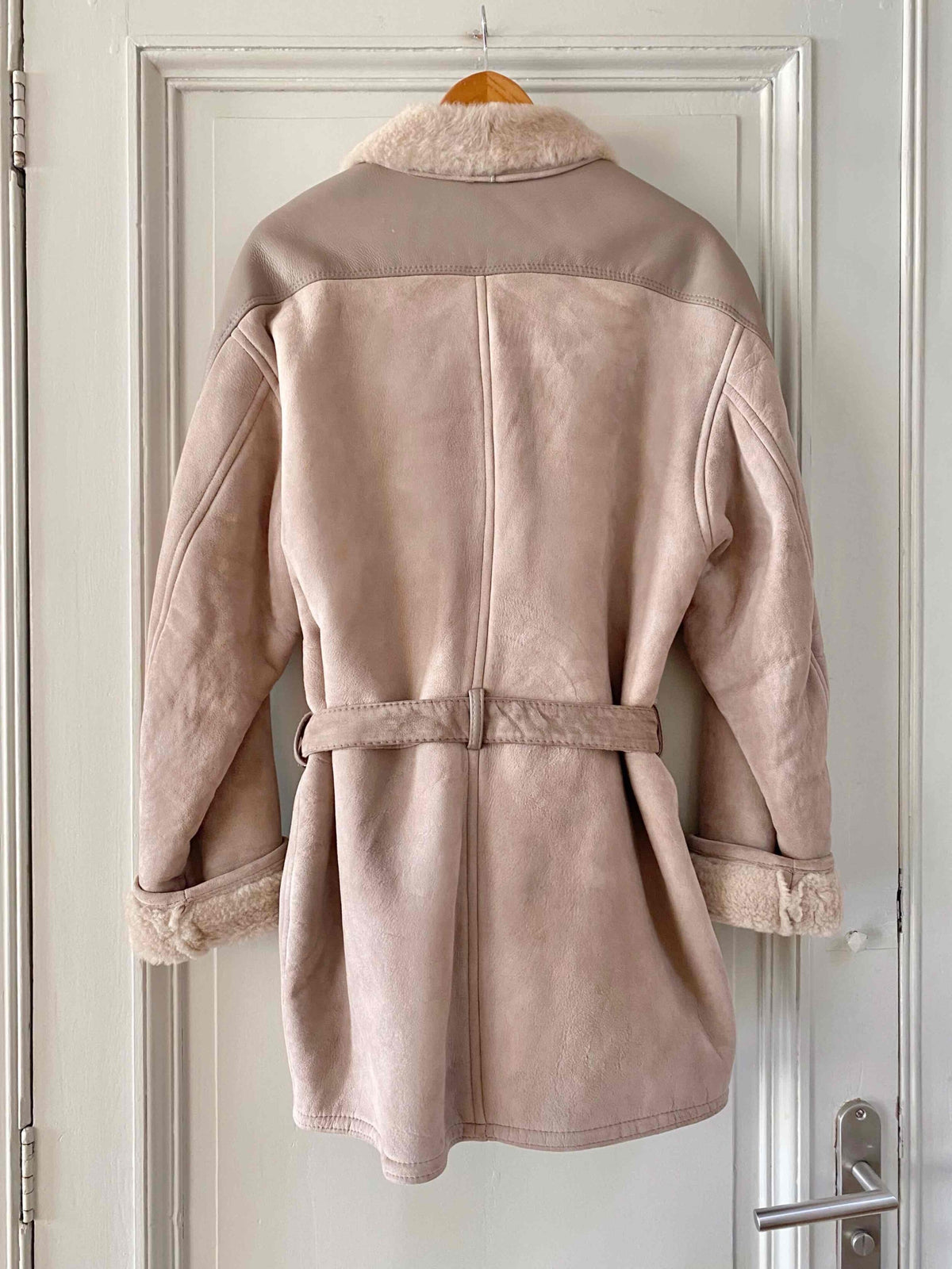 Prix unitaire parPeau lainee, en mouton retourné extérieur daim et empiecements en cuir beige taupe, intérieur mouton beige, taille ceinturée a nouer façon saharienne, fabriqué en France, taille 38 et 40 porté ici sur une personne T40.