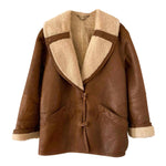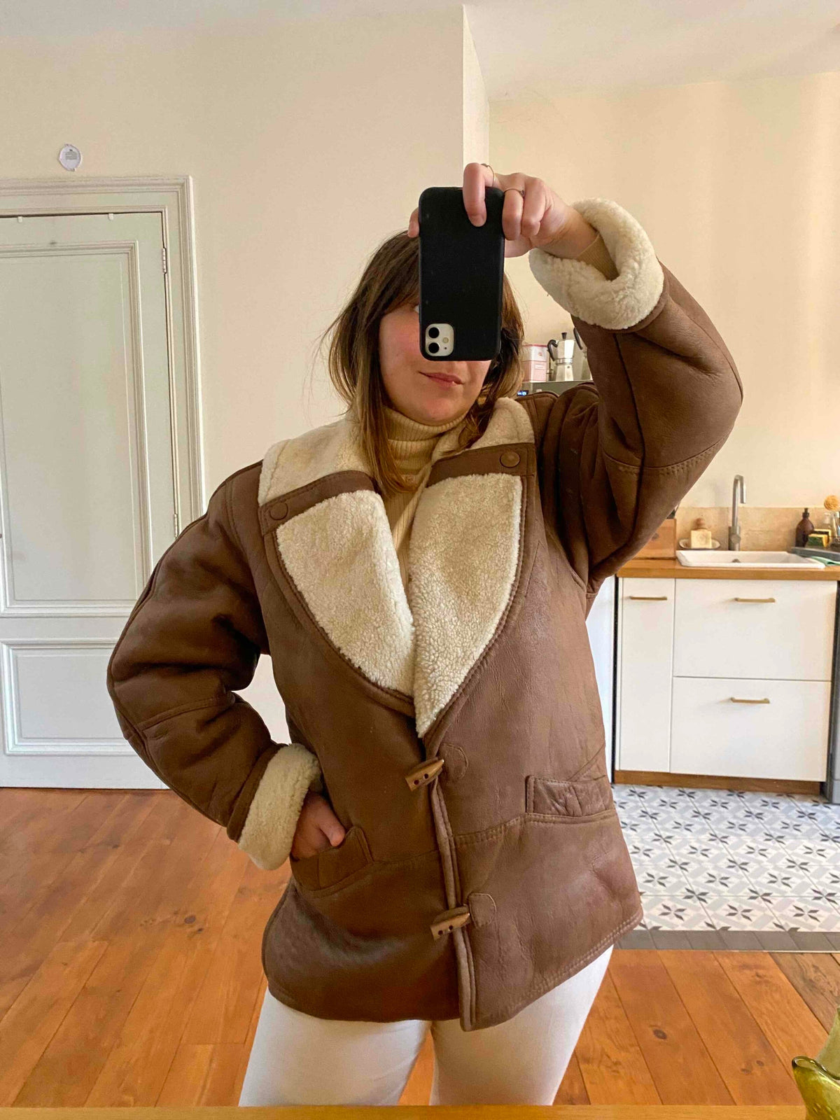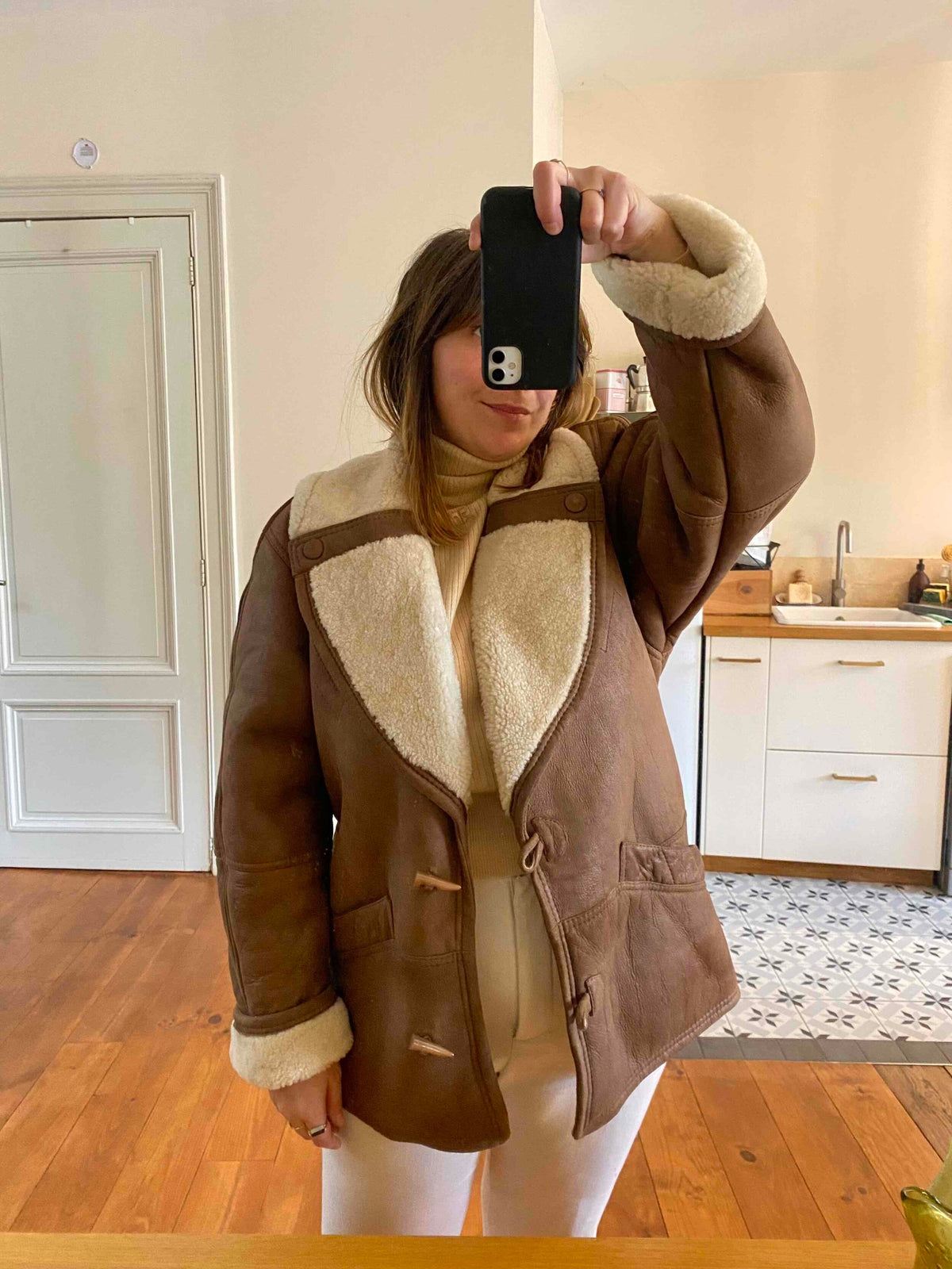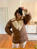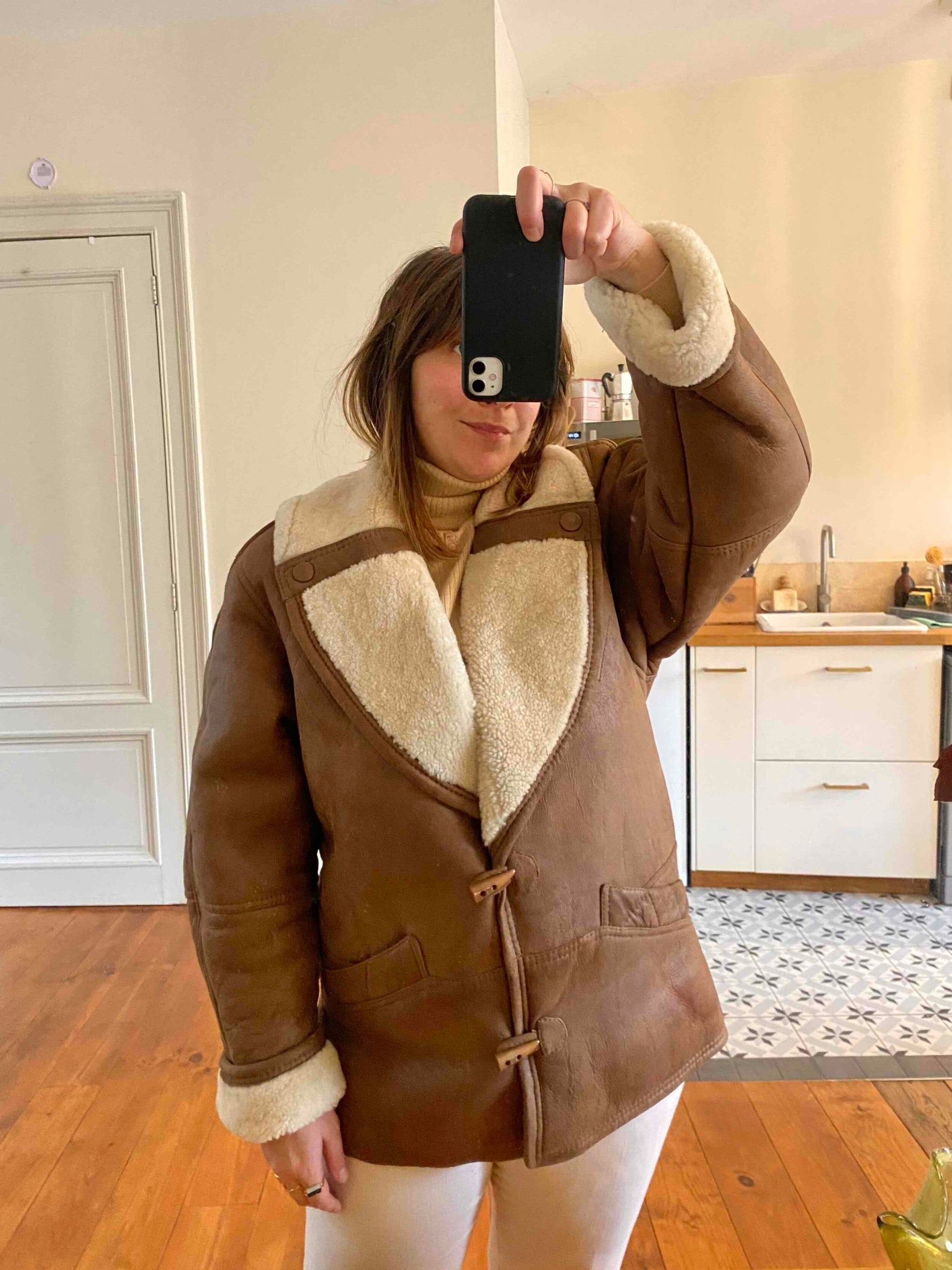 Prix unitaire parPeau lainée en mouton retourné extérieur cuir marron, intérieur mouton écru, grand col châle en mouton, fermeture par deux boutons cornes duffle-coat, fentes côtés, fabriqué en Italie, taille 38 porté ici sur une personne T40.
