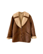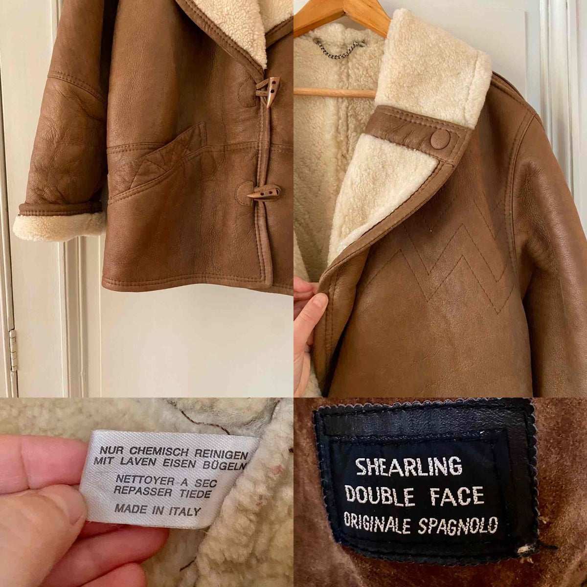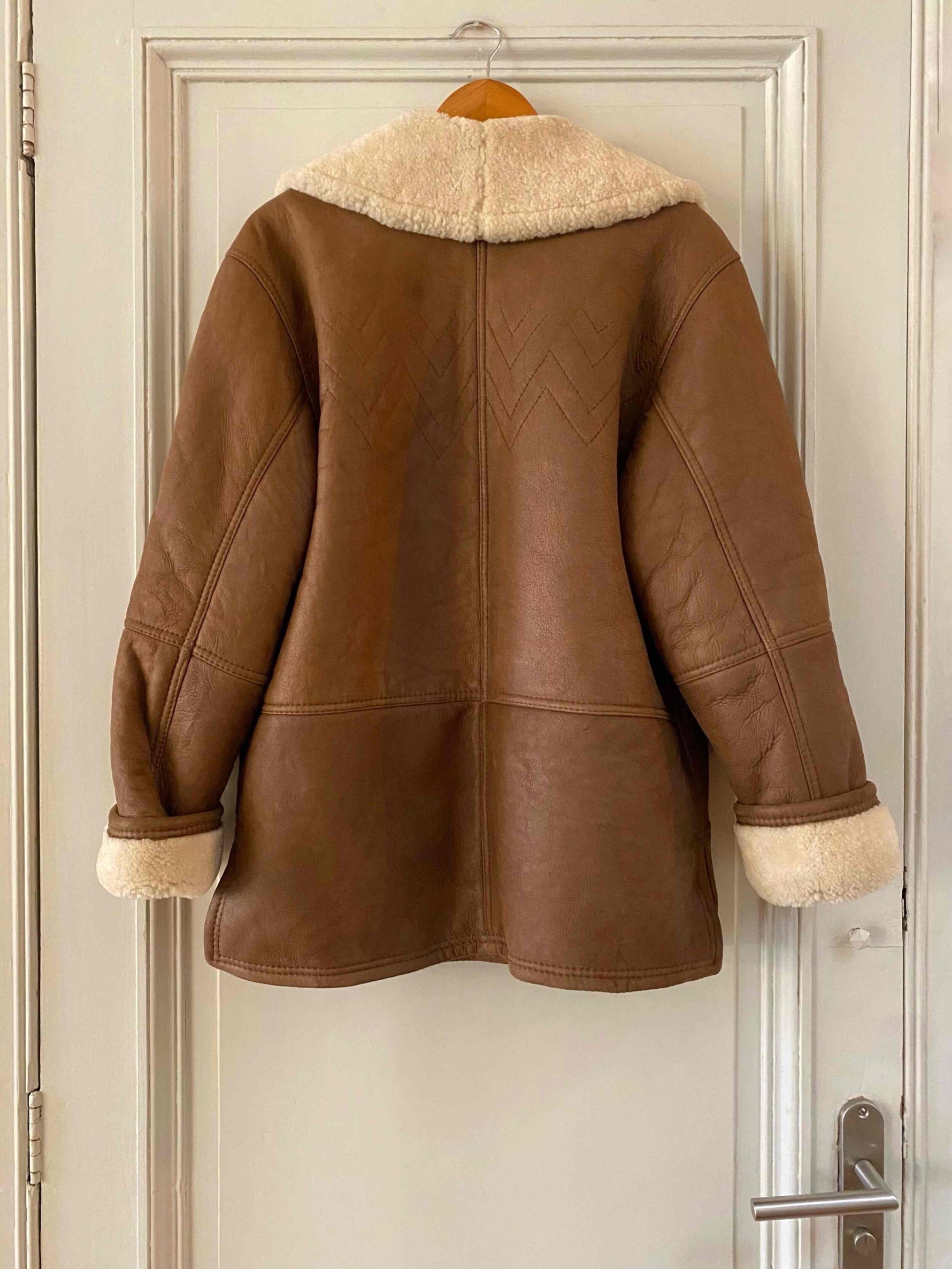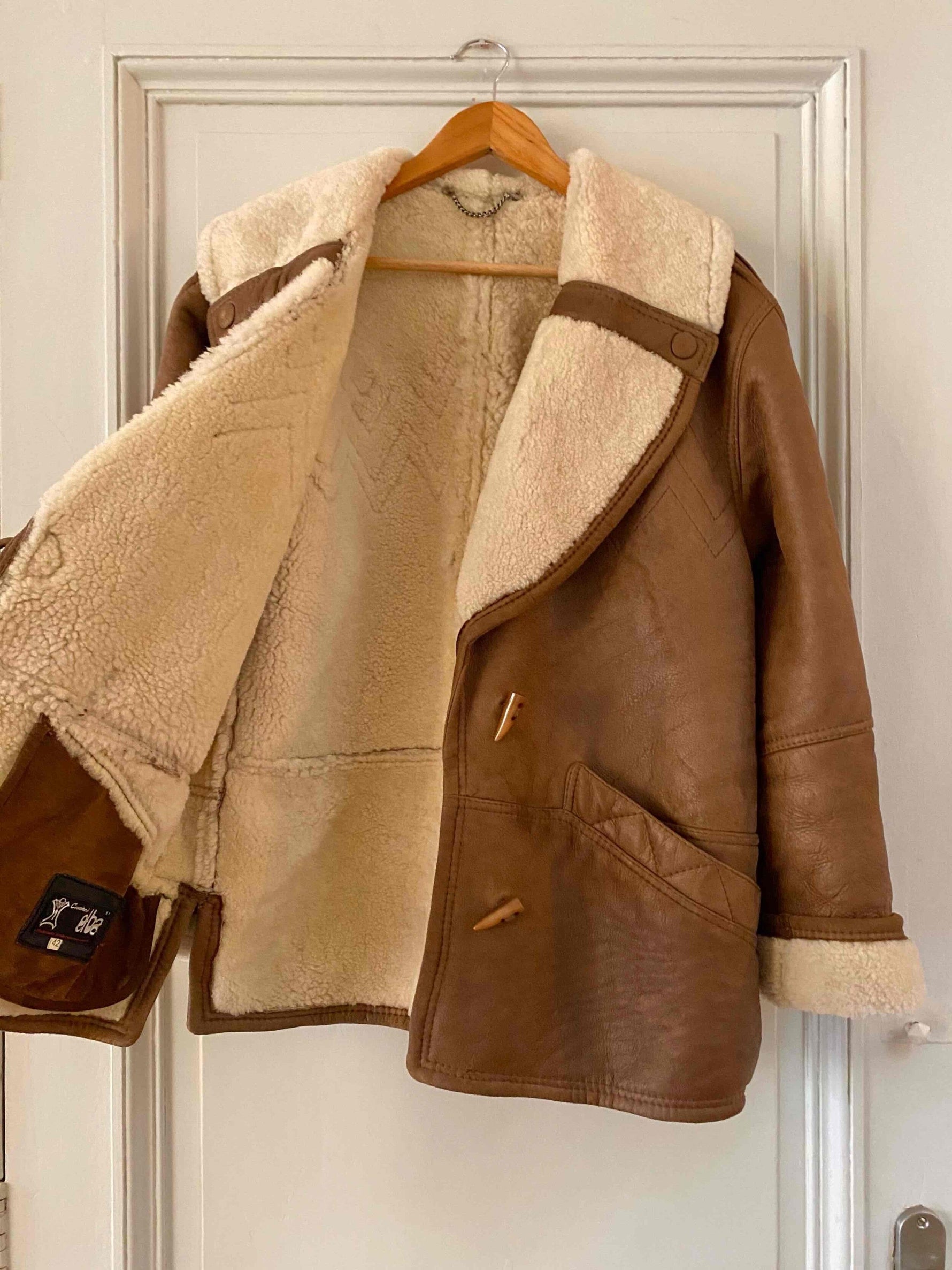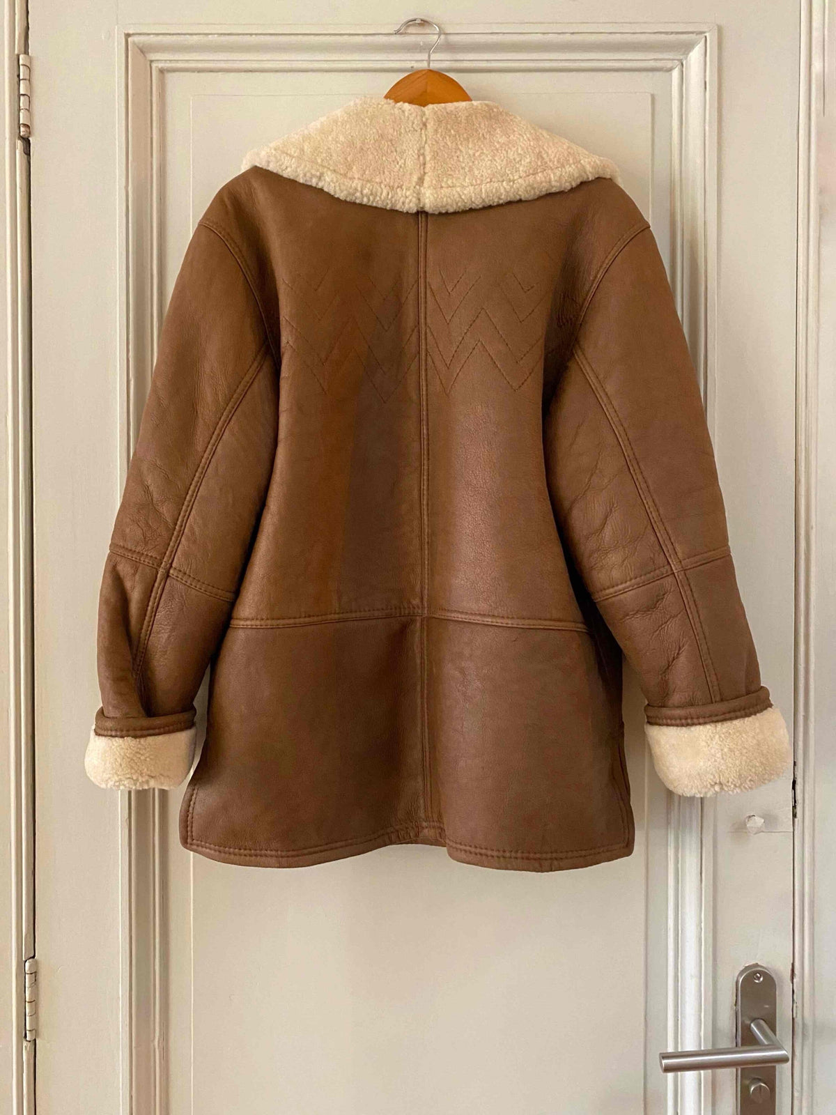 Prix unitaire parPeau lainée en mouton retourné extérieur cuir marron, intérieur mouton écru, grand col châle en mouton, fermeture par deux boutons cornes duffle-coat, fentes côtés, fabriqué en Italie, taille 38 porté ici sur une personne T40.