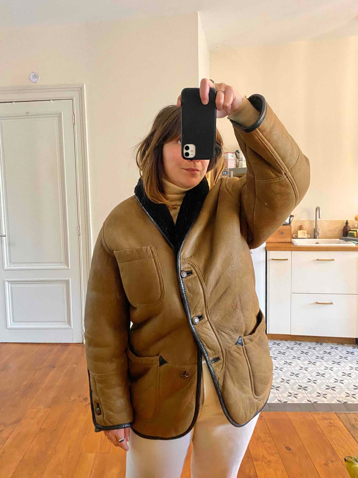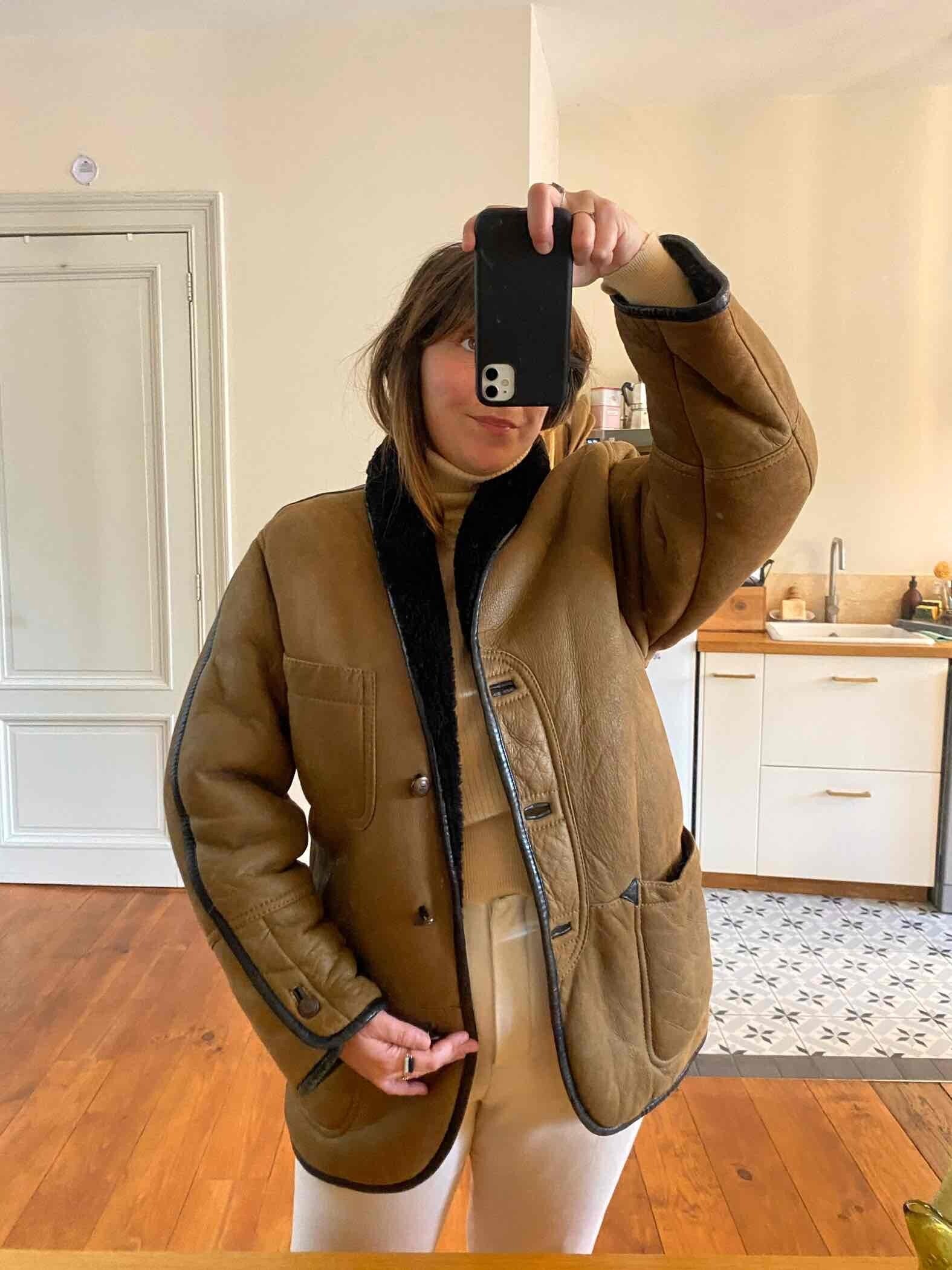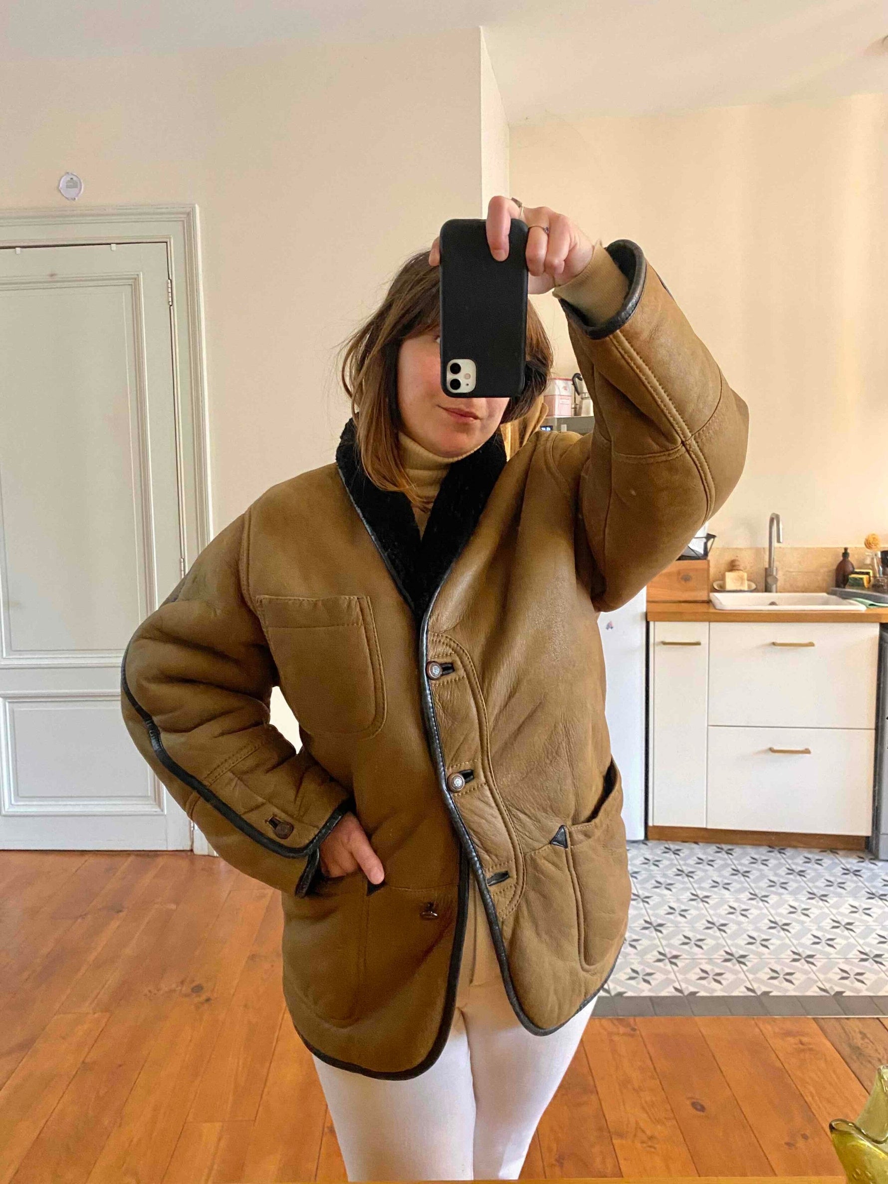 Prix unitaire parPeau lainée en mouton retourné extérieur cuir caramel gansé de cuir lisse noir, intérieur mouton noir, petit col châle mouton noir, boutonné, fabriqué en Italie, taille 38 porté ici un bouton ouvert sur une personne T40.