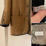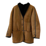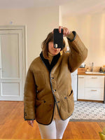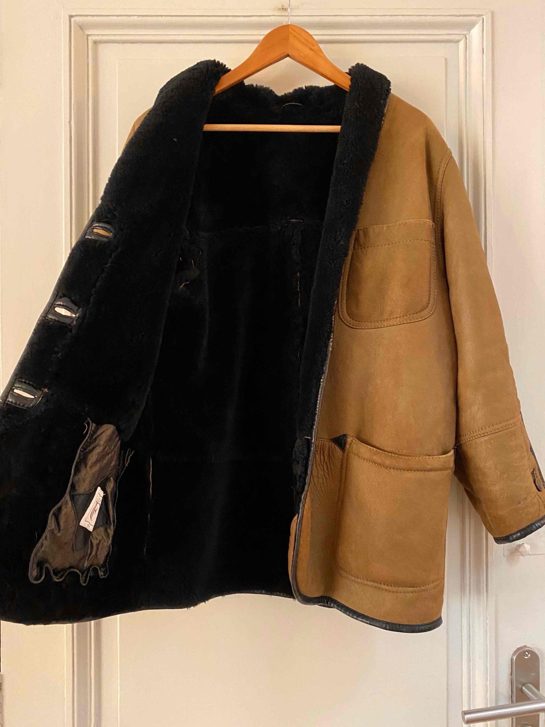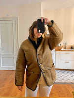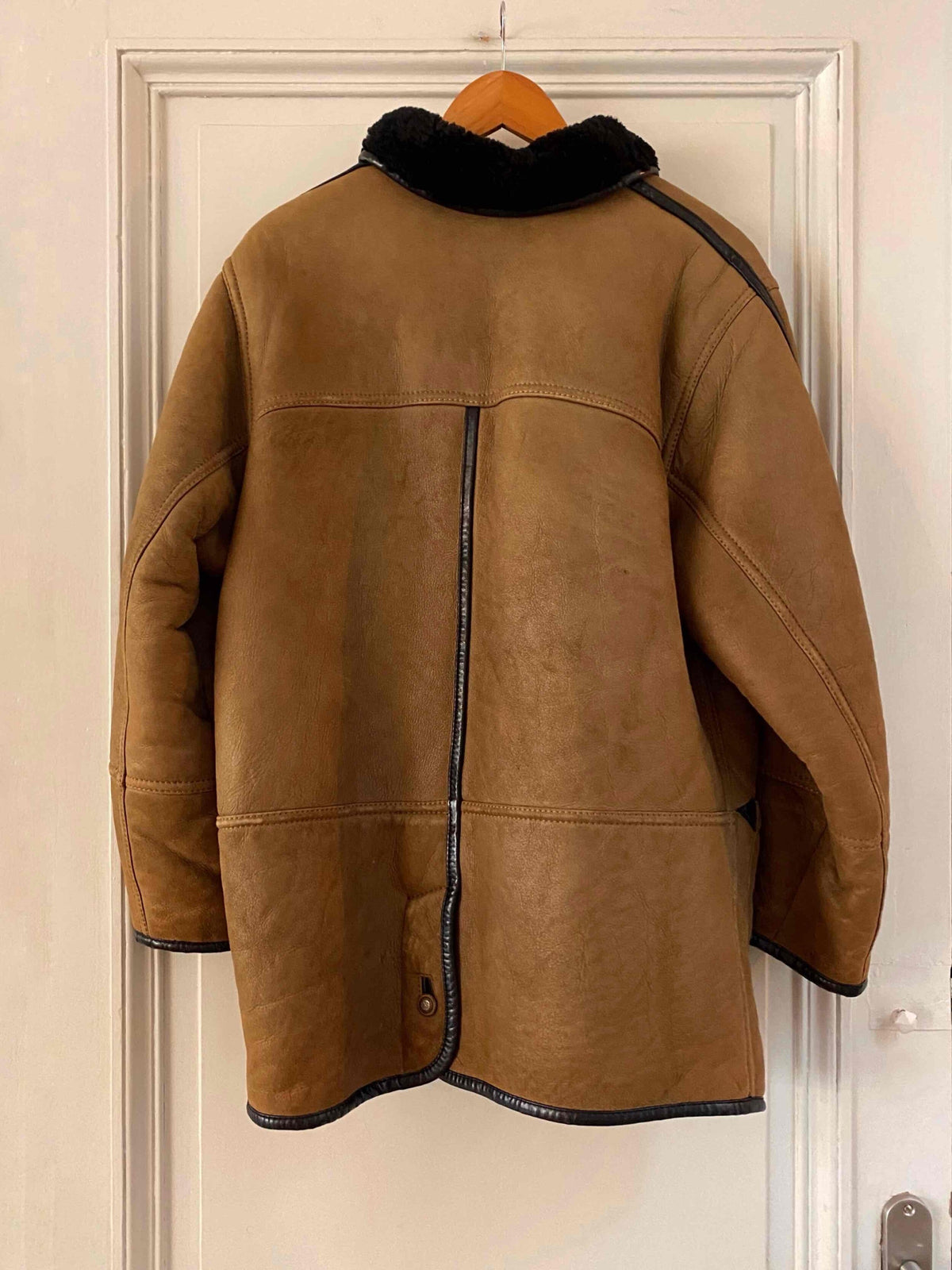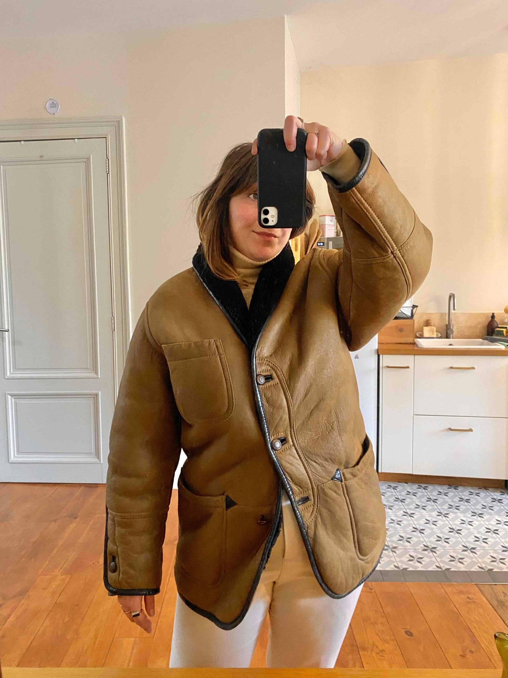 Prix unitaire parPeau lainée en mouton retourné extérieur cuir caramel gansé de cuir lisse noir, intérieur mouton noir, petit col châle mouton noir, boutonné, fabriqué en Italie, taille 38 porté ici un bouton ouvert sur une personne T40.