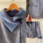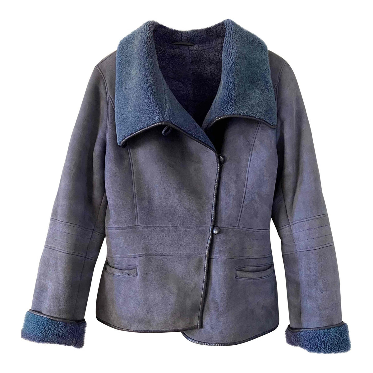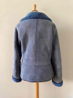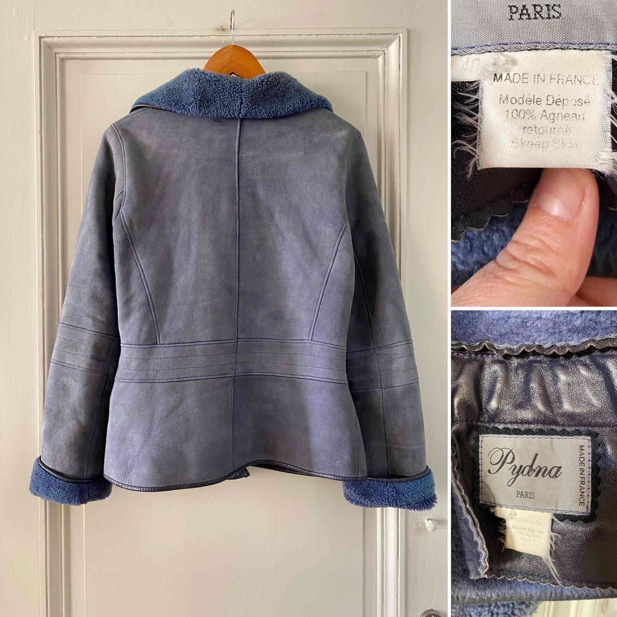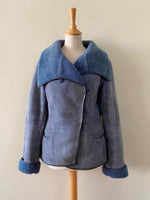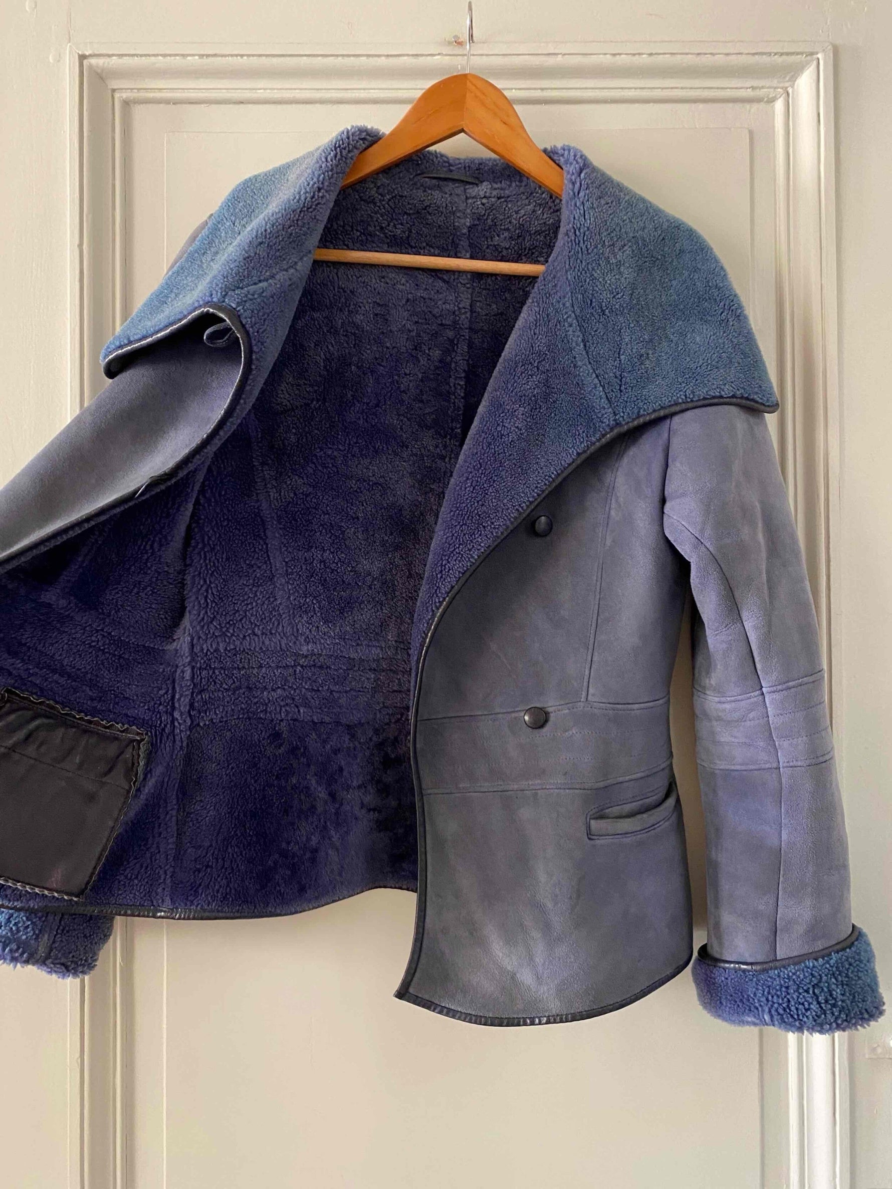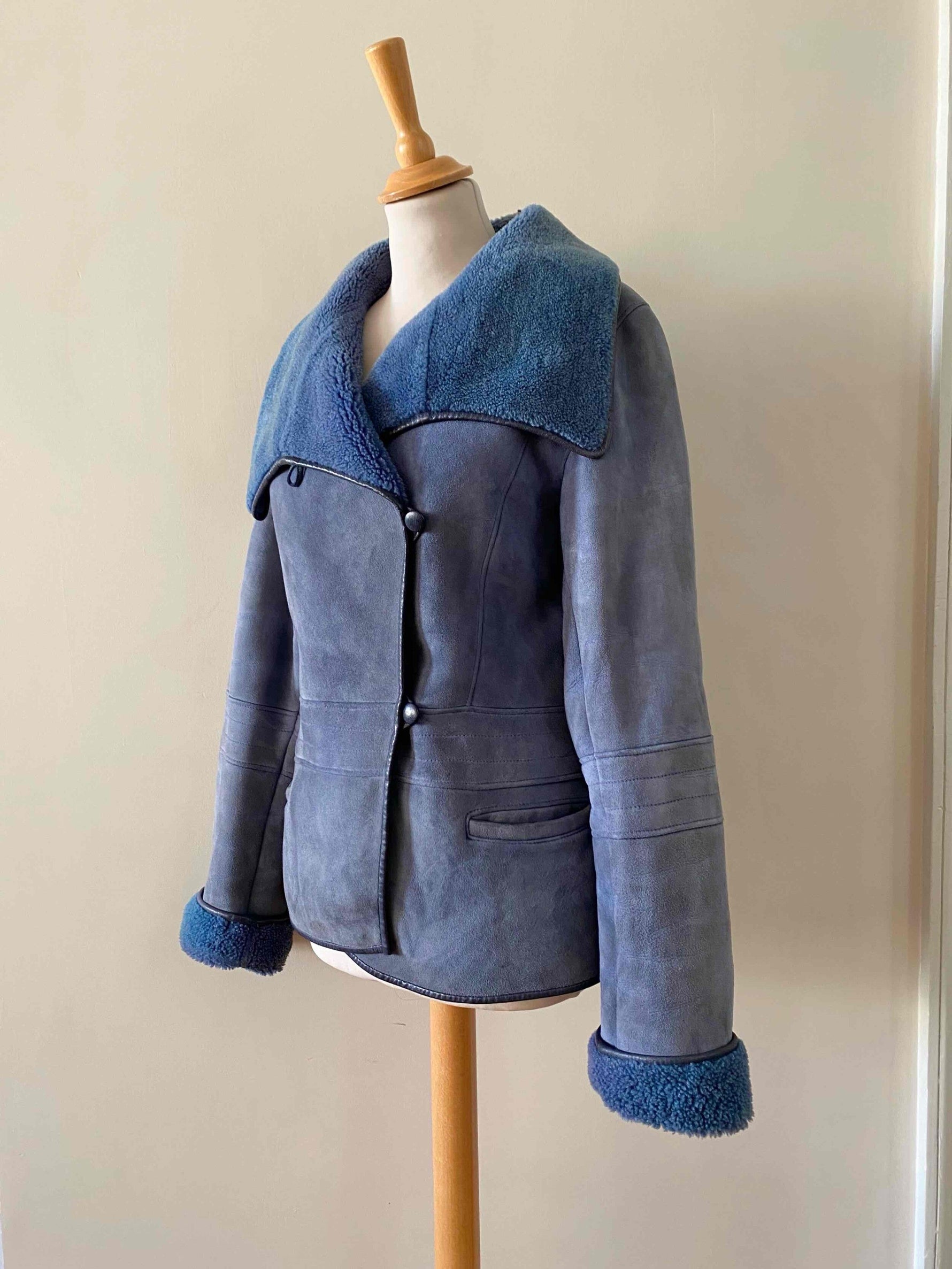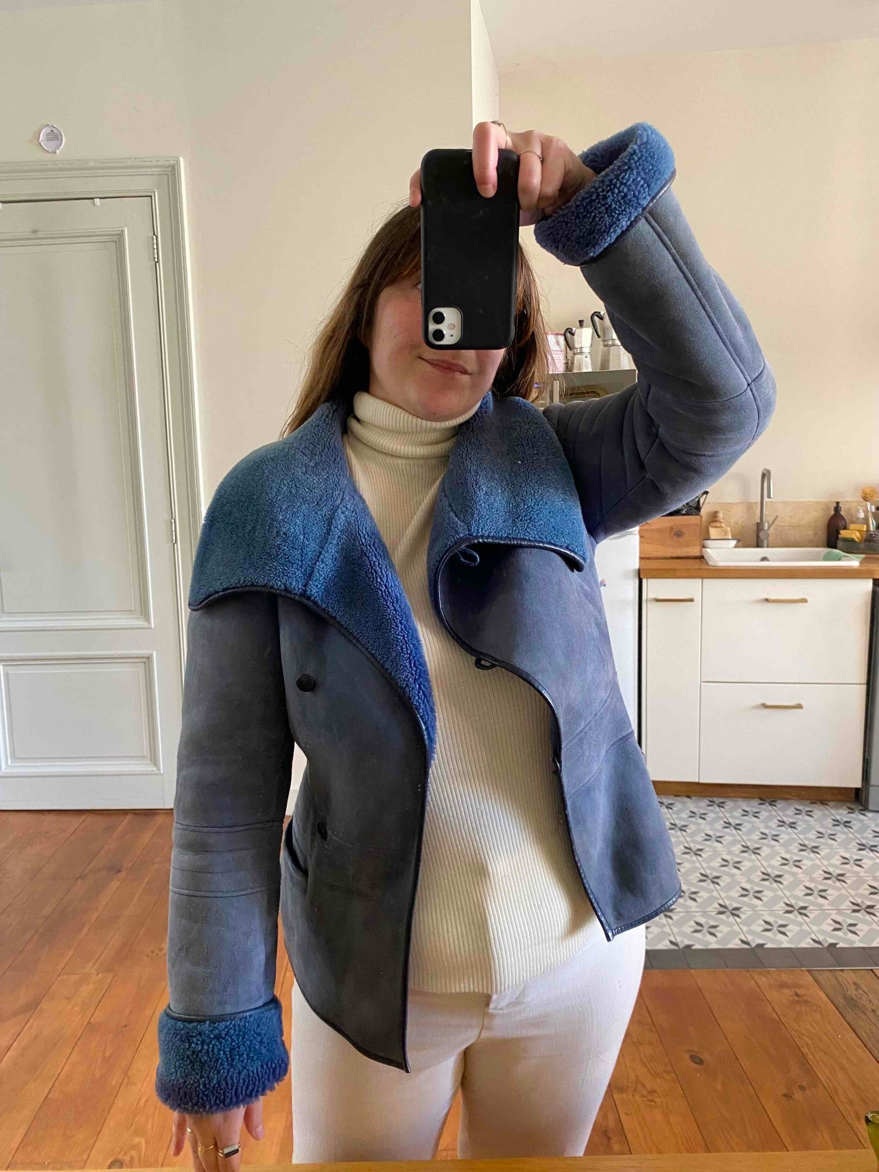 Prix unitaire parPeau lainée en agneau retourné extérieur daim bleu ciel, intérieur bleu ciel orage, gansé de cuir lisse marine, grand col croisé à boutonner, fabriqué en France, couleur rare et unique, taille 36 porté ici sur un mannequin T36 et ouvert sur une personne T40.