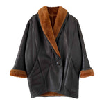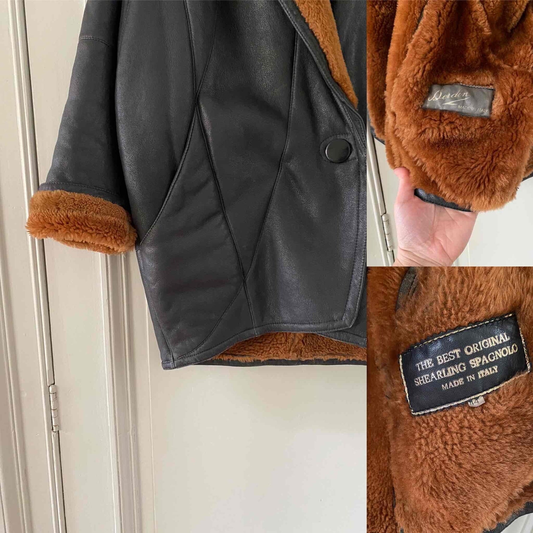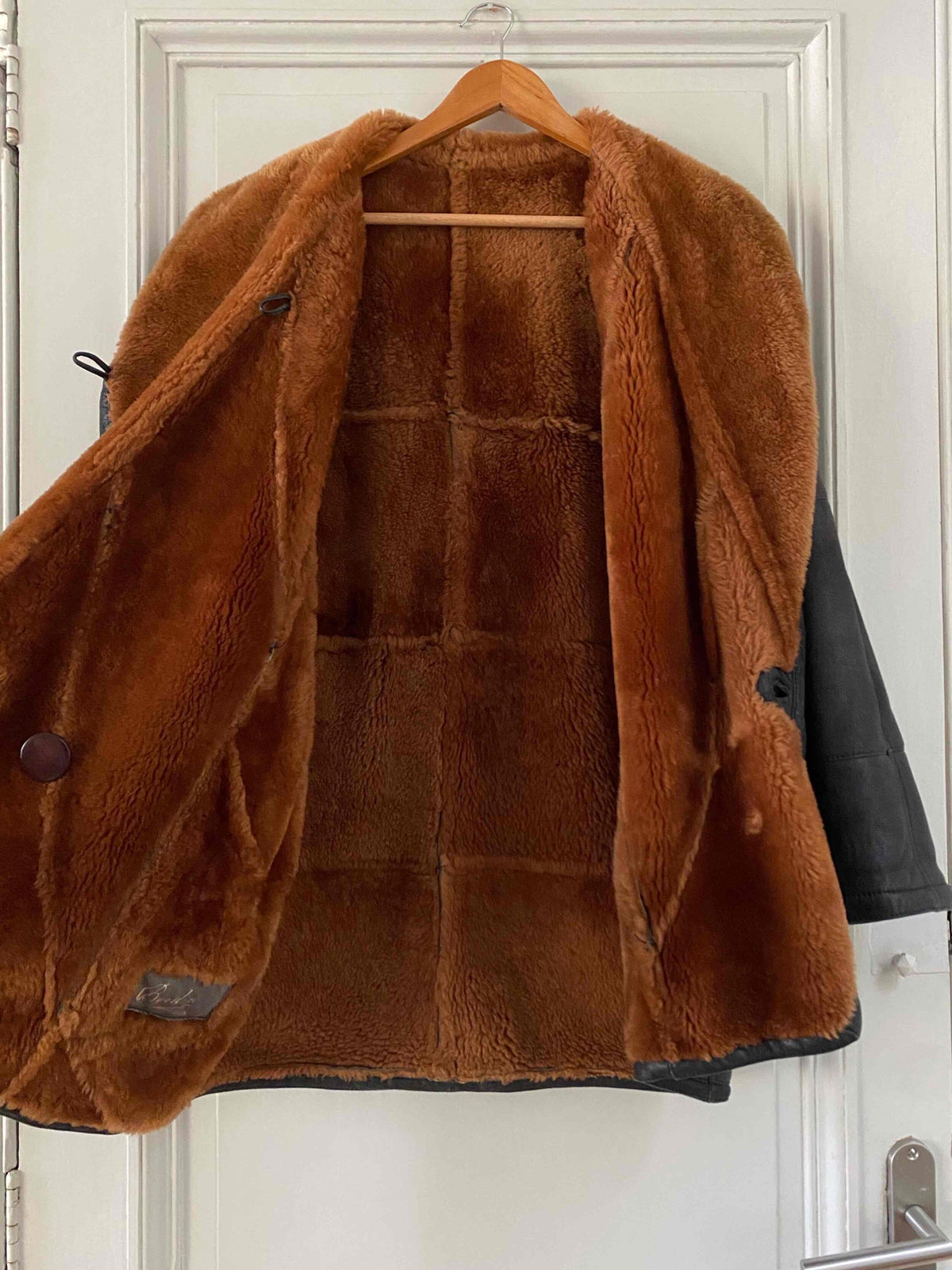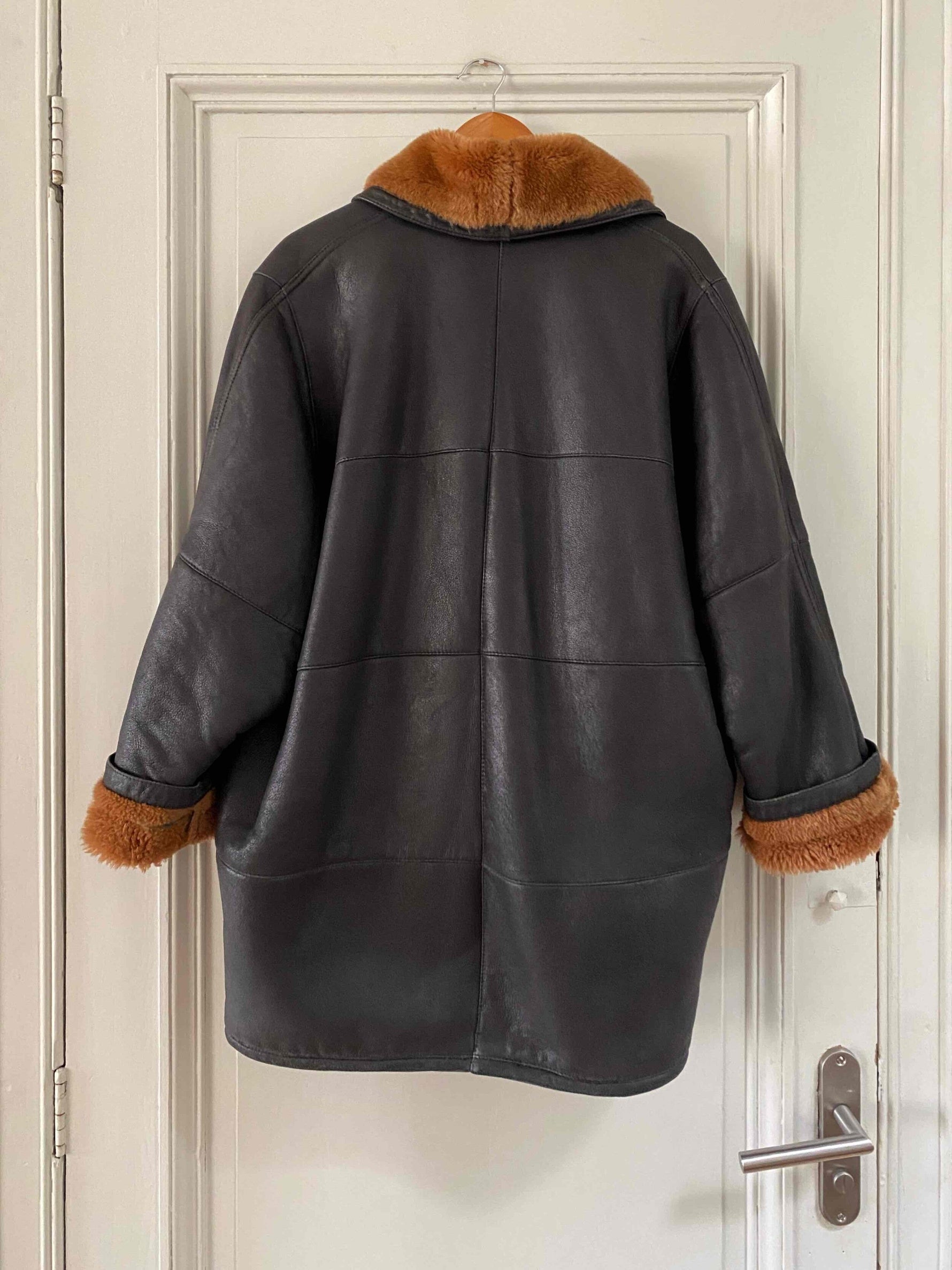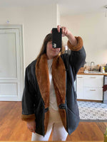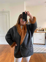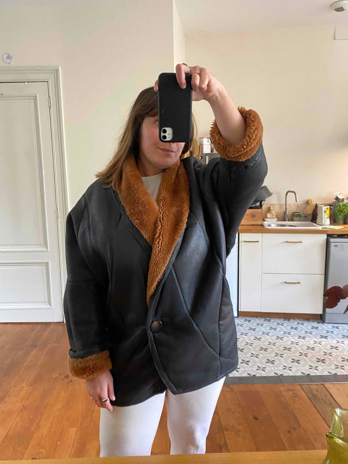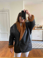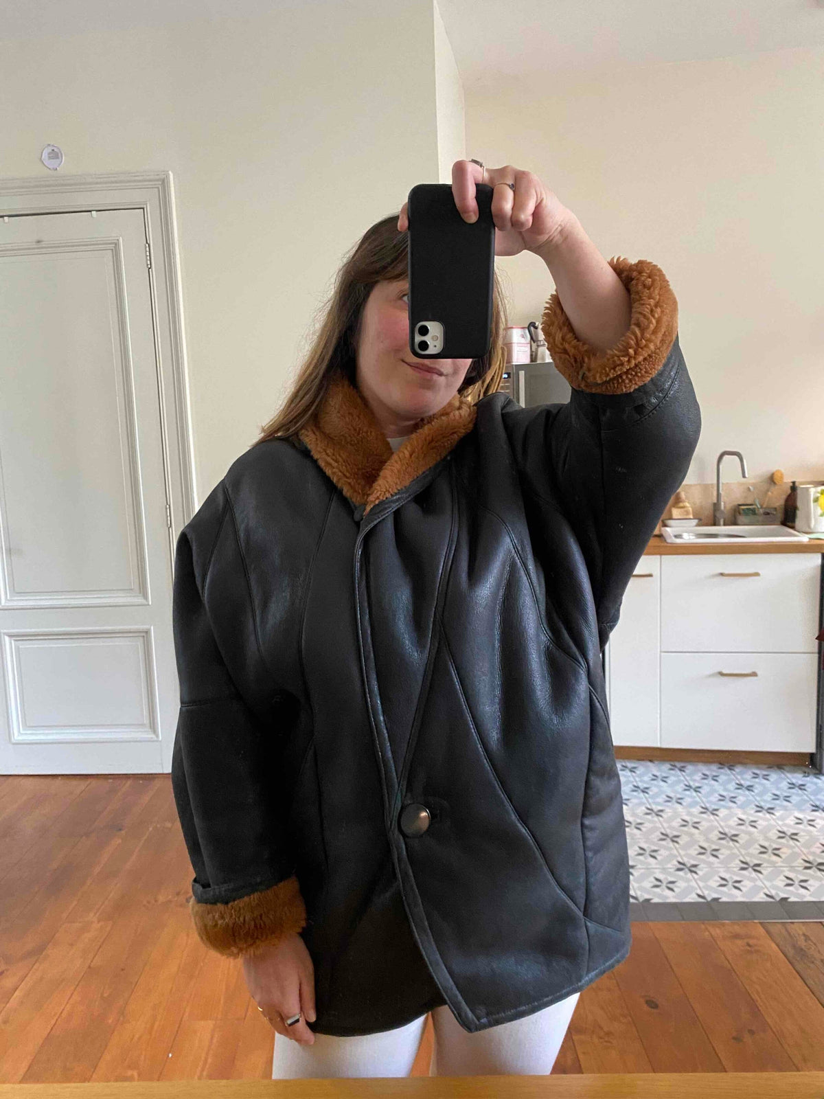 Prix unitaire parPeau lainée en mouton retourné extérieur cuir noir, intérieur mouton doré caramel, grand col châle, boutonnage croisé, fabriqué en Italie, taille 38 et 40 porté ici sur une personne T40.