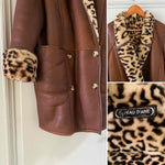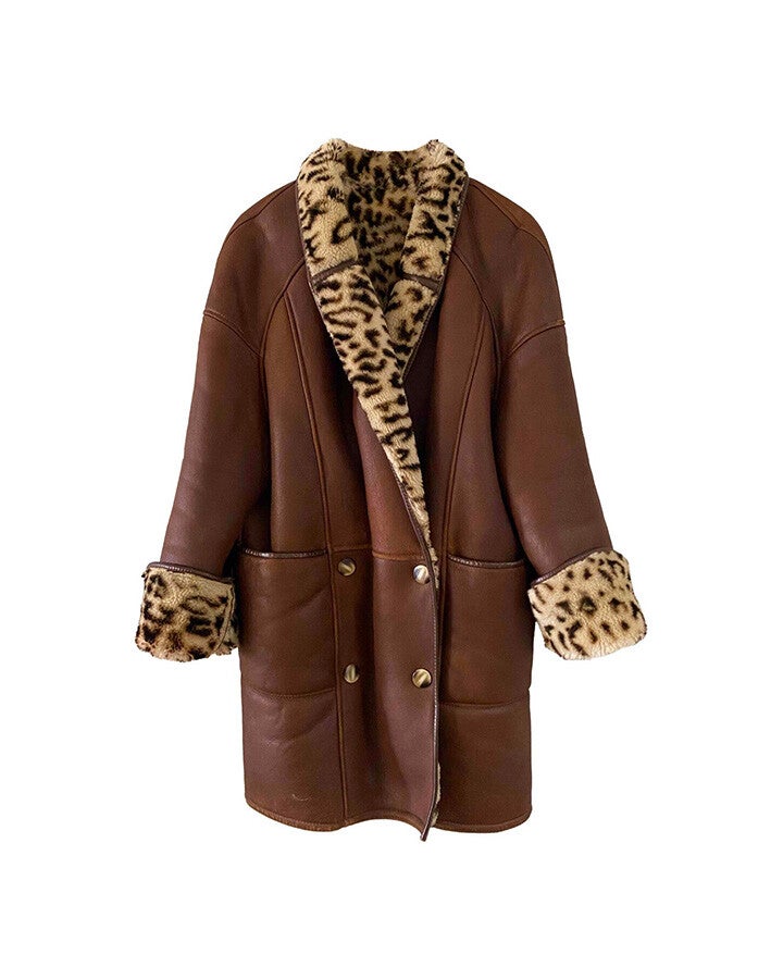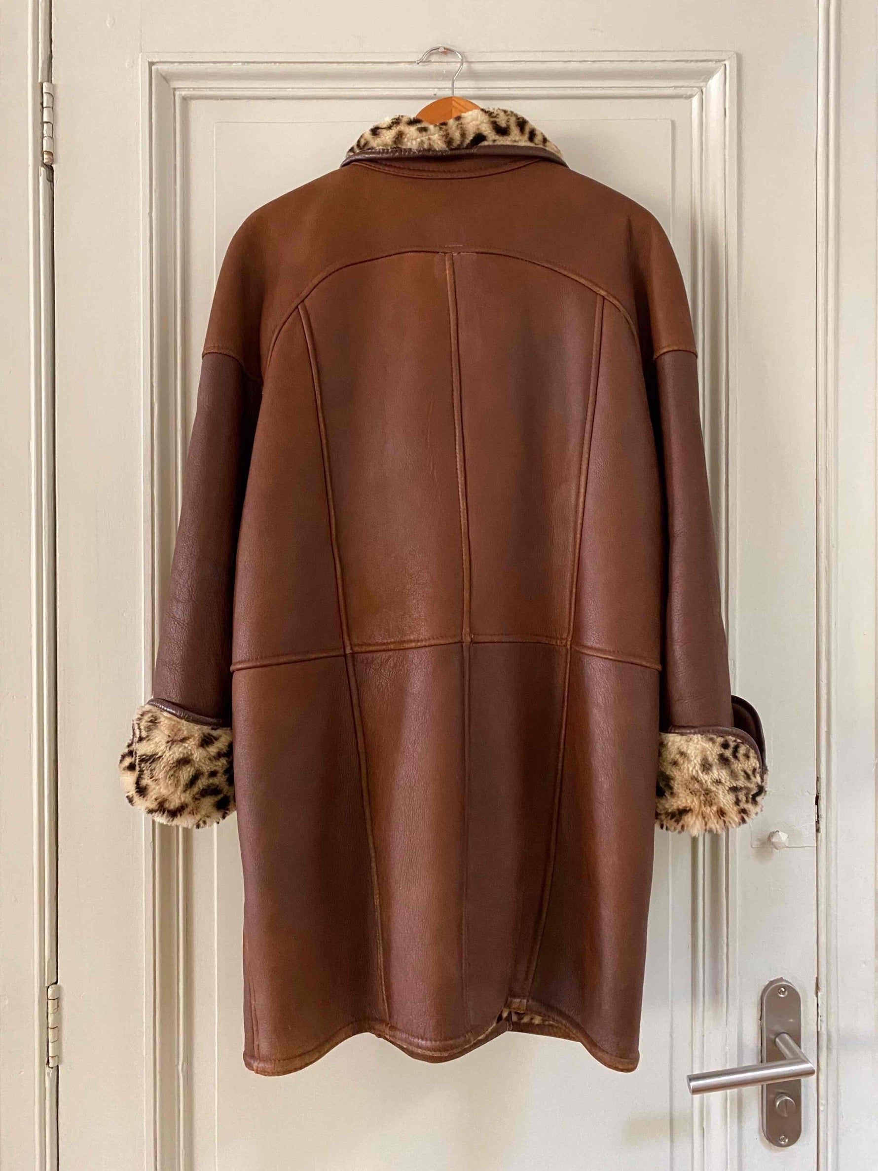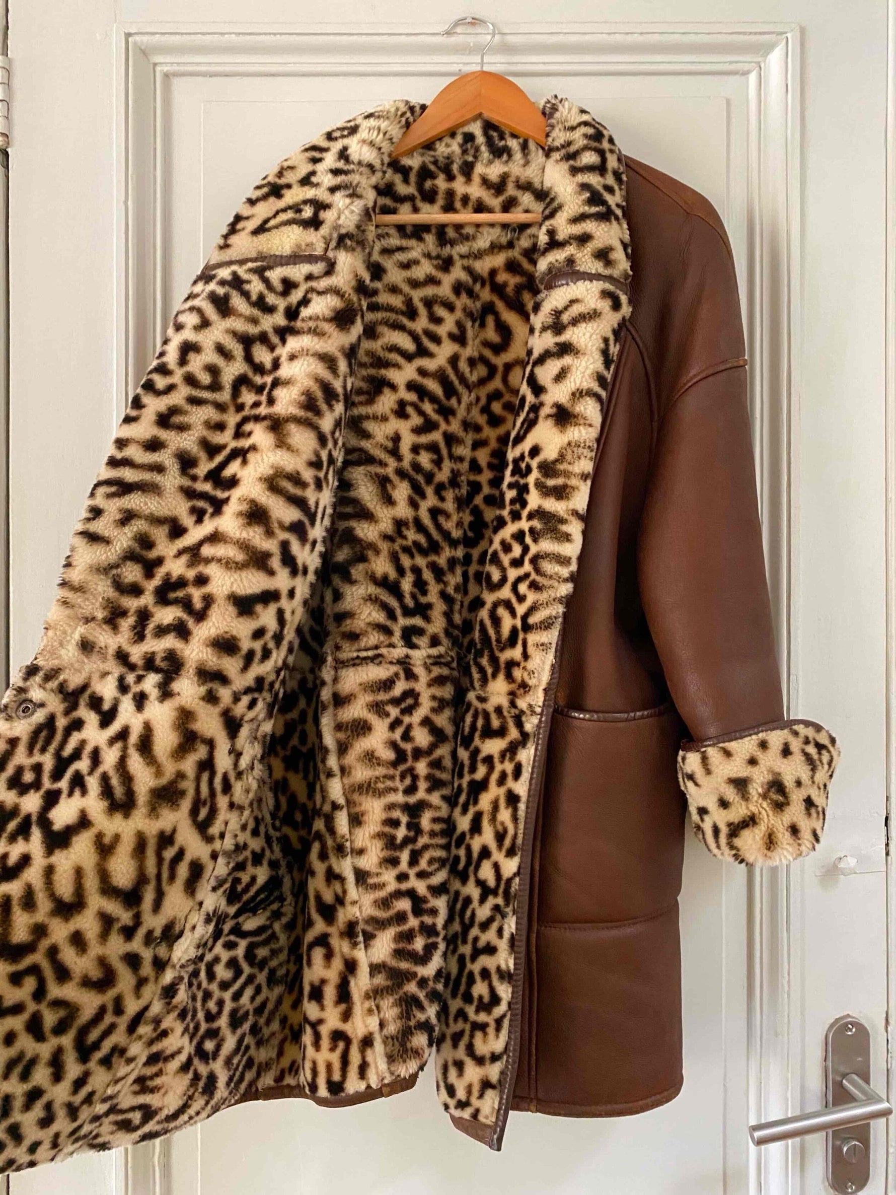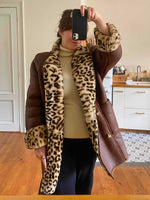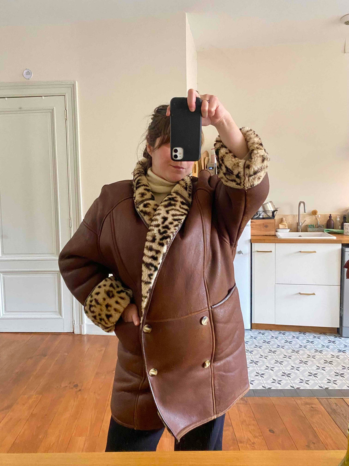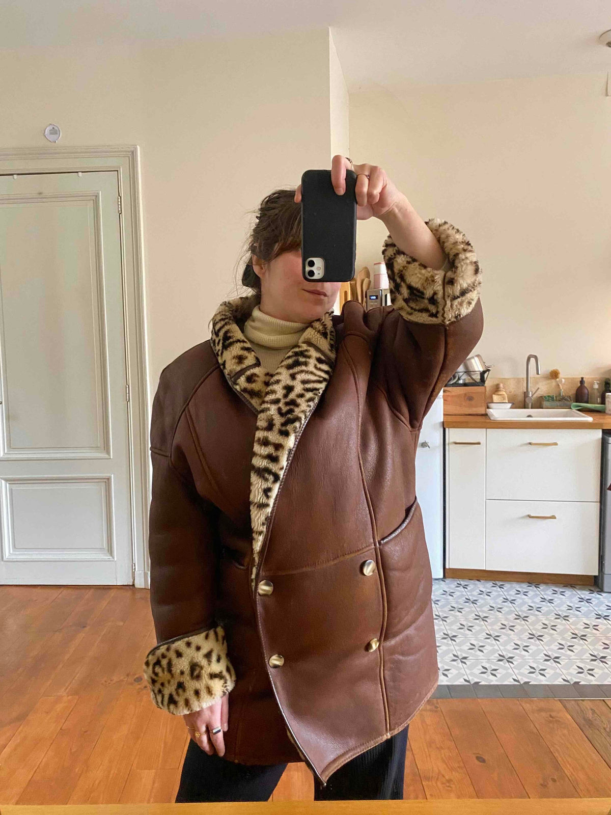 Prix unitaire parPeau lainée en mouton retourné externe cuir brun chocolat, intérieur en mouton doré impression leopard, grand col châle et boutonnage croisé par boutons pressions bijoux marbrés, fabriqué en France, tailles 38 et 40 portée ici sur une personne T40.