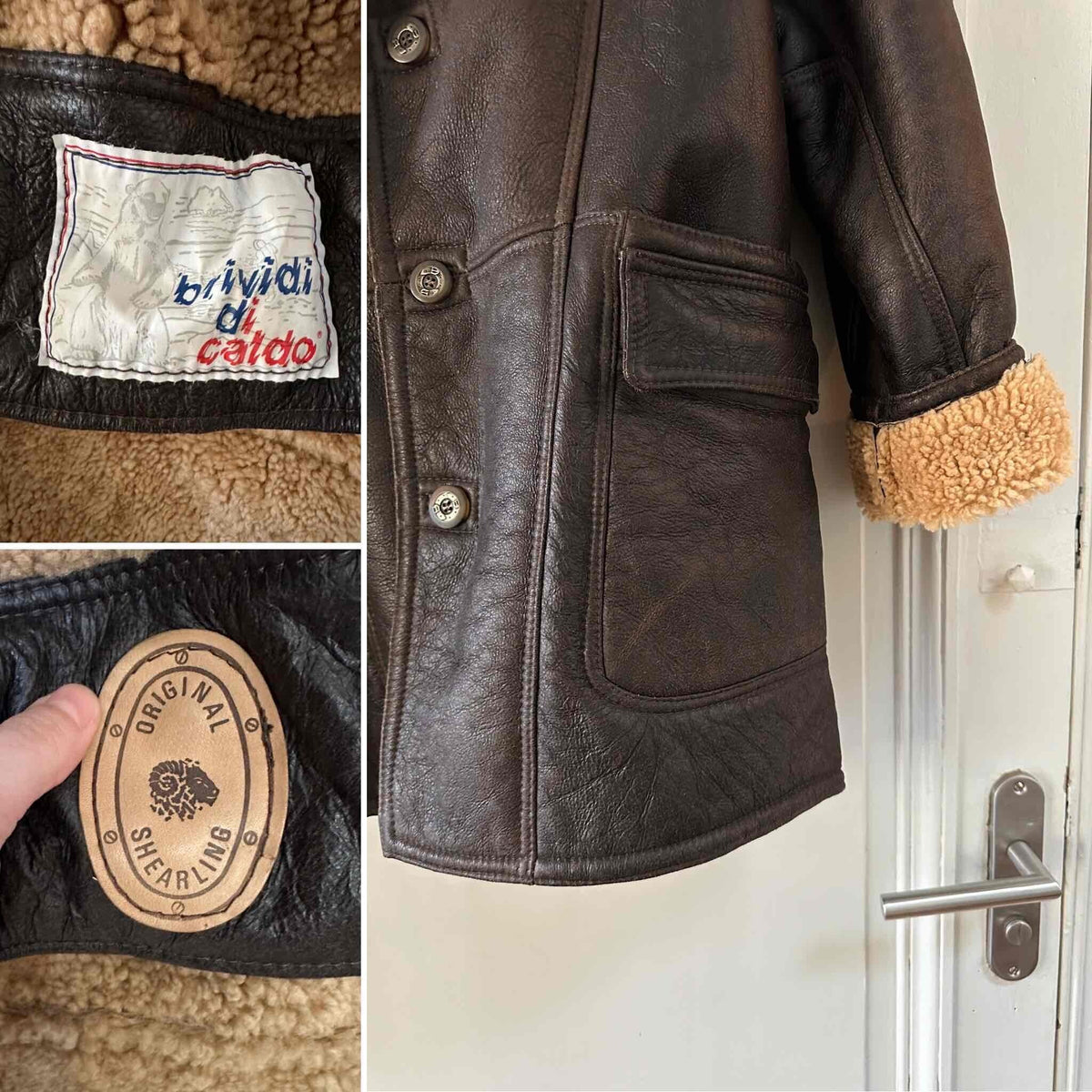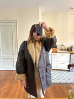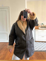 Prix unitaire parPeau lainée en mouton retourné extérieur cuir chocolat noir, intérieur mouton camel naturel, grand col châle mouton, boutonné, fabriqué en Italie, taille 40 porté ici sur une personne T40.