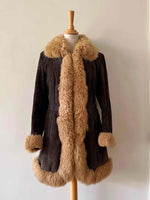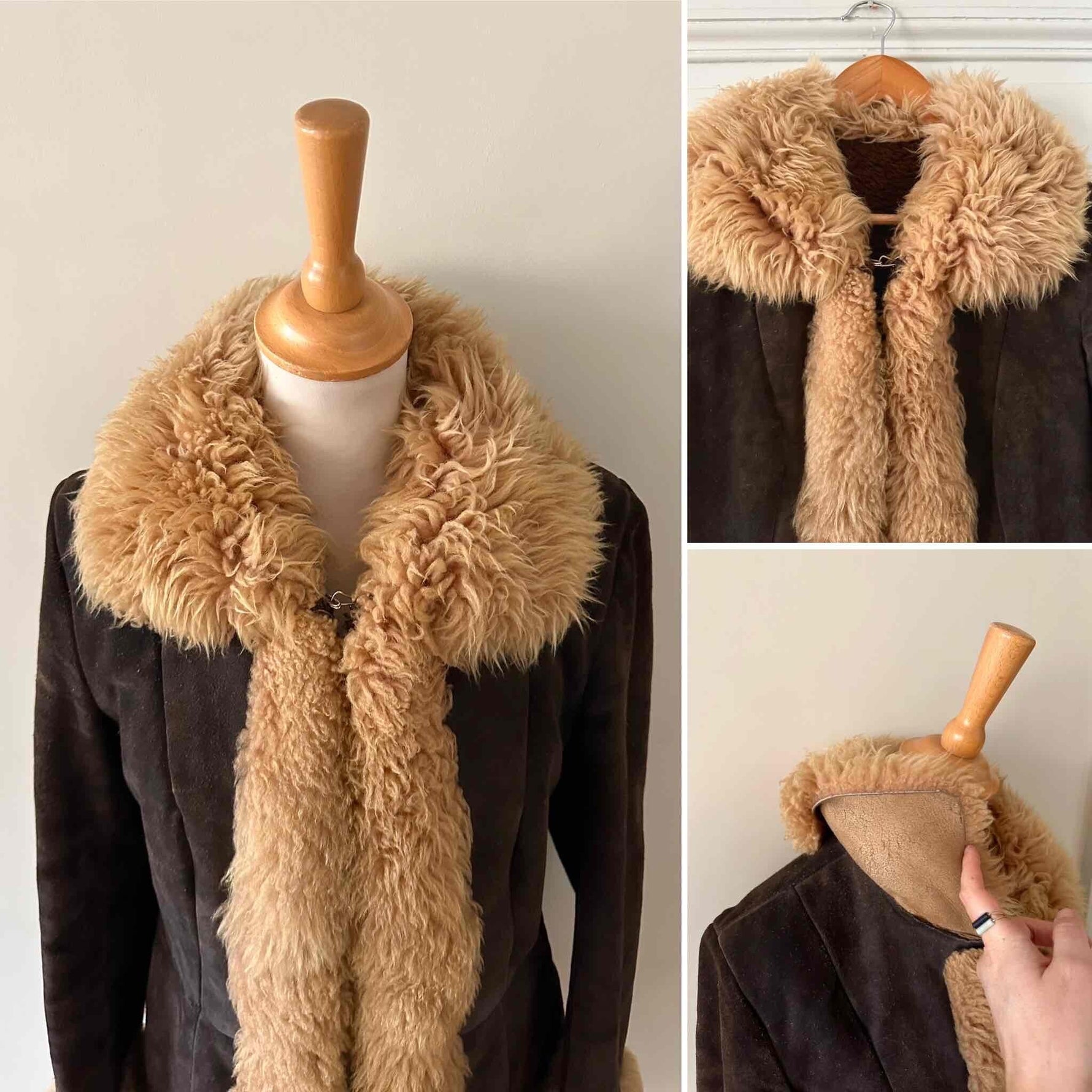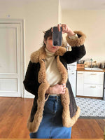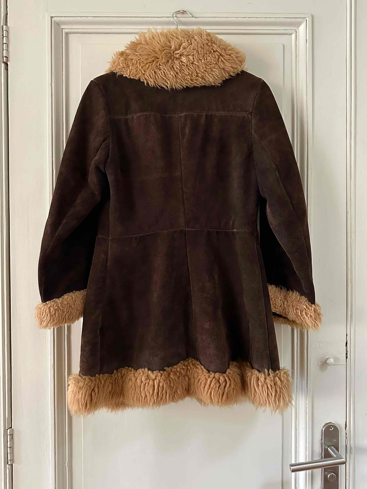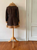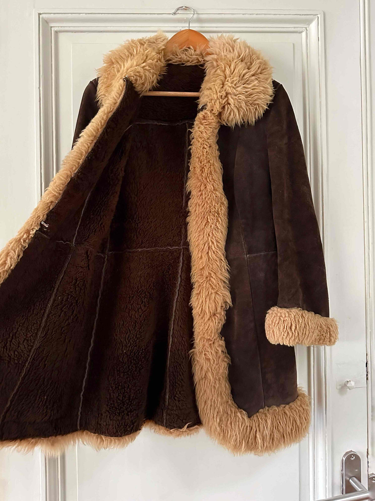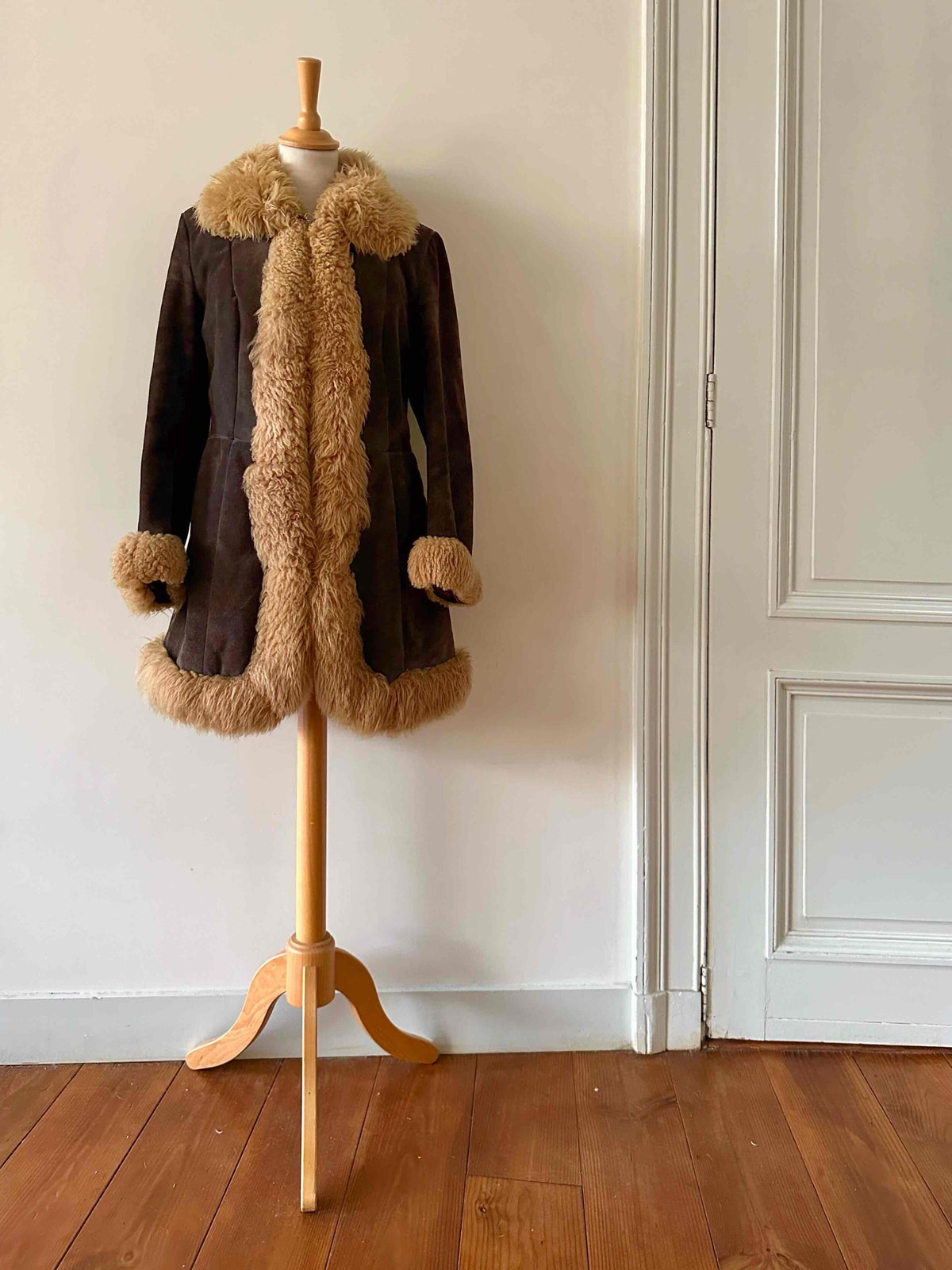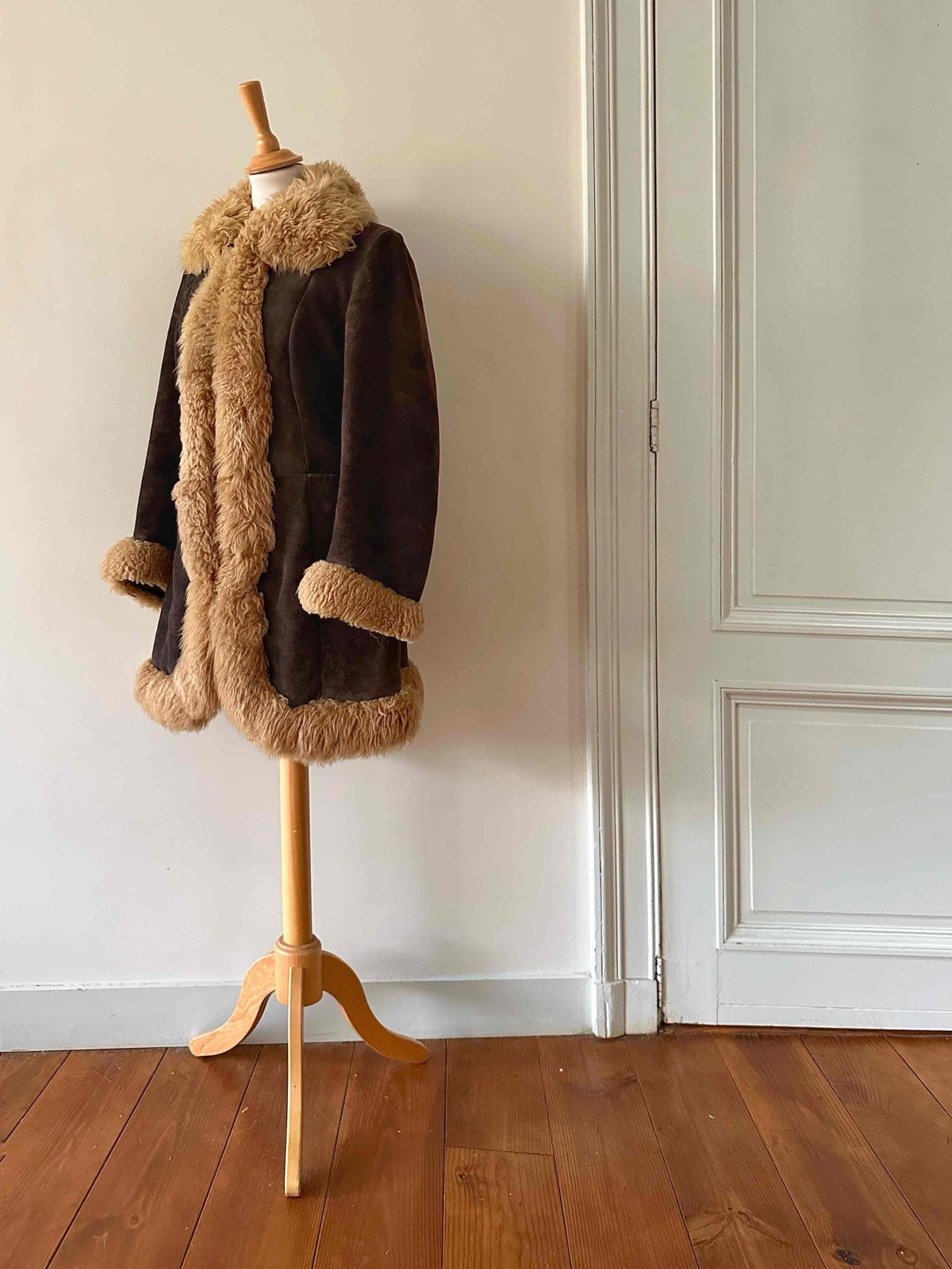 Peau lainée 70s, en mouton retourné exterieur daim chocolat, intérieur mouton brun, bordures et poignets en mouton retourné camel beige, esprit mouton afghan, fermeture par crochets, taille 34 et 36 porté ici sur un mannequin T36 et ouvert sur une personne T40.