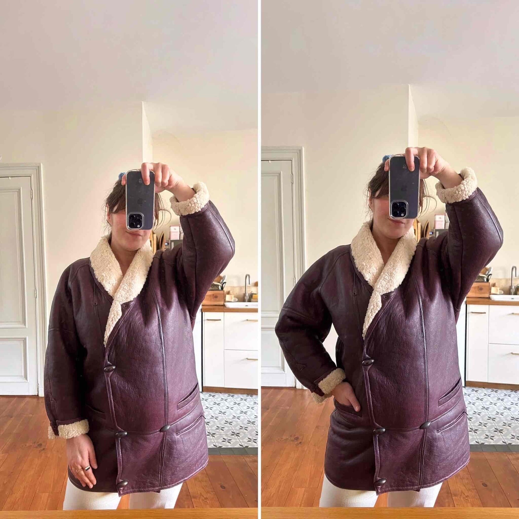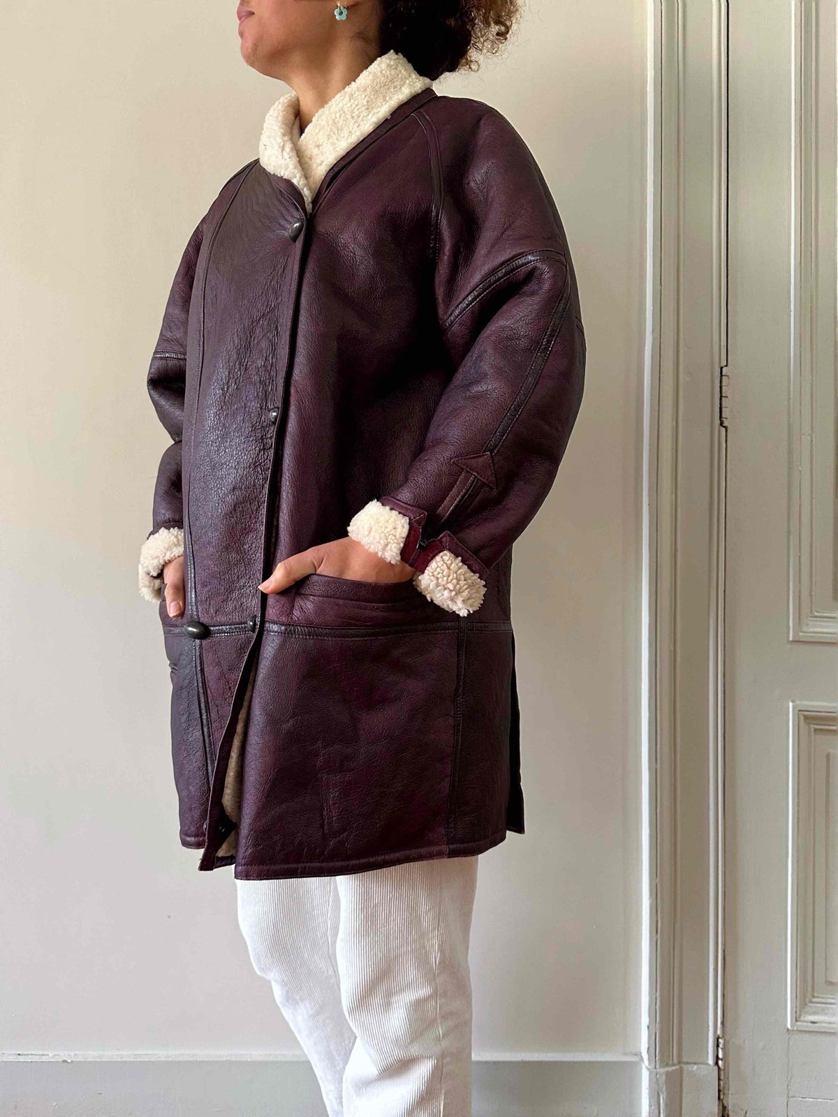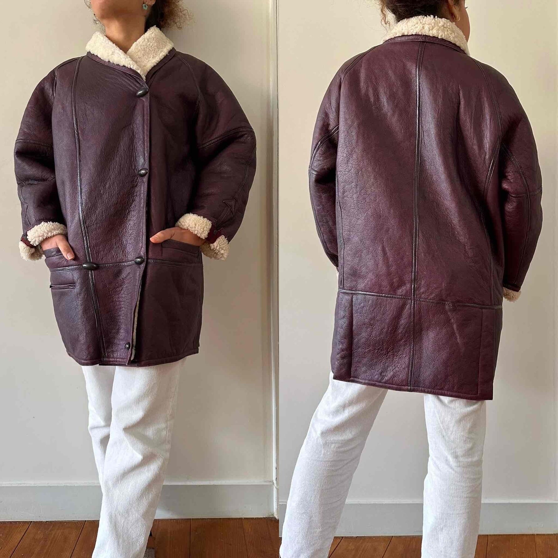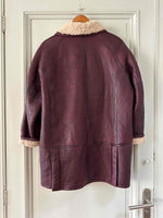 Prix unitaire parPeau lainee en mouton retourné exterieur cuir aubergine, intérieur mouton écru, grand col châle à ouvrir, boutons pression effet boutons écailles, boutonnage croisé, poignets zippés, taille 38 portée ici sur une personne T40 et sur une personne T36.