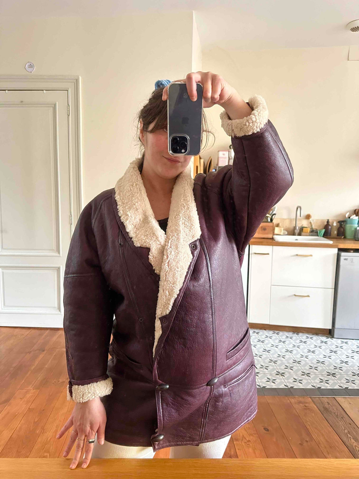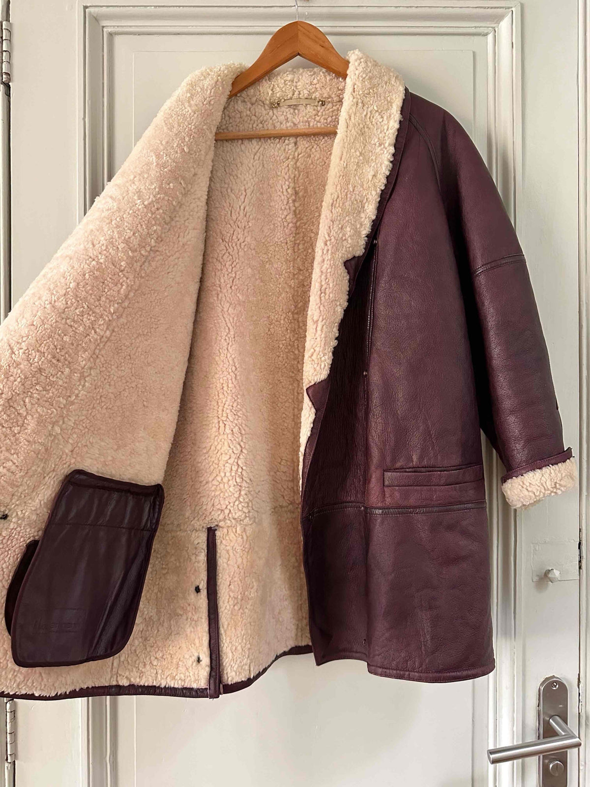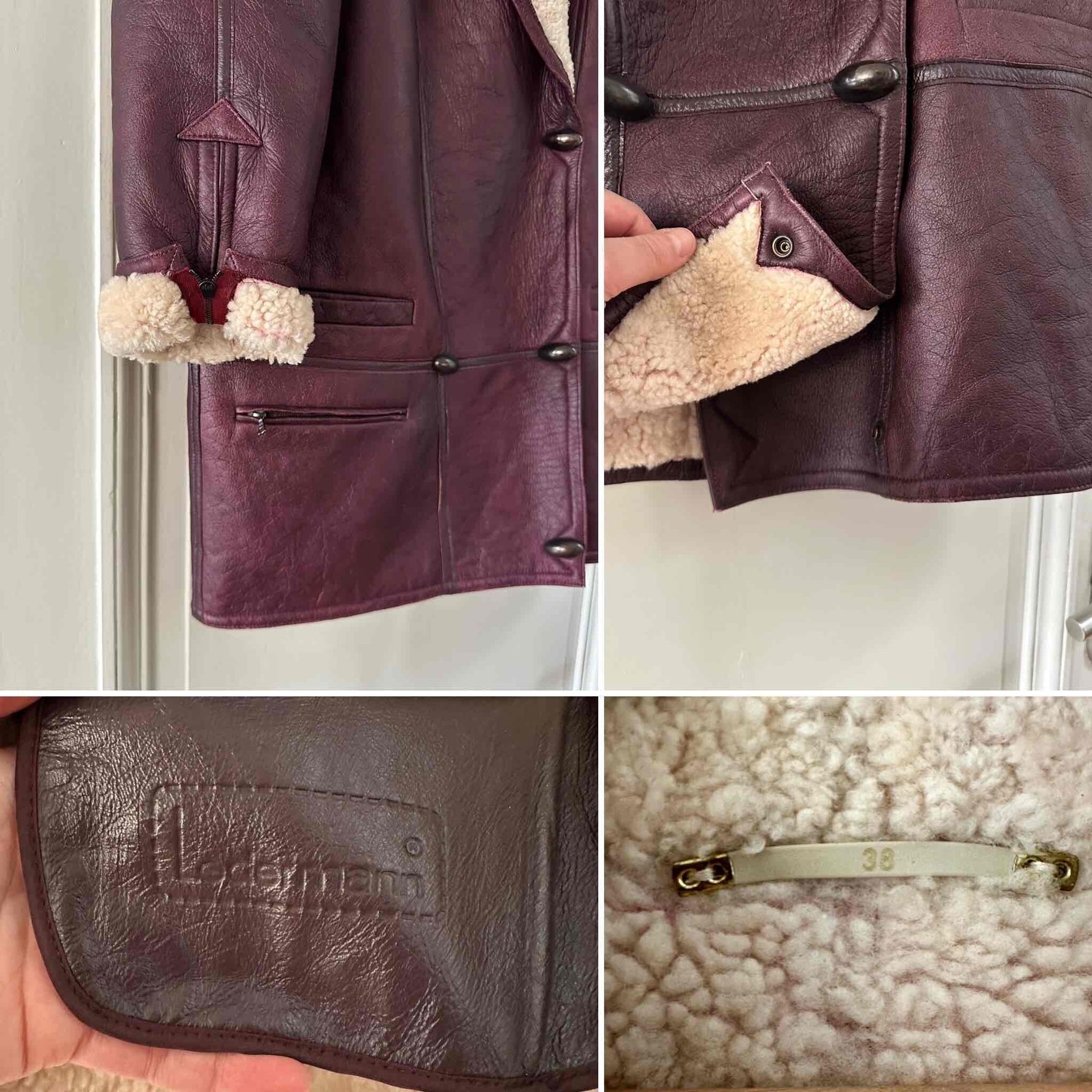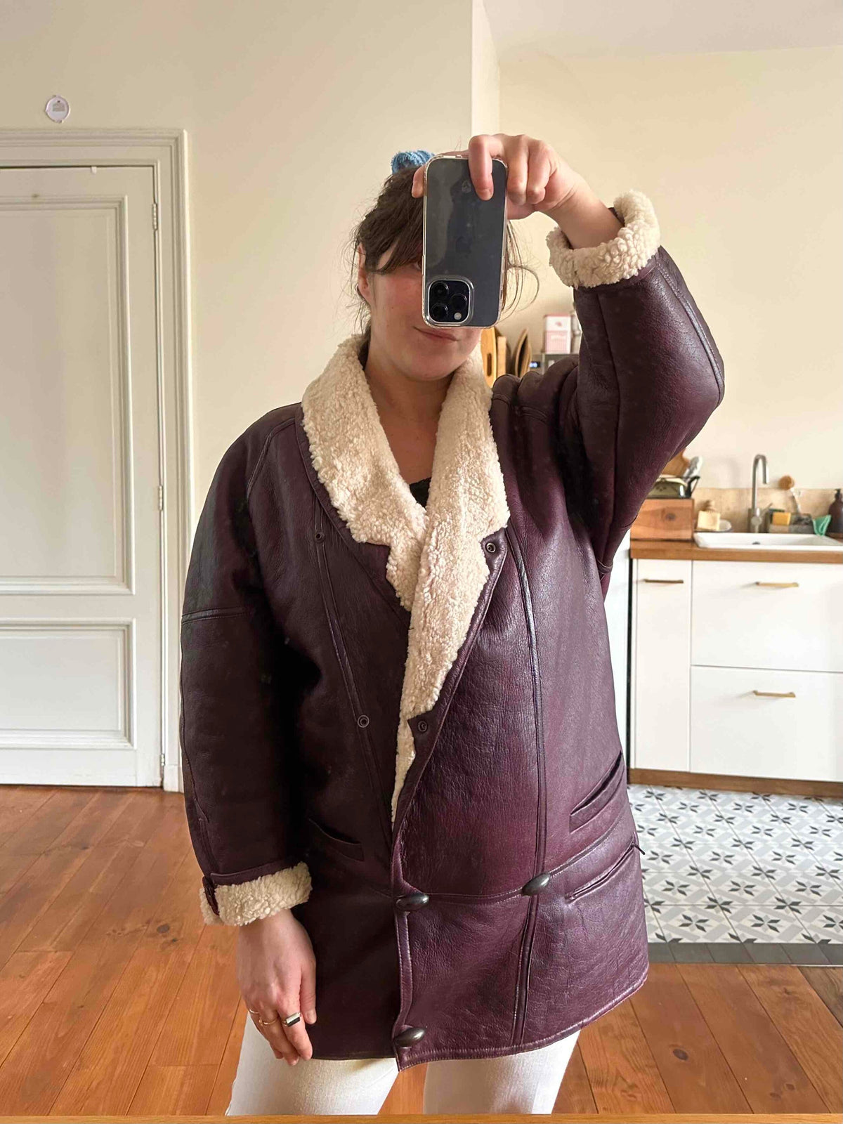 Prix unitaire parPeau lainee en mouton retourné exterieur cuir aubergine, intérieur mouton écru, grand col châle à ouvrir, boutons pression effet boutons écailles, boutonnage croisé, poignets zippés, taille 38 portée ici sur une personne T40 et sur une personne T36.