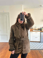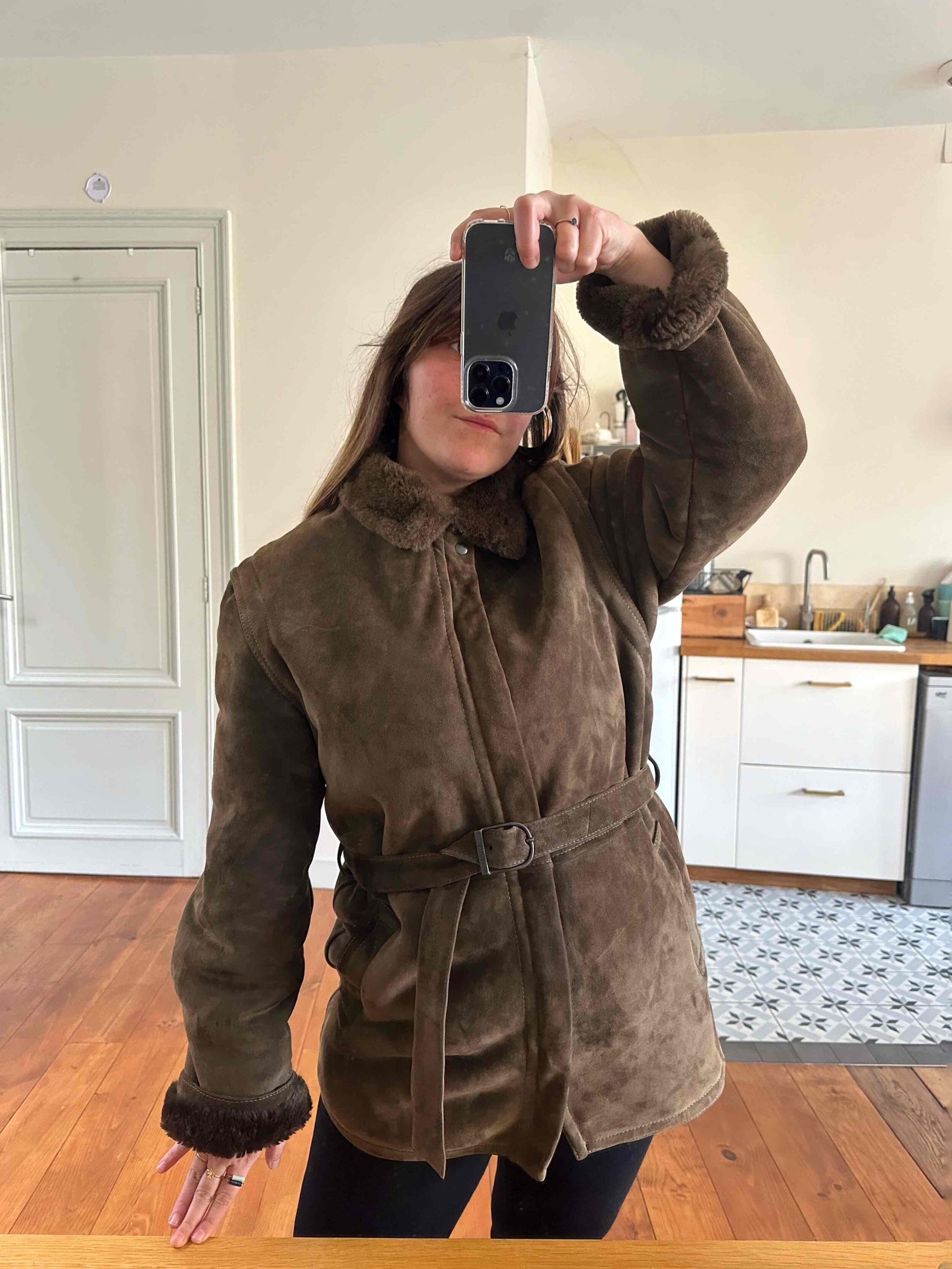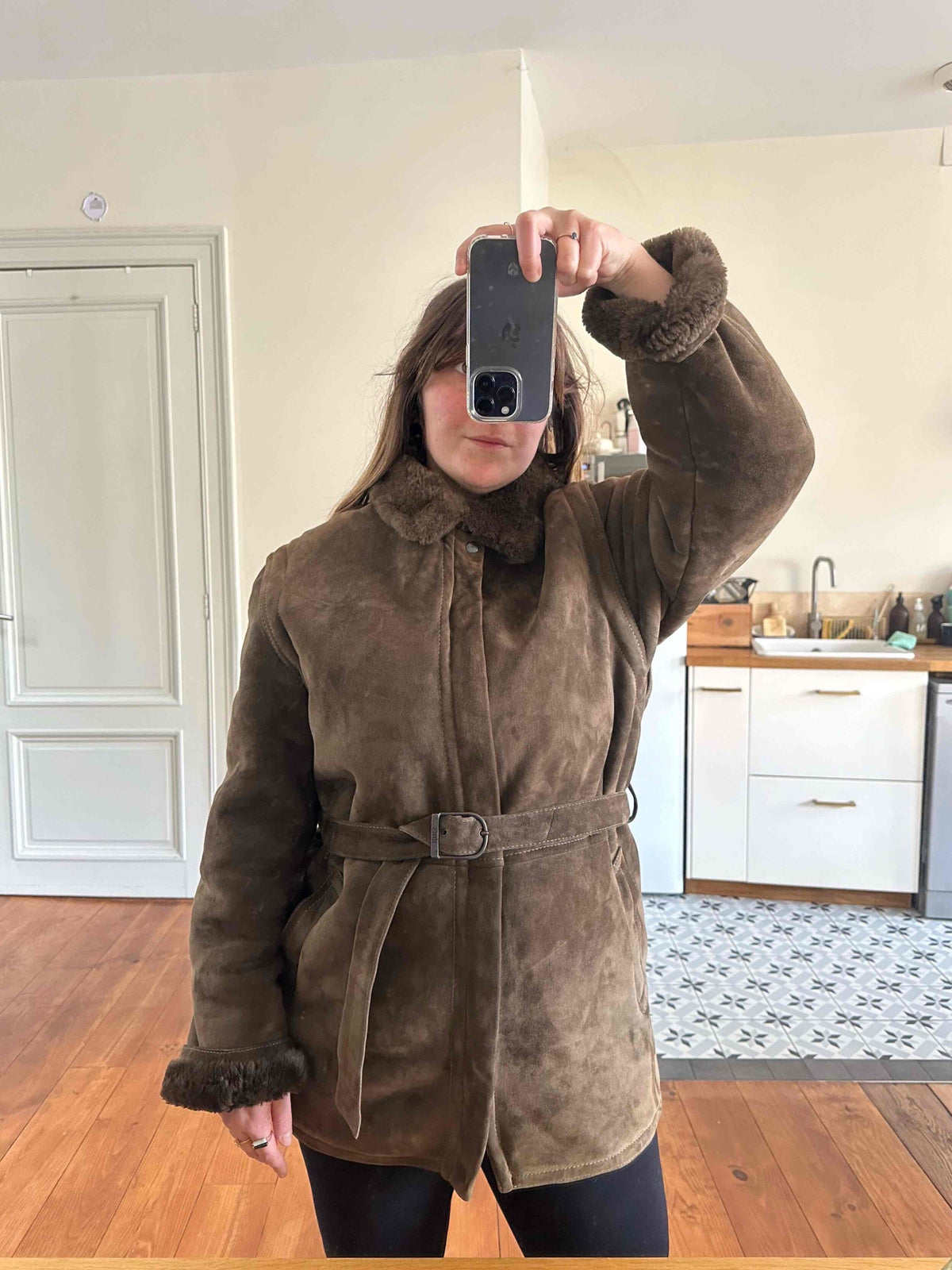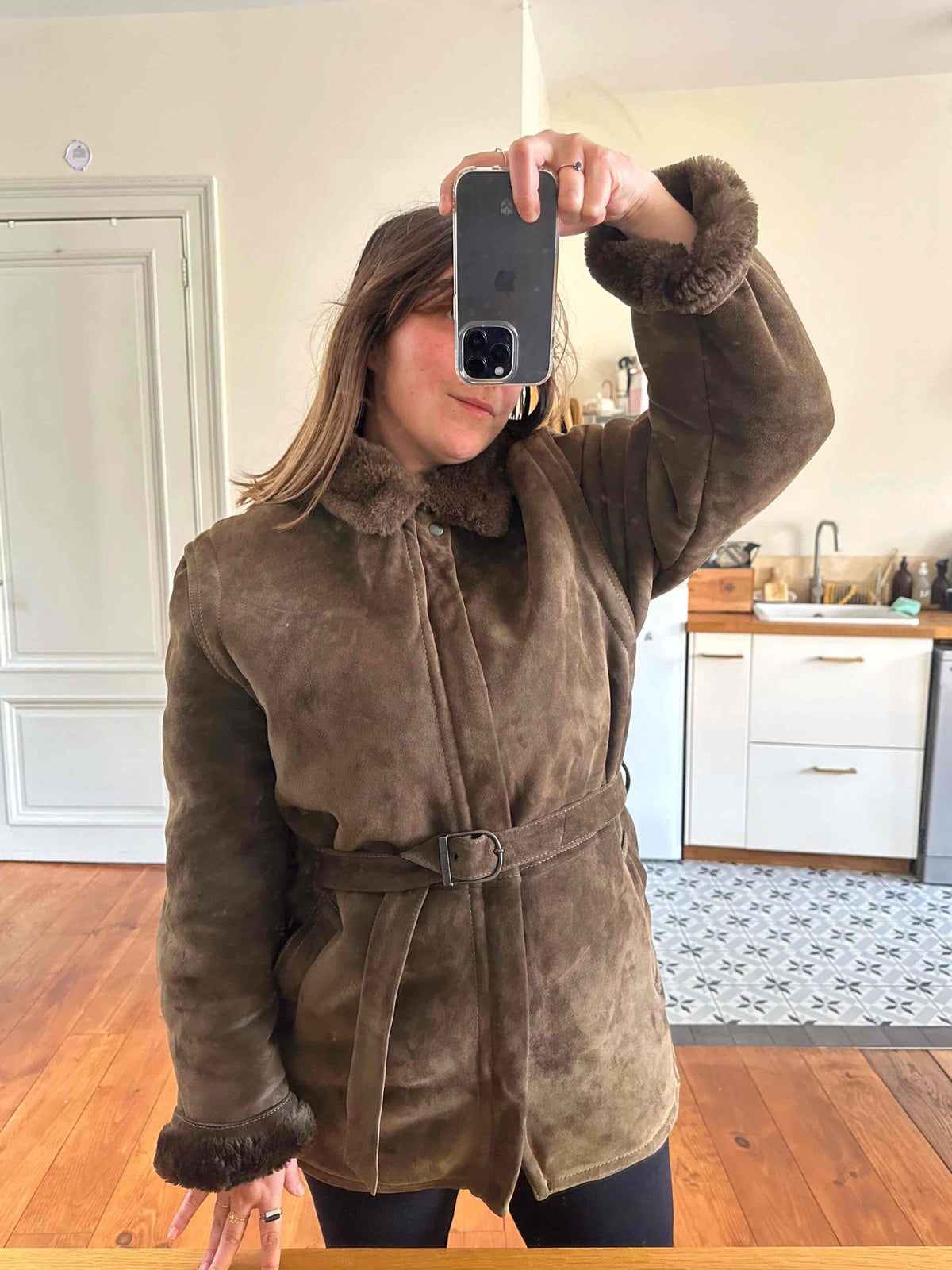 Prix unitaire parPeau lainée en mouton retourné extérieur daim brun olive, intérieur mouton ton sur ton, forme saharienne avec ceinture taille à boucle nouée, fabriqué en Italie, tailles 38 et 40 portée ici sur une personne T40.