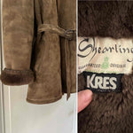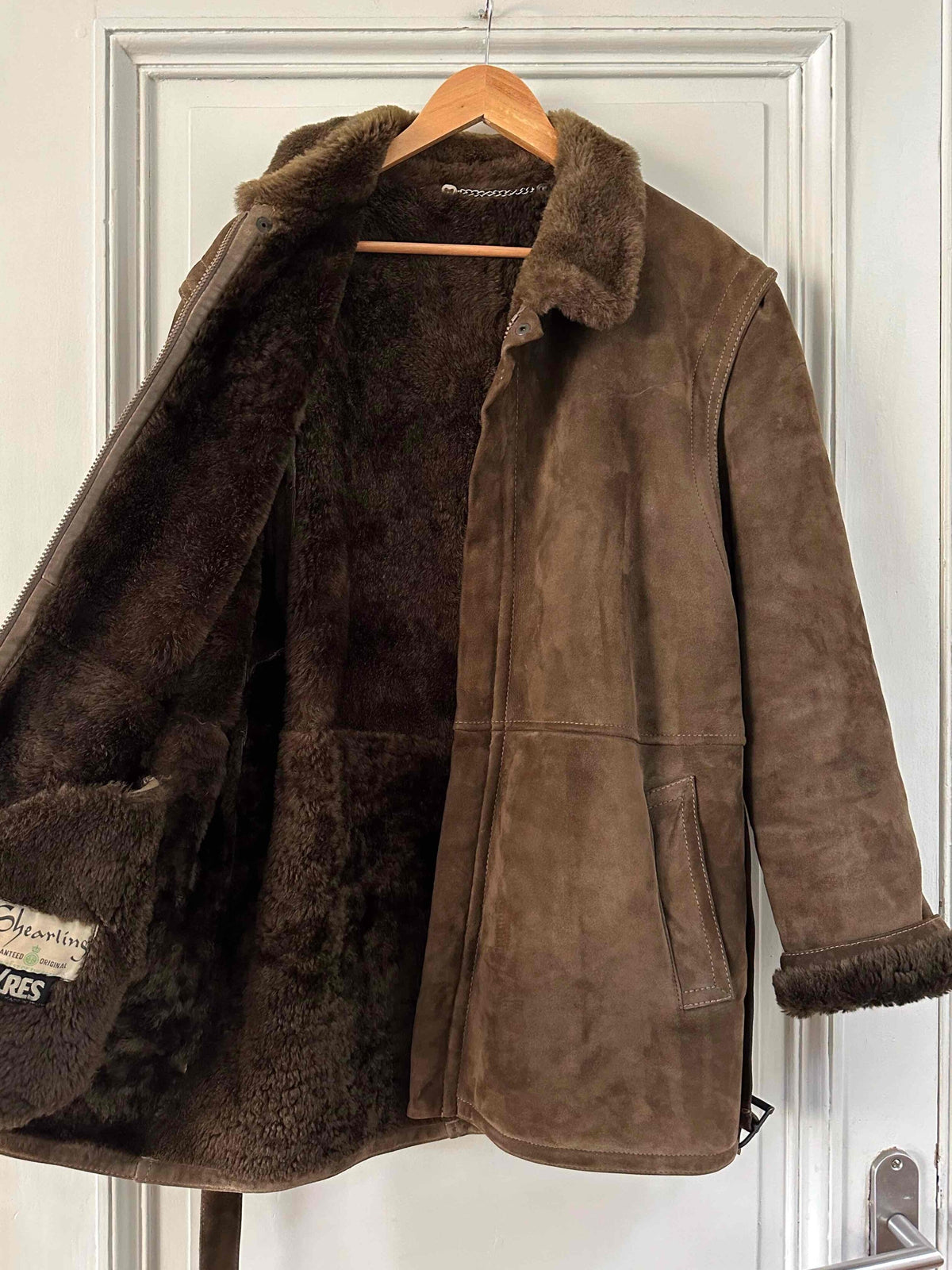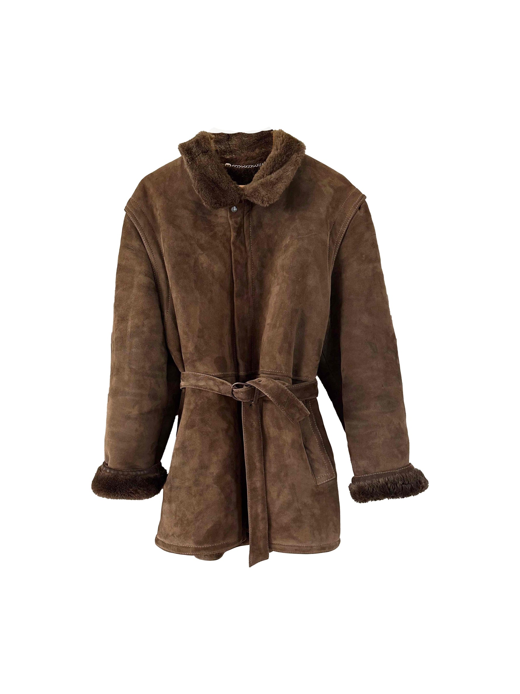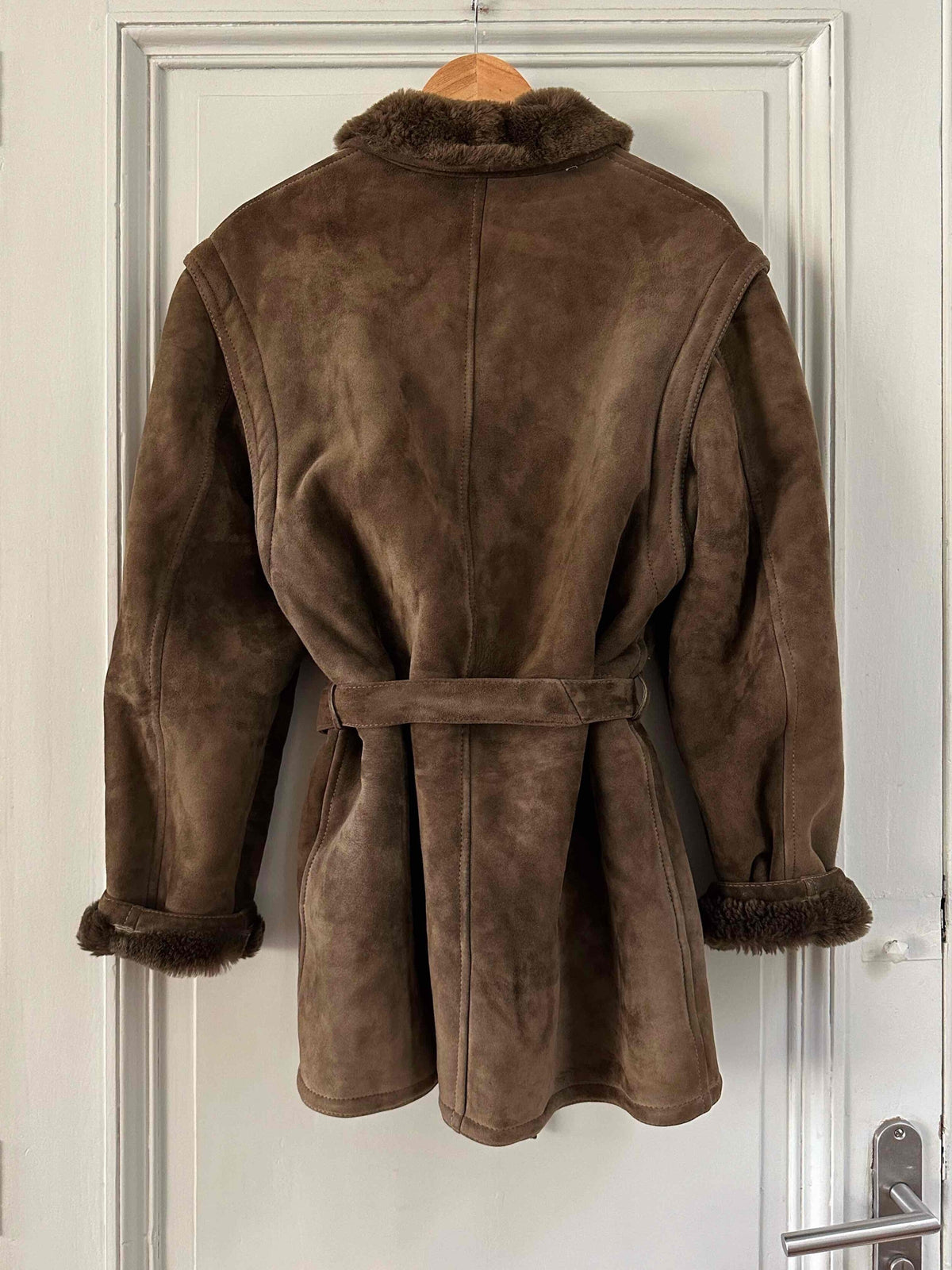Prix unitaire parPeau lainée en mouton retourné extérieur daim brun olive, intérieur mouton ton sur ton, forme saharienne avec ceinture taille à boucle nouée, fabriqué en Italie, tailles 38 et 40 portée ici sur une personne T40.