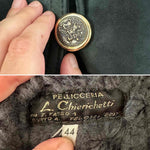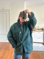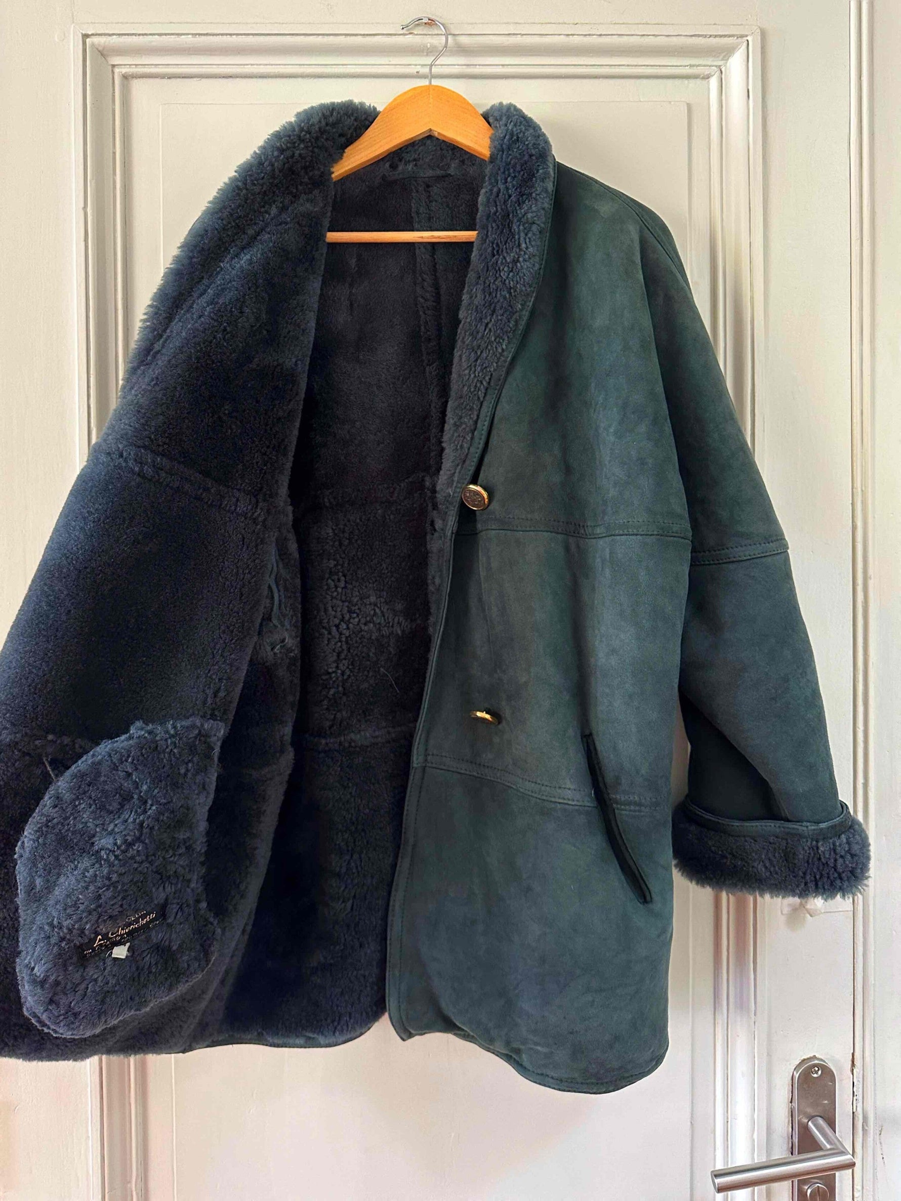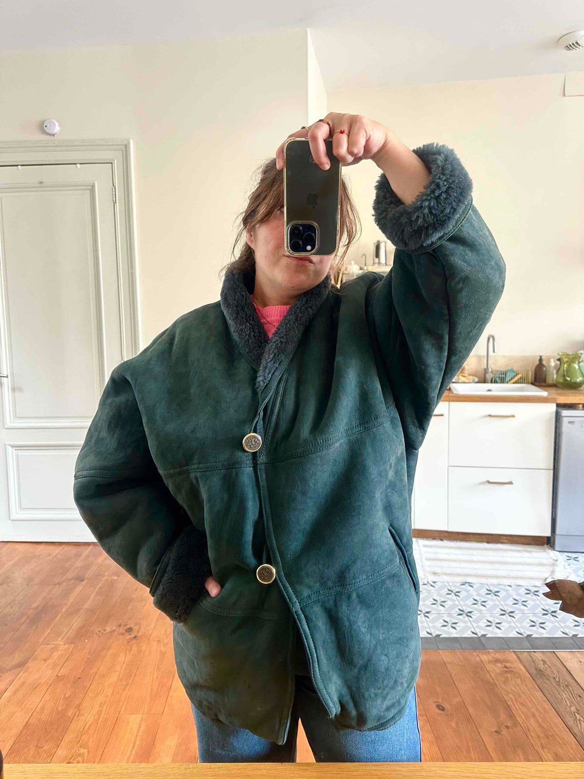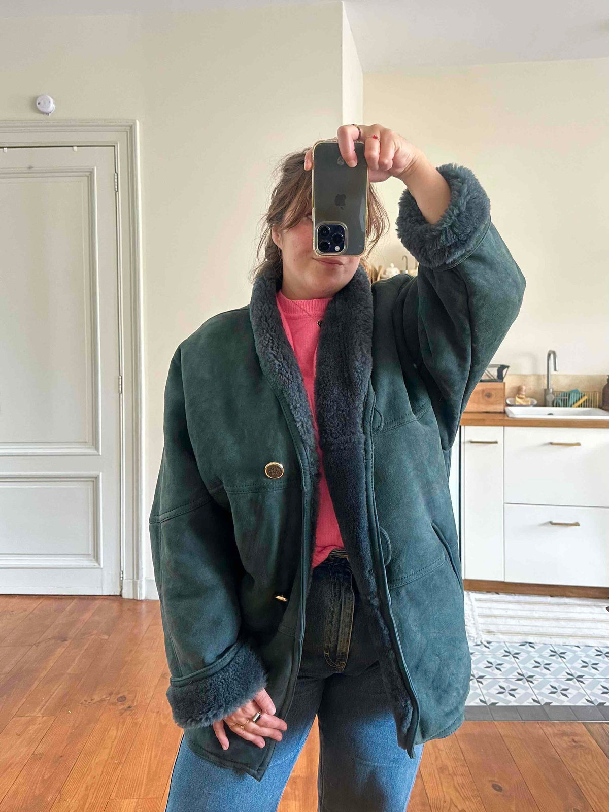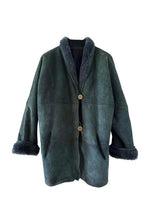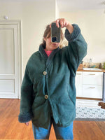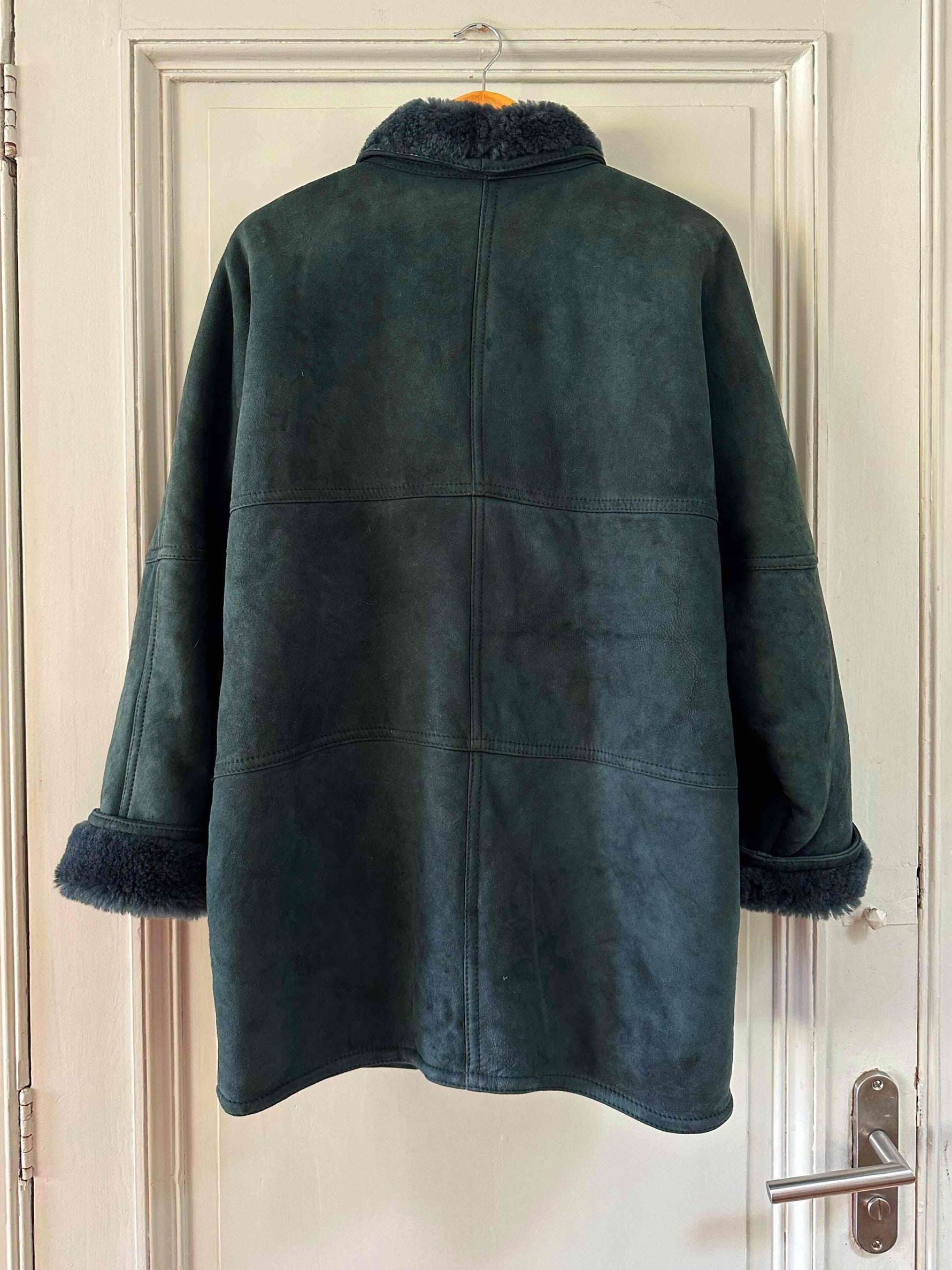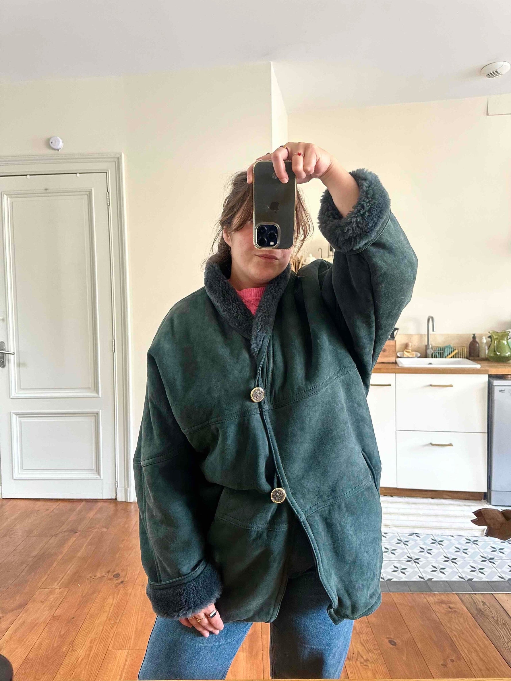 Peau lainée en mouton retourné exterieur daim vert bouteille, intérieur mouton vert bouteille, col châle, deux boutons, fabriqué en Italie, convient aux tailles 38 et 40 porté ici sur une personne T40.