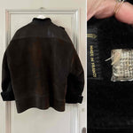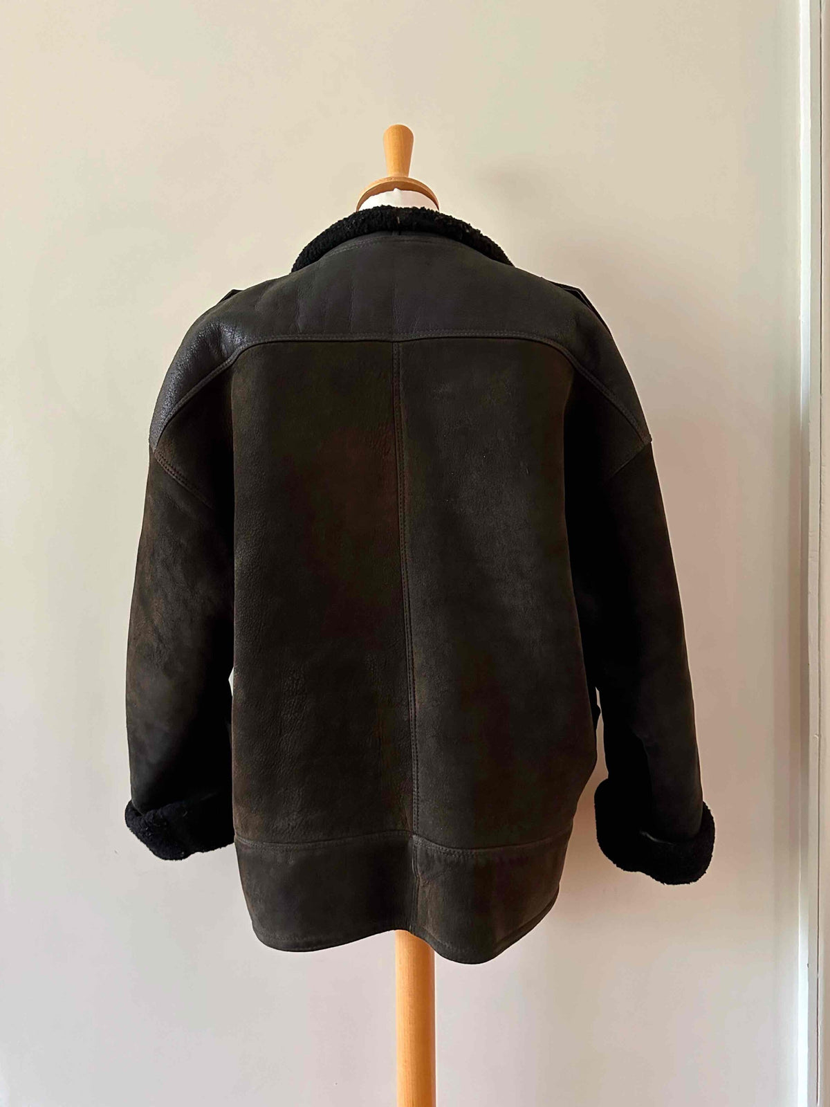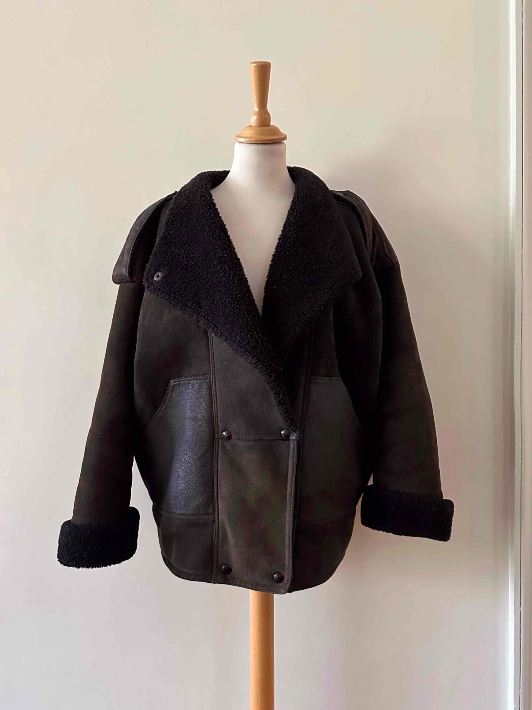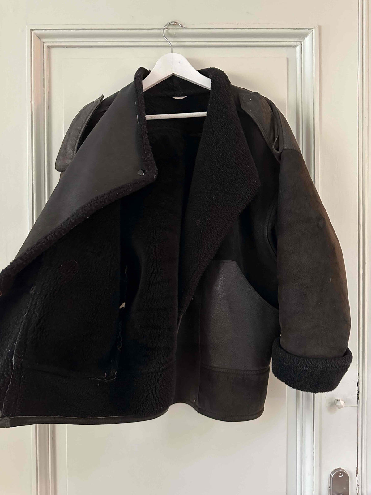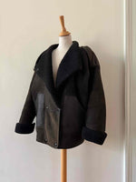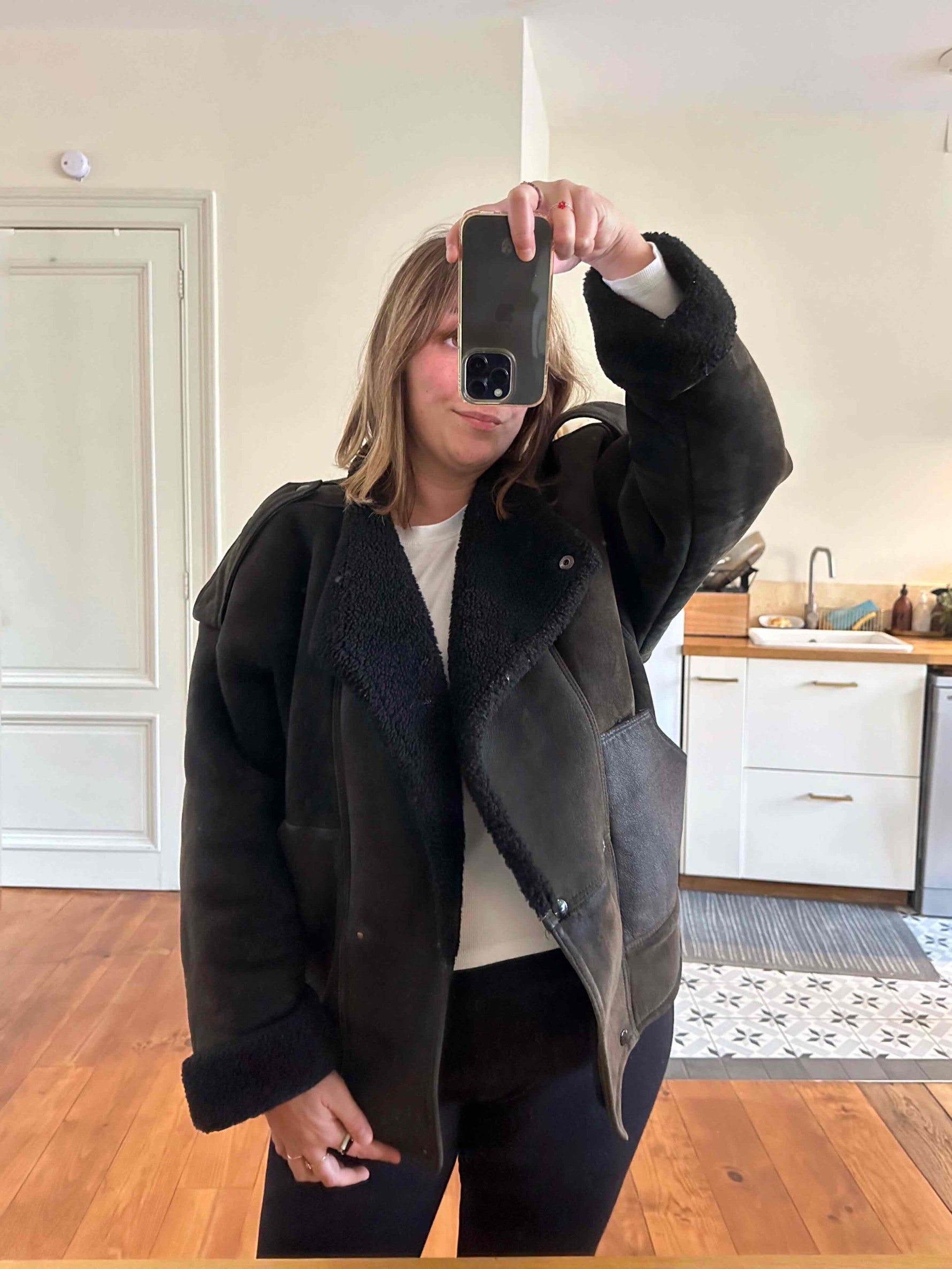 Bombardier en peau lainée, mouton retourné extérieur cuir lisse et cuir velours noir, interieure fourrure mouton noire, fermeture croisée par bouton pressions, fabriqué en France, taille 36 porté ici sur un mannequin T36 et ouverte sur une personne T40.