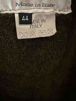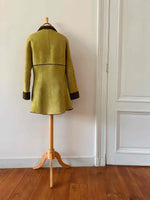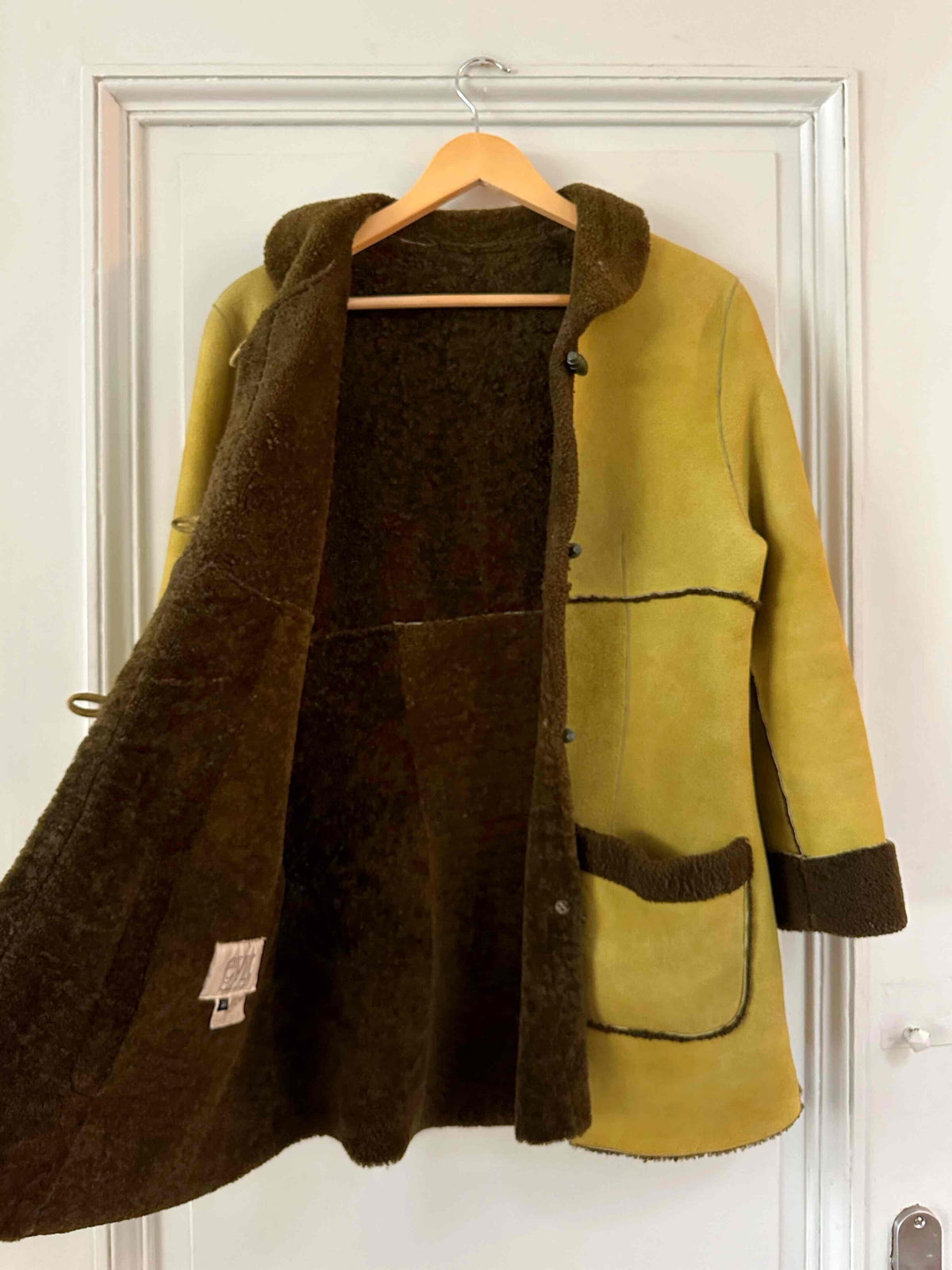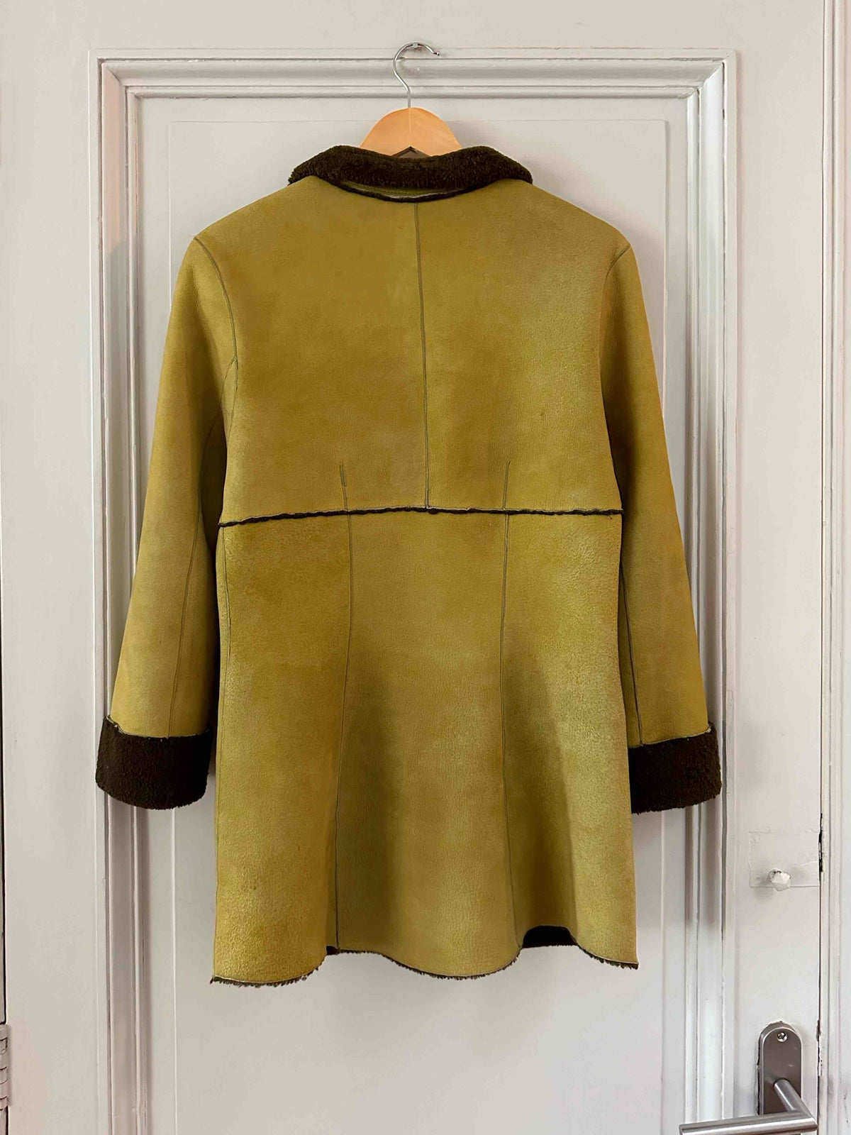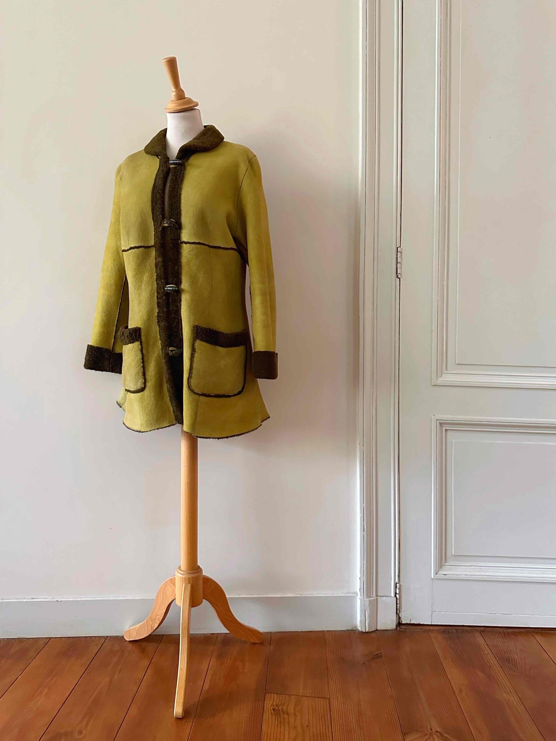 Prix unitaire parPeau lainee en mouton retourné extérieur daim vert olive pistache, interieur laine de mouton vert olive, boutons duffle coat, fabriquée en Italie, convient aux tailles 34 et 36 portée ici sur un mannequin T36.