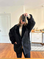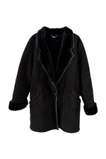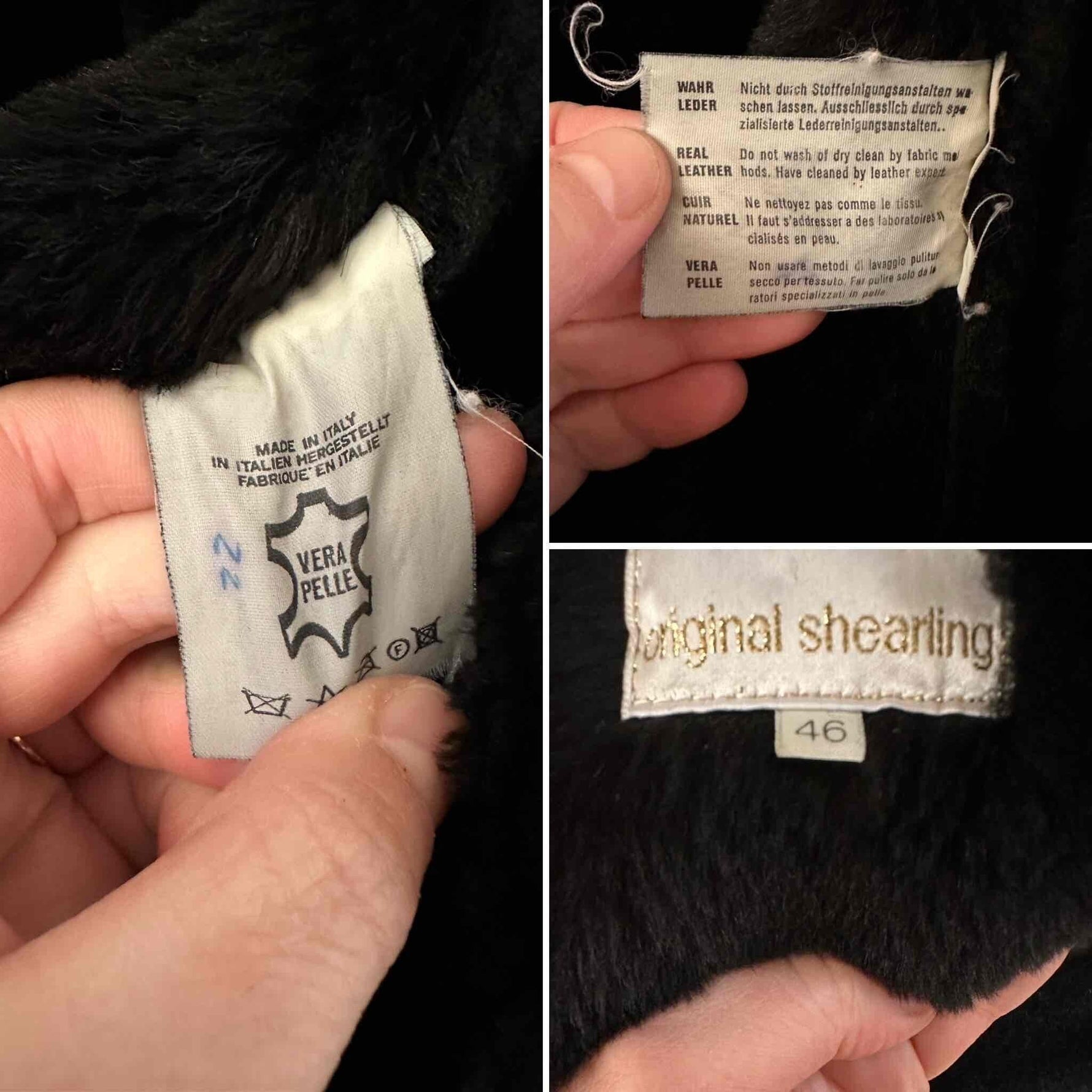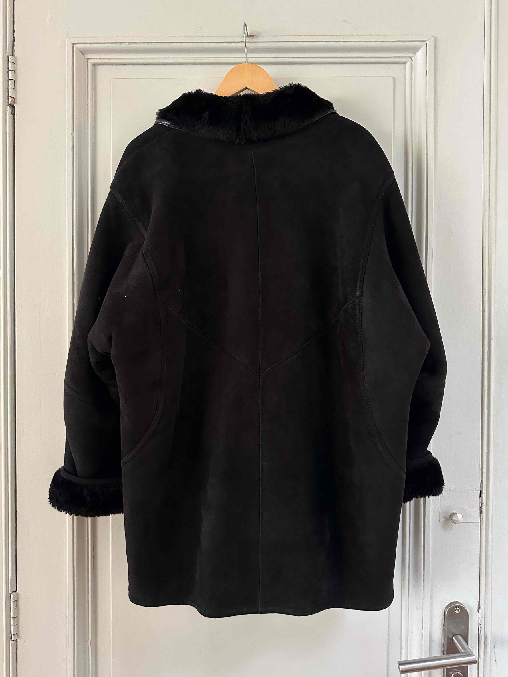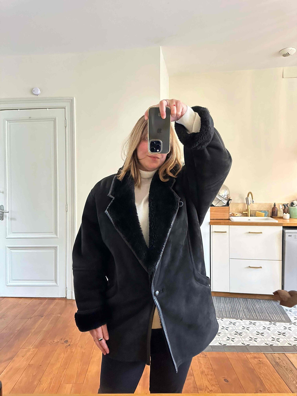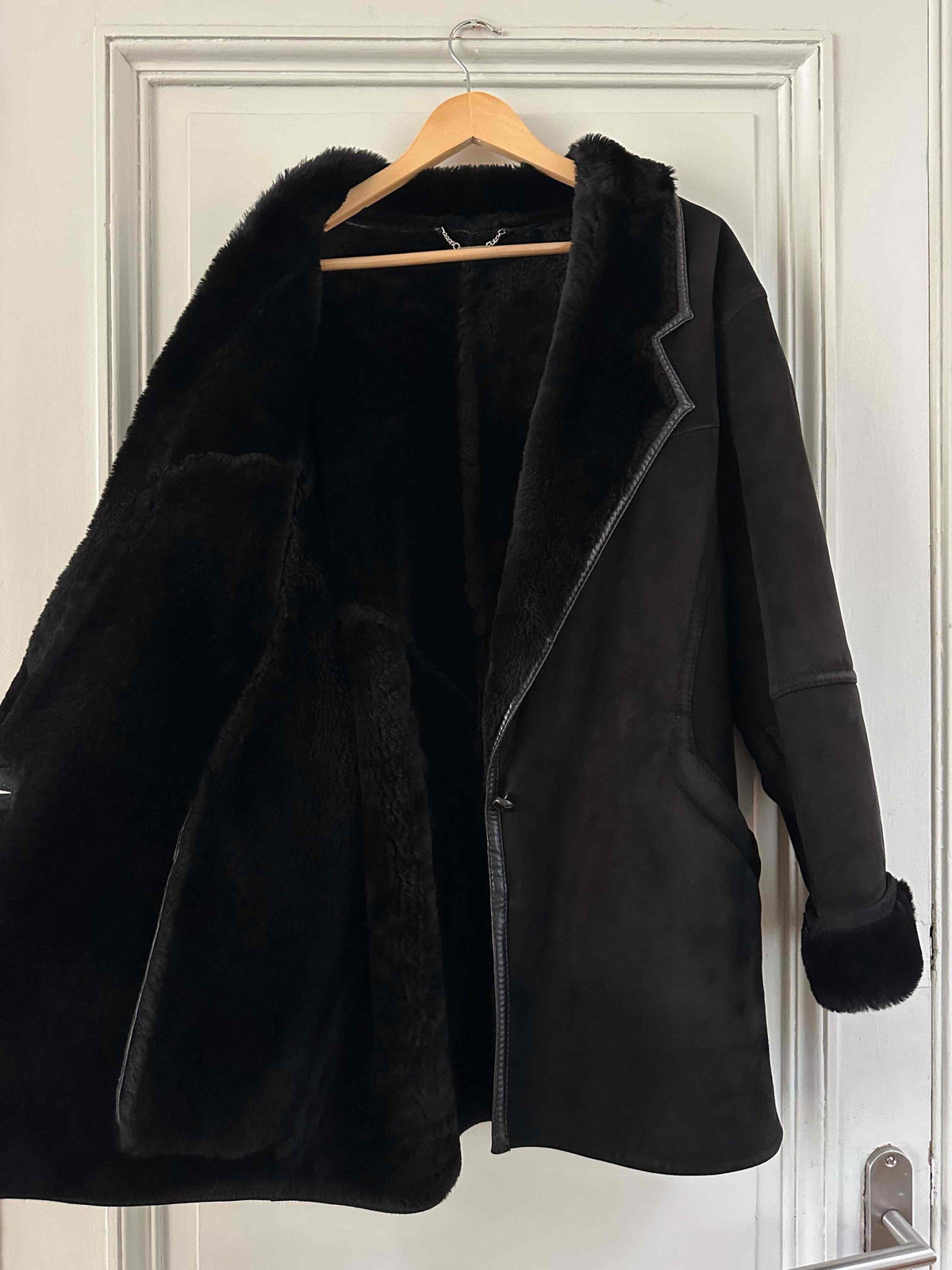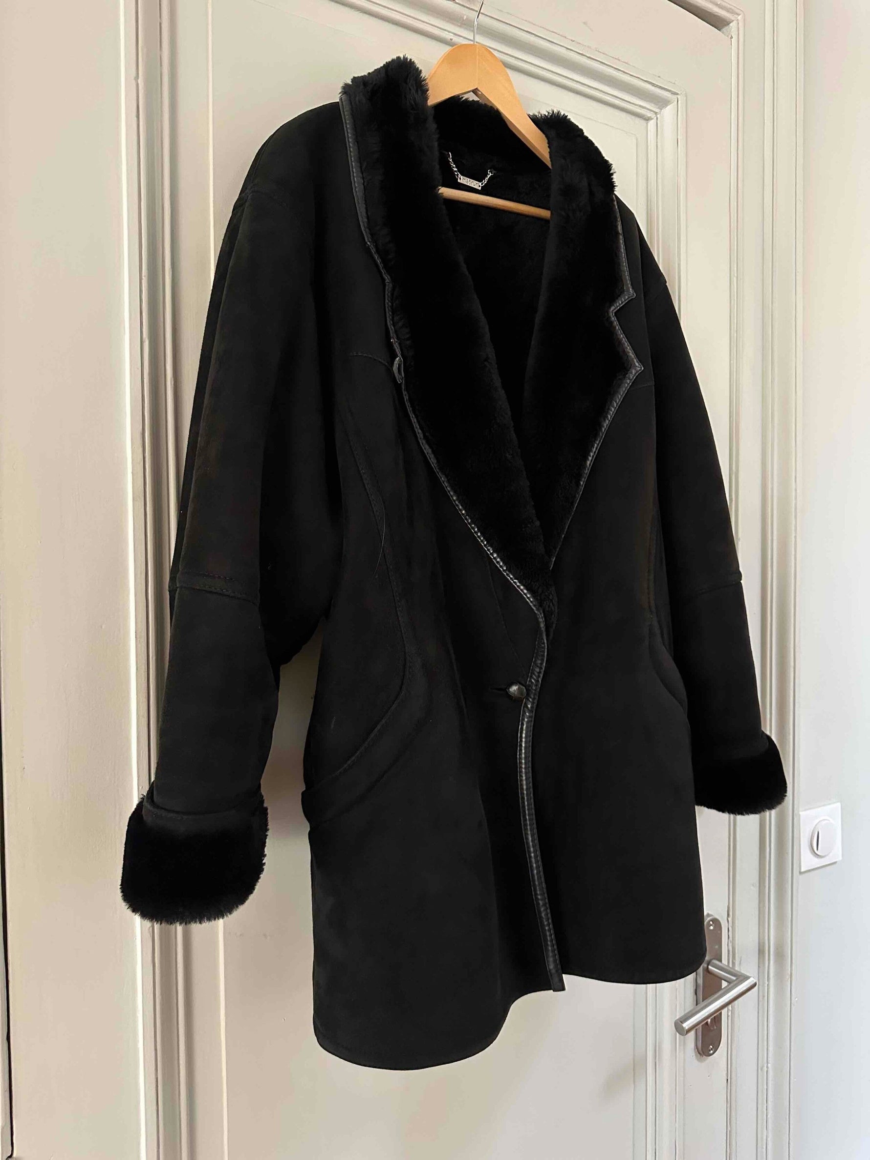 Prix unitaire parPeau lainee en mouton retourné exterieur daim noir gansé de cuir lisse, intérieur laine de mouton noire, col chale à boutonné, un bouton taille, fabriqué en Italie, taille 38 et 40 porté ici sur une personne T40.