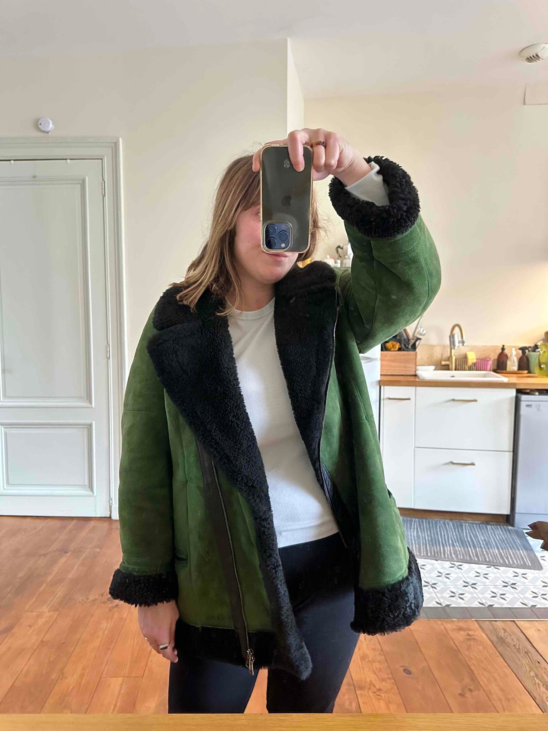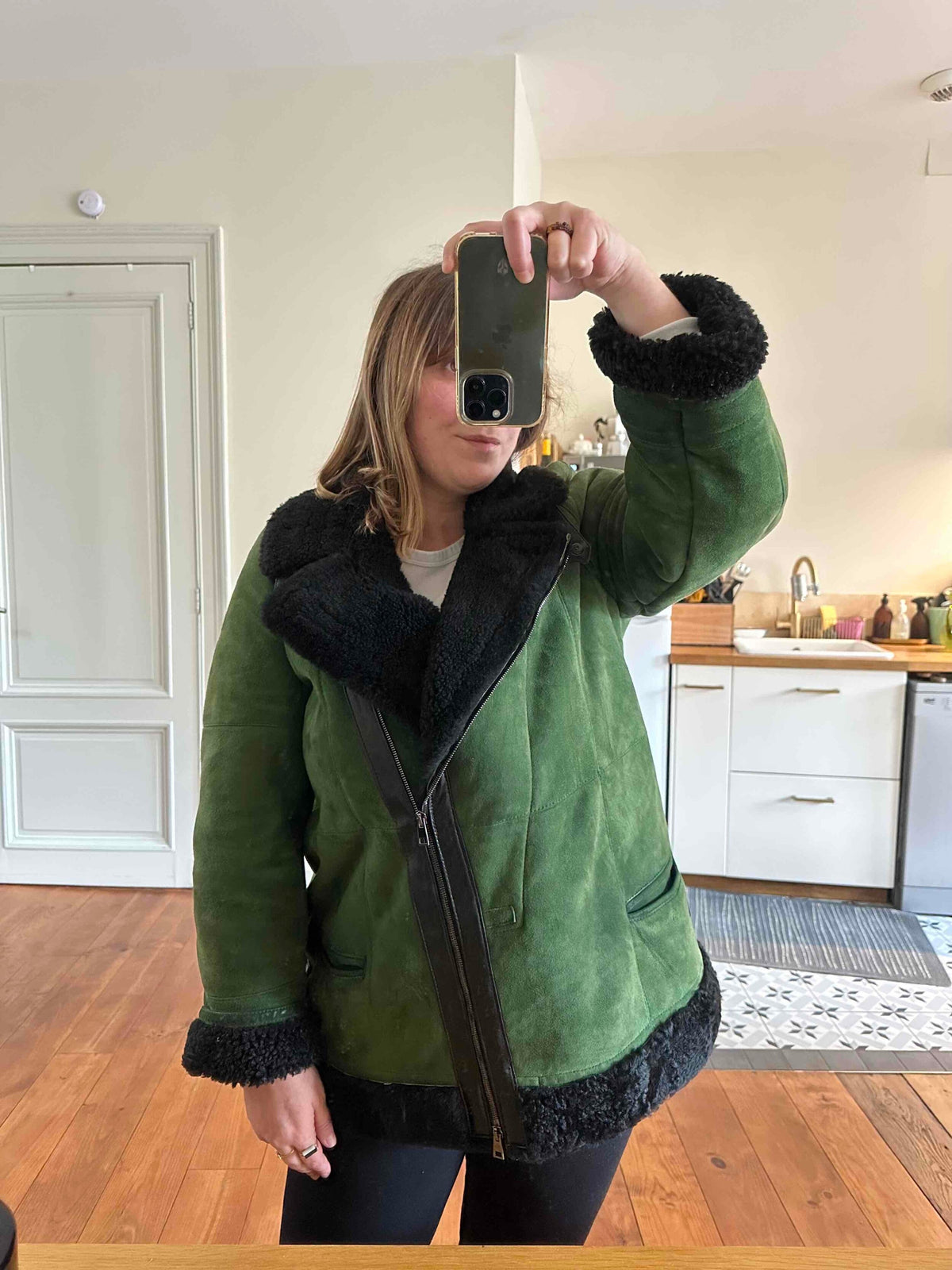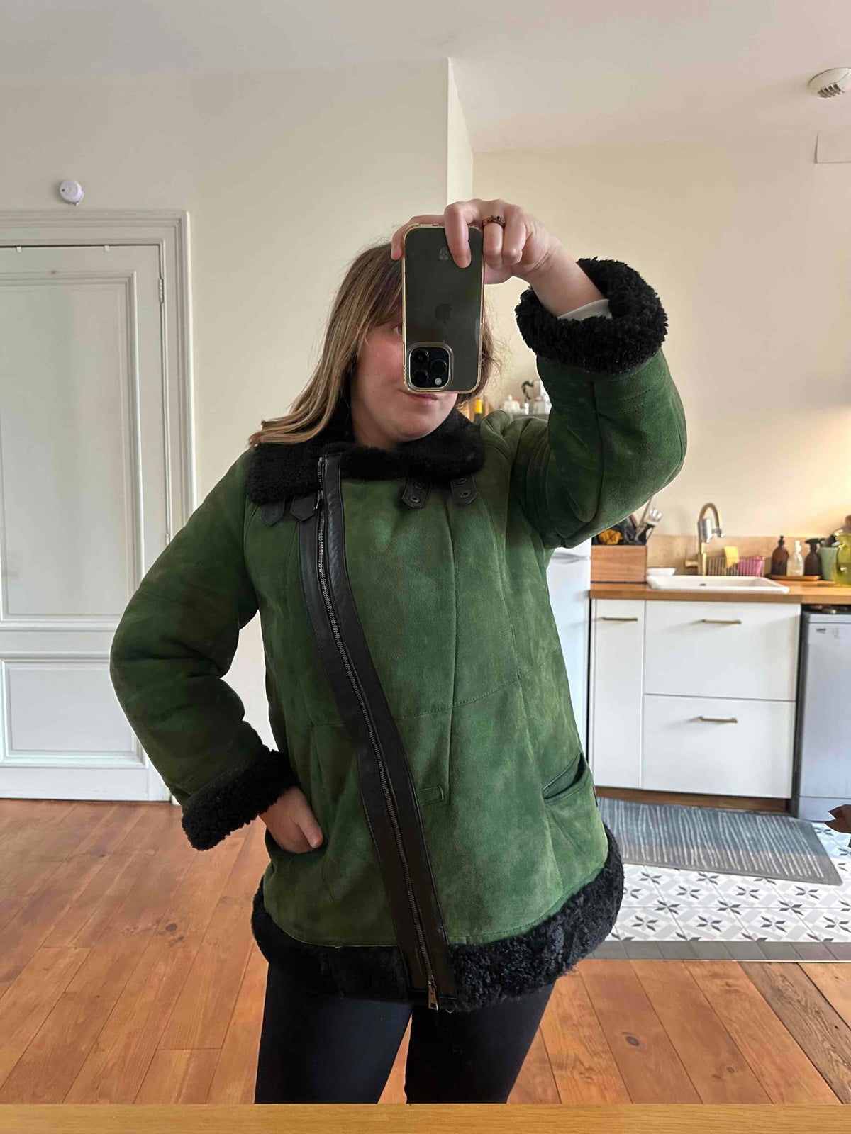 Prix unitaire parPeau lainee en mouton retourné extérieur daim vert bouteille, ganses en cuir lisse noir, intérieur laine de mouton noire, forme bombardier perfecto avec fermeture éclair asymétrique, légèrement trapèze, fabriqué artisanalement en Italie, taille 38 portée ici sur une personne T40 et sur un mannequin T36.