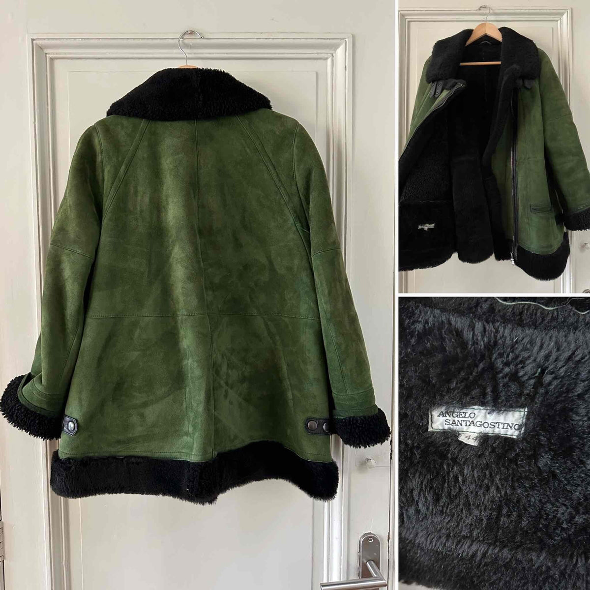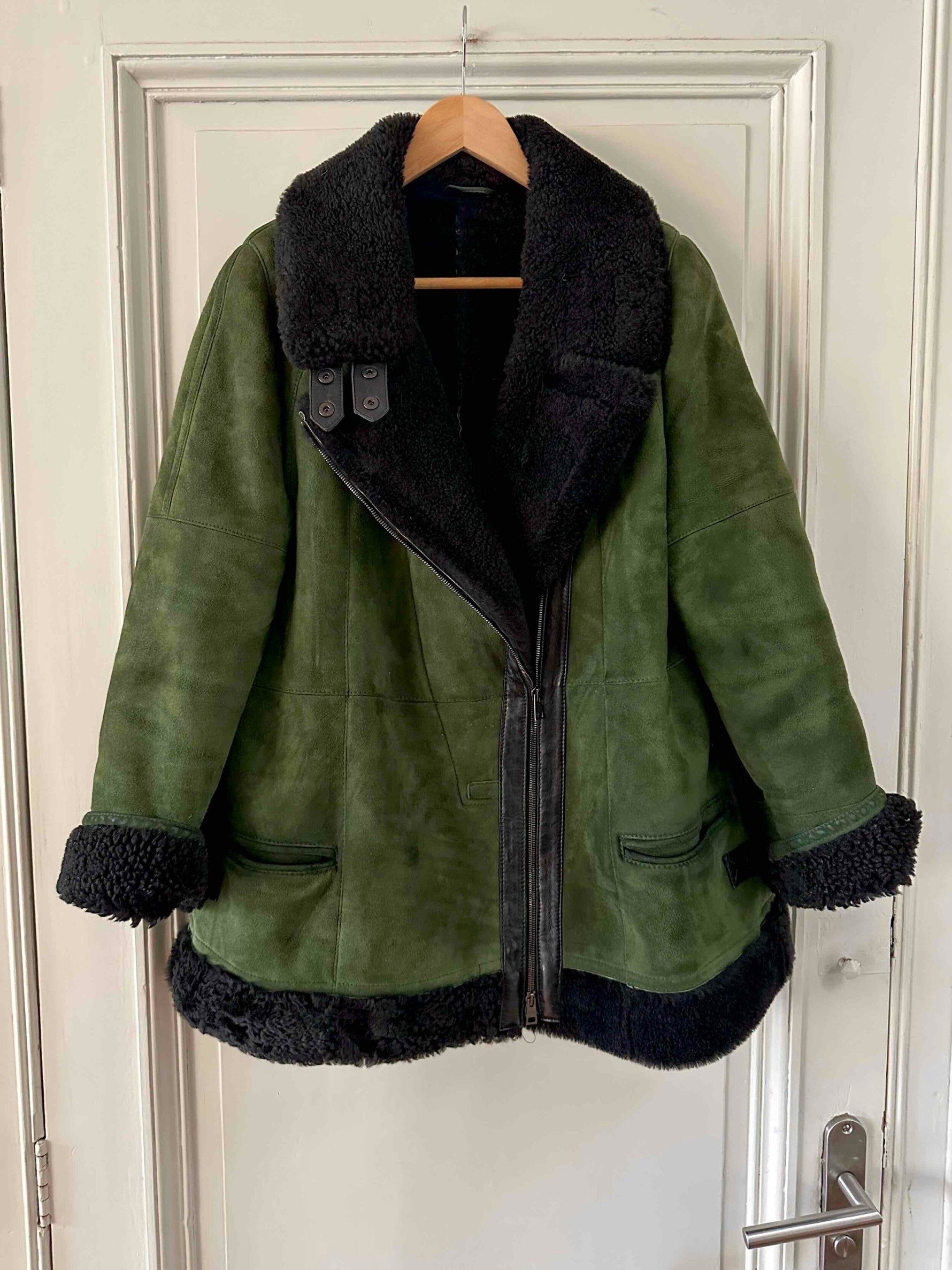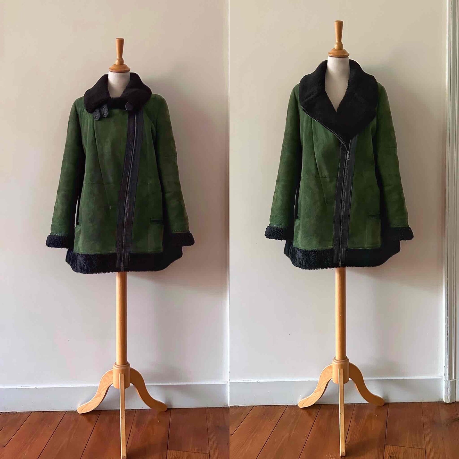 Prix unitaire parPeau lainee en mouton retourné extérieur daim vert bouteille, ganses en cuir lisse noir, intérieur laine de mouton noire, forme bombardier perfecto avec fermeture éclair asymétrique, légèrement trapèze, fabriqué artisanalement en Italie, taille 38 portée ici sur une personne T40 et sur un mannequin T36.