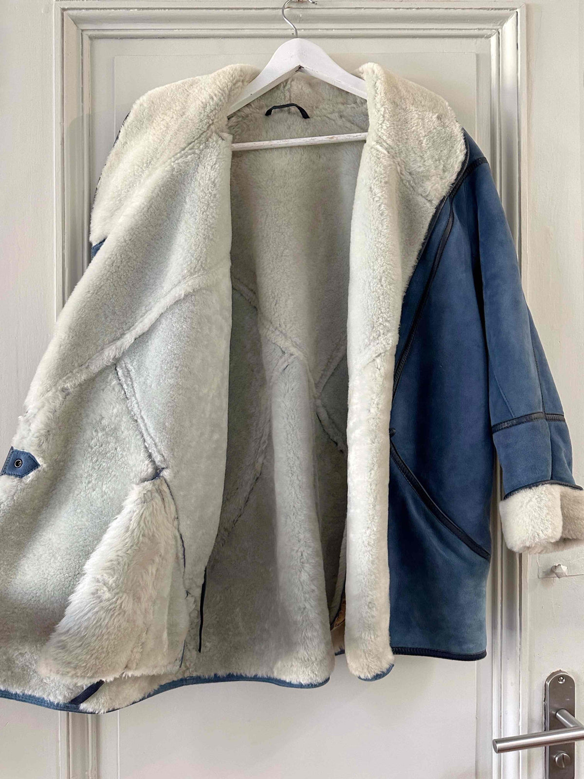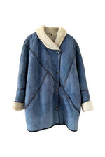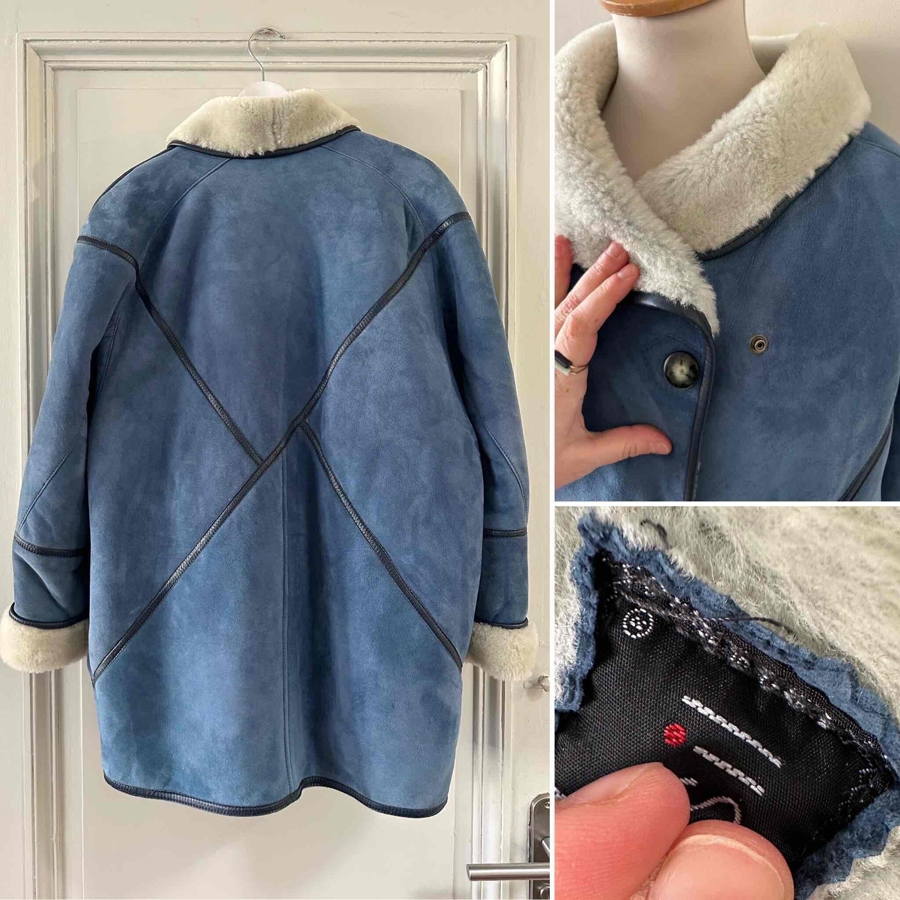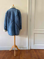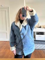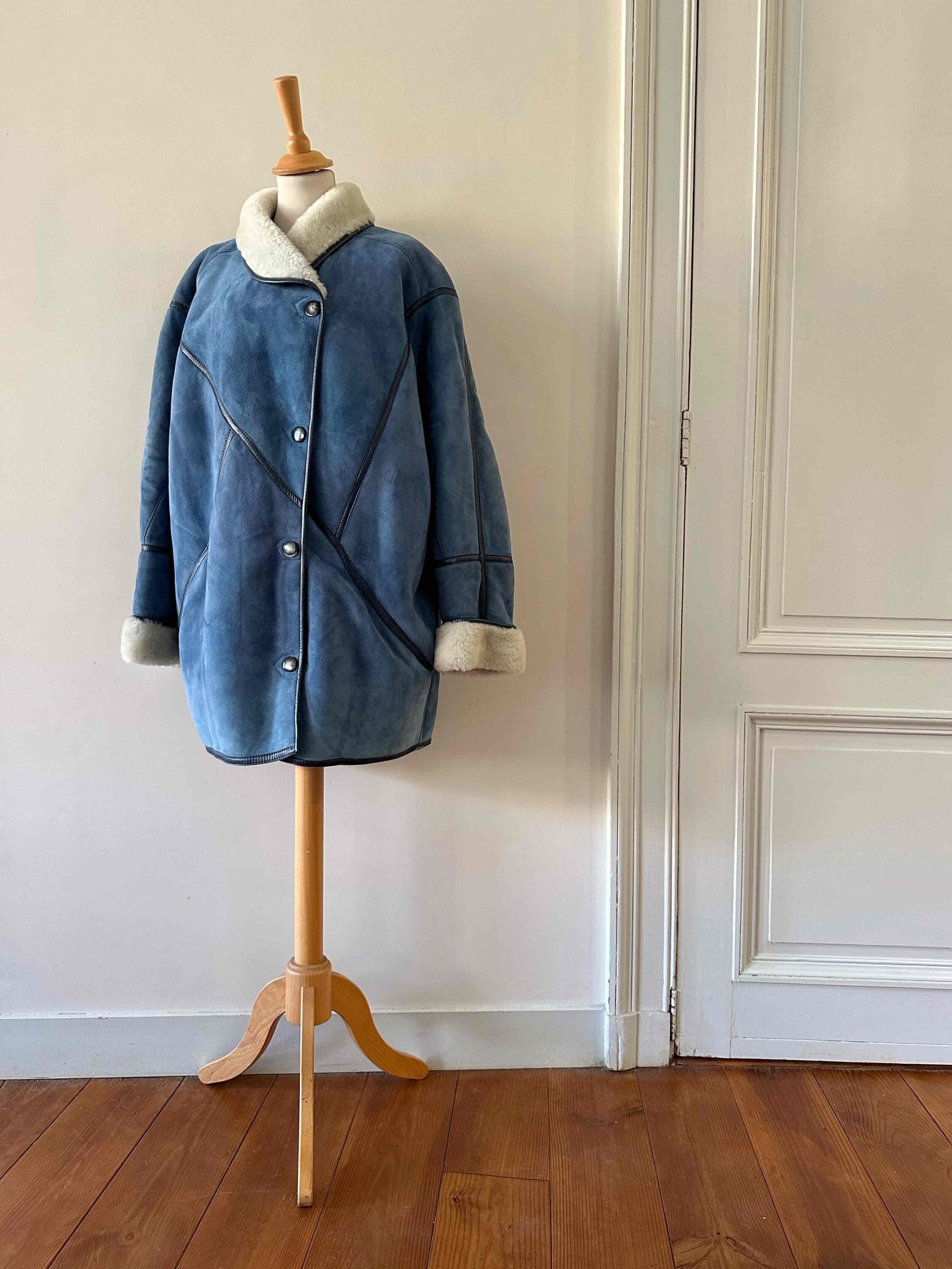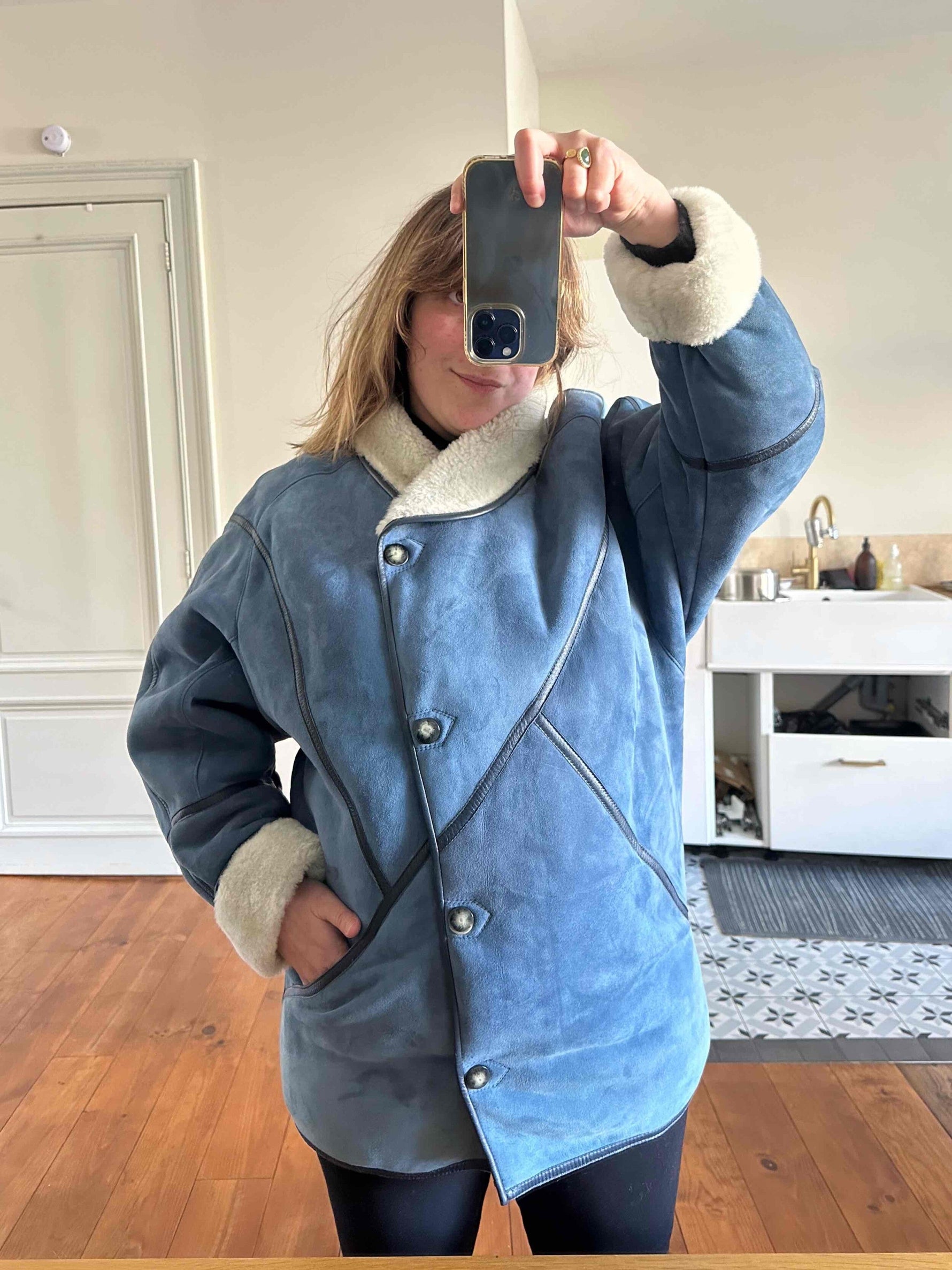 Prix unitaire parPeau lainee en mouton retourné, exterieur daim bleu jeans, ganses en cuir lisse bleues marines, interieur laine de mouton blnc, col claudine, boutonnage croisé par boutons pressions, fabriqué en France, taille 38 porté ici sur un mannequin T36 et serré sur une personne T40.