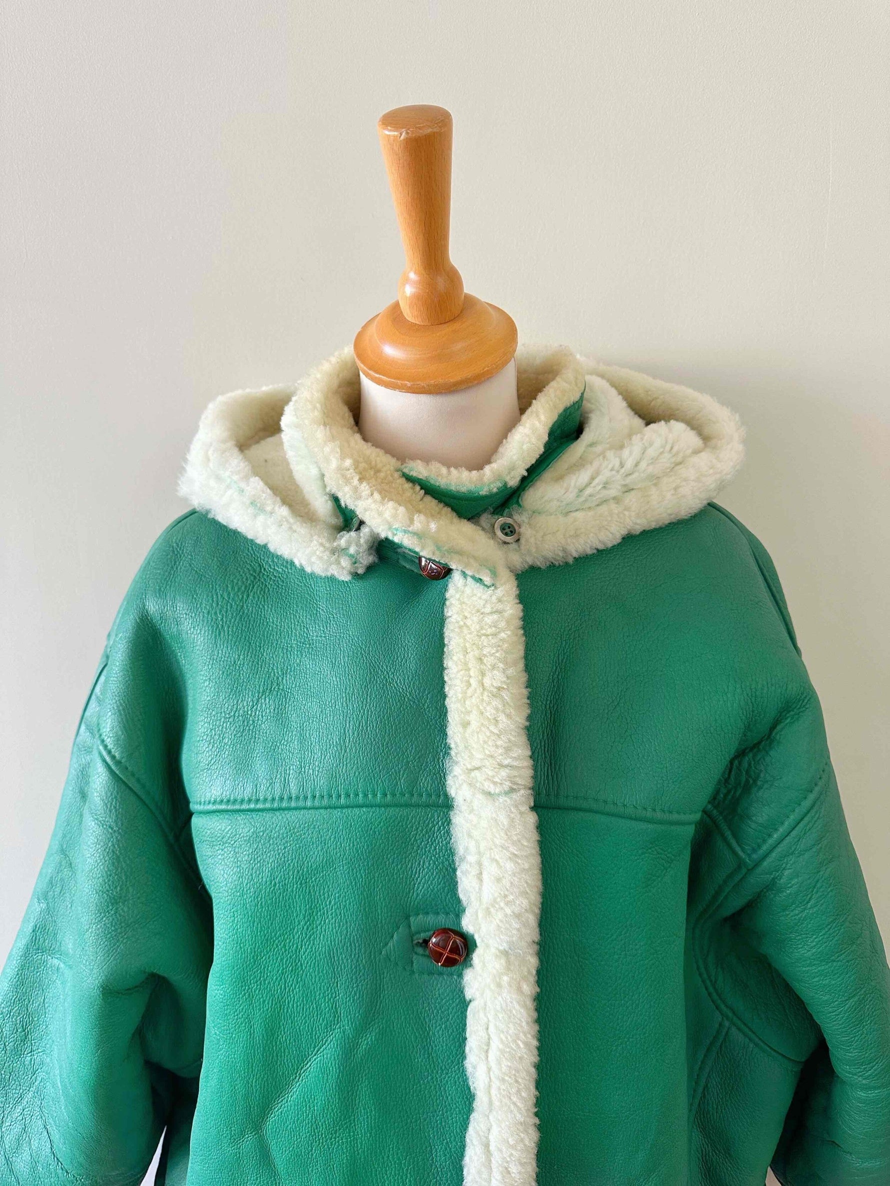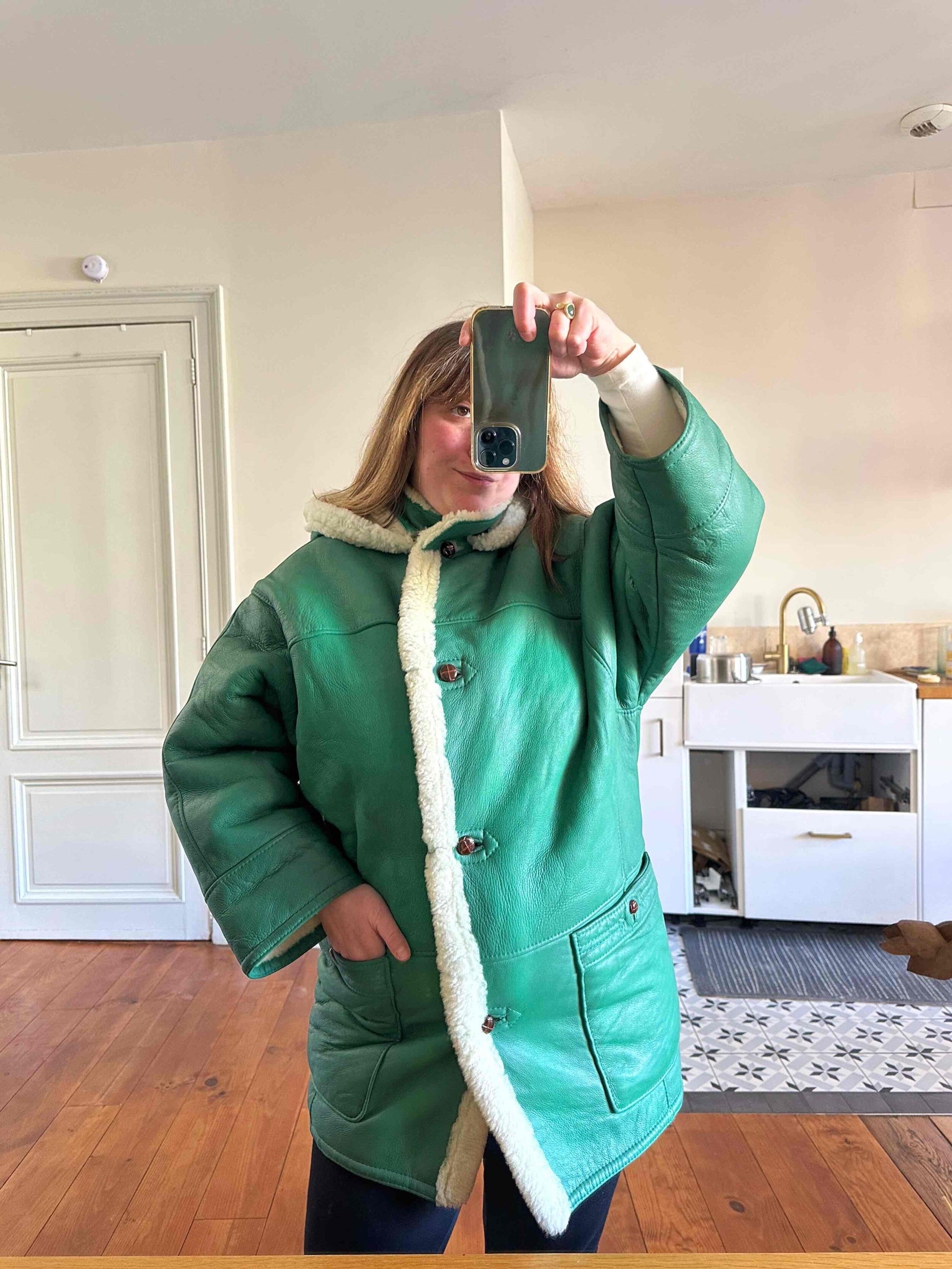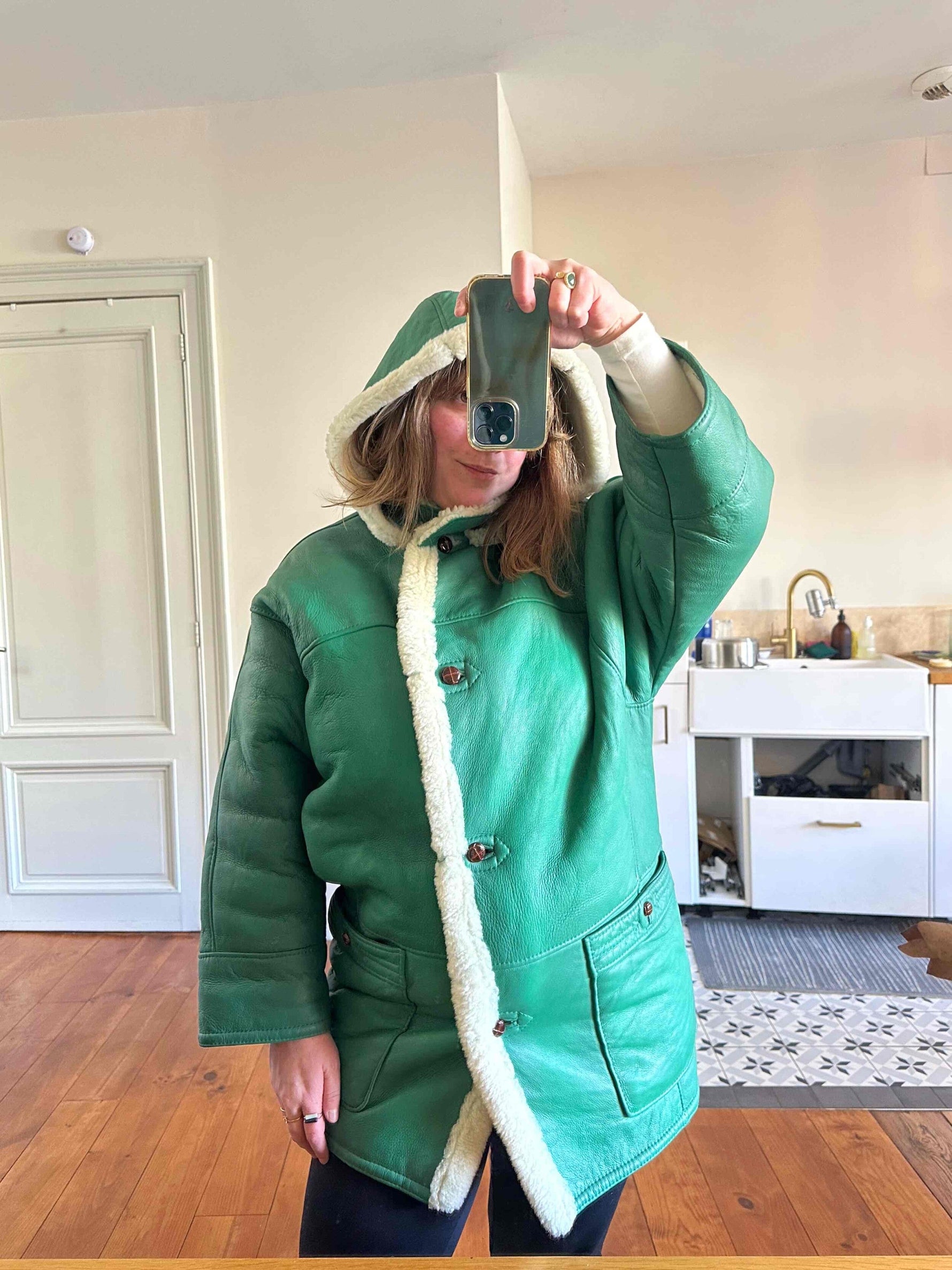 Peau lainee en mouton retourné, exterieur cuir vert chlorophylle, interieur en laine de mouton ecru, capuche amovible, manches chauves souris, boutons brun, fabriqué artisanalement en Italie, taille 38 porté ici sur un mannequin T36, et serré sur une personne T40.