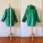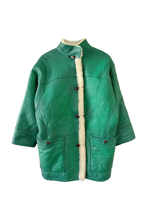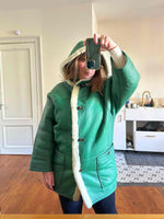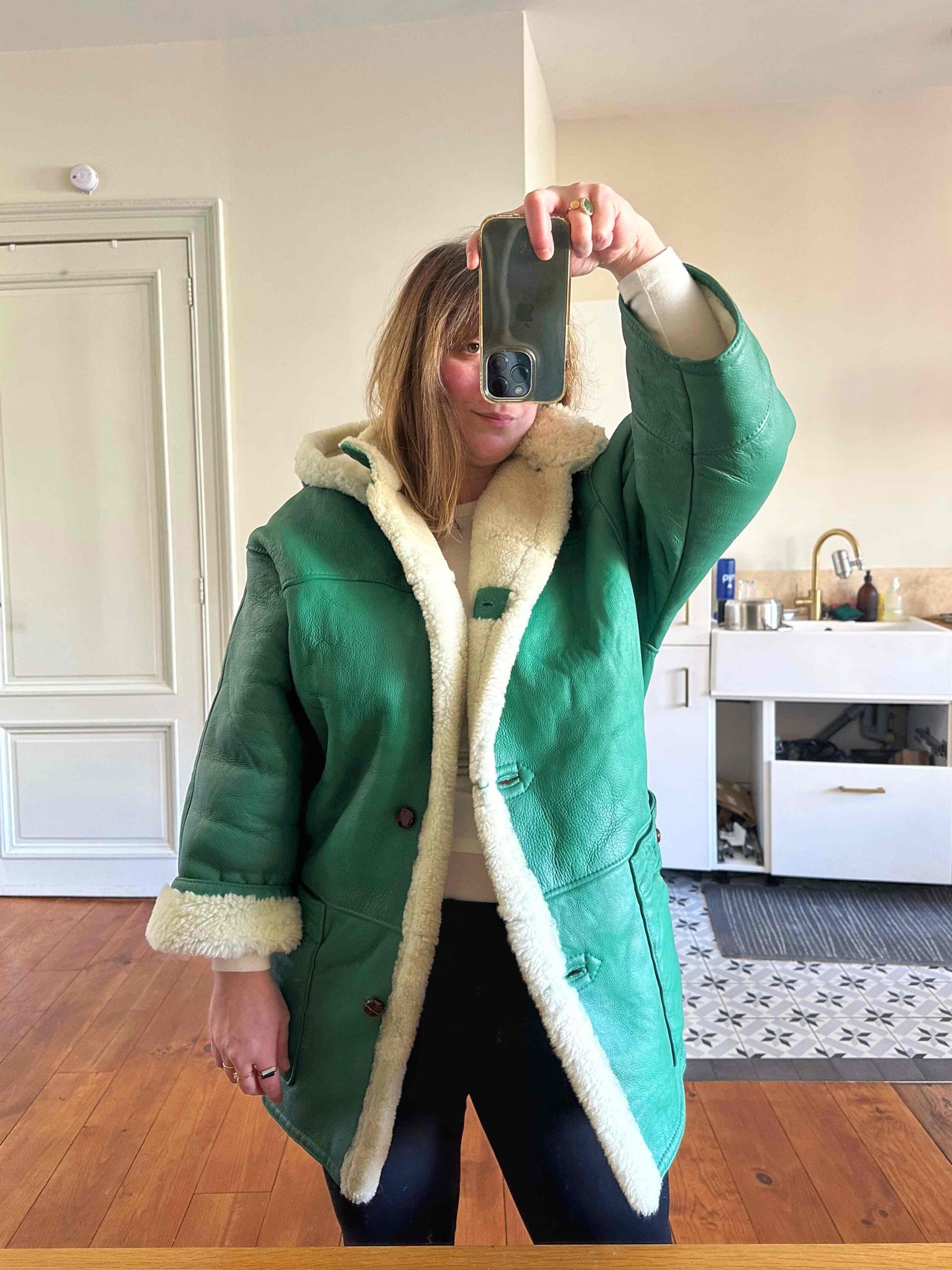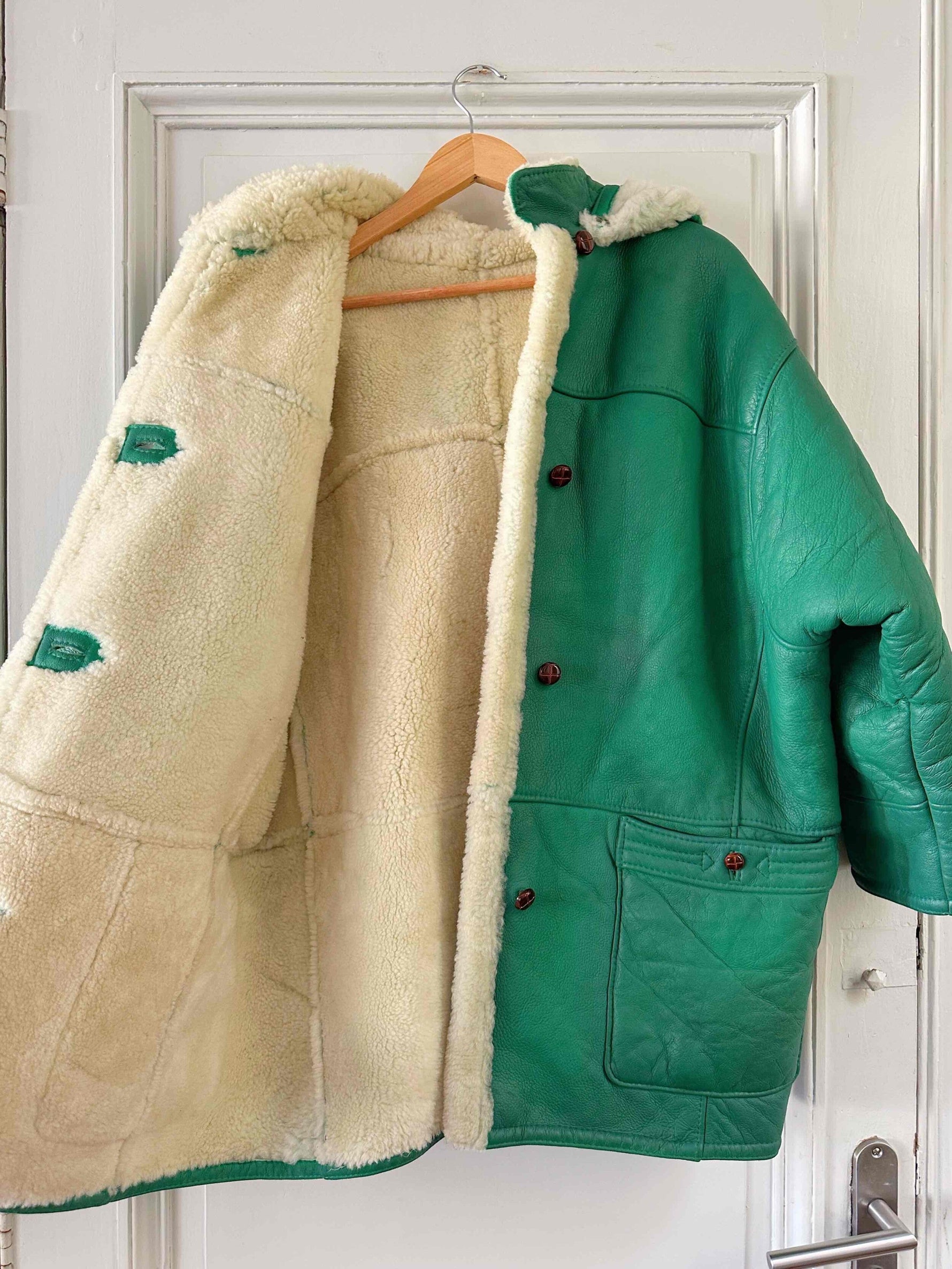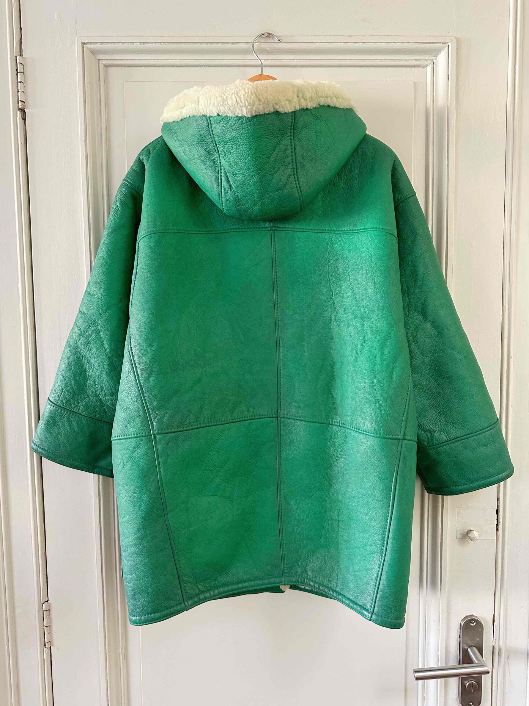 Peau lainee en mouton retourné, exterieur cuir vert chlorophylle, interieur en laine de mouton ecru, capuche amovible, manches chauves souris, boutons brun, fabriqué artisanalement en Italie, taille 38 porté ici sur un mannequin T36, et serré sur une personne T40.