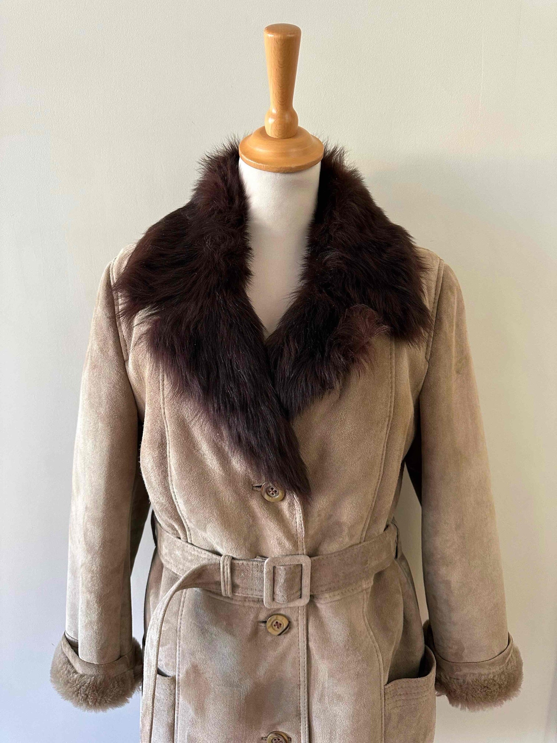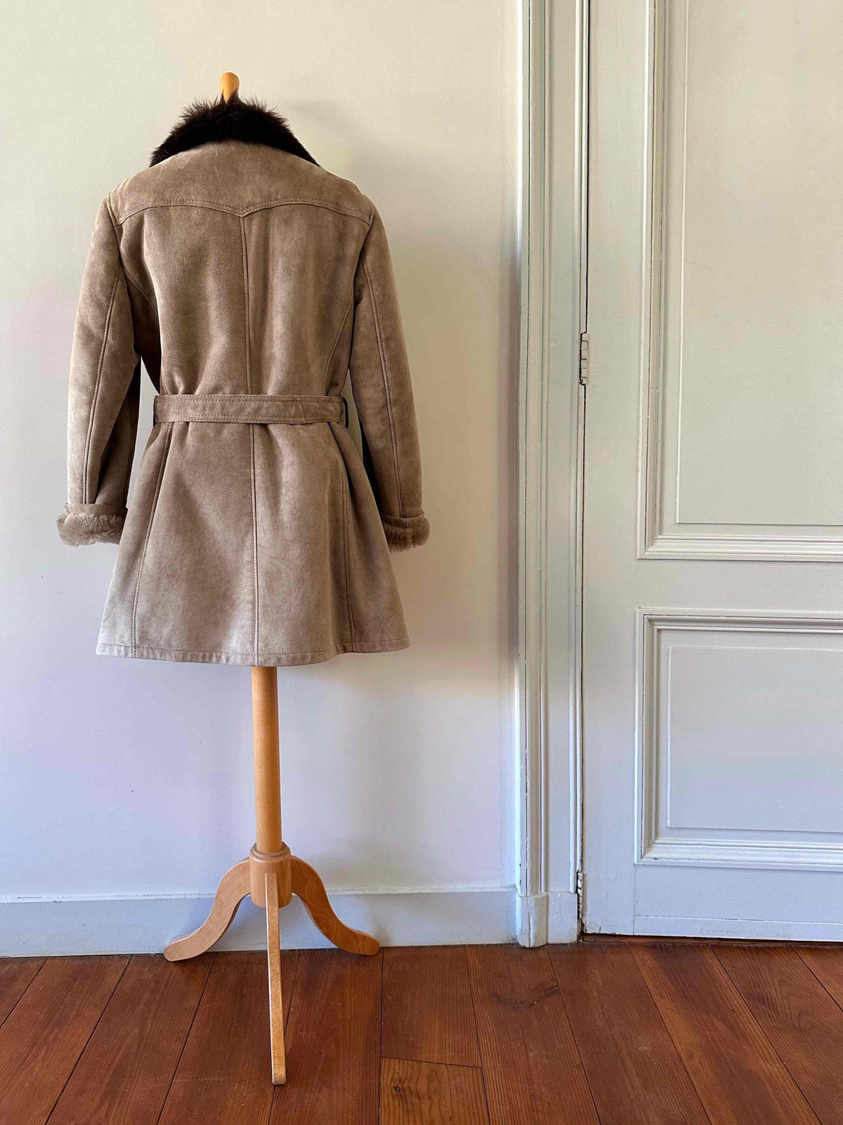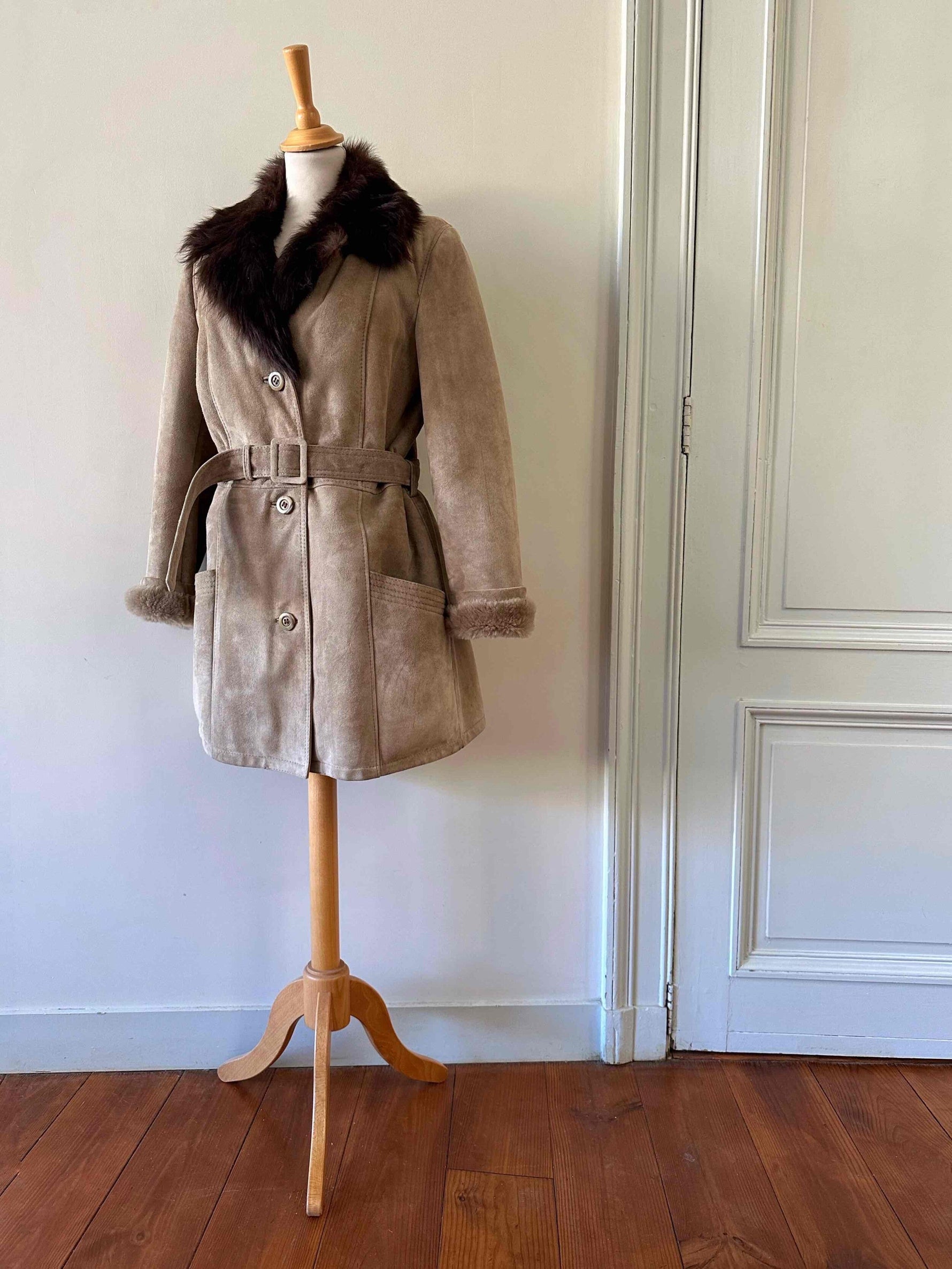 Prix unitaire parManteau Penny Lane, en peau lainée, mouton retourné exterieur daim beige, interieur mouton beige, col en laine de mouton a poils longs chocolat, ceinture taille à boucle recouverte, années 70s, taille 36 porté ici sur un mannequin T36.
