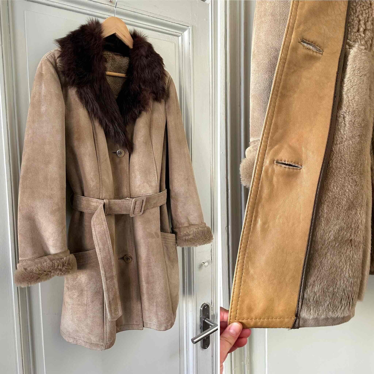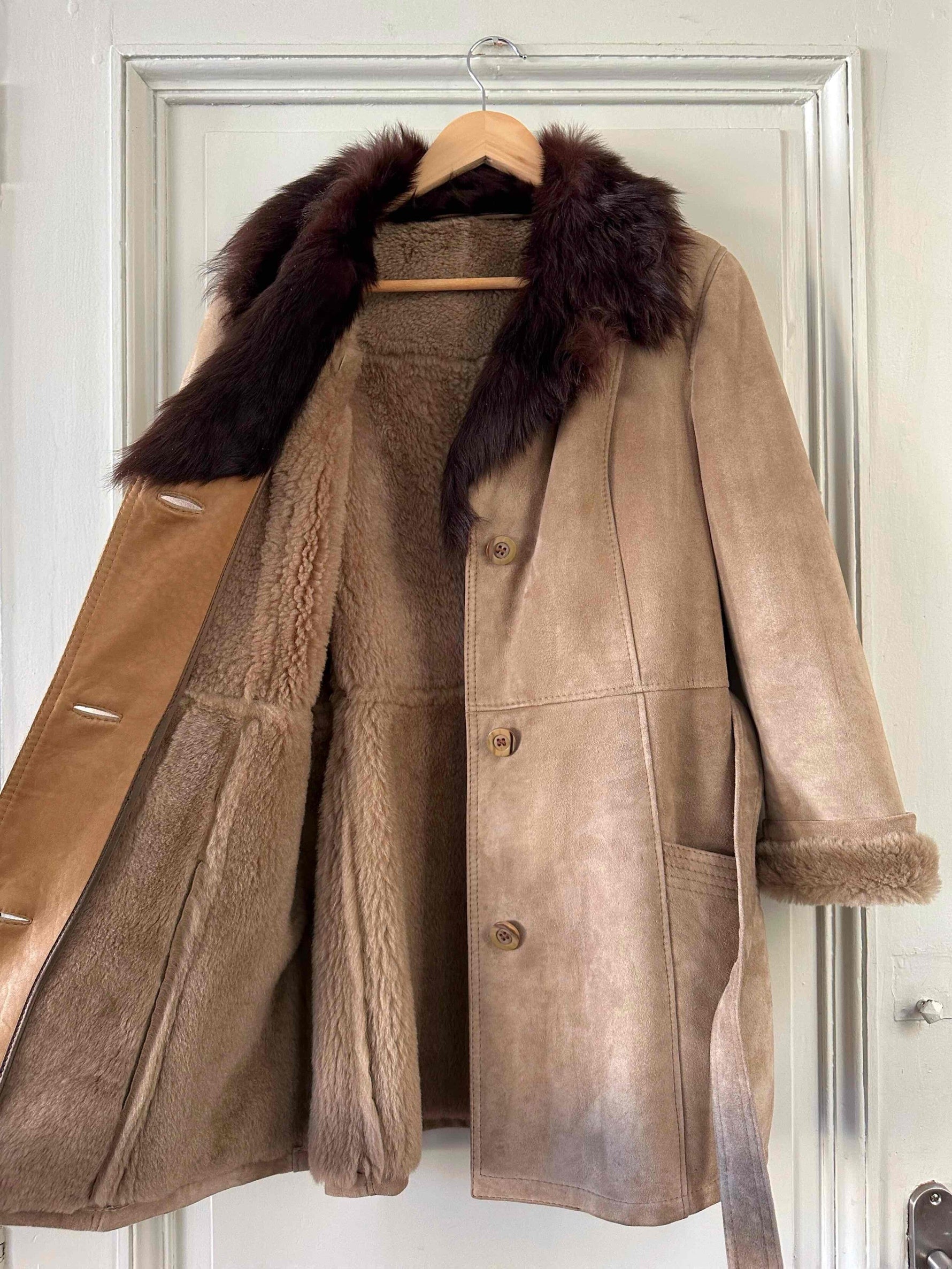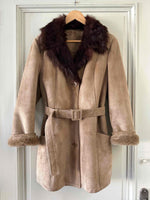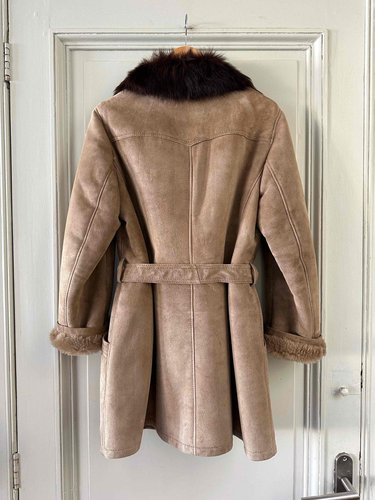 Prix unitaire parManteau Penny Lane, en peau lainée, mouton retourné exterieur daim beige, interieur mouton beige, col en laine de mouton a poils longs chocolat, ceinture taille à boucle recouverte, années 70s, taille 36 porté ici sur un mannequin T36.