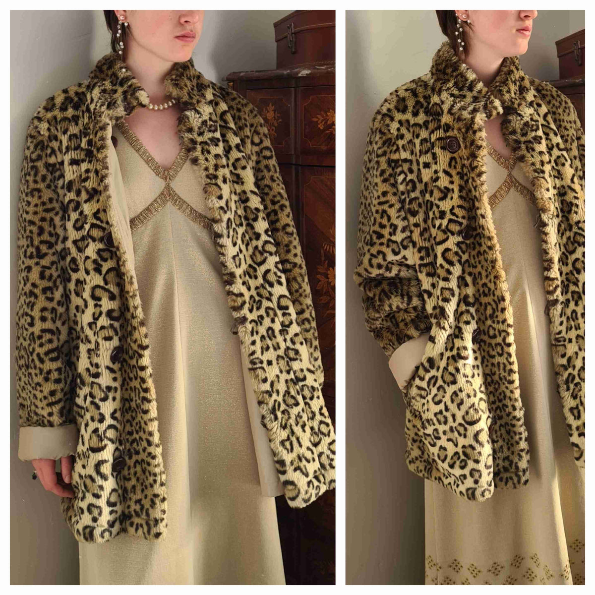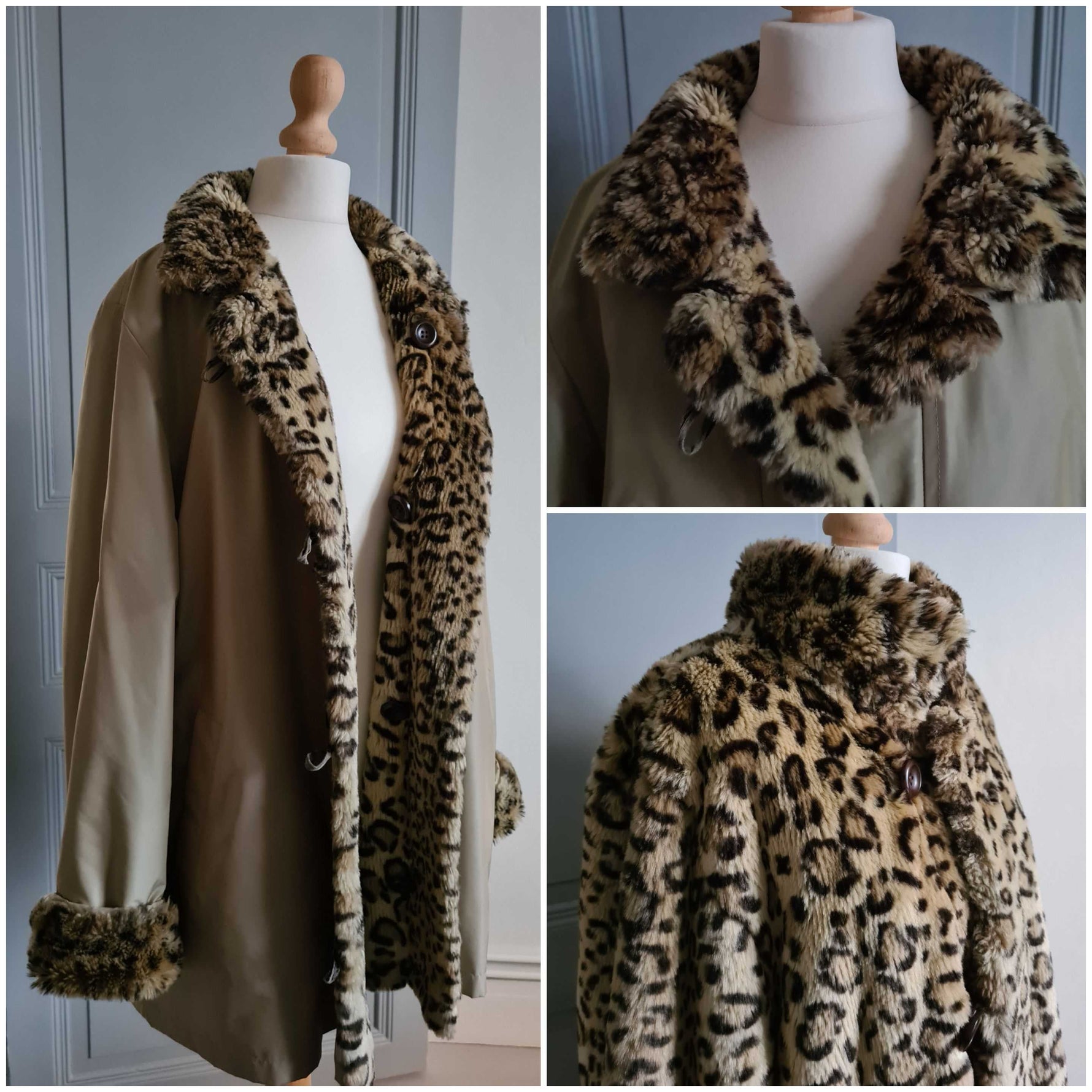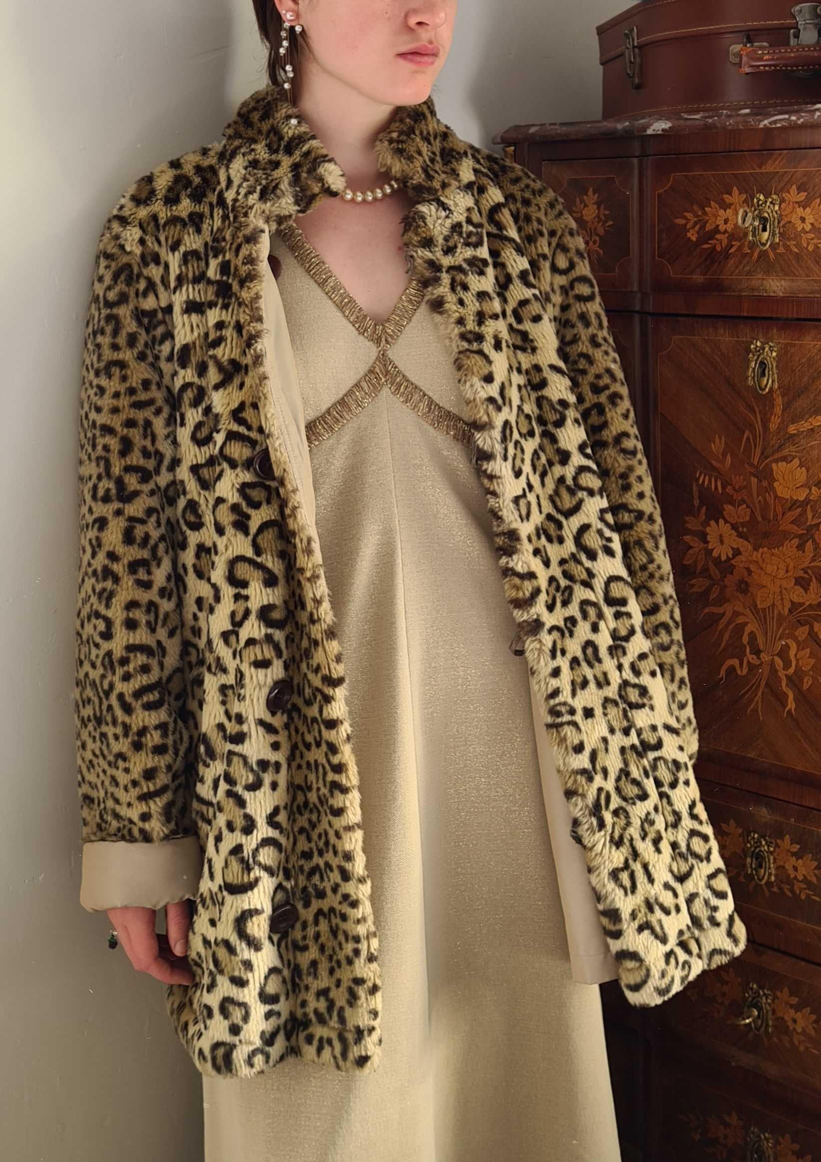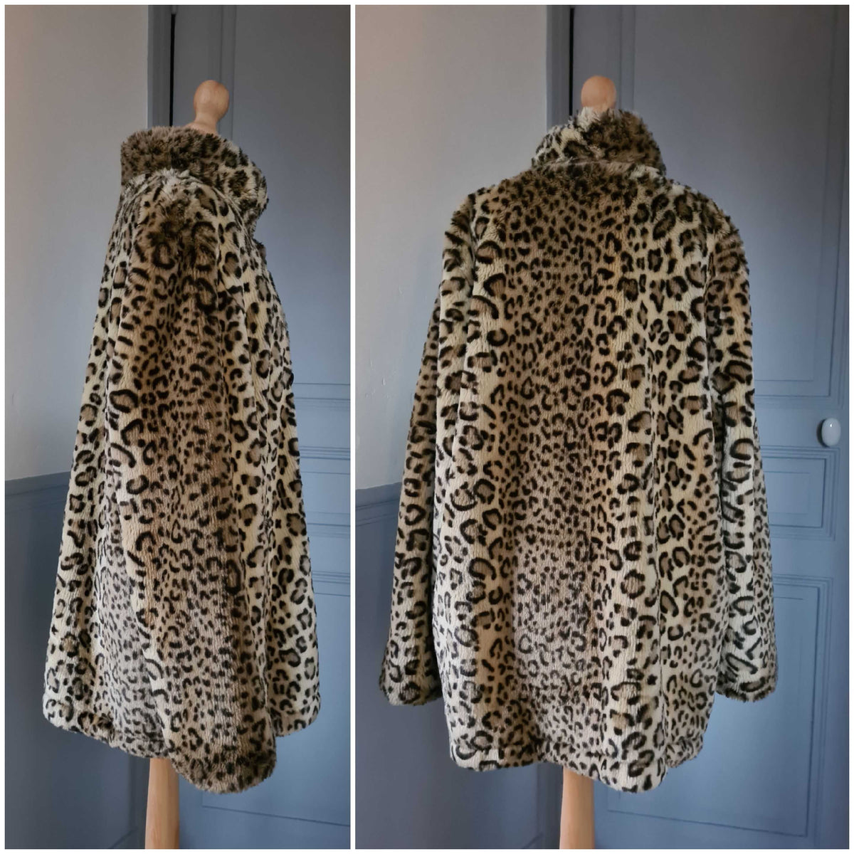 Prix unitaire parManteau léopard en fausse fourrure, réversible imperméable, fermeture boutons brides. Deux poches raglan et col montant fourrure sur chacune des faces. Coupe droite ample. Porté oversized par une taille 36 sur les photos.