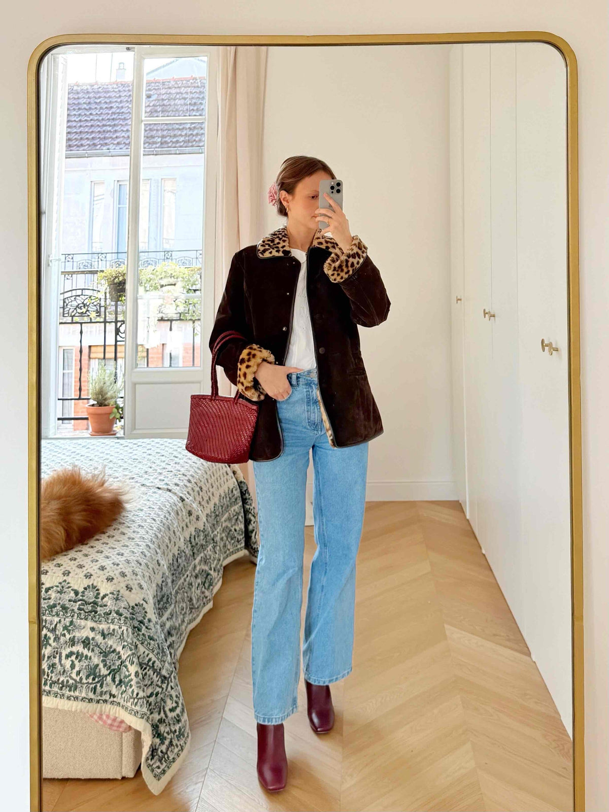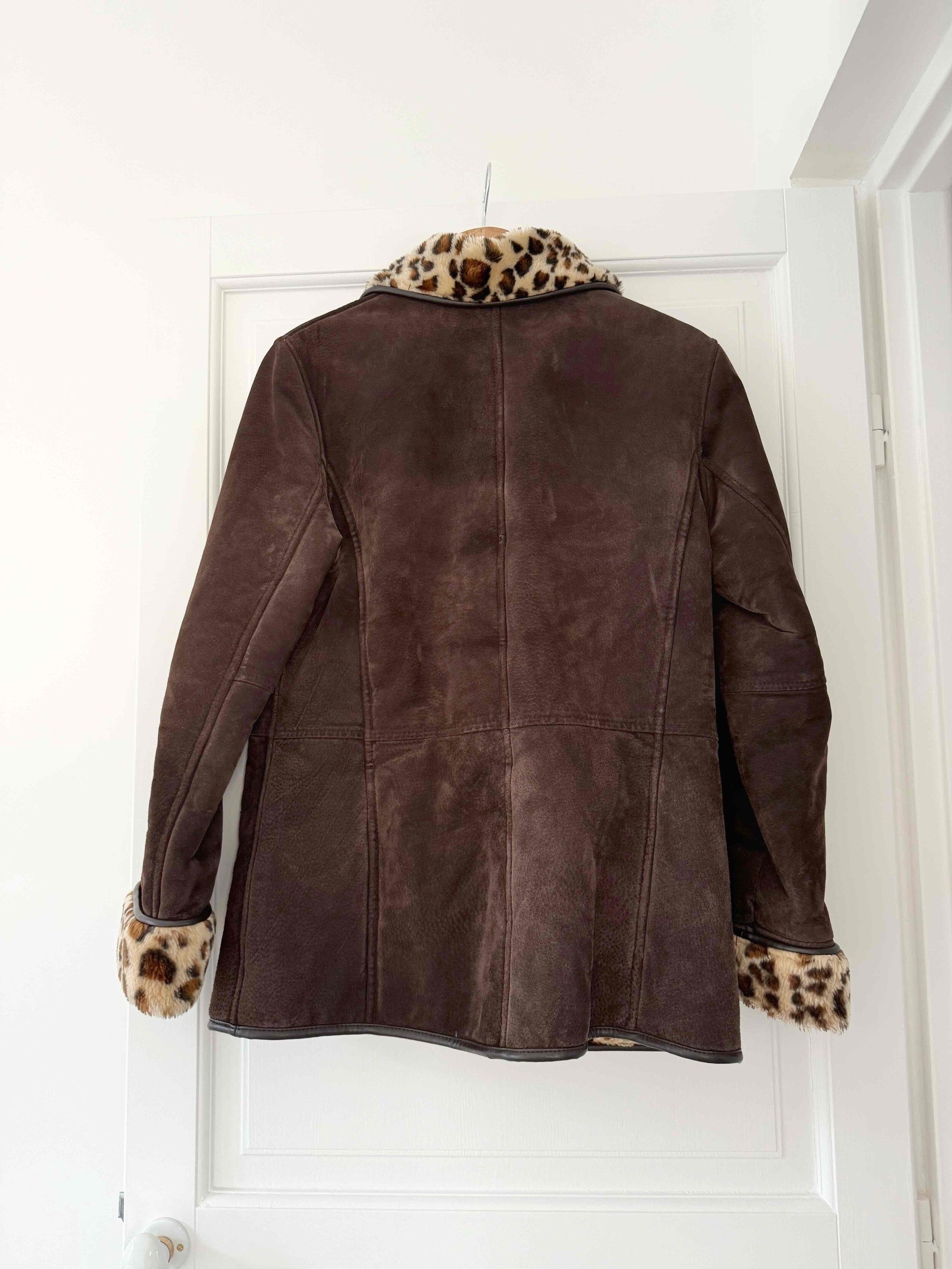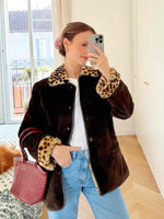 Manteau en peau lainée, cuir marron, entièrement fourré d’une fausse fourrure léopard, col et poignets en fausse fourrure, boutons pression sur le devant, deux poches, porté ici sur une T36 pour 1m64