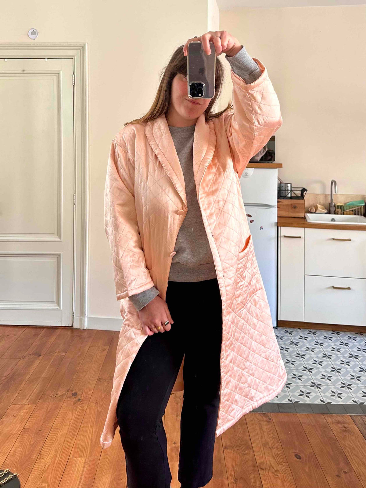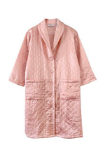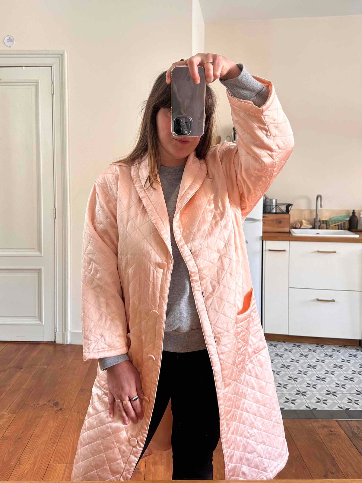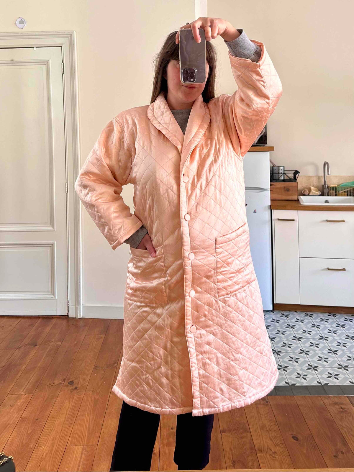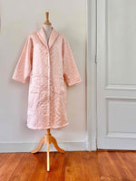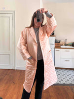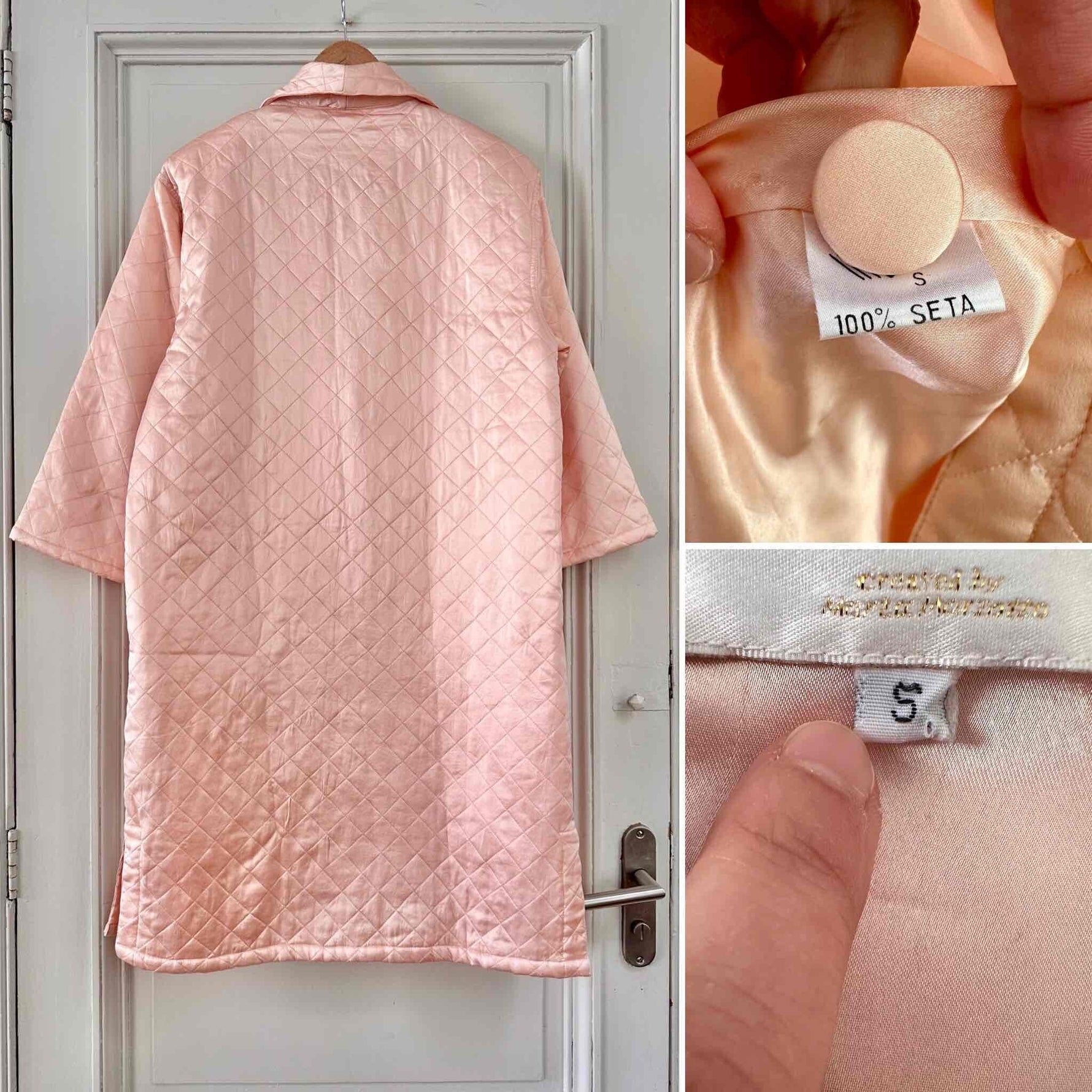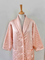 Manteau matelassé en soie satin, 100% soie, satin rose pâle, matelassé croisillons, col châle, boutons recouverts en soie, fabriqué en Italie, noté S, il convient aux tailles 36/38/40, porté ici sur un mannequin T36 et une personne T40.