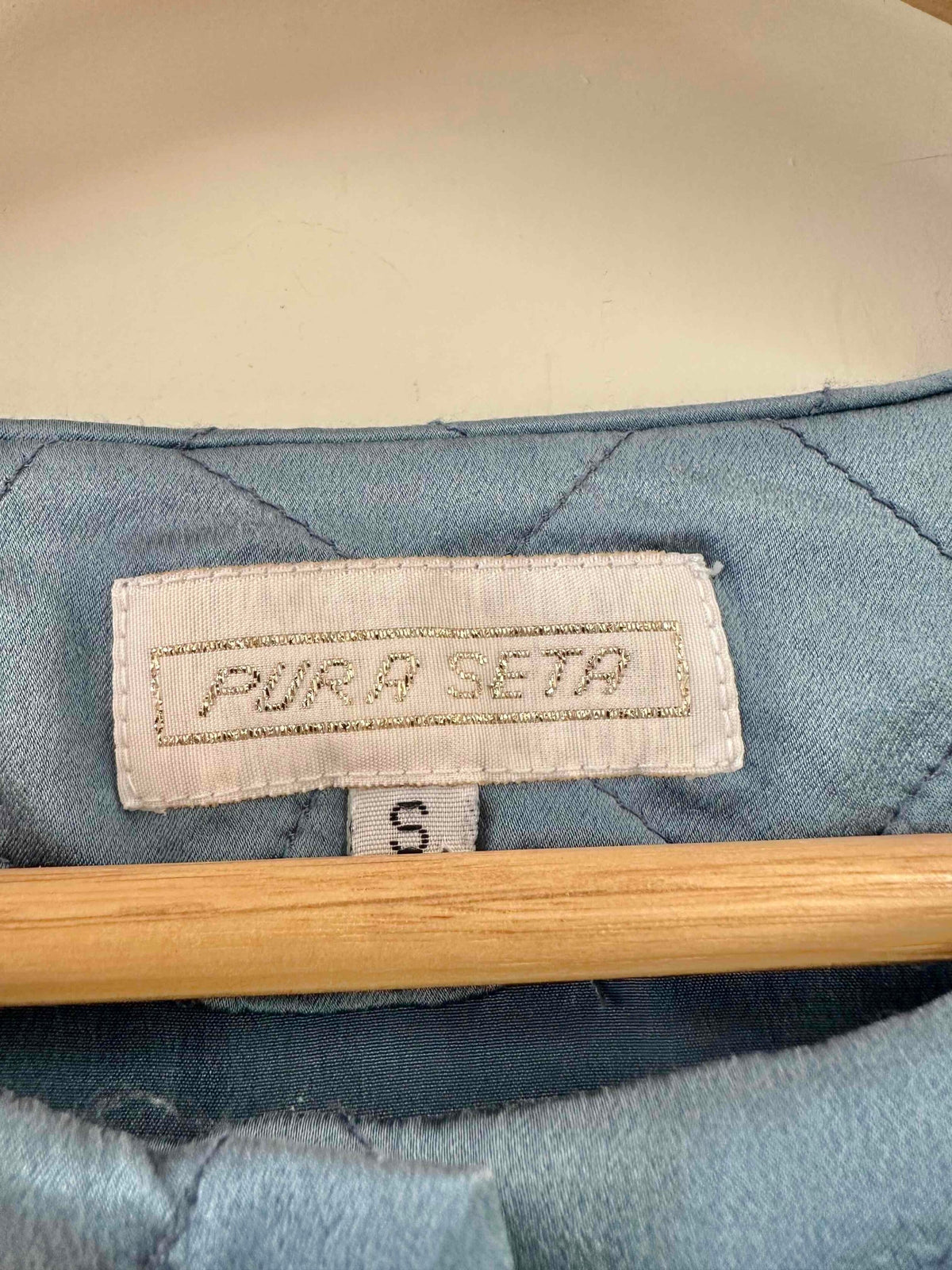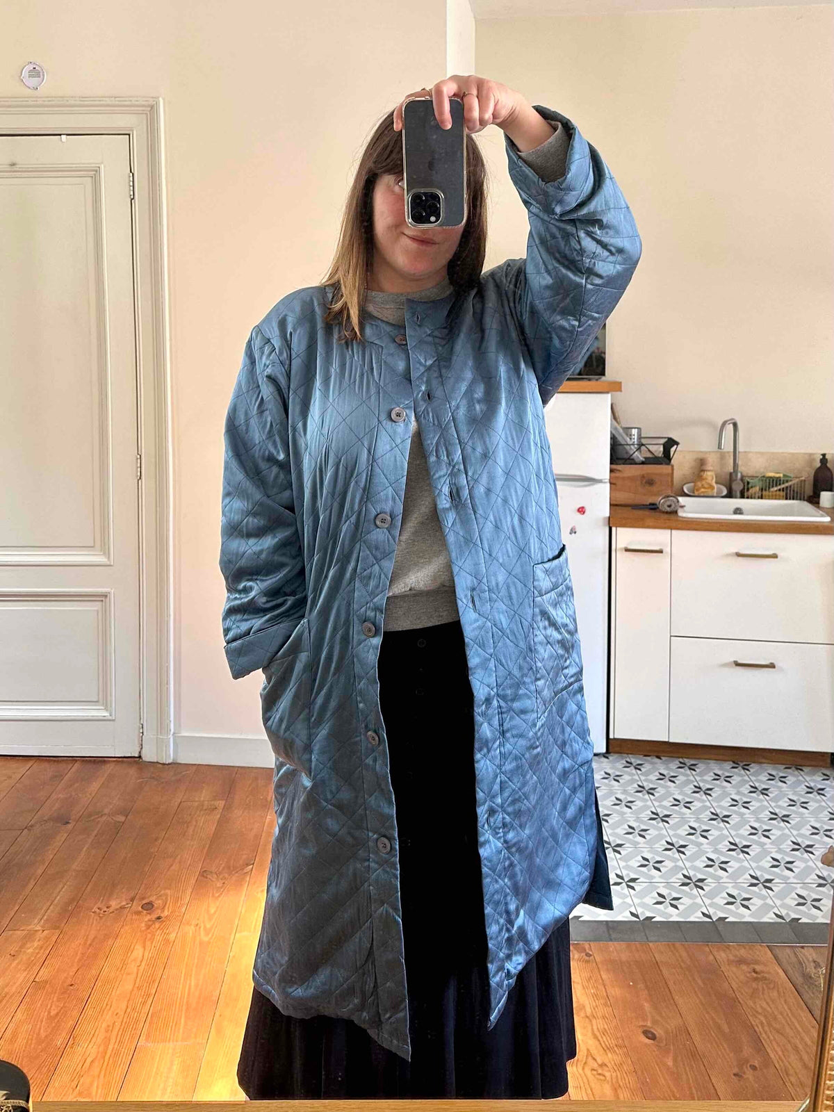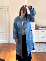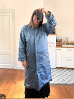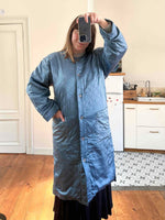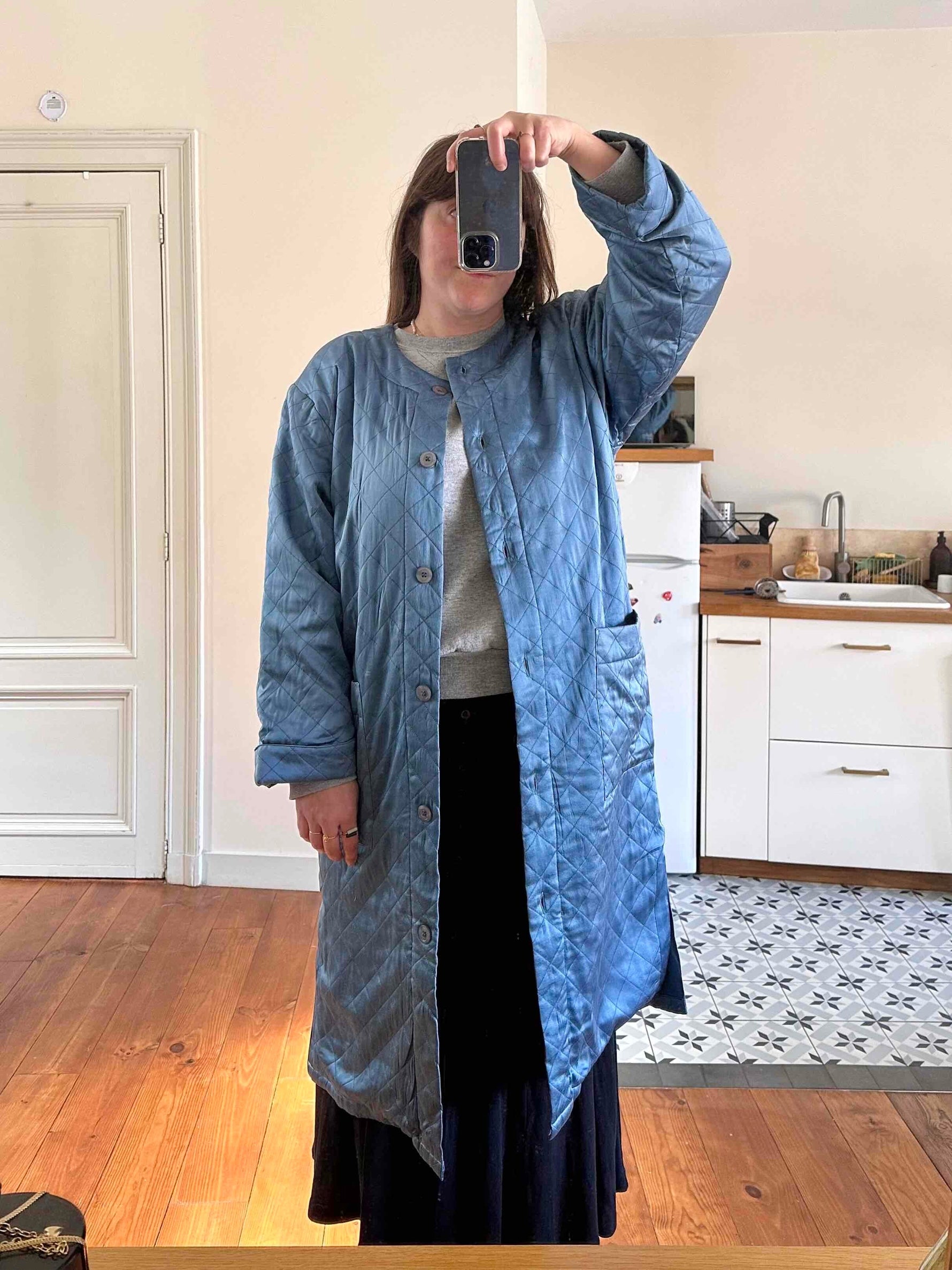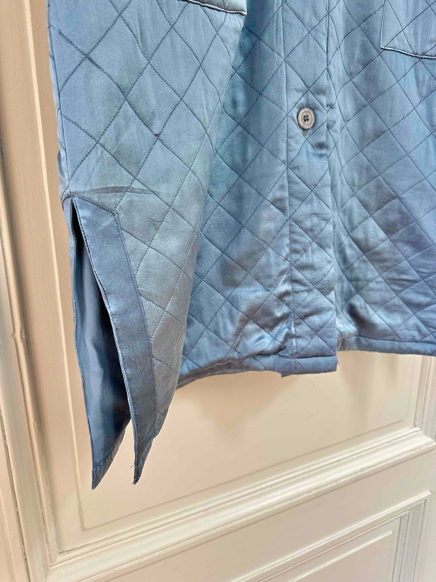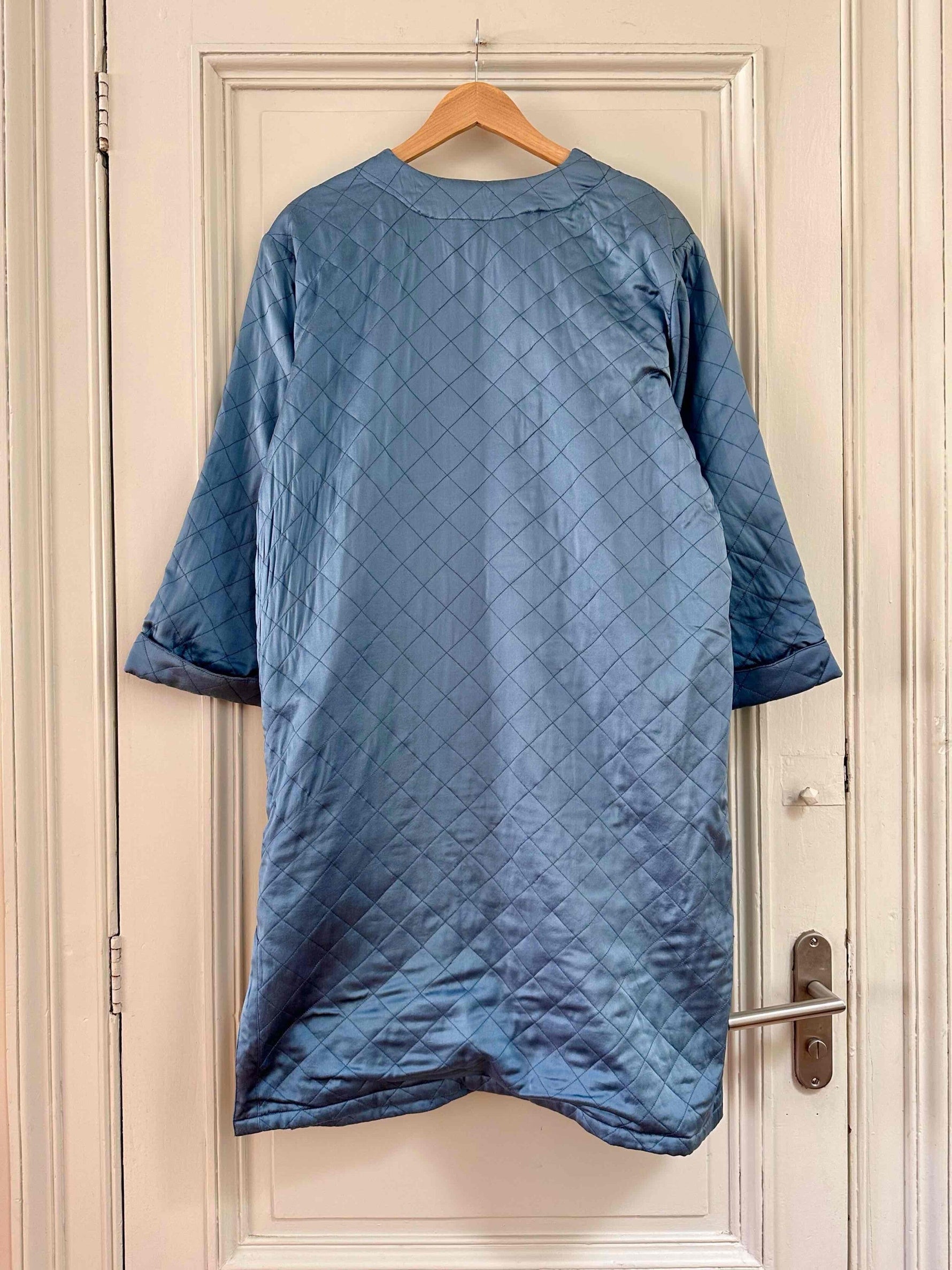 Prix unitaire parManteau matelassé en soie satin, 100% soie, bleu jean orage, matelassé croisillon, col châle, boutons recouverts en soie, fabriqué en Italie, noté S, il convient aux tailles 38/40, porté ici sur une personne T40.