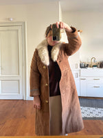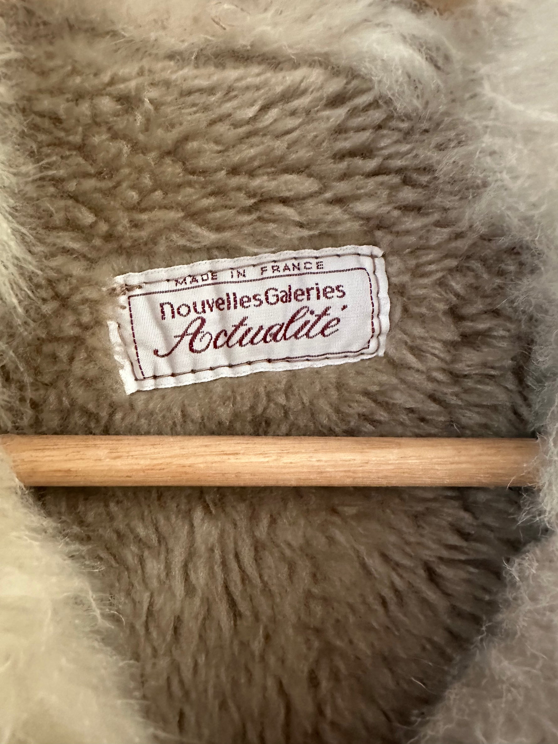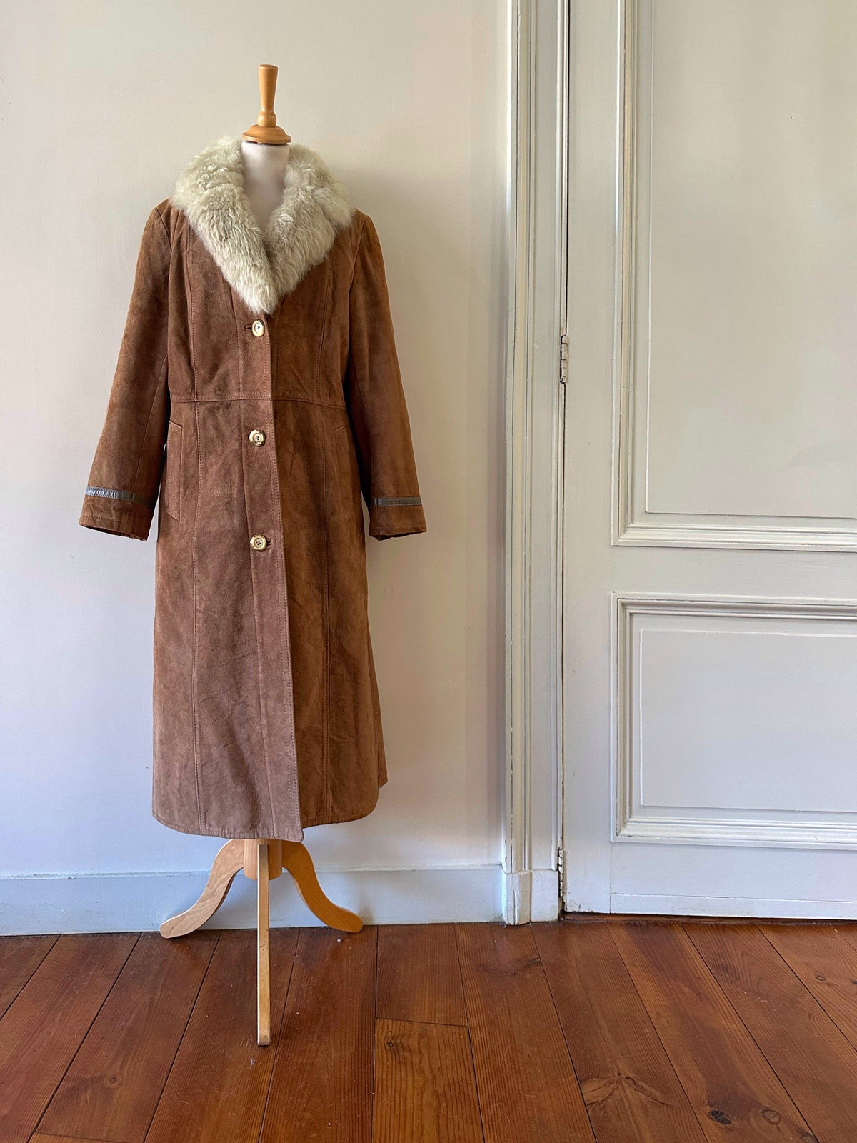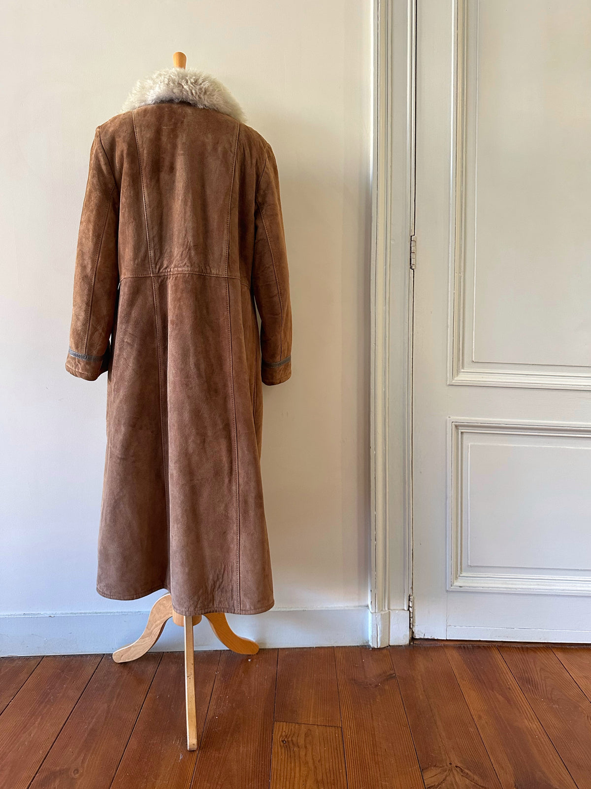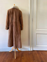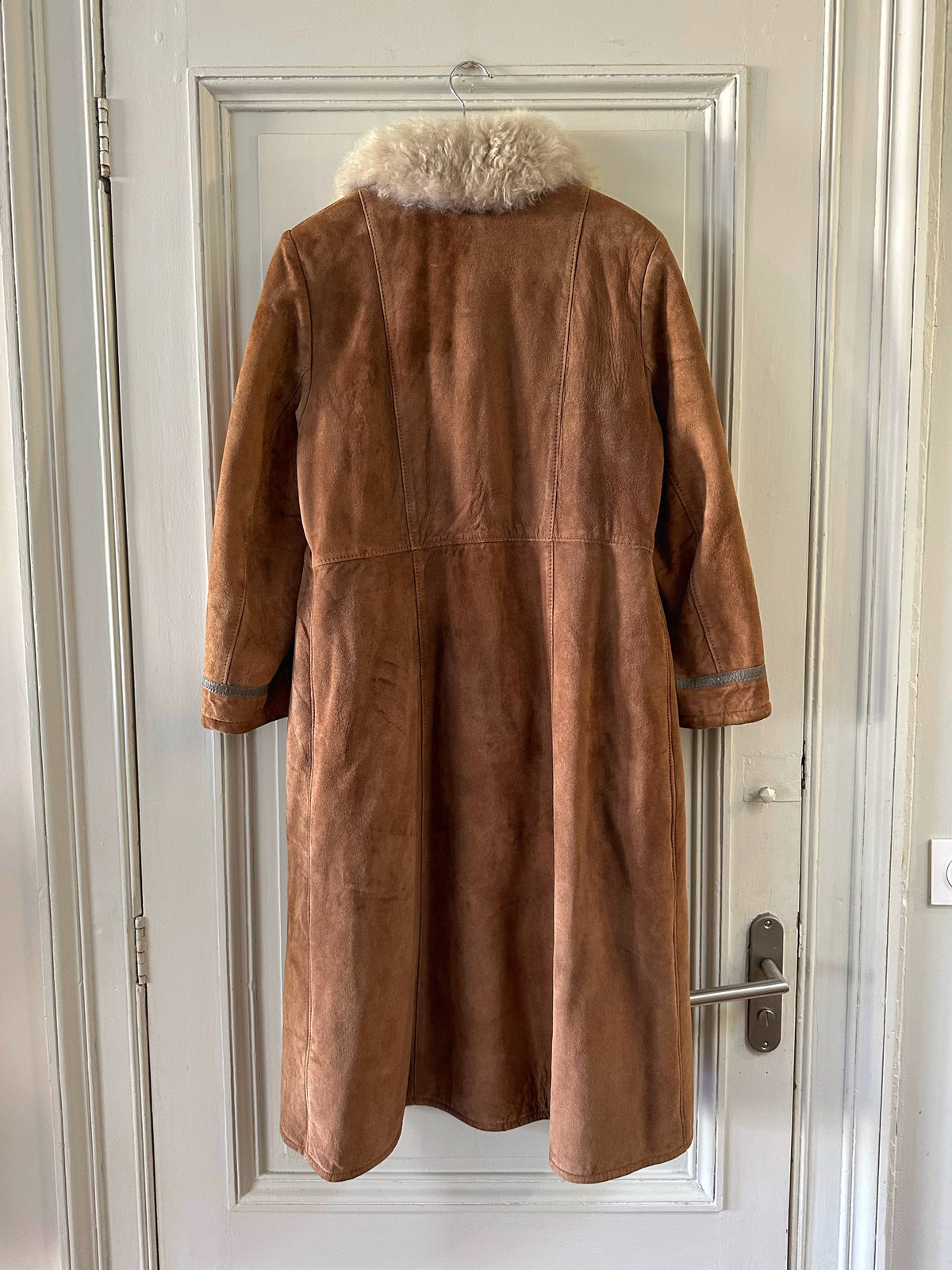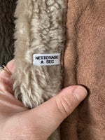 Prix unitaire parManteau Peau lainée en daim caramel ganses en cuir lisse camel, interieur fourré beige, col en laine de mouton poils longs, forme Pennylane long, Galerie Lafayette fabriqué en France dans les années 80s. Taille 36 porté ici sur un mannequin T36 et ouvert sur une personne T40. Aisselles 48cm Longueur 118cm.