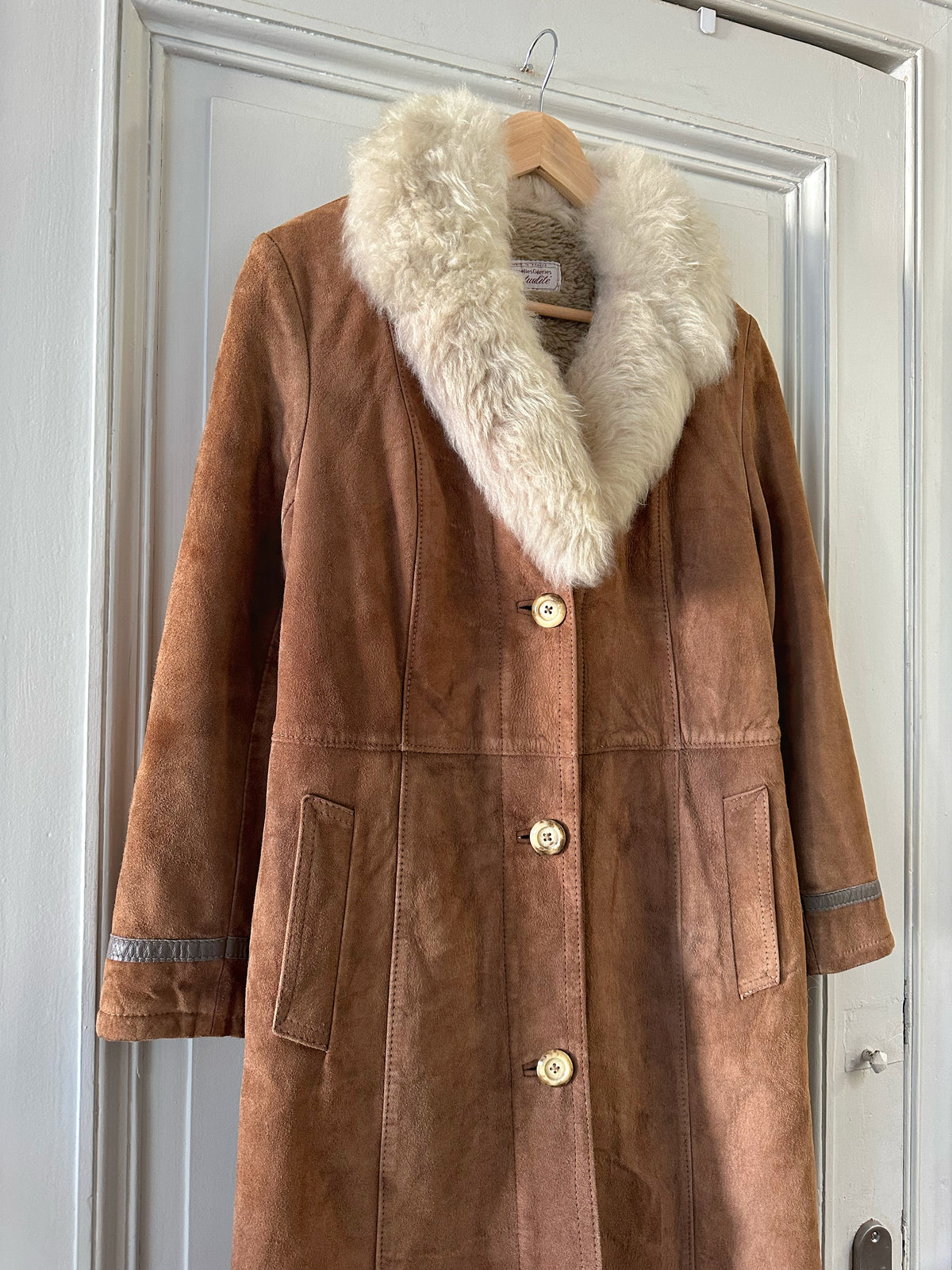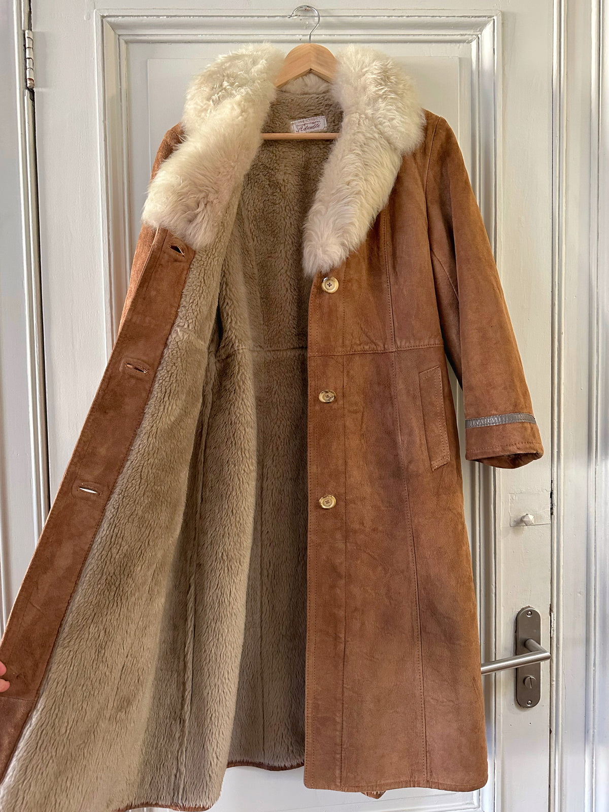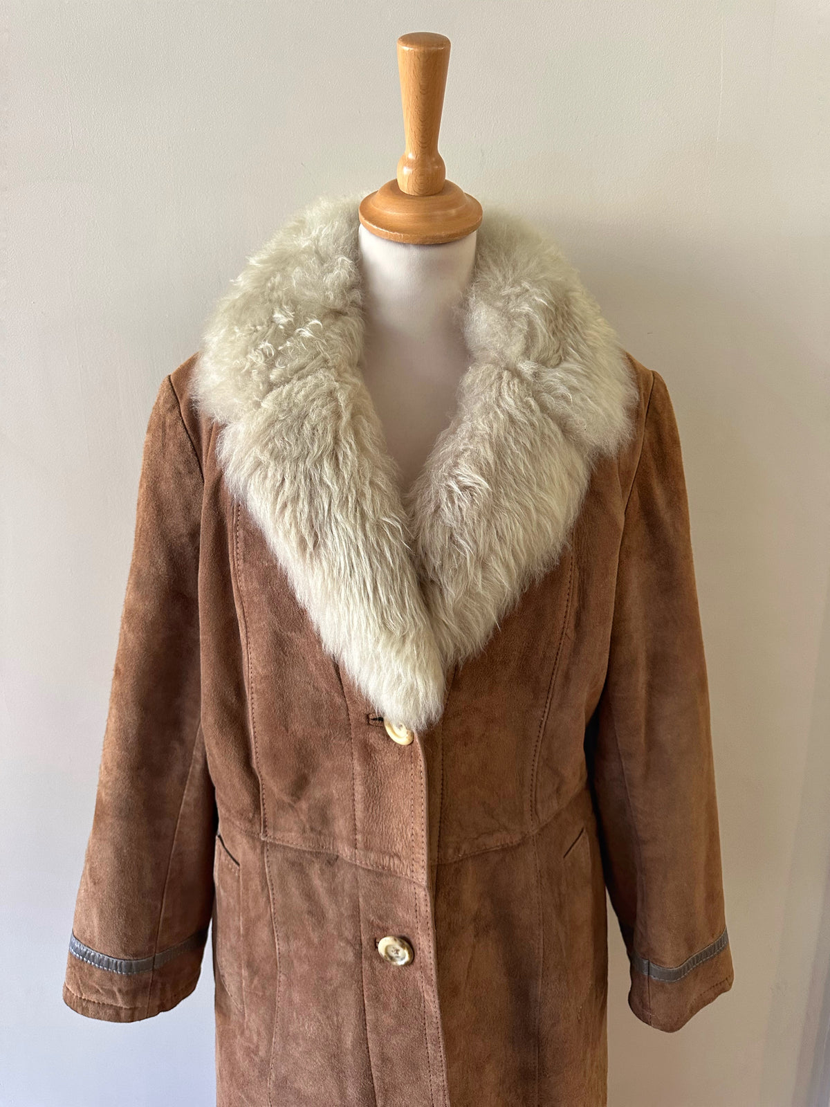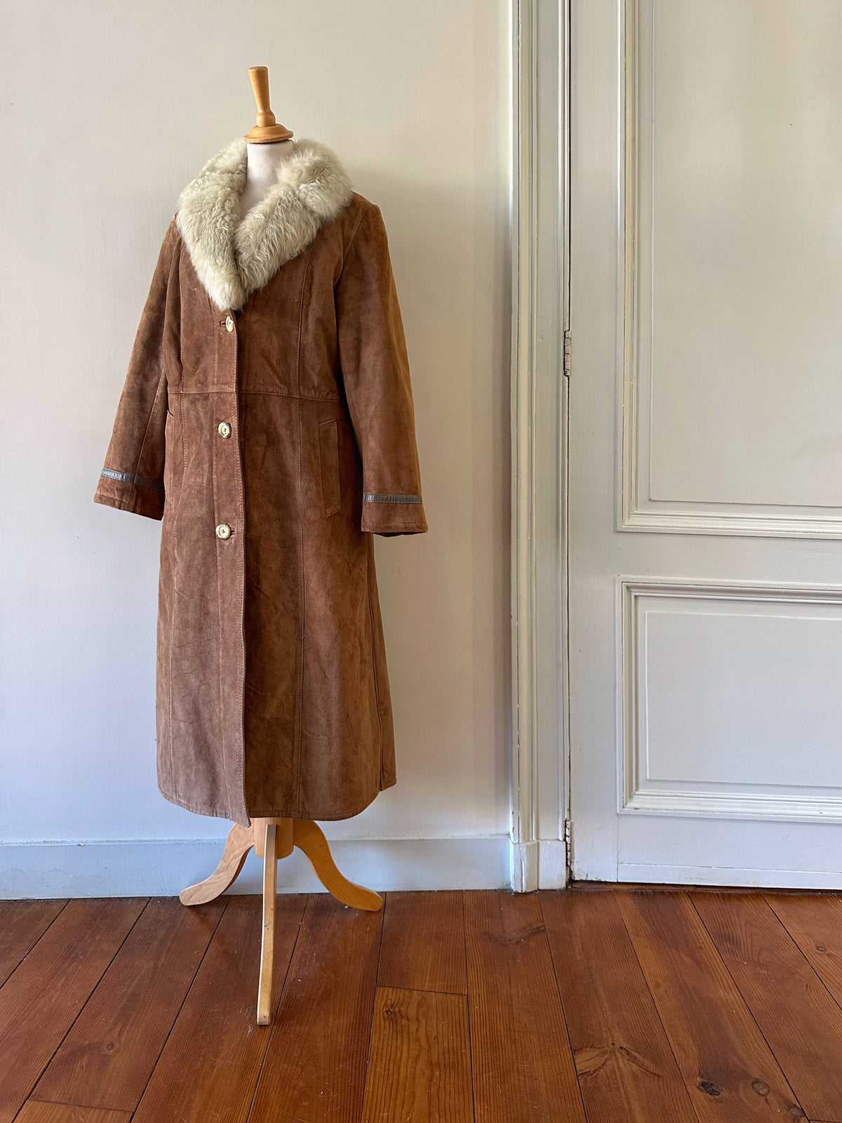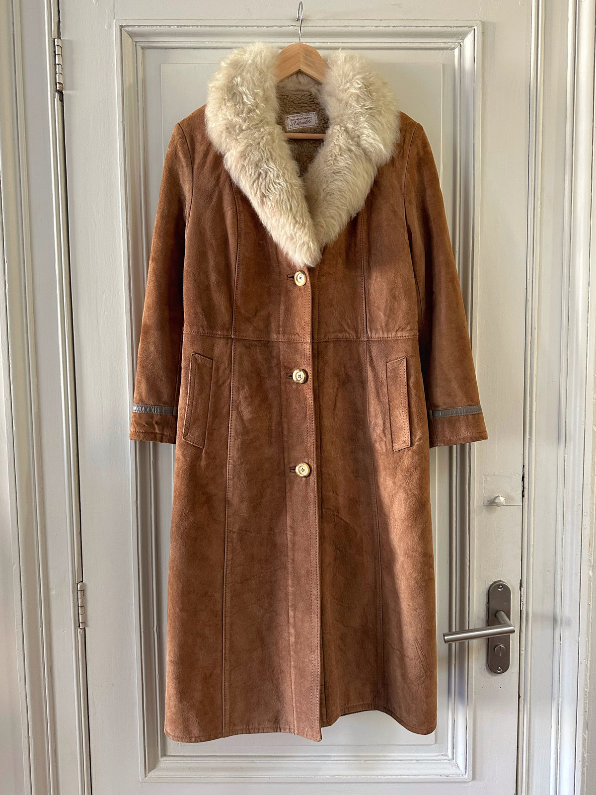 Prix unitaire parManteau Peau lainée en daim caramel ganses en cuir lisse camel, interieur fourré beige, col en laine de mouton poils longs, forme Pennylane long, Galerie Lafayette fabriqué en France dans les années 80s. Taille 36 porté ici sur un mannequin T36 et ouvert sur une personne T40. Aisselles 48cm Longueur 118cm.