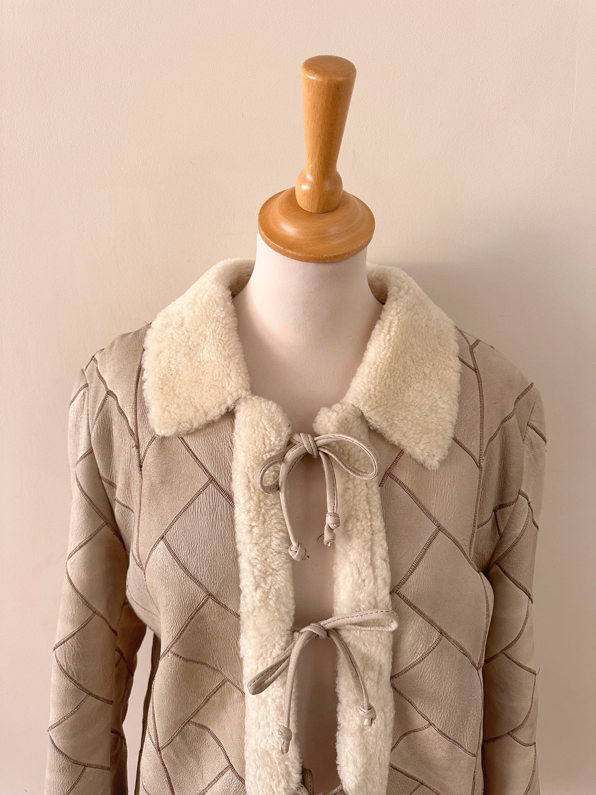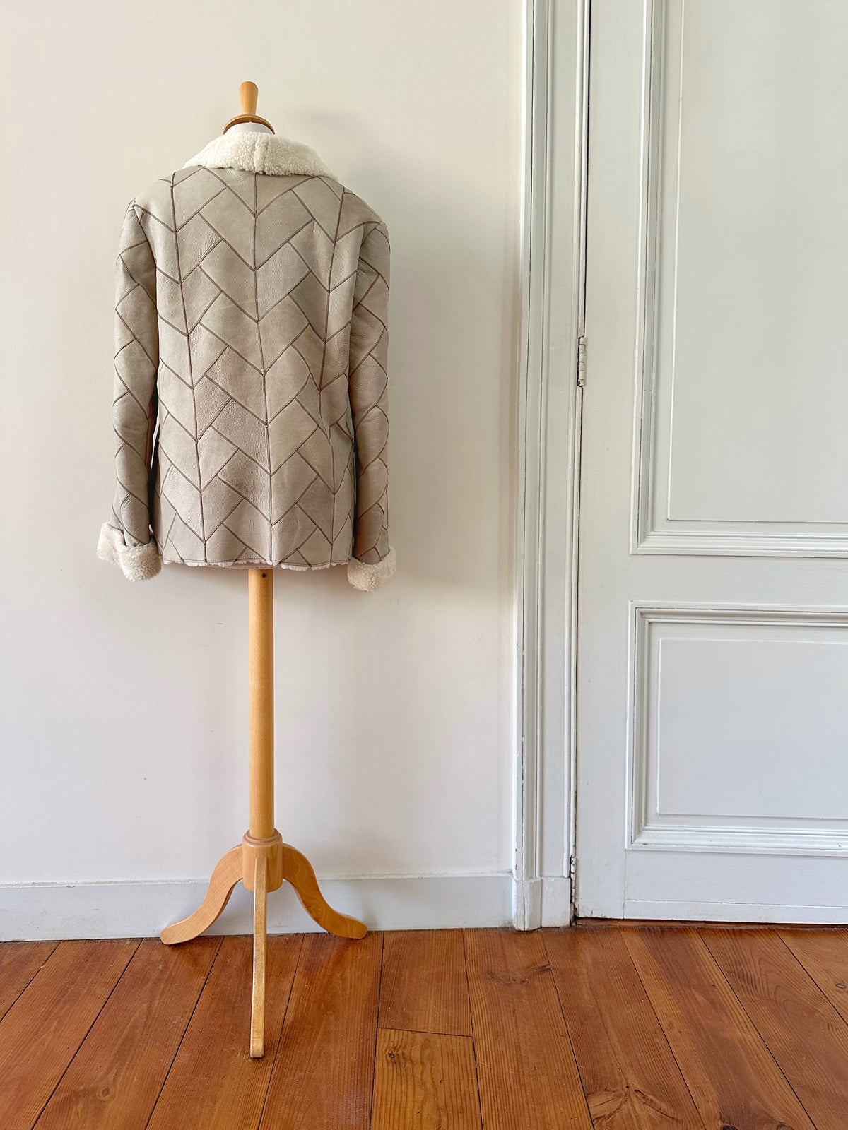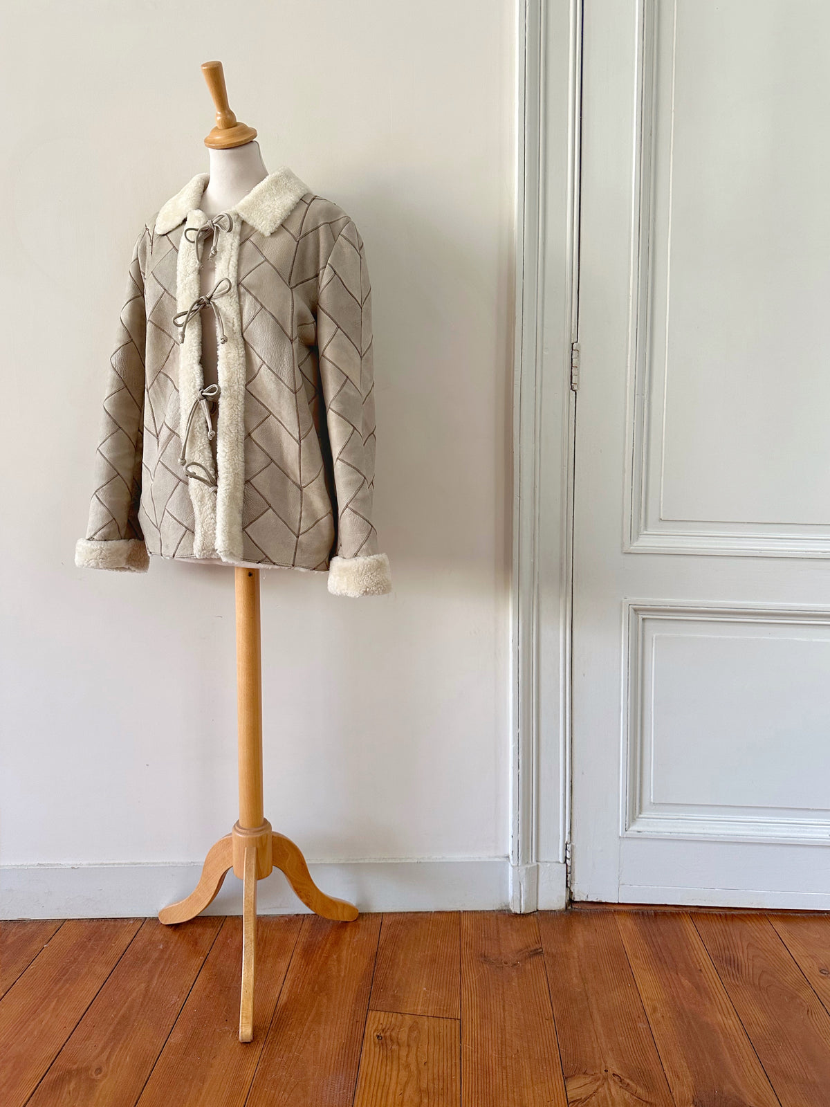 Manteau peau lainée, en patchwork de mouton retourné exterieur cuir beige, interieur en laine de mouton écru, fabriquée en Bulgarie, taille 36 porté ici sur un mannequin T36. Aisselles 45cm, longueur 68cm.