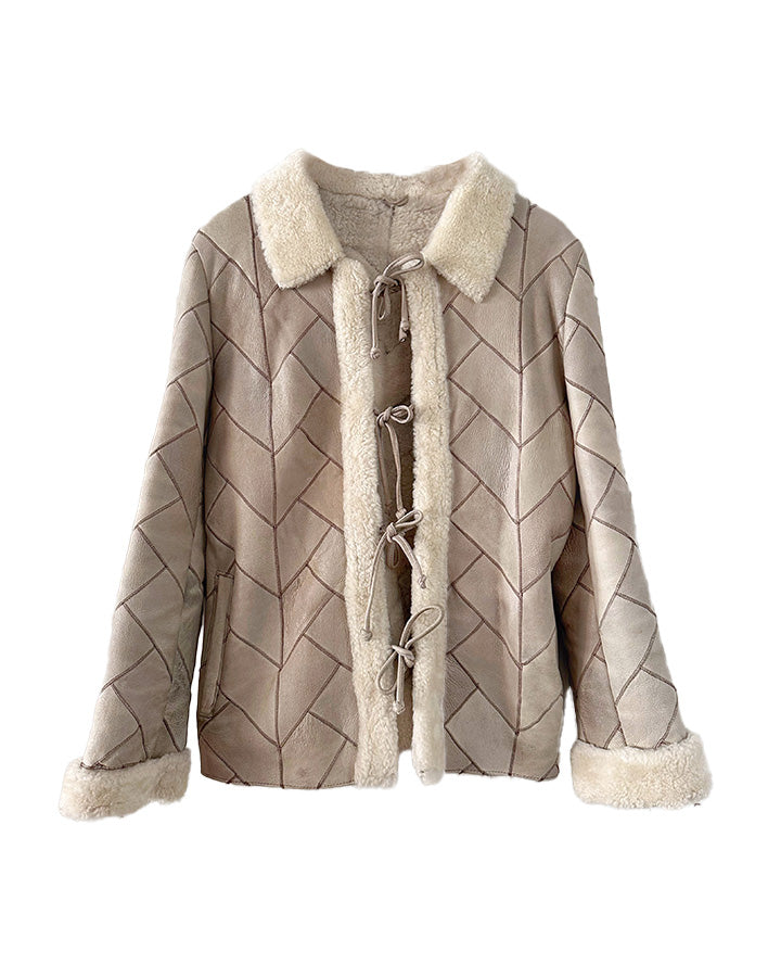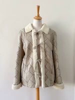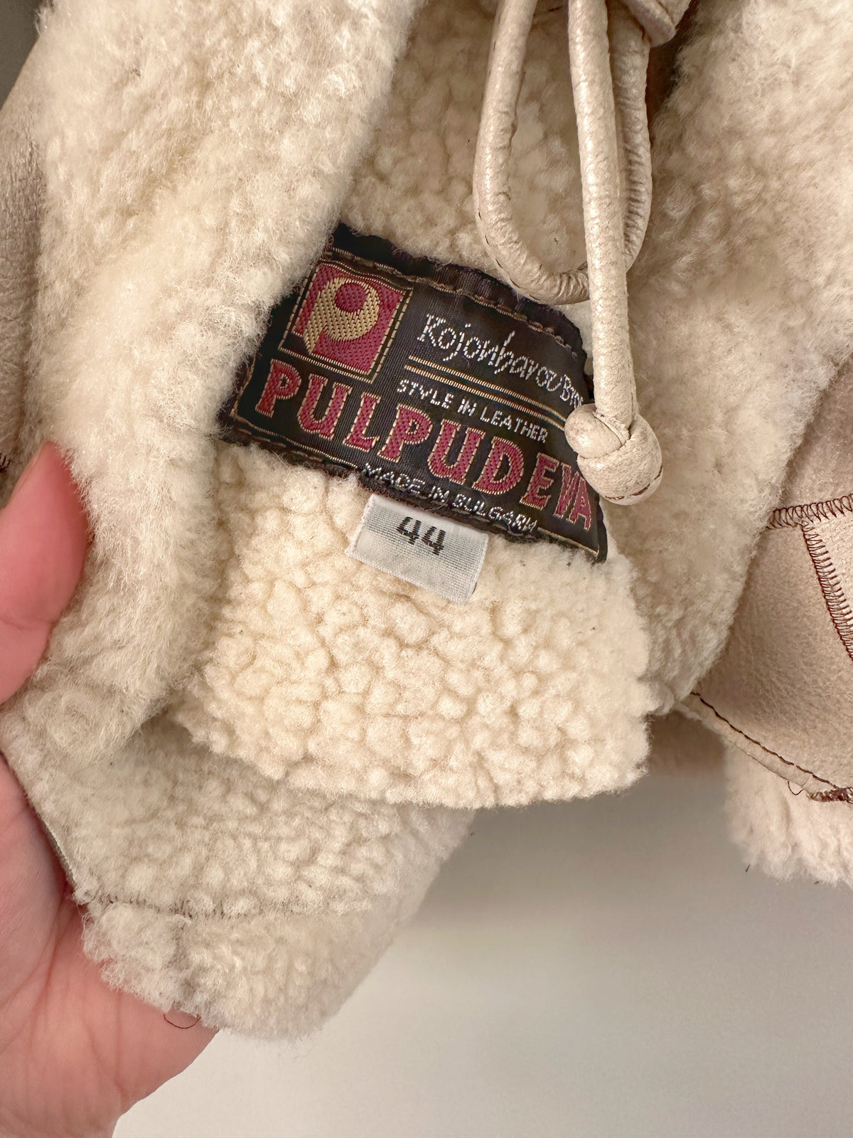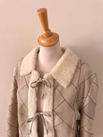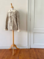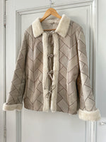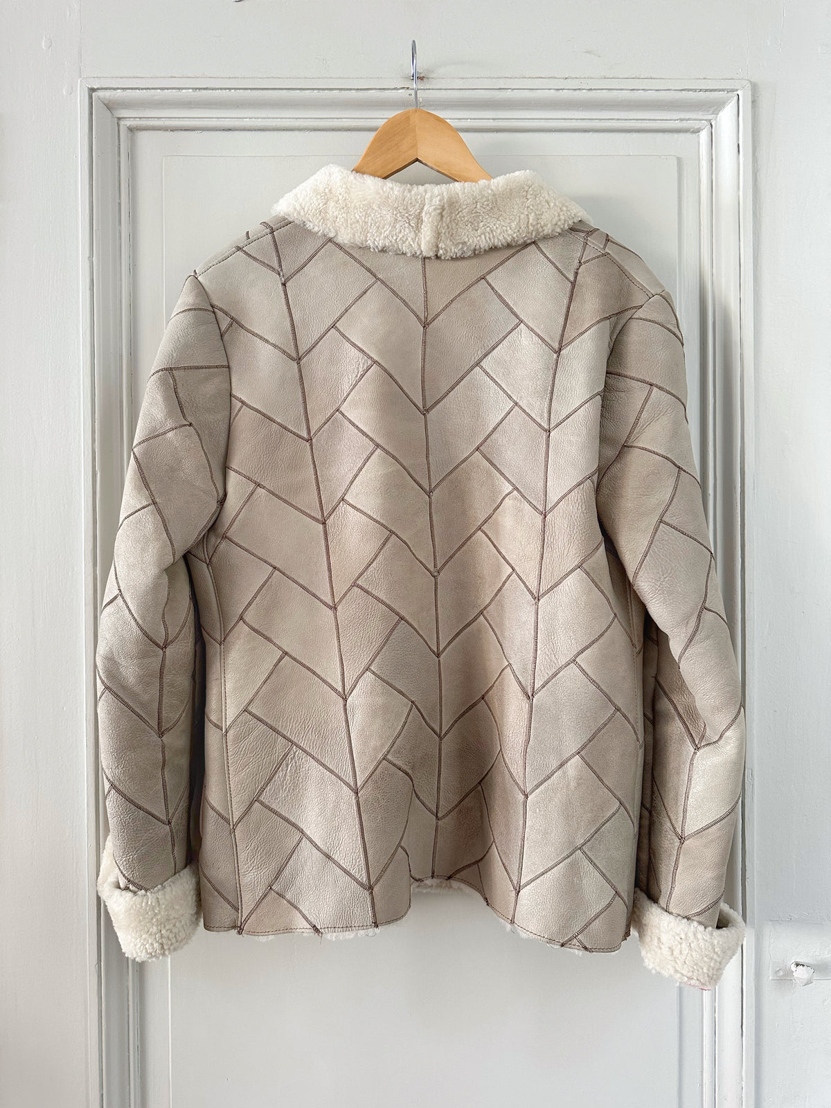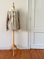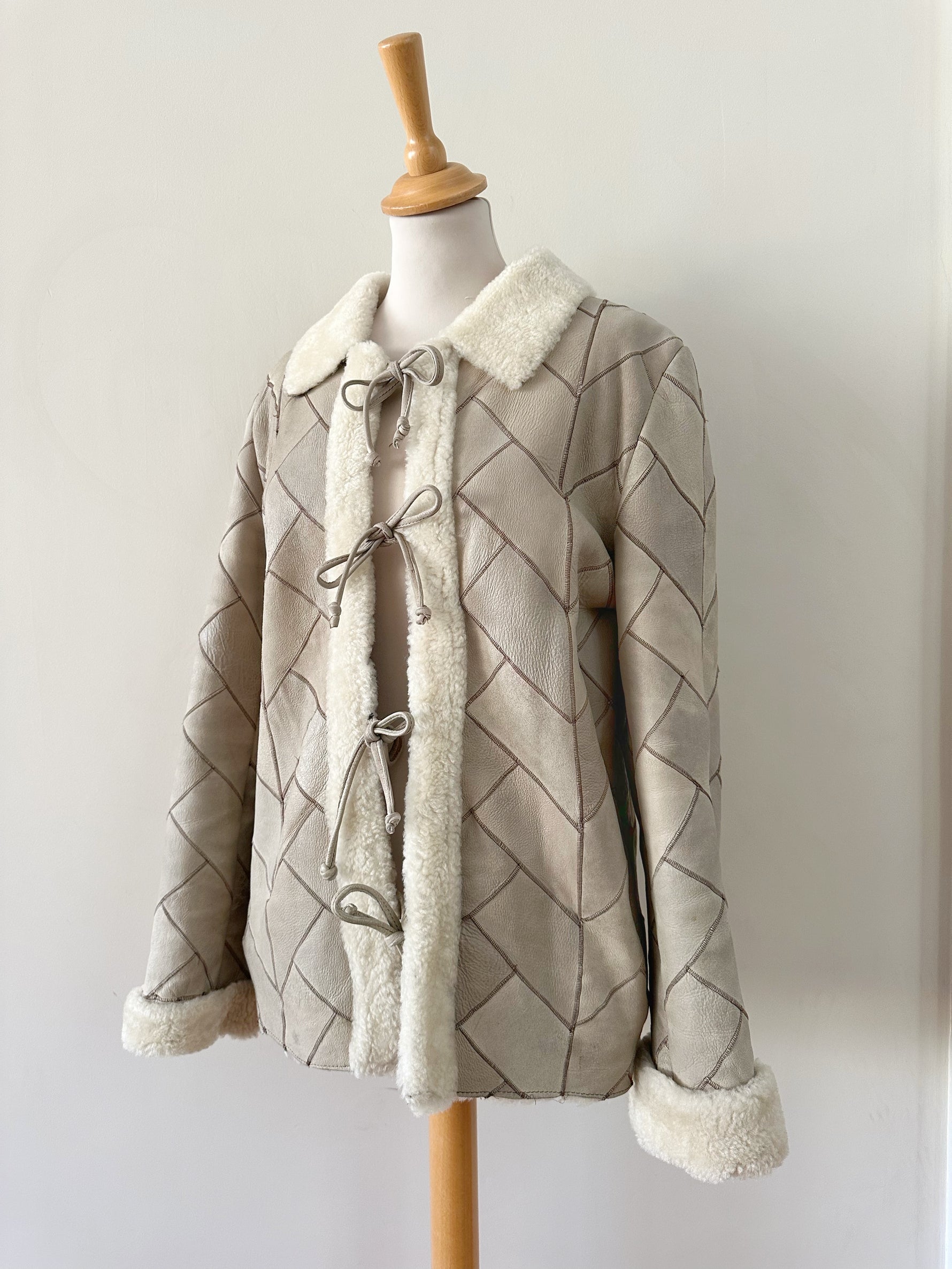 Manteau peau lainée, en patchwork de mouton retourné exterieur cuir beige, interieur en laine de mouton écru, fabriquée en Bulgarie, taille 36 porté ici sur un mannequin T36. Aisselles 45cm, longueur 68cm.