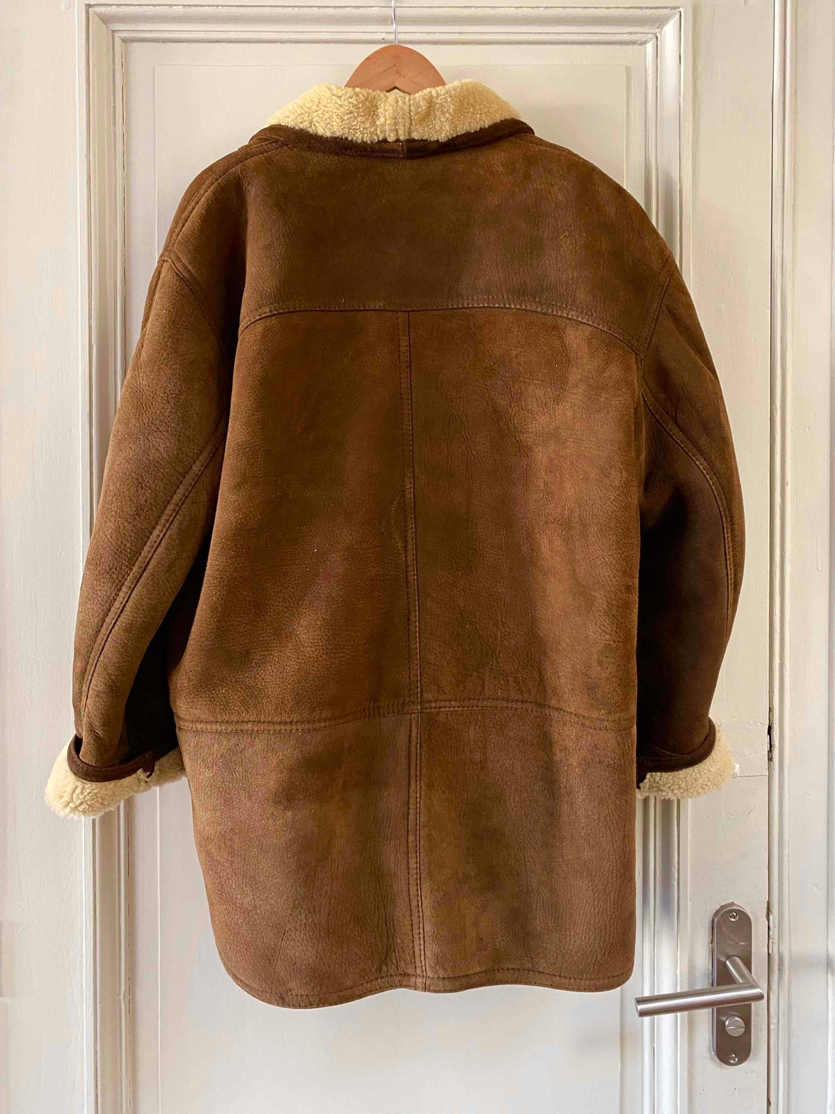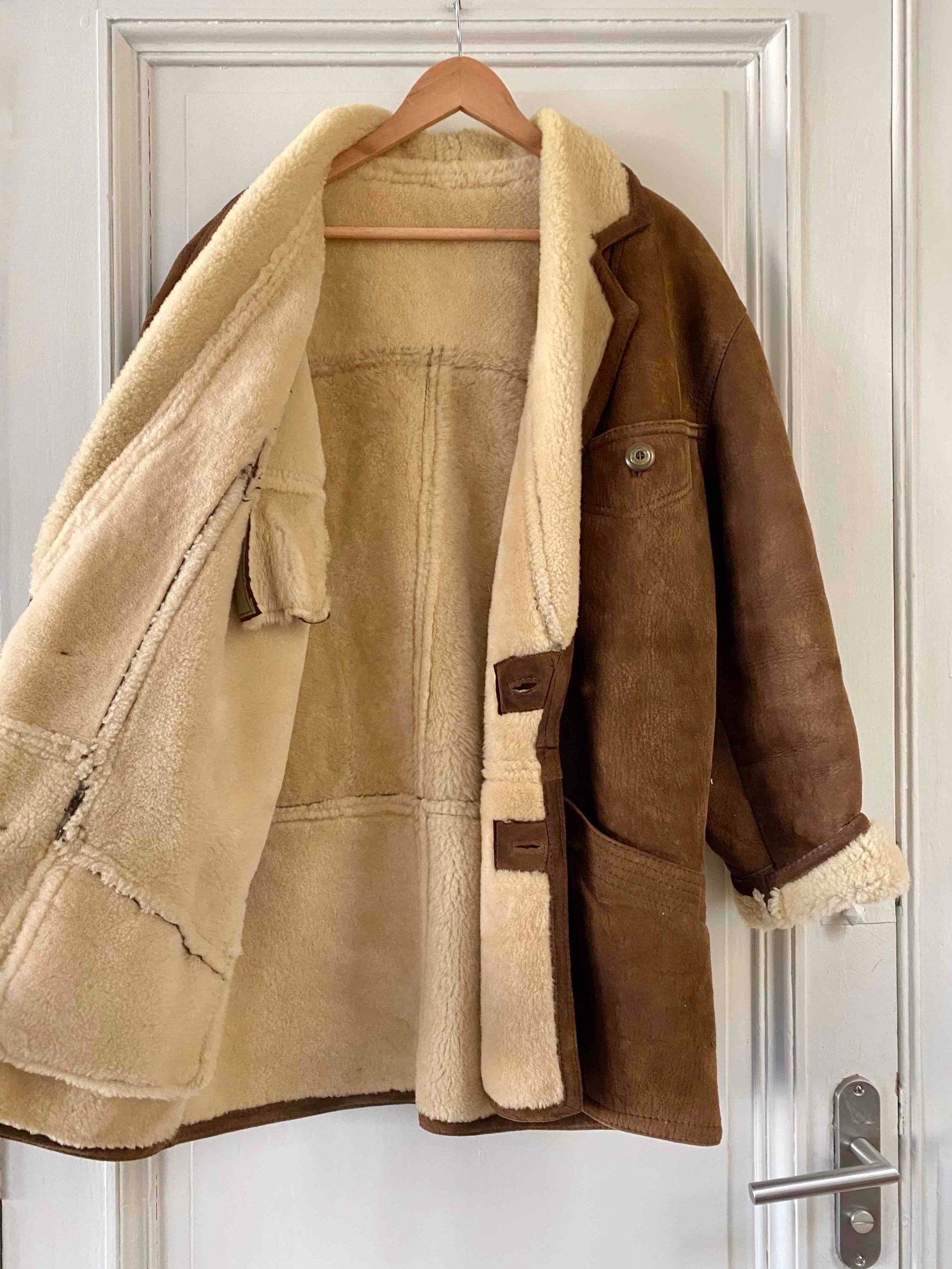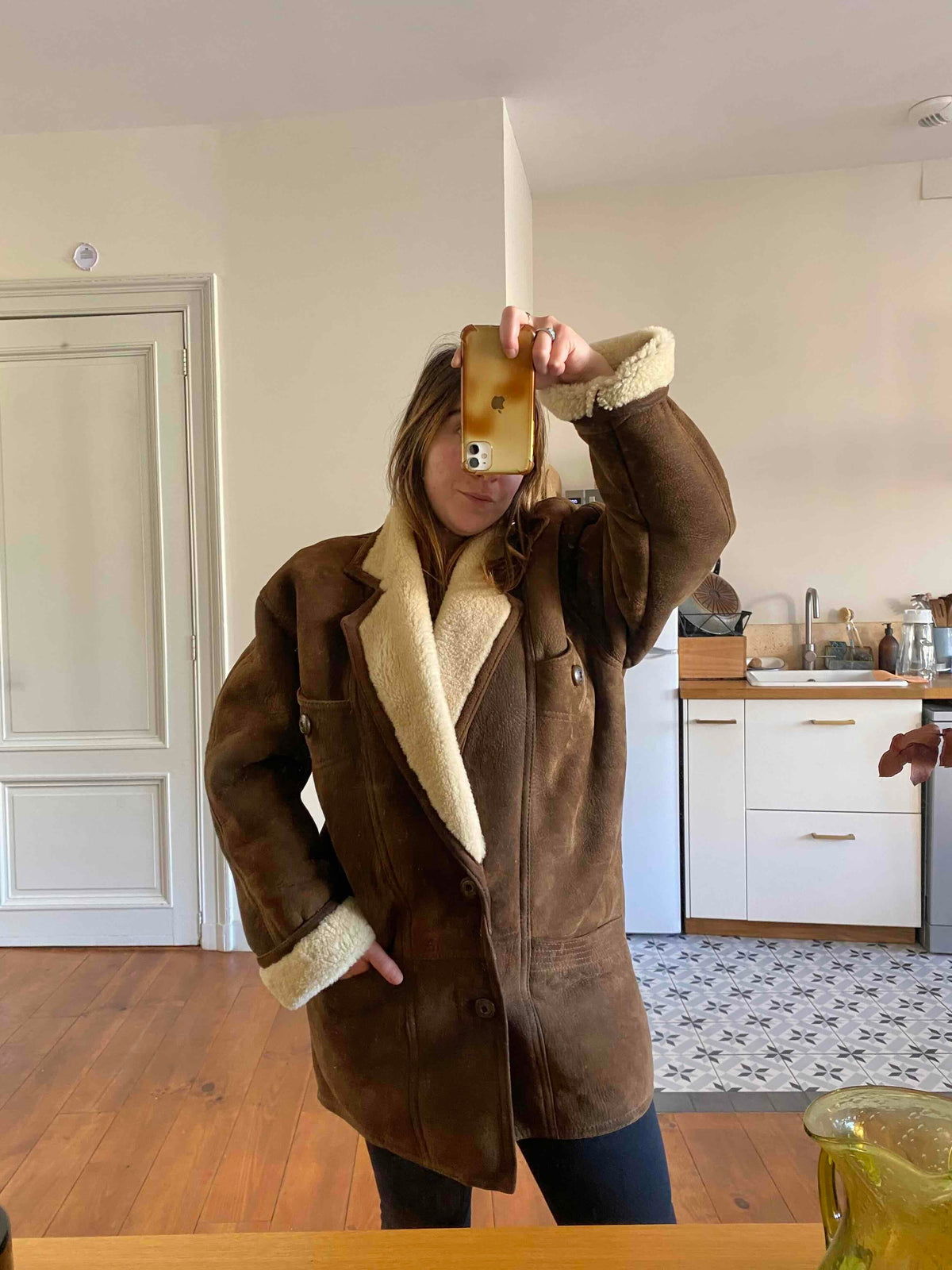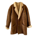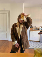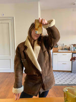 Prix unitaire parManteau peau lainée en mouton retourné extérieur cuir daim nubucké chocolat, intérieur mouton écru, grand col échancré mouton, boutonné, taille 40 porté ici sur une personne T40.