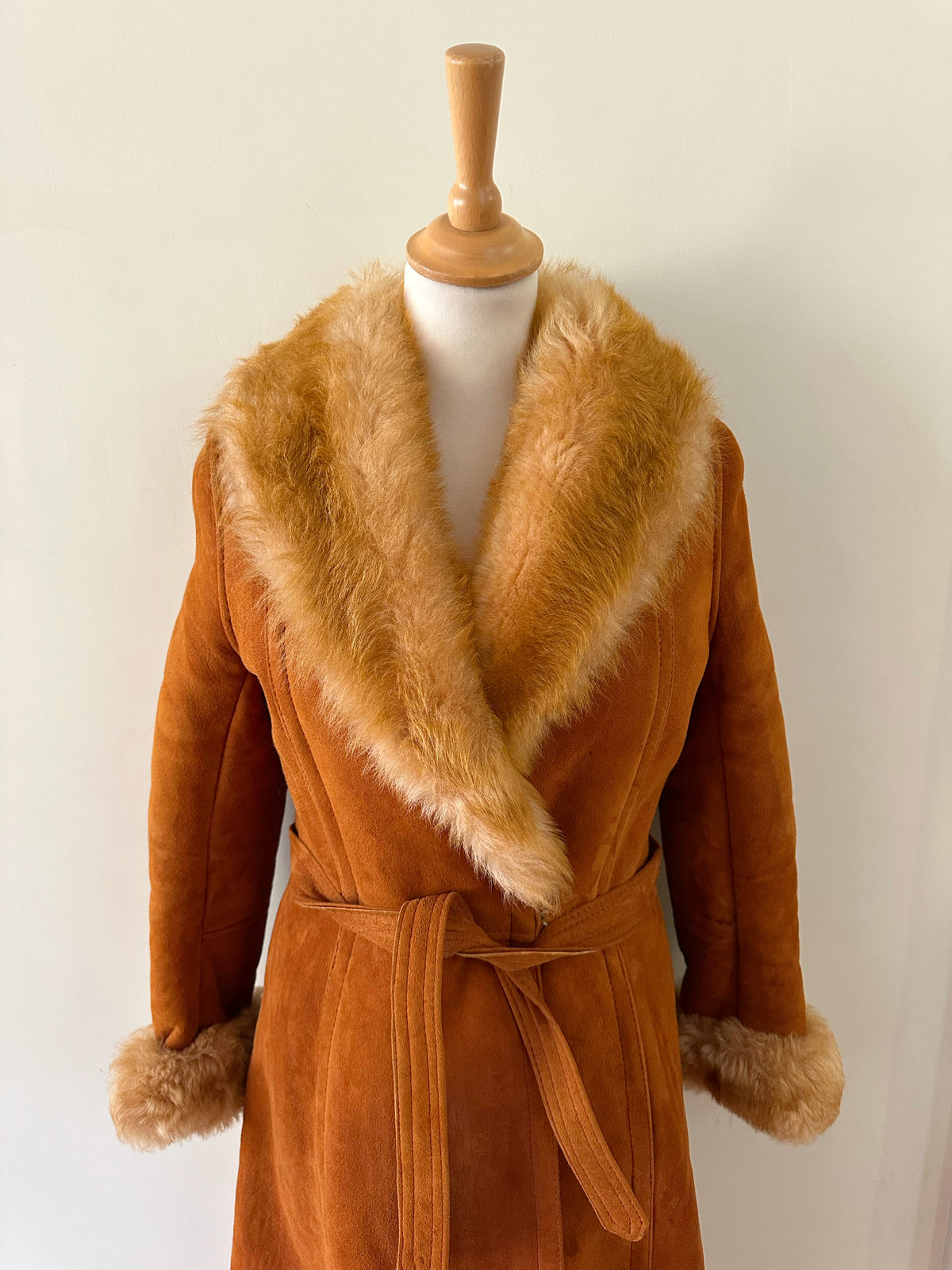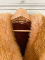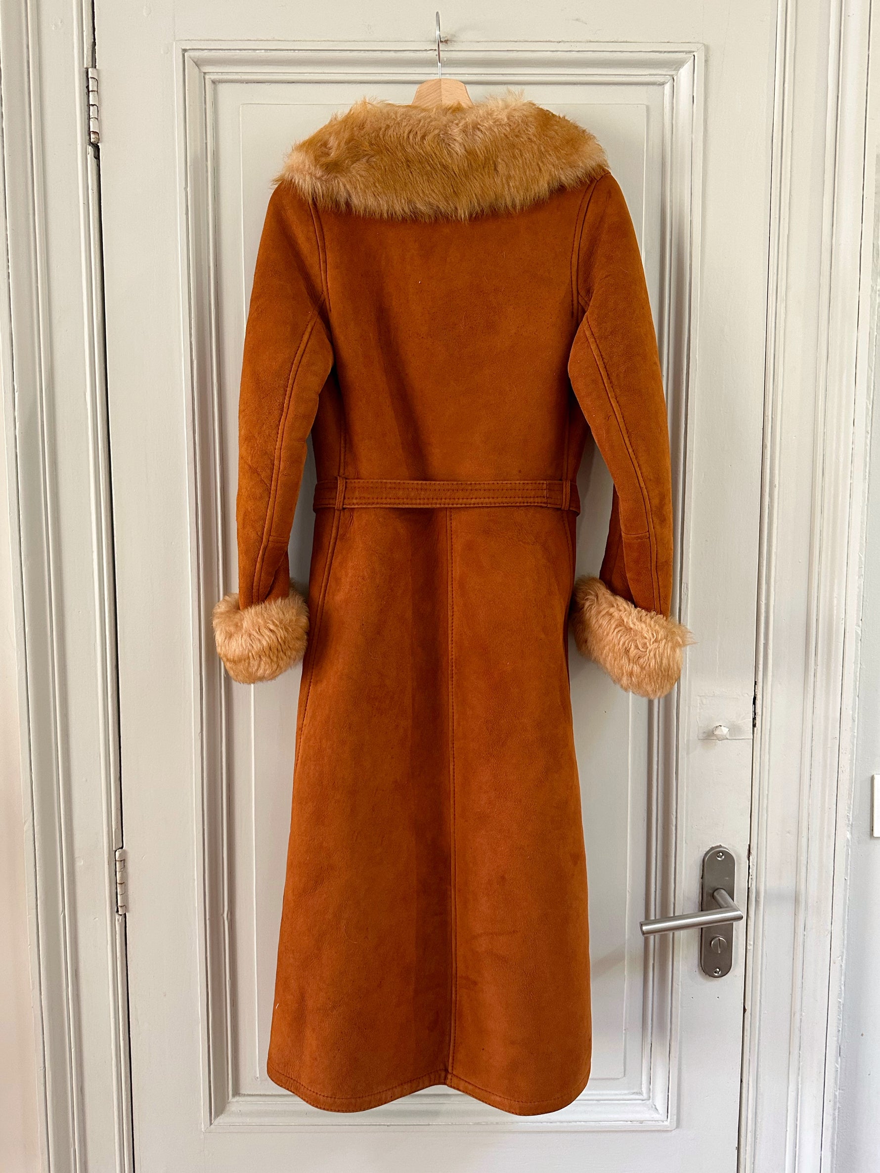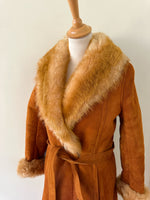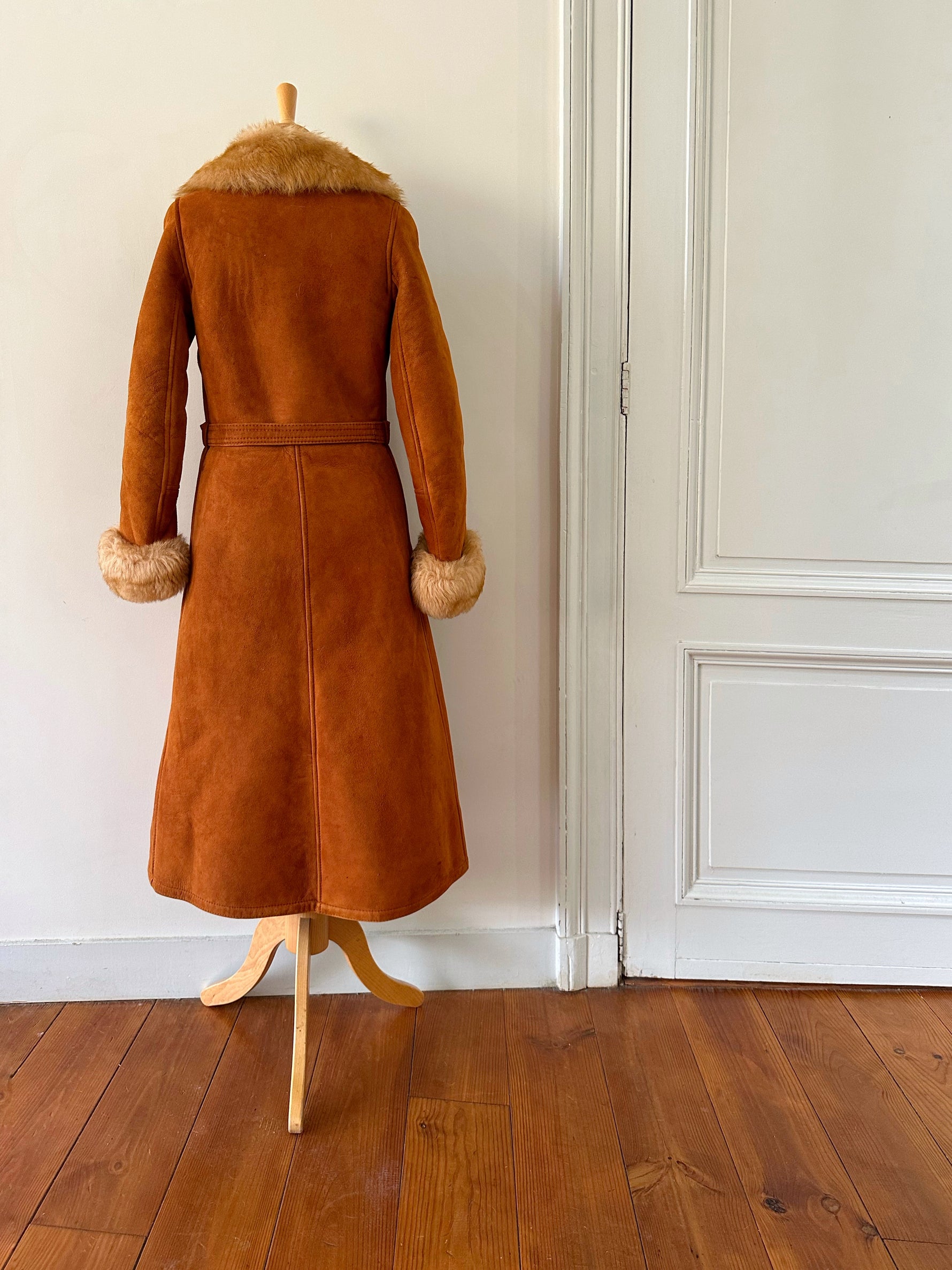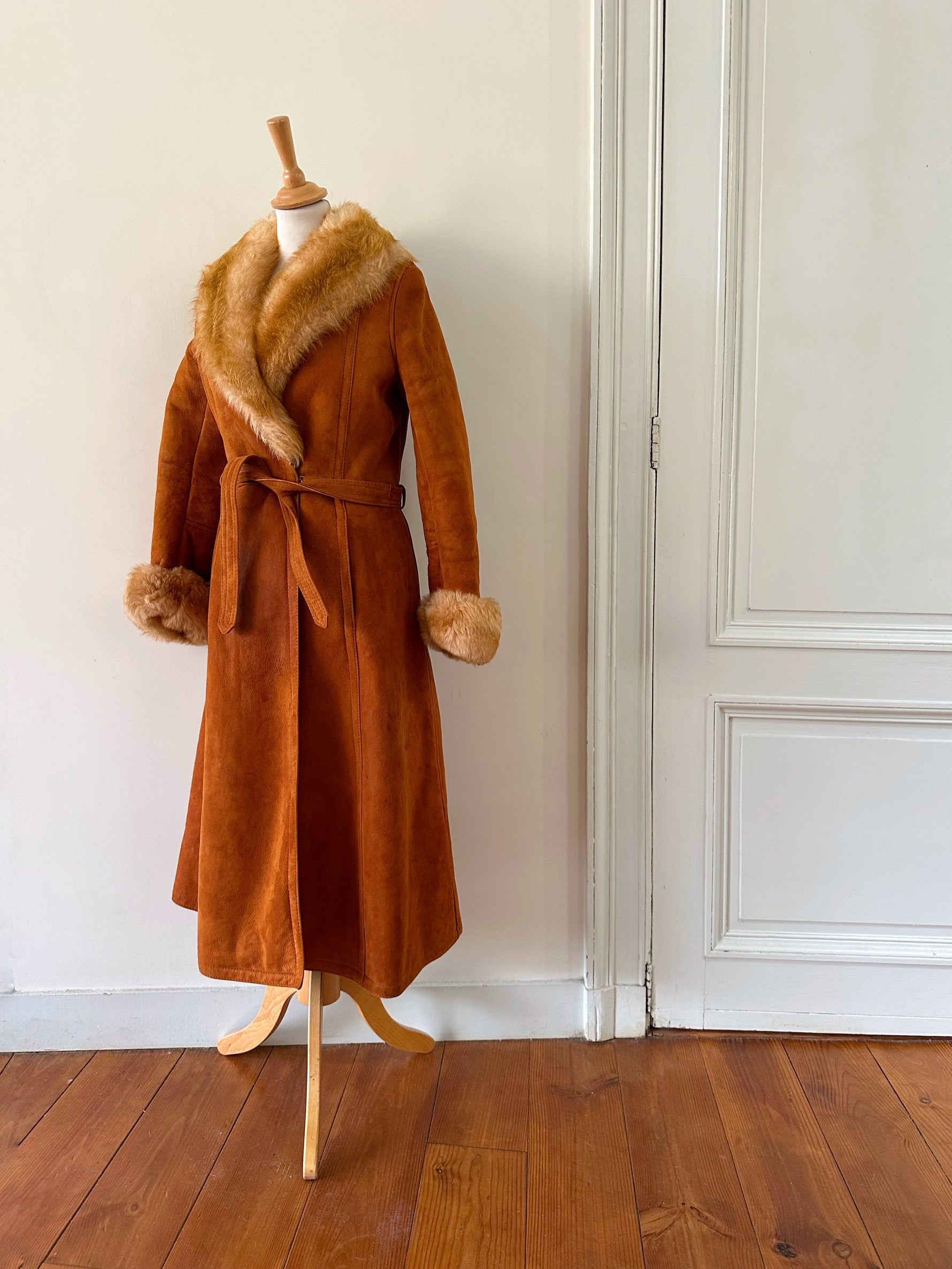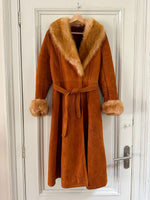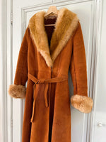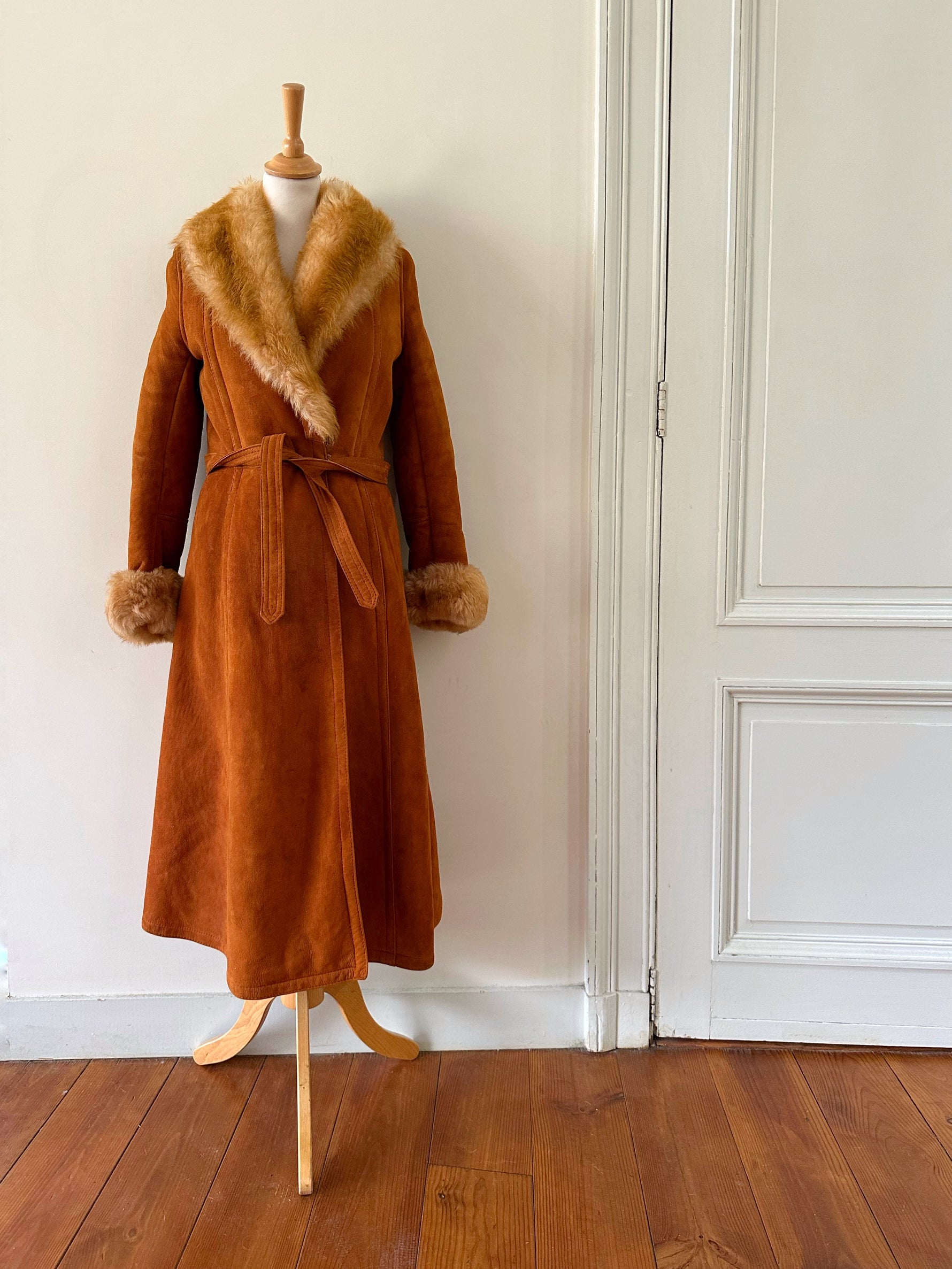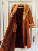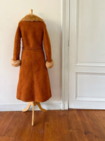 Manteau Pennylane en peau lainée, mouton retourné exterieur en daim fauve écureuil, interieur en laine de mouton chocolat, col et poignet en fourrure de mouton fauve et écru,fermeture croisée par un bouton interieur et agrafe exterieur, ceinture taille à nouer, fabriqué en France, taille 36 portée ici sur un mannequin T36. Epaules 36cm Aisselles 45cm Longueur 120cm.