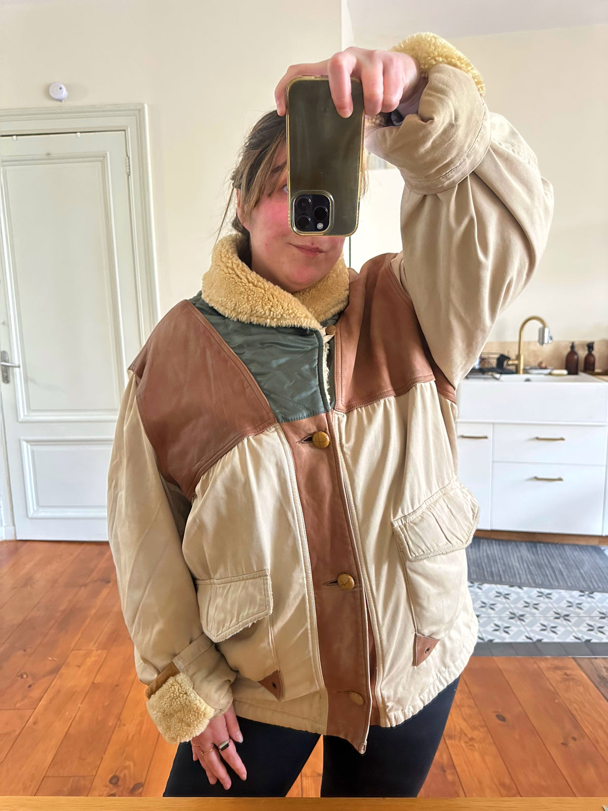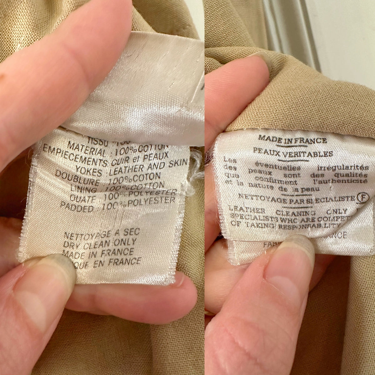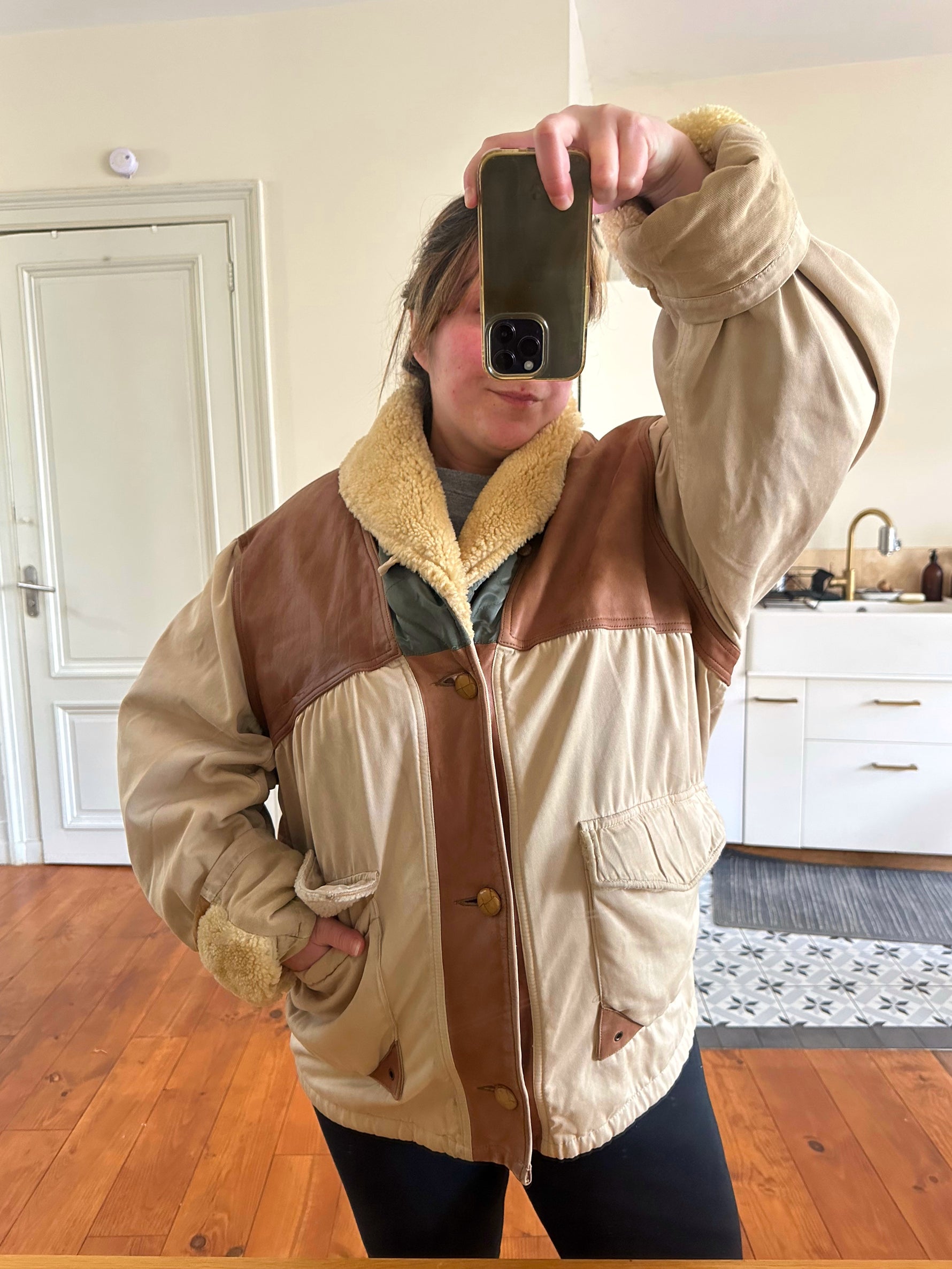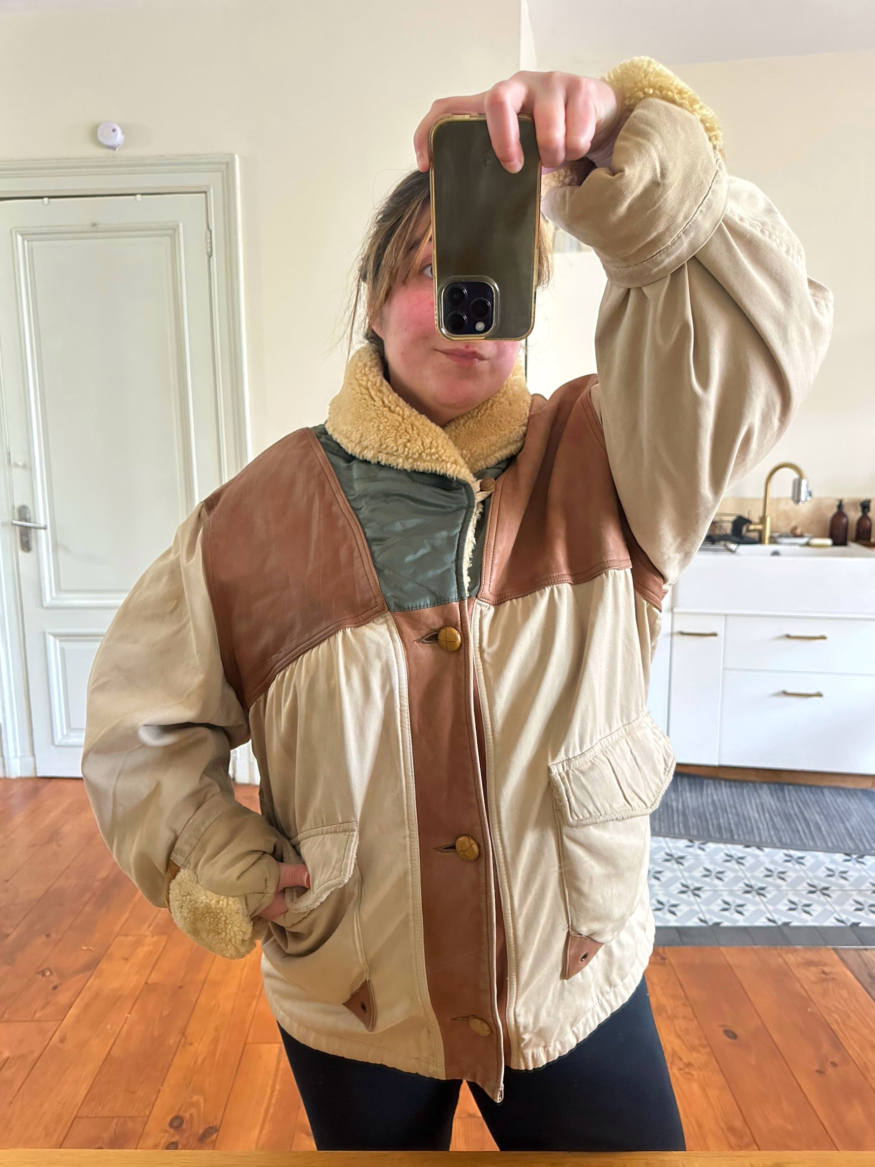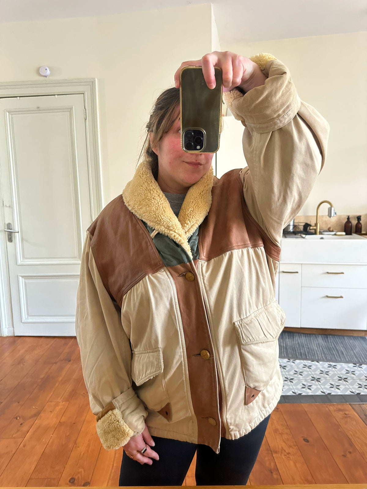Prix unitaire parPeau lainée Chevignon en toile de coton beige et vert tilleul. Col et poignet en mouton retourné, empiècements en cuir caramel. Intérieur ouatiné matelassé. Fabriqué en France, Convient aux tailles 40 et 42, porté ici sur une personne T40. Longueur 78cm. Quelques marques d'usures sur le bords des poches.