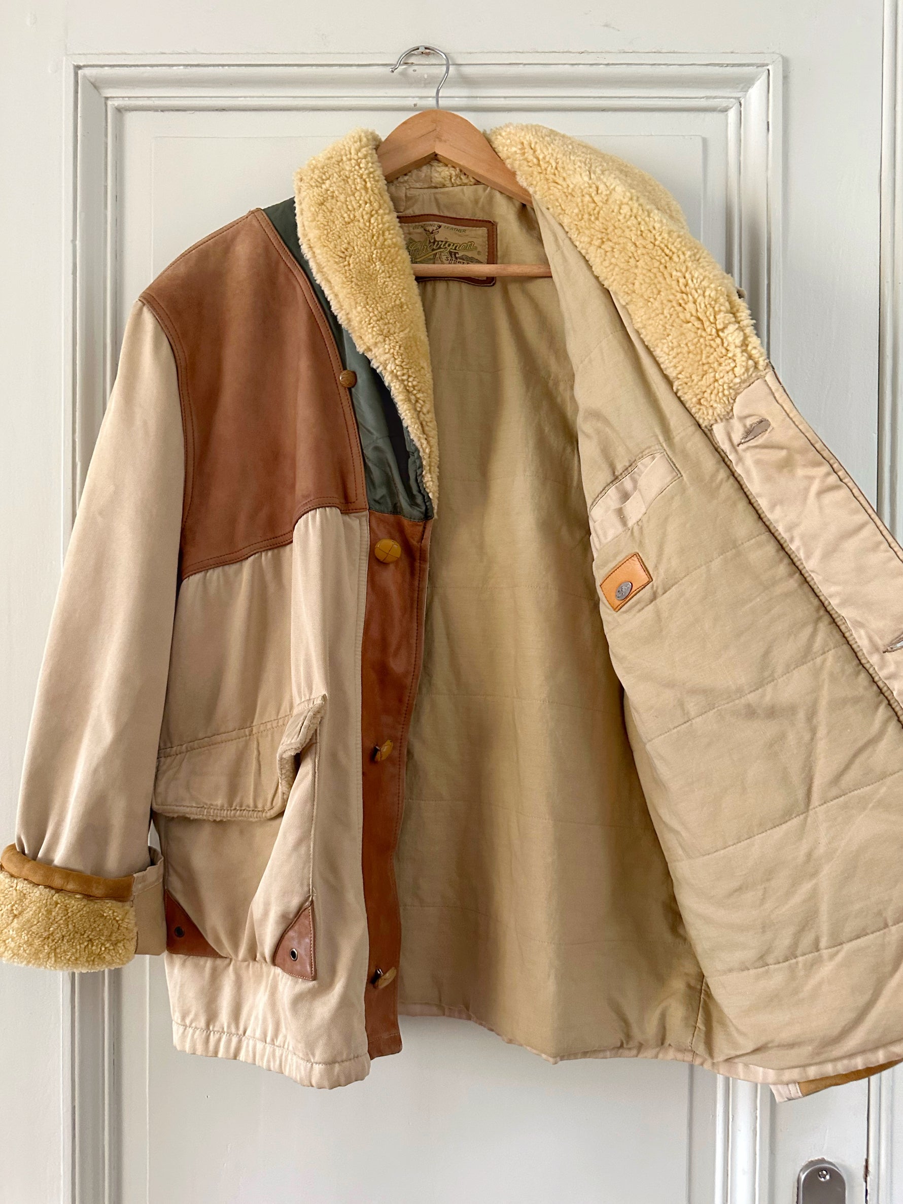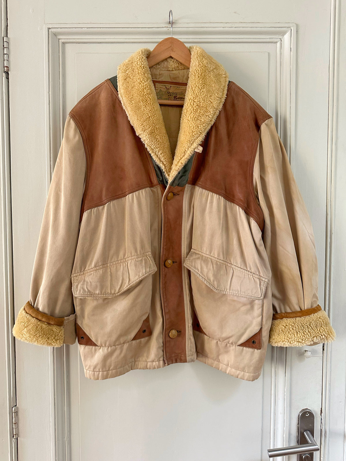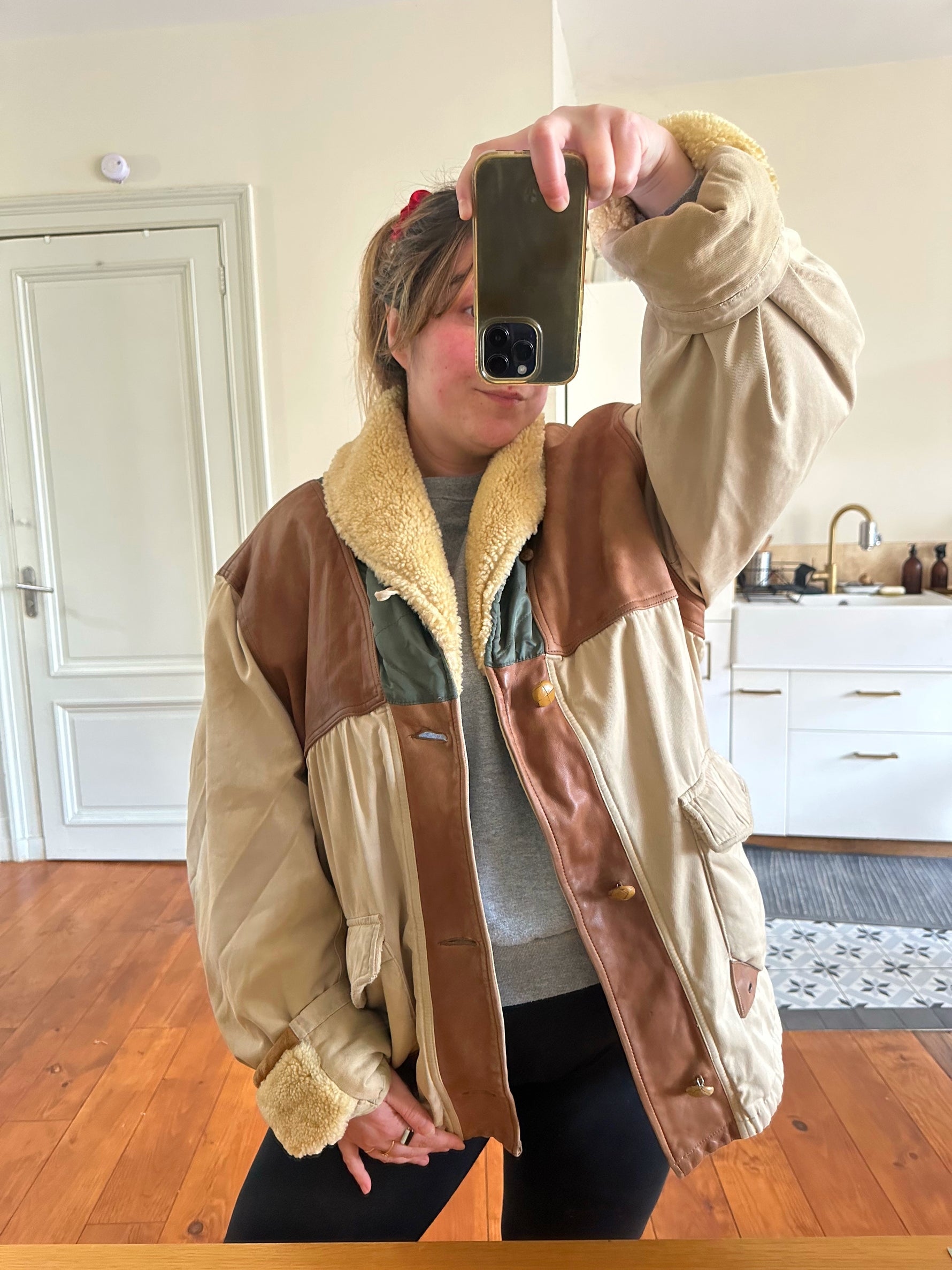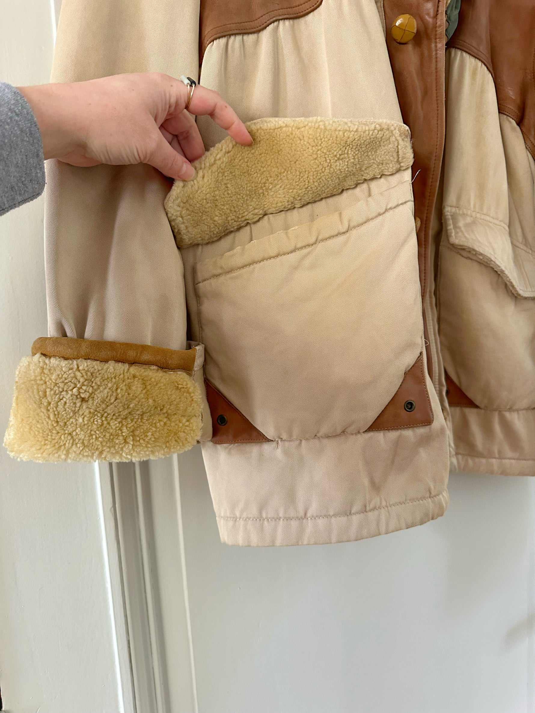 Prix unitaire parPeau lainée Chevignon en toile de coton beige et vert tilleul. Col et poignet en mouton retourné, empiècements en cuir caramel. Intérieur ouatiné matelassé. Fabriqué en France, Convient aux tailles 40 et 42, porté ici sur une personne T40. Longueur 78cm. Quelques marques d'usures sur le bords des poches.
