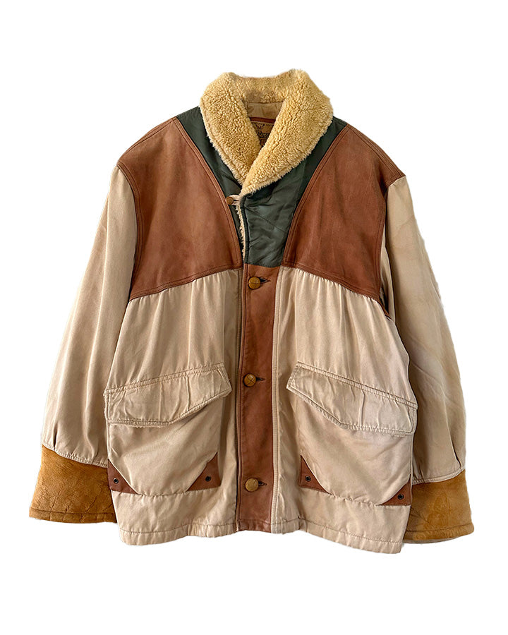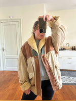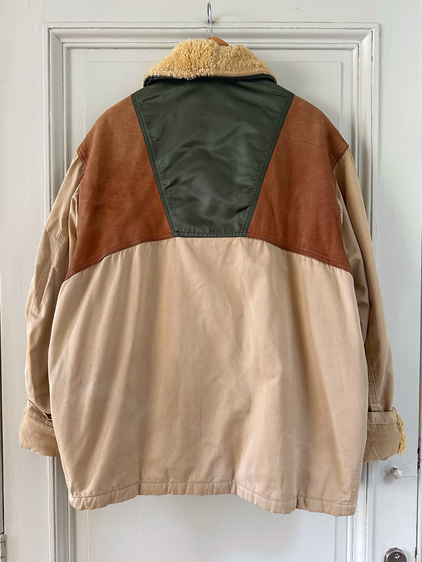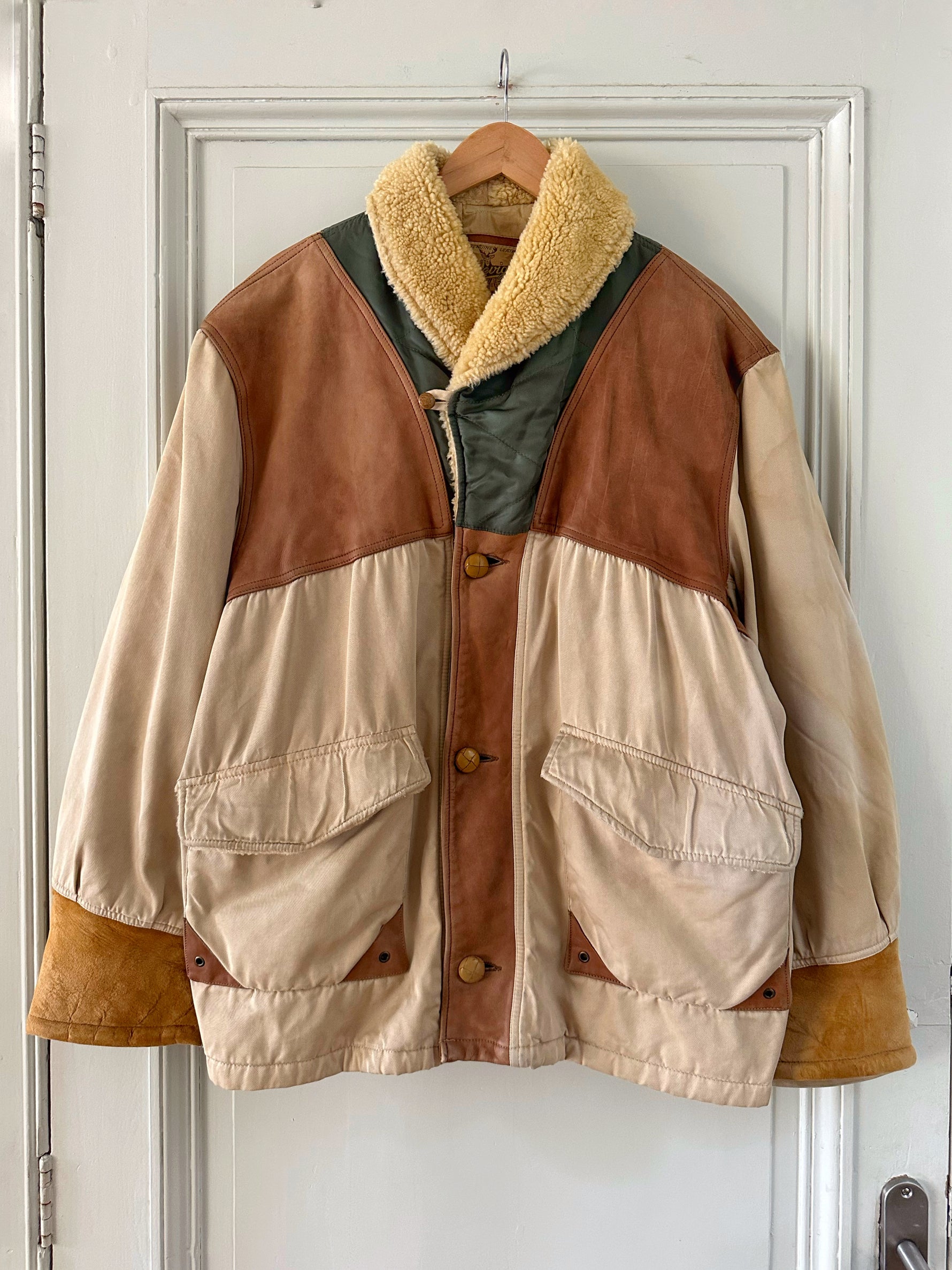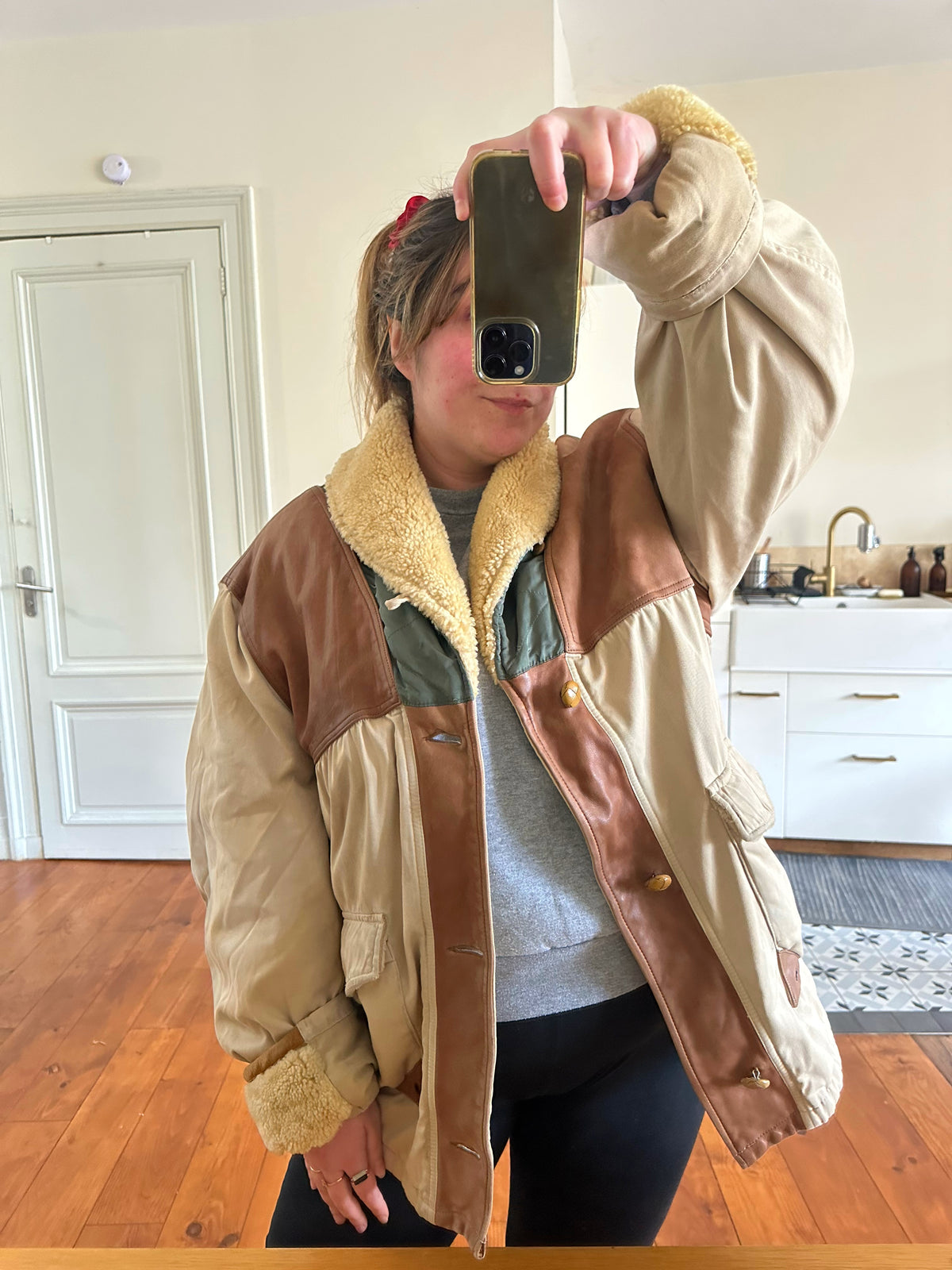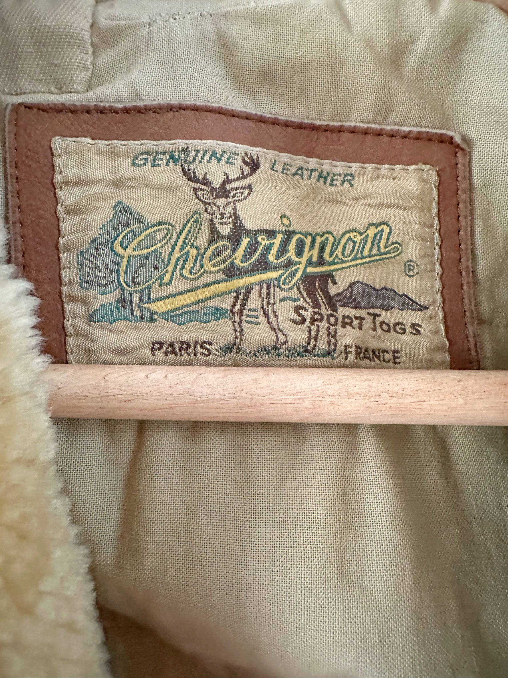 Prix unitaire parPeau lainée Chevignon en toile de coton beige et vert tilleul. Col et poignet en mouton retourné, empiècements en cuir caramel. Intérieur ouatiné matelassé. Fabriqué en France, Convient aux tailles 40 et 42, porté ici sur une personne T40. Longueur 78cm. Quelques marques d'usures sur le bords des poches.