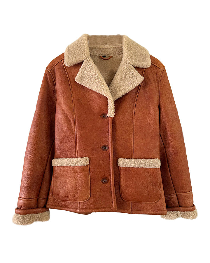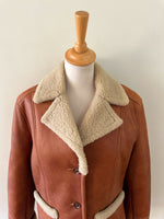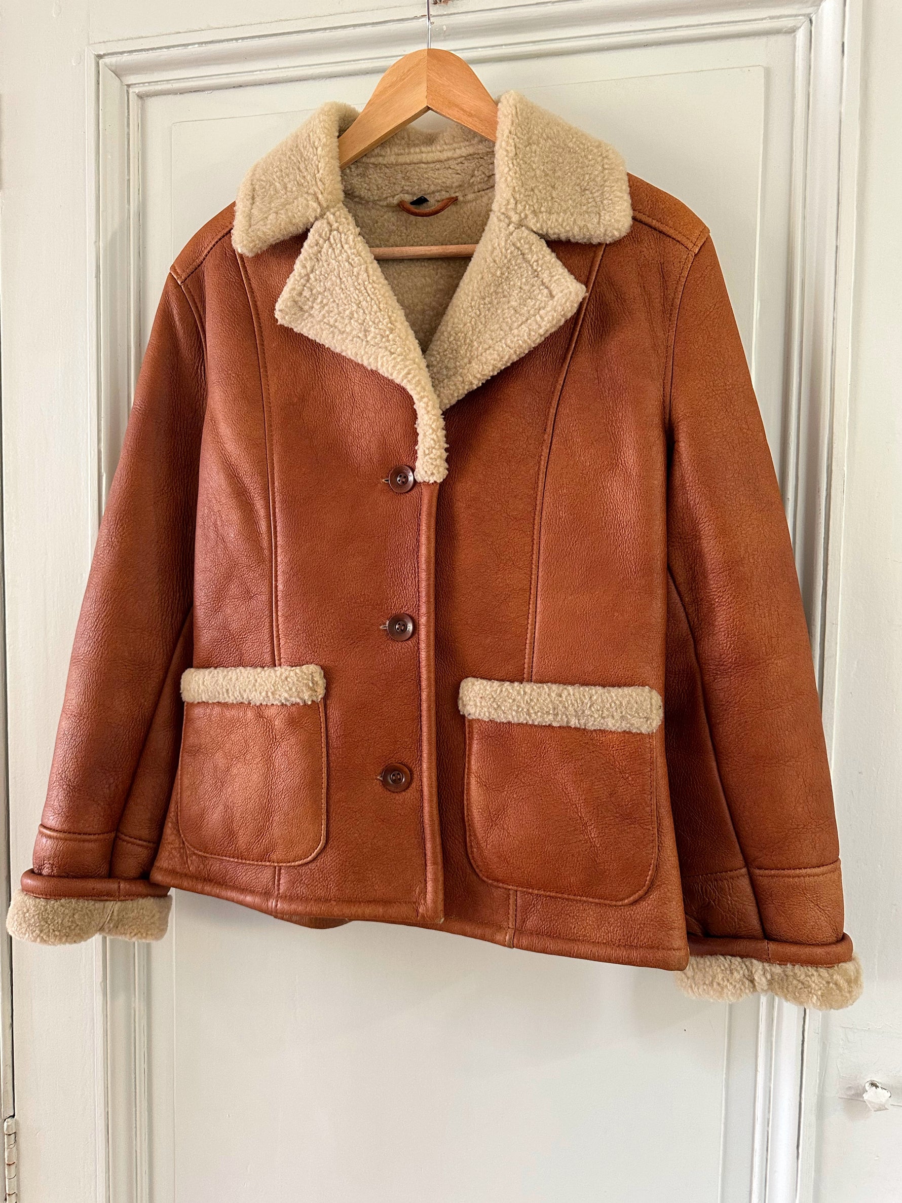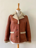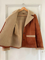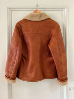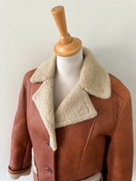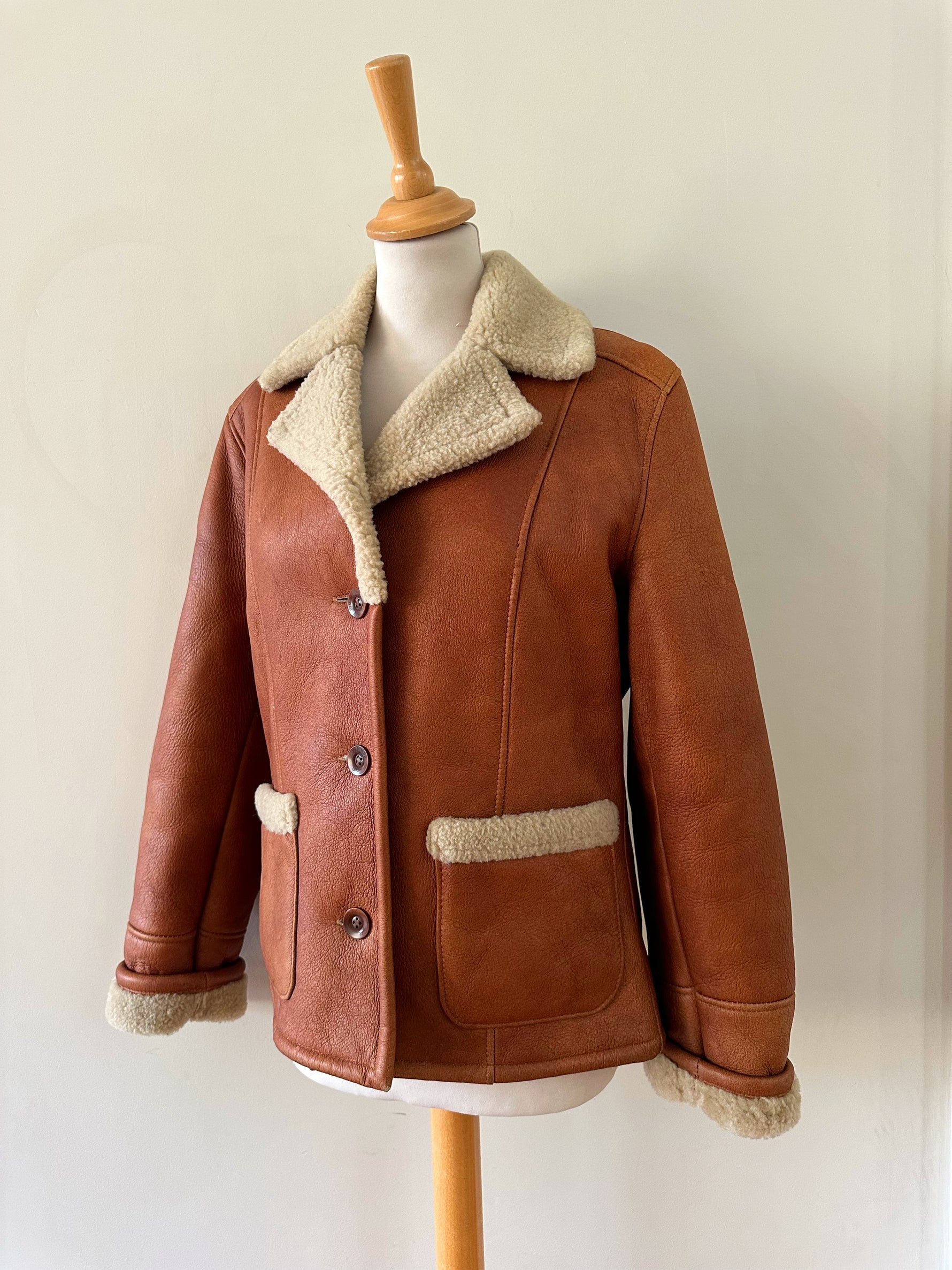 Prix unitaire parPeau lainée en mouton retourné, extérieur cuir caramel cognac, interieur mouton écru, forme blouson court, boutonné, comme neuf. Taille 36 porté ici sur un mannequin T36. Longueur 65cm.