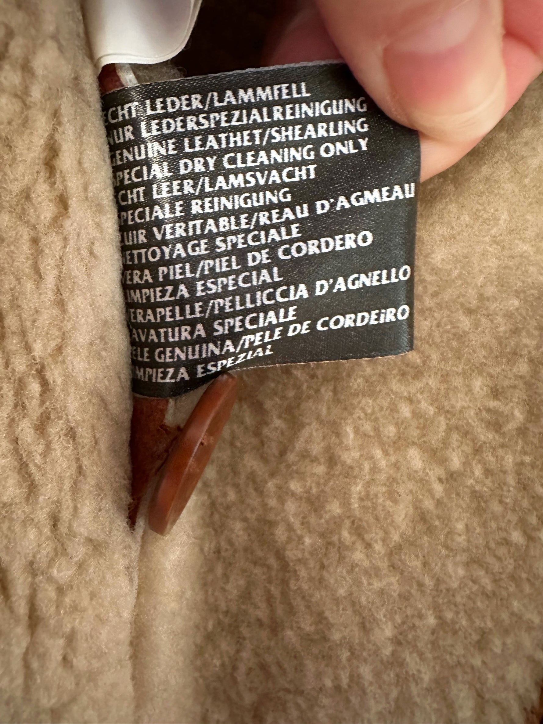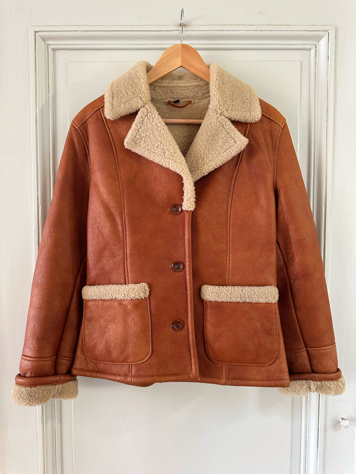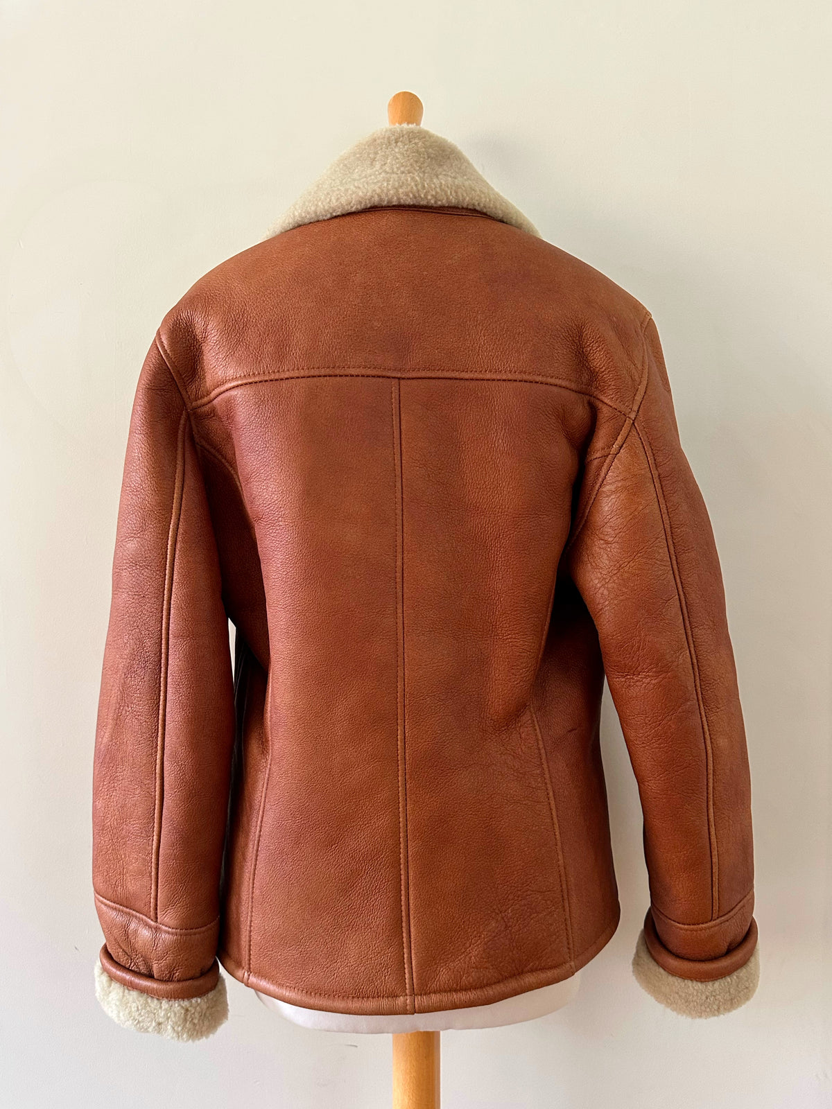 Prix unitaire parPeau lainée en mouton retourné, extérieur cuir caramel cognac, interieur mouton écru, forme blouson court, boutonné, comme neuf. Taille 36 porté ici sur un mannequin T36. Longueur 65cm.