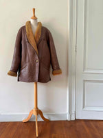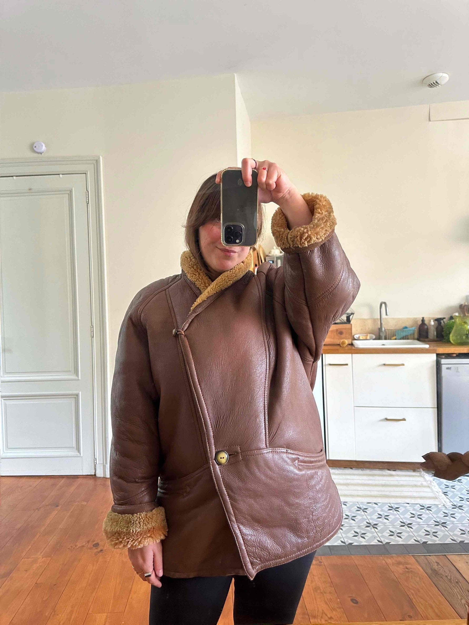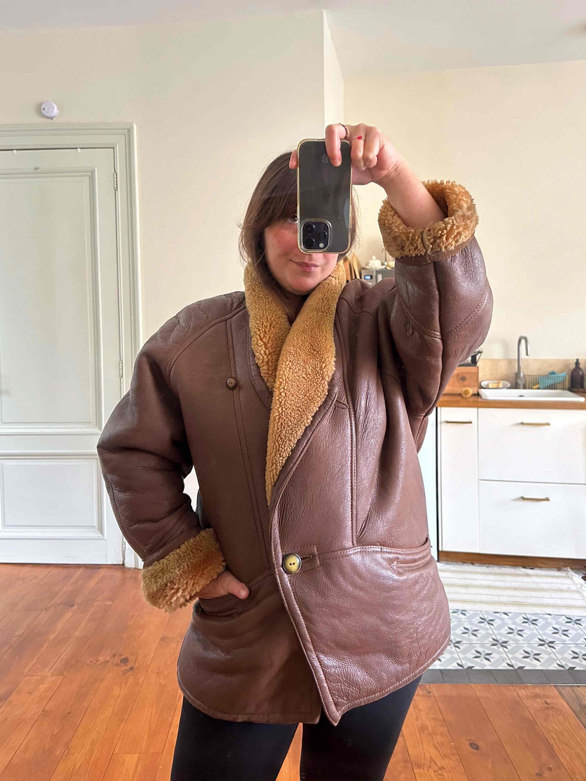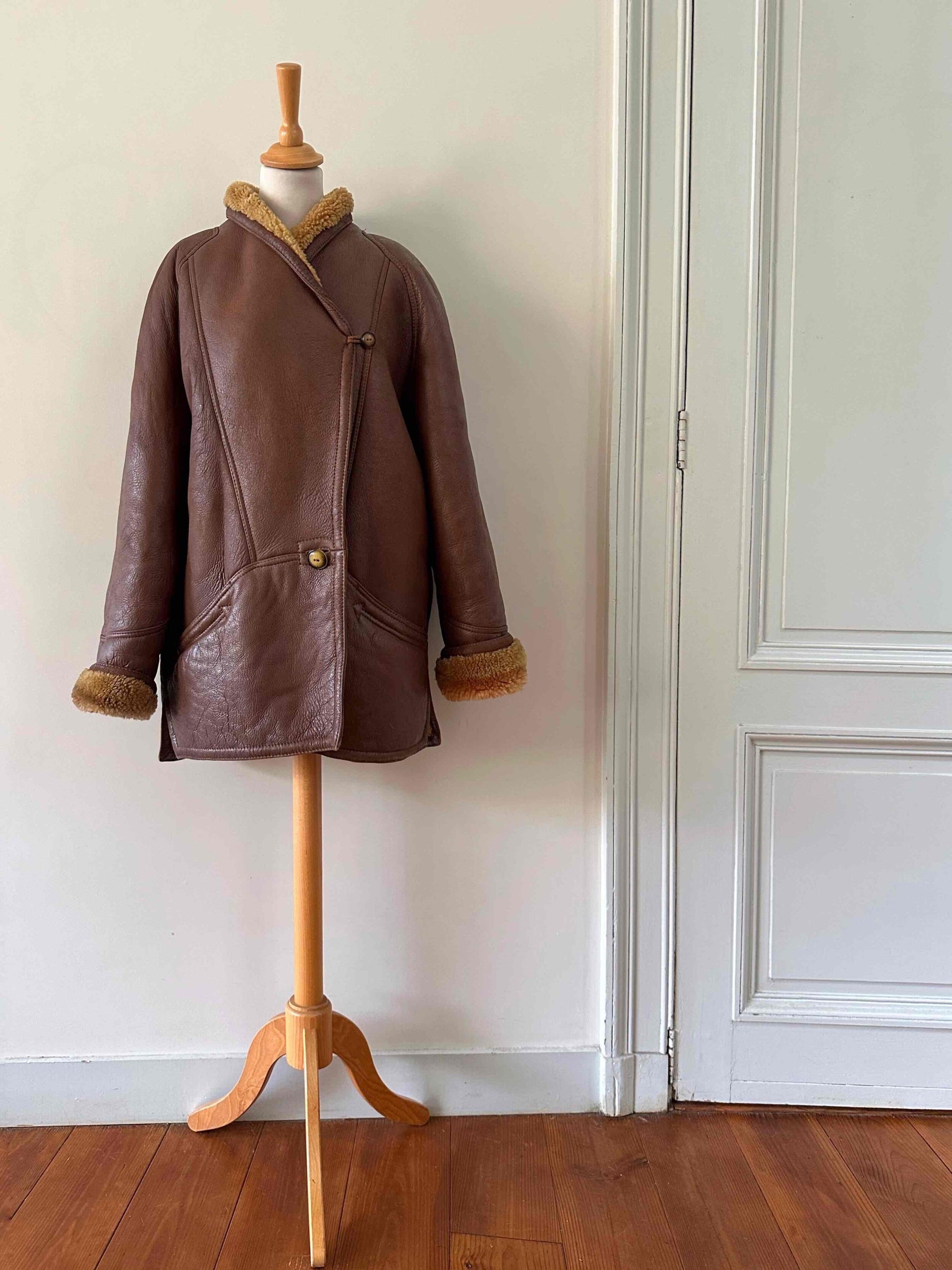 Prix unitaire parPeau lainee en mouton retourné extérieur cuir chocolat, intérieur mouton fauve doré, col châle à boutonner, fabriqué en Italie, années 80s, convient aux tailles 38 et 40 portée ici sur une personne T40 et sur un mannequin T36.