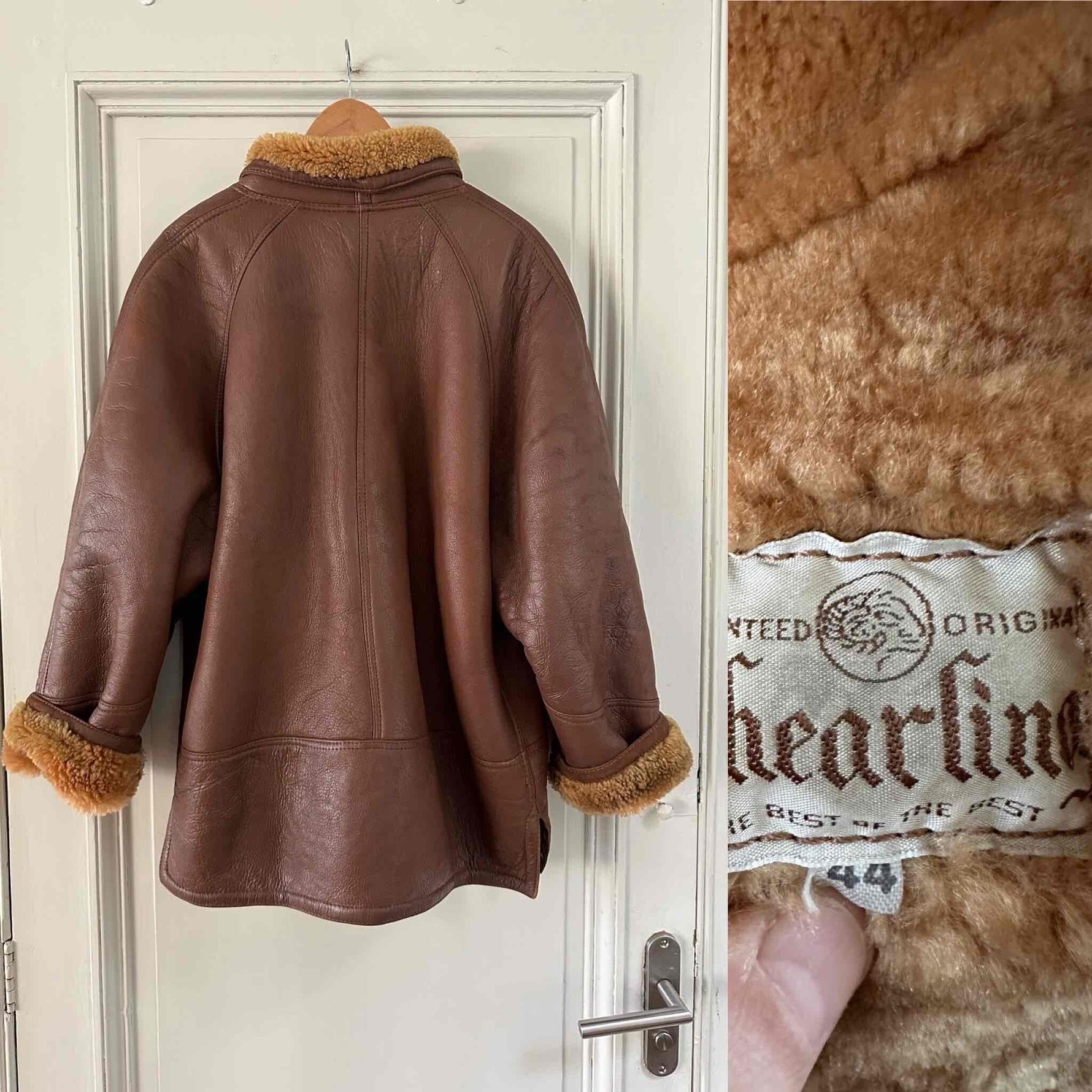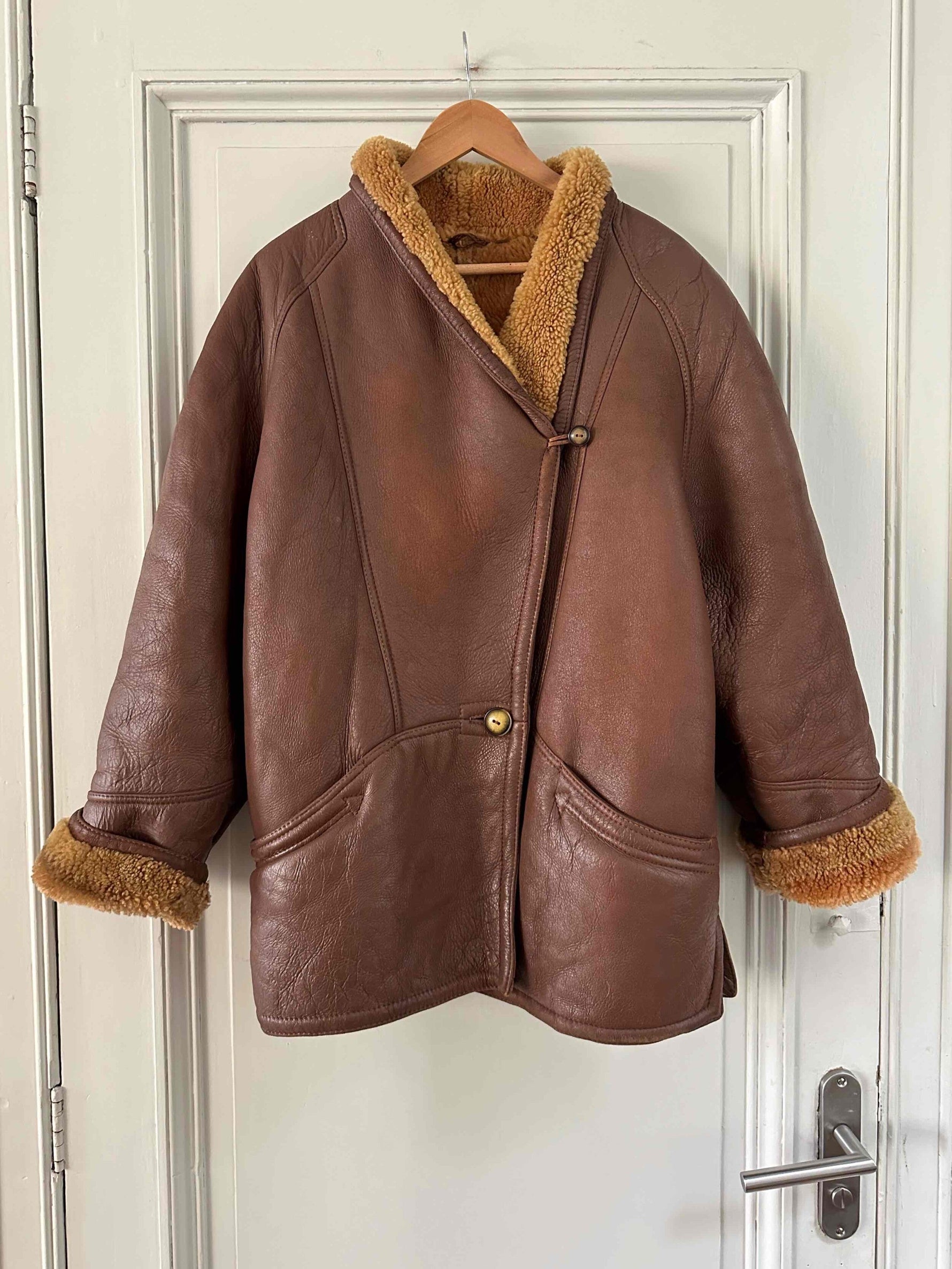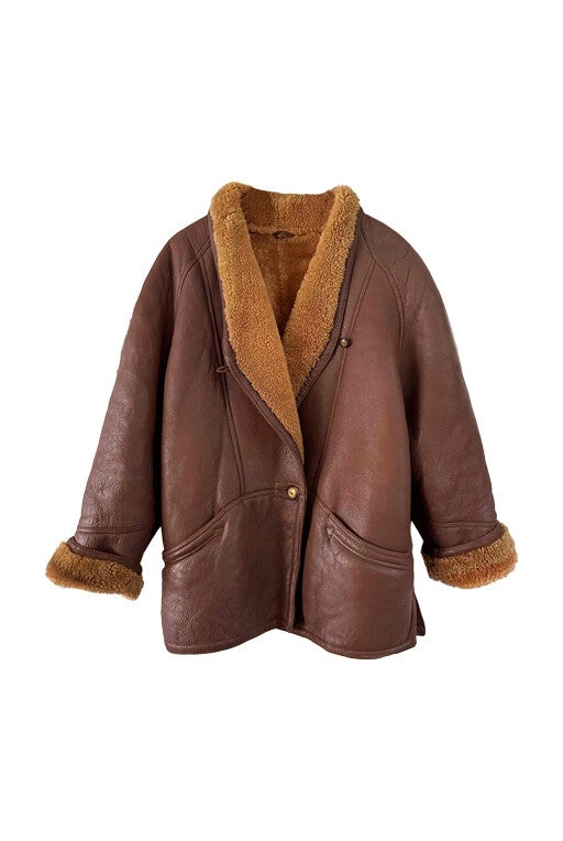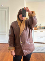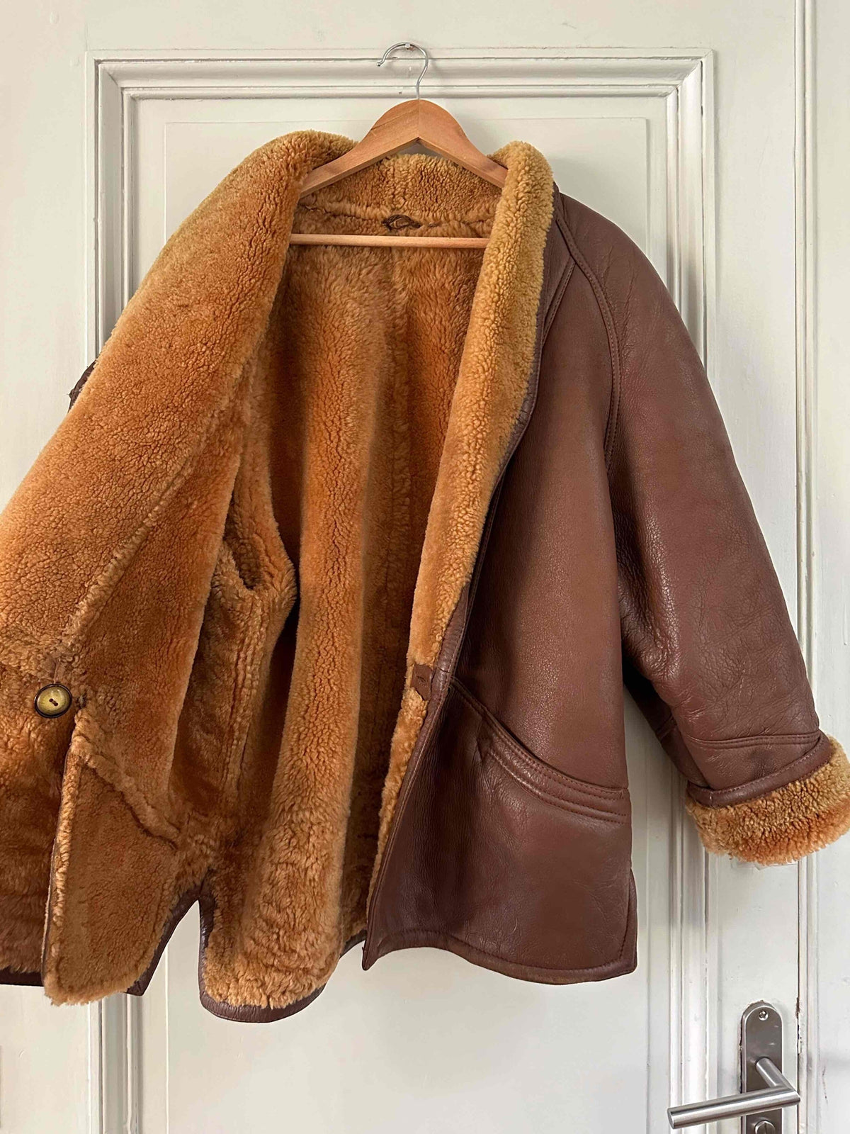 Prix unitaire parPeau lainee en mouton retourné extérieur cuir chocolat, intérieur mouton fauve doré, col châle à boutonner, fabriqué en Italie, années 80s, convient aux tailles 38 et 40 portée ici sur une personne T40 et sur un mannequin T36.