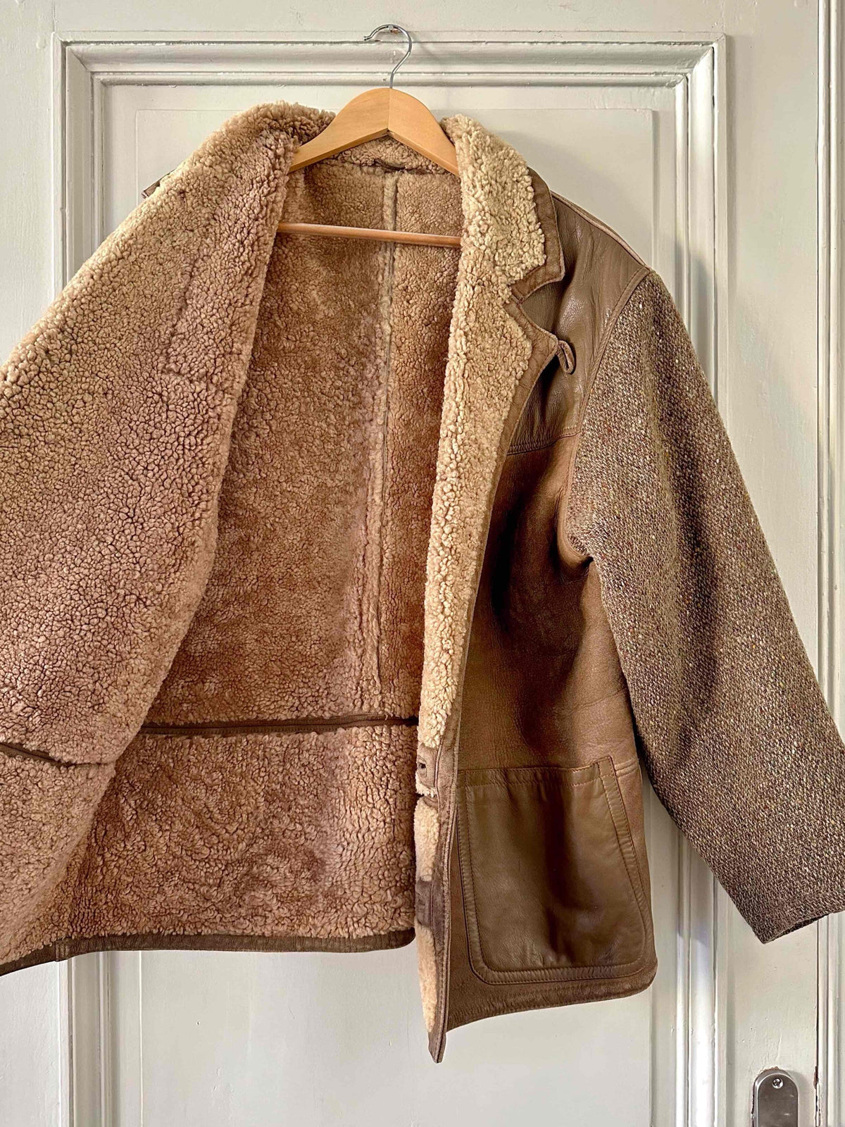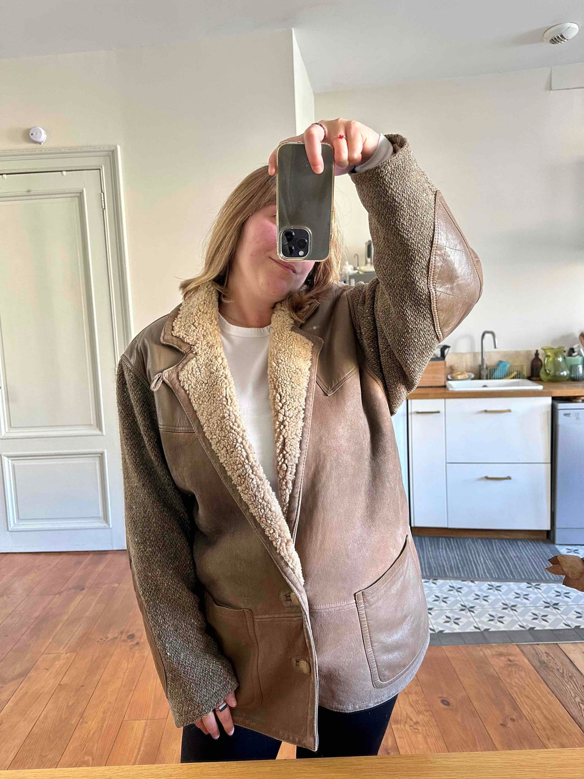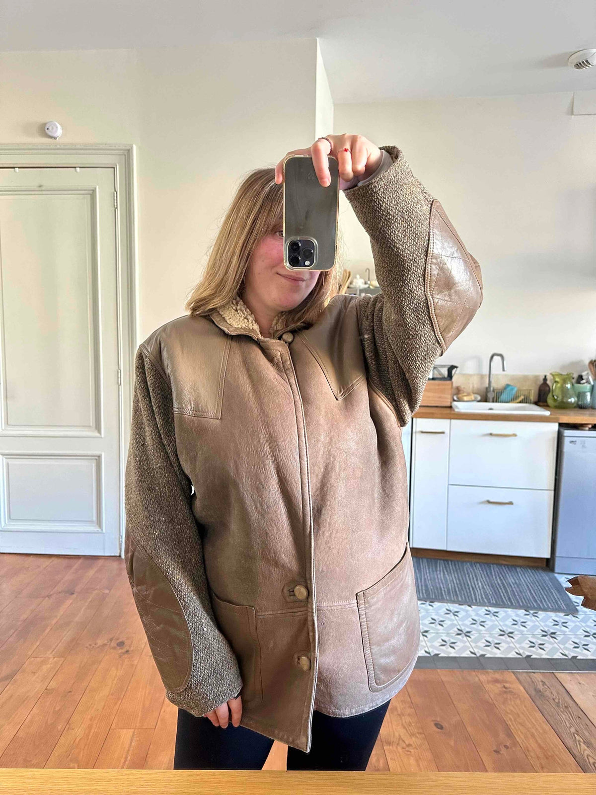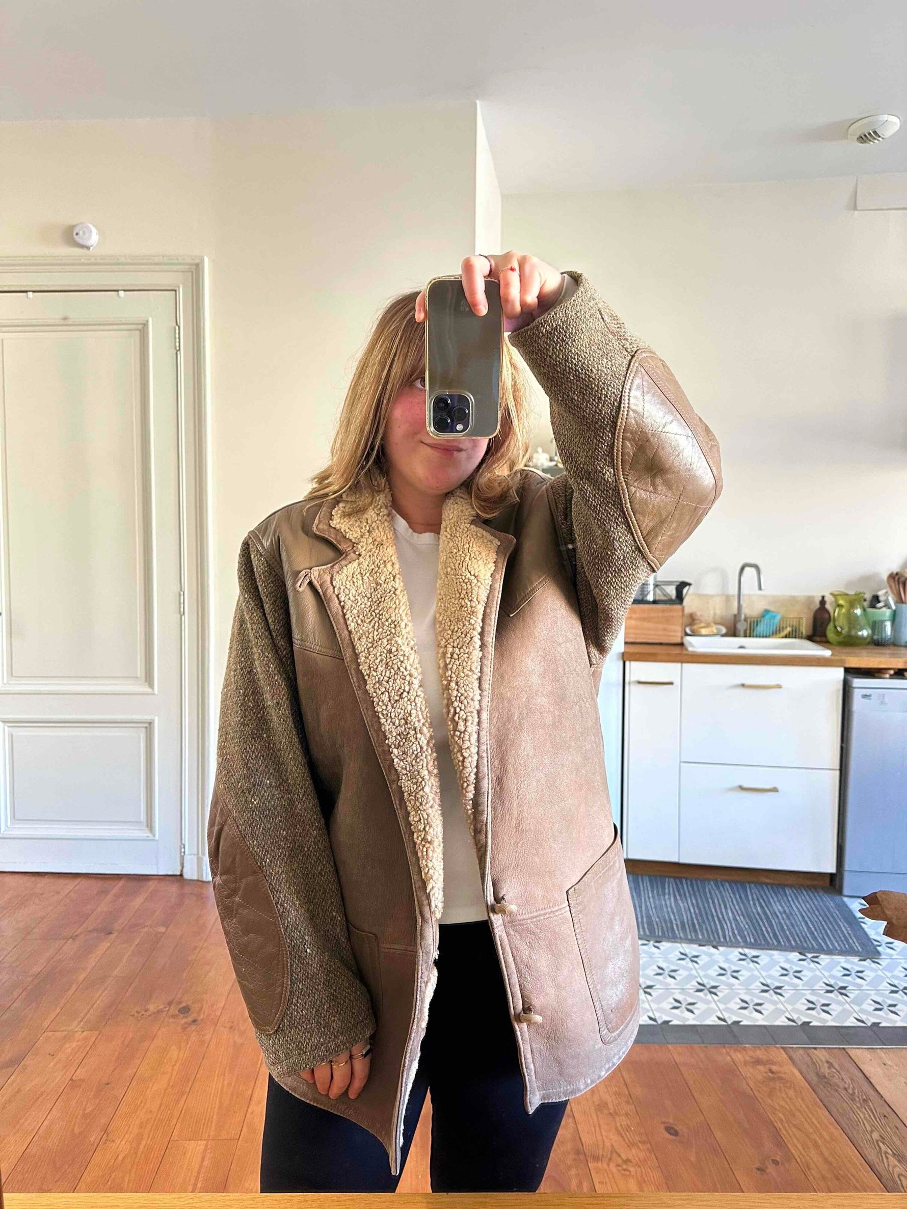 Prix unitaire parPeau Lainee en mouton retourné beige intérieur mouton camel, manches en laine tweed camel et vert olive, coudière matelassées en cuir, grand col châle à boutonner, fabriqué en Italie, convient aux tailles 38 et 40 porté ici sur une personne T40.