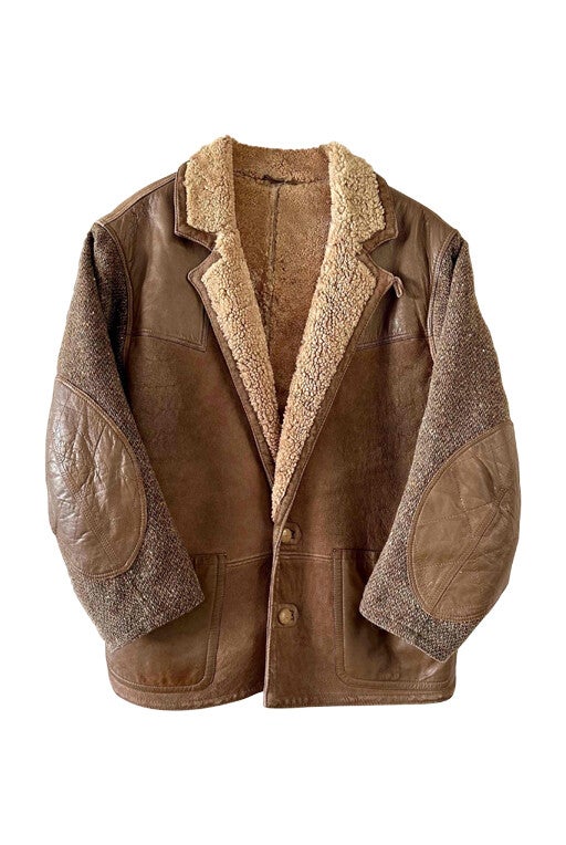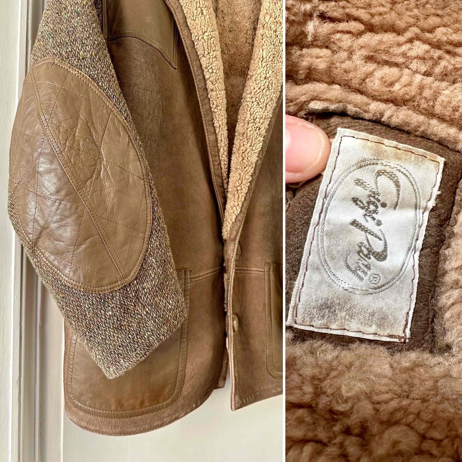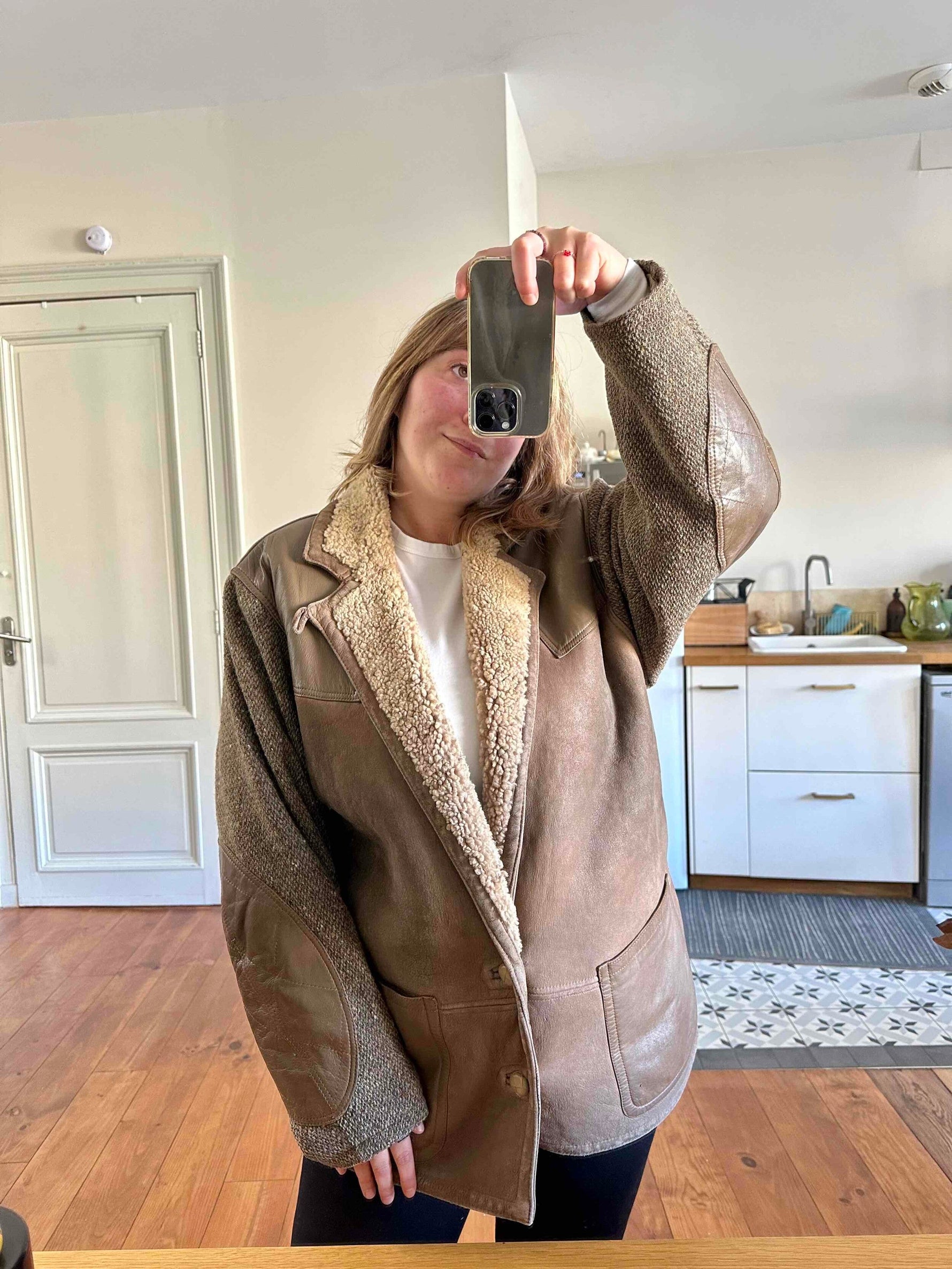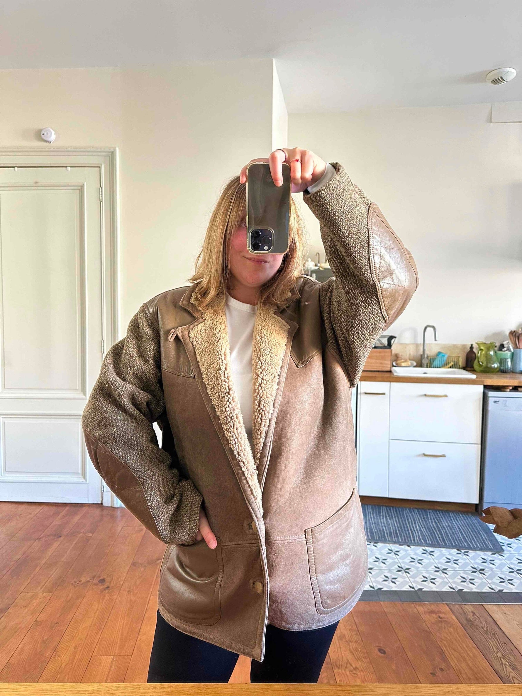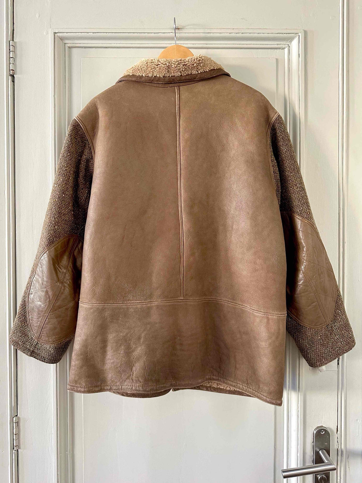 Prix unitaire parPeau Lainee en mouton retourné beige intérieur mouton camel, manches en laine tweed camel et vert olive, coudière matelassées en cuir, grand col châle à boutonner, fabriqué en Italie, convient aux tailles 38 et 40 porté ici sur une personne T40.