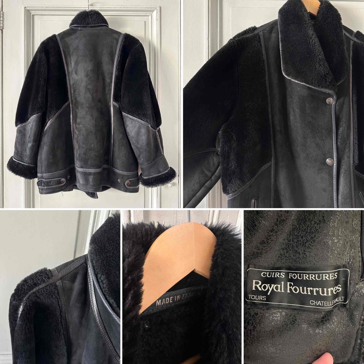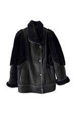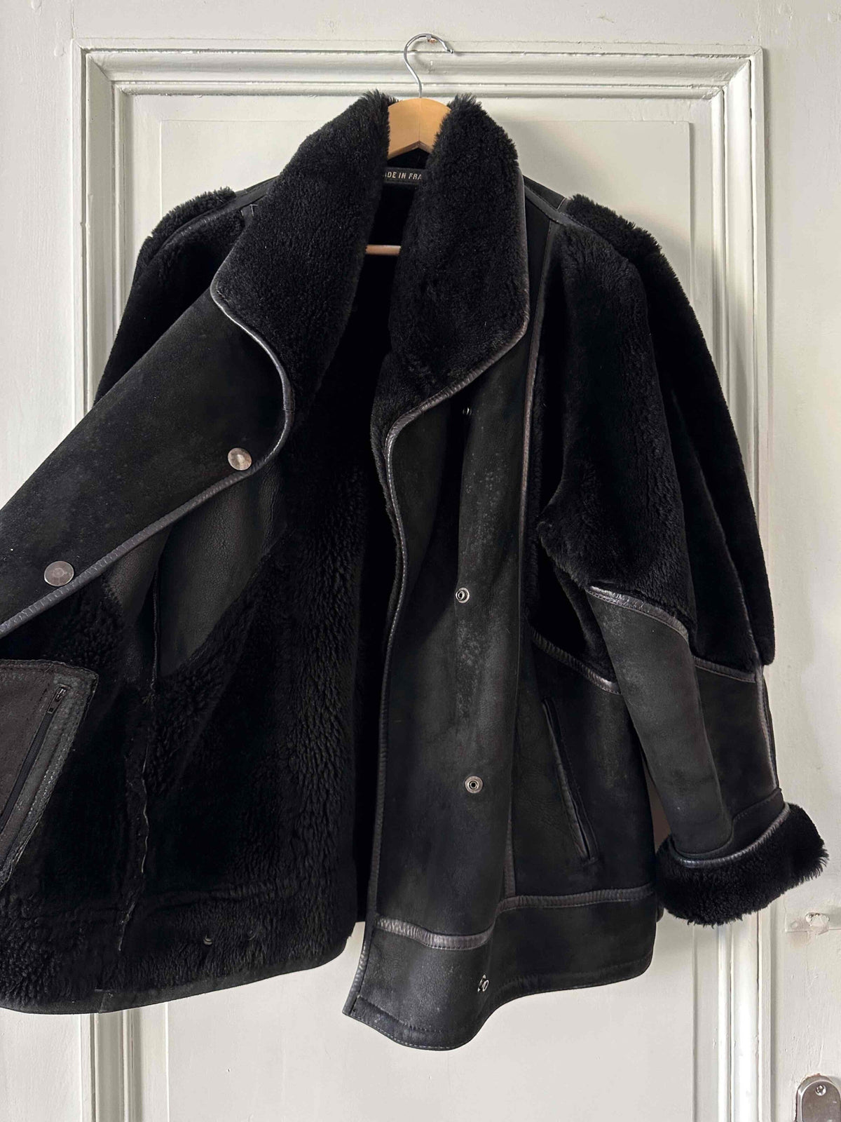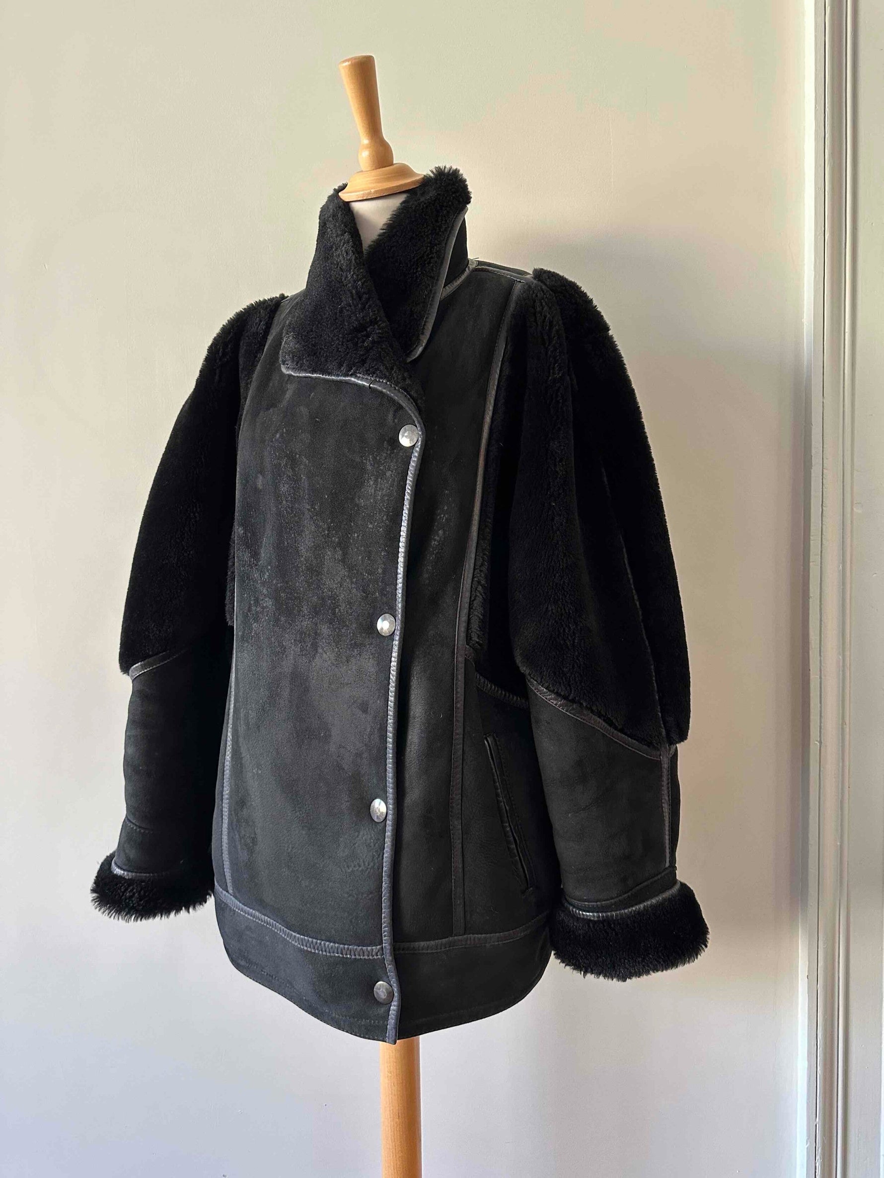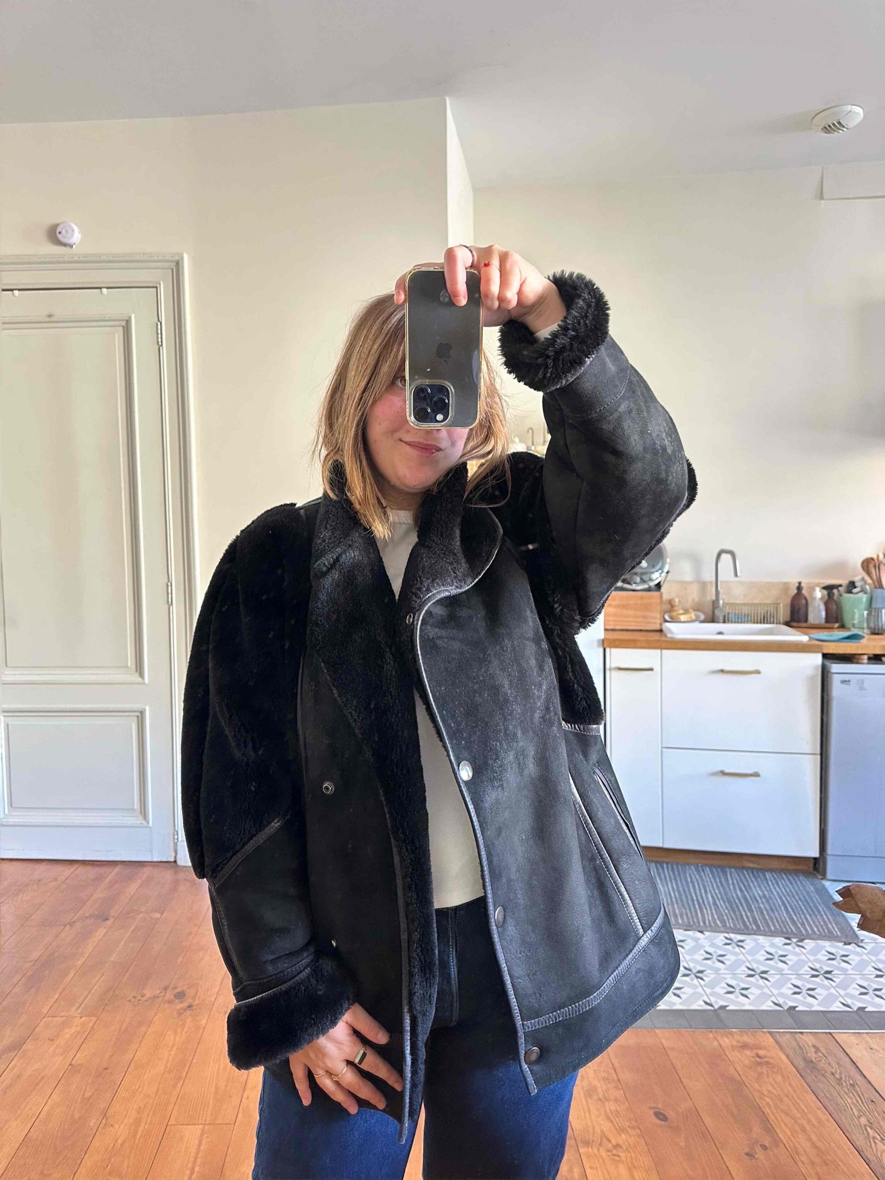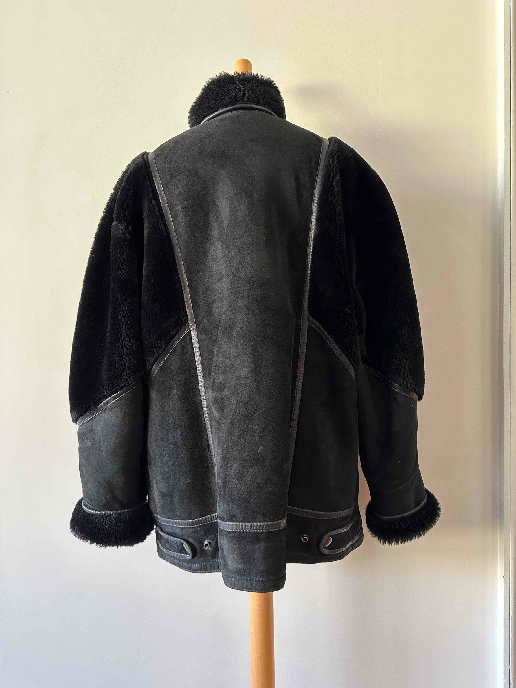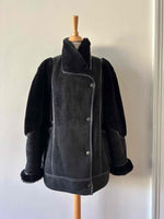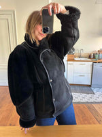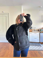 Prix unitaire parPeau lainée en mouton retourné extérieur daim et ganses en cuir verni noir, intérieur et manches empiècements en mouton noir, fabriqué en France, taille 38 porté ici sur un mannequin T36 et serrée sur une personne T40.
